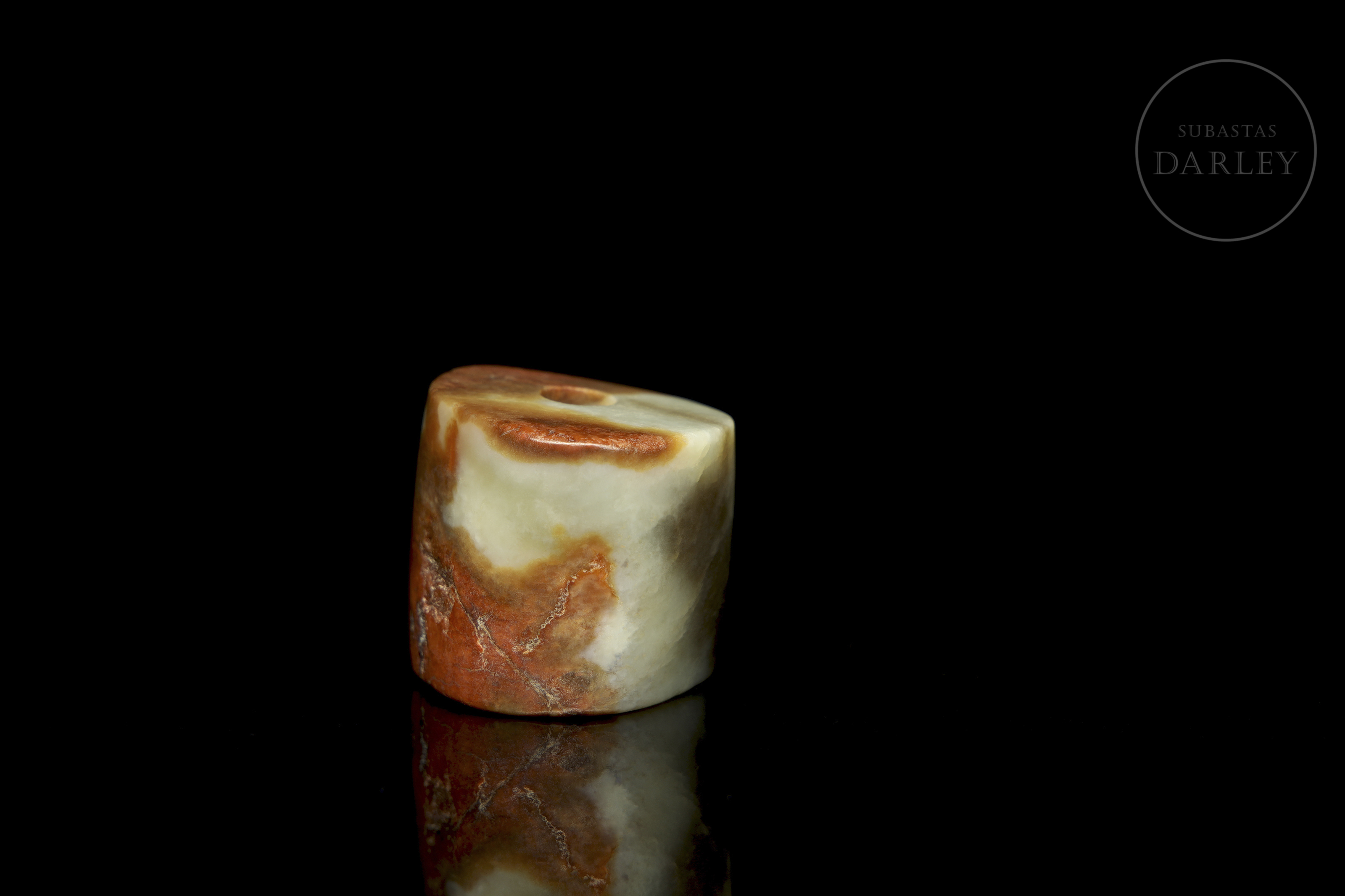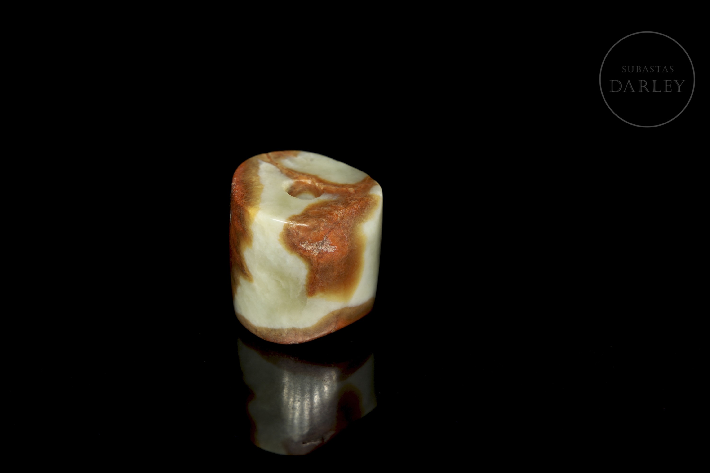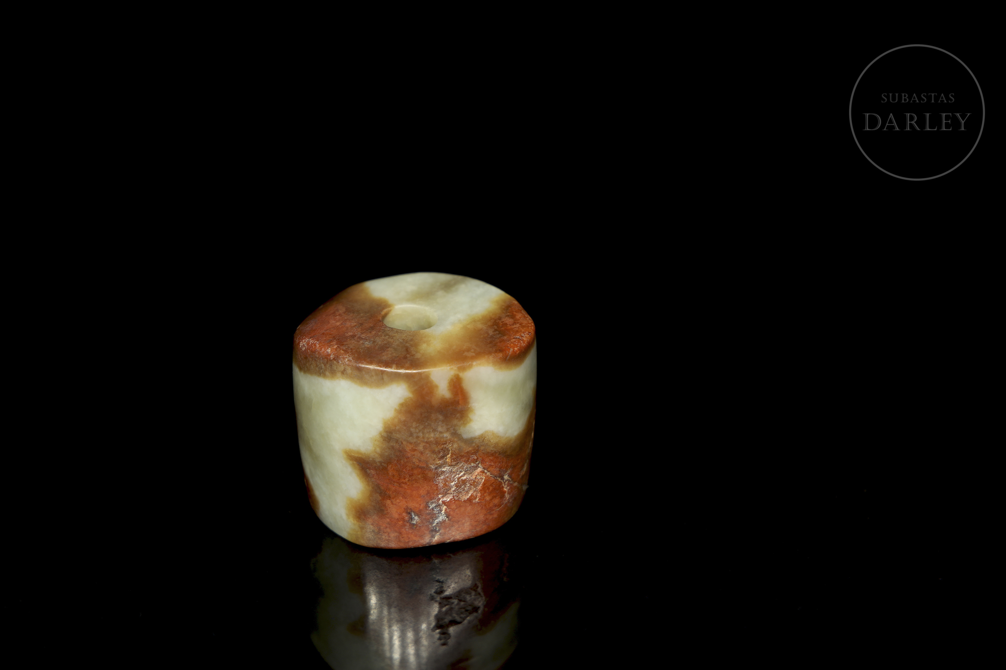 Cuenta u ornamento de jade de forma tubular corta e irregular, con un orificio central para su uso como colgante. La pieza es de superficie lisa y pulida. El jade presenta un tono verde celadón pálido con marcadas áreas de pátina color marrón rojizo. Cuenta de jade, cultura Hongshan.