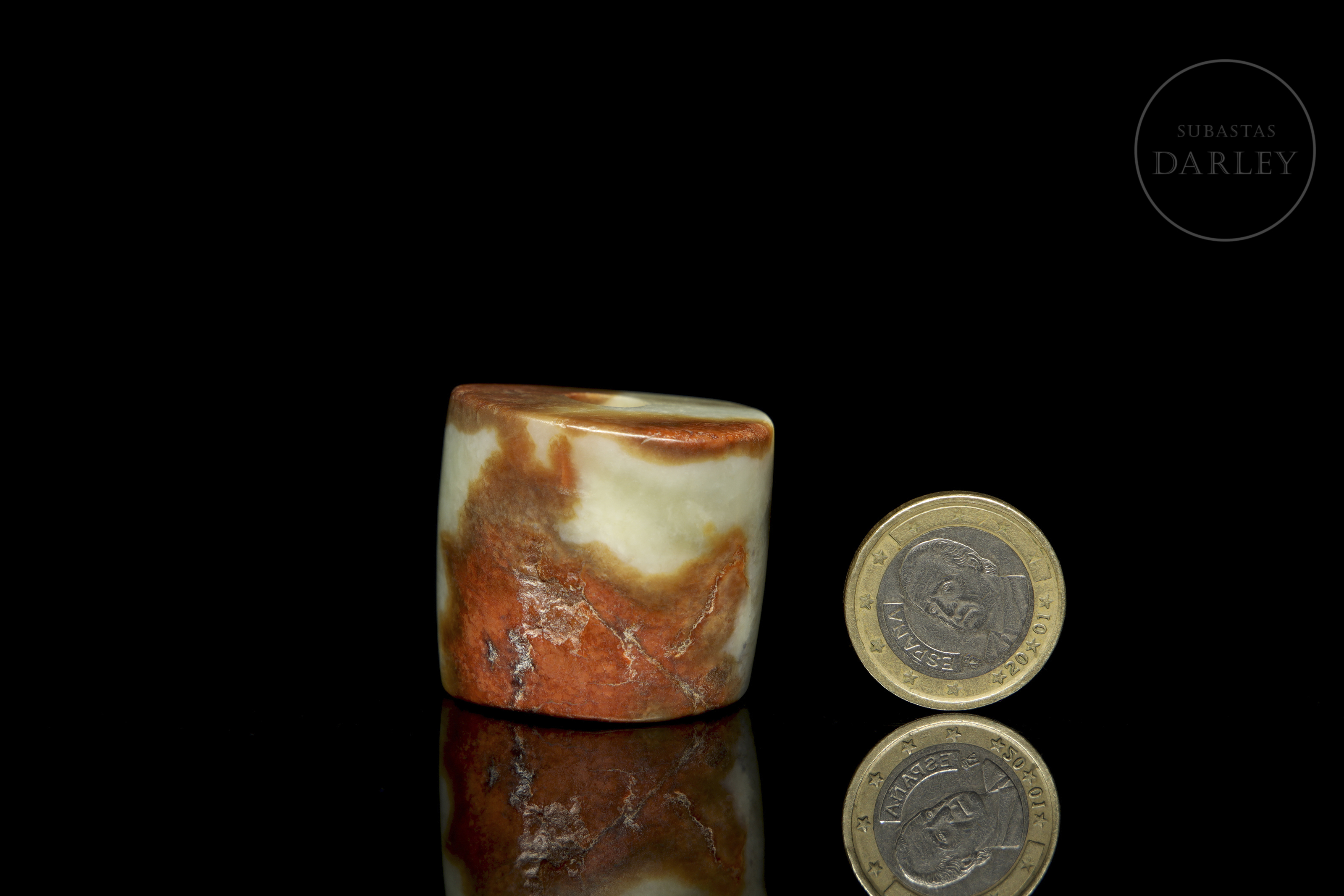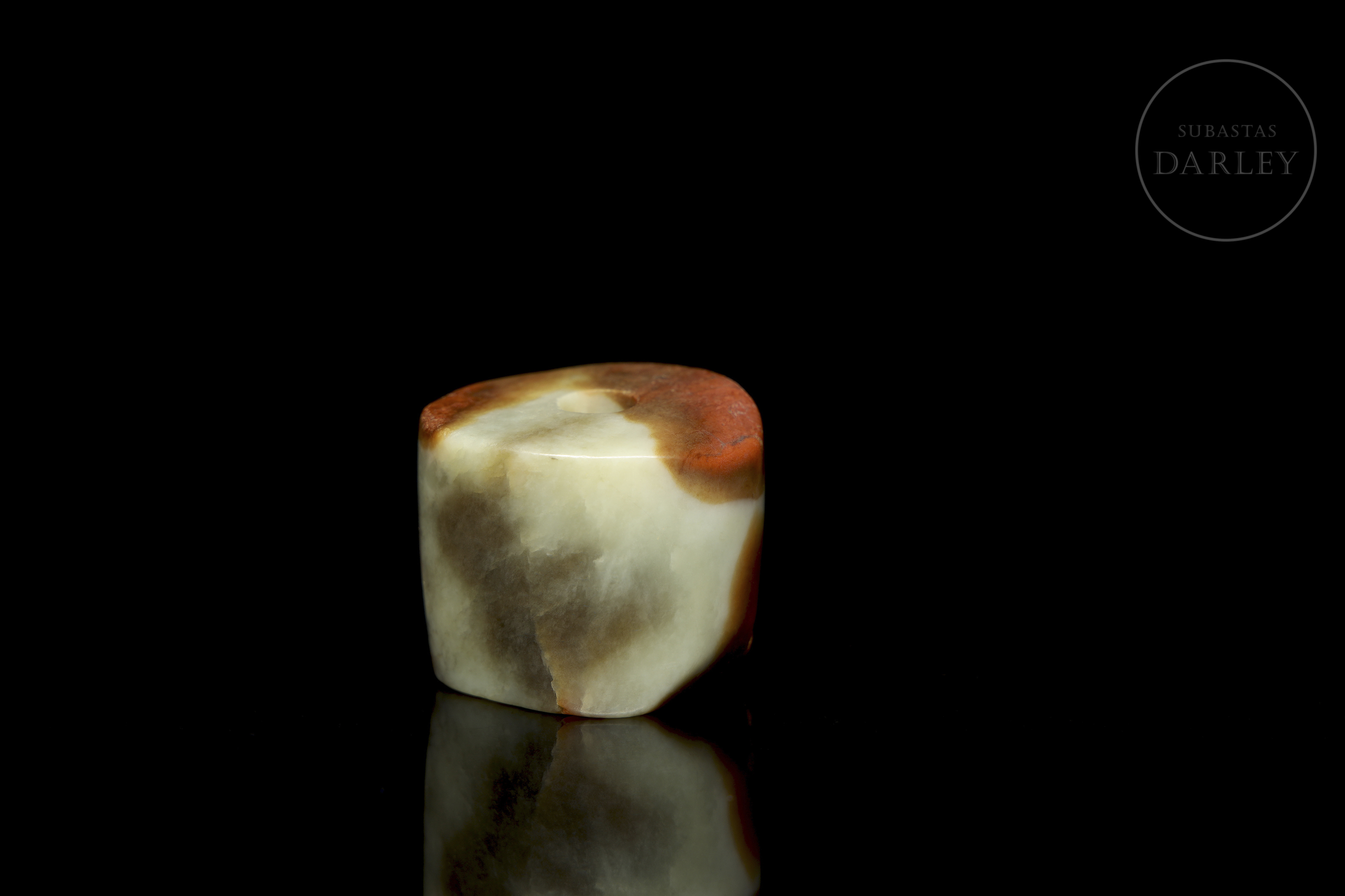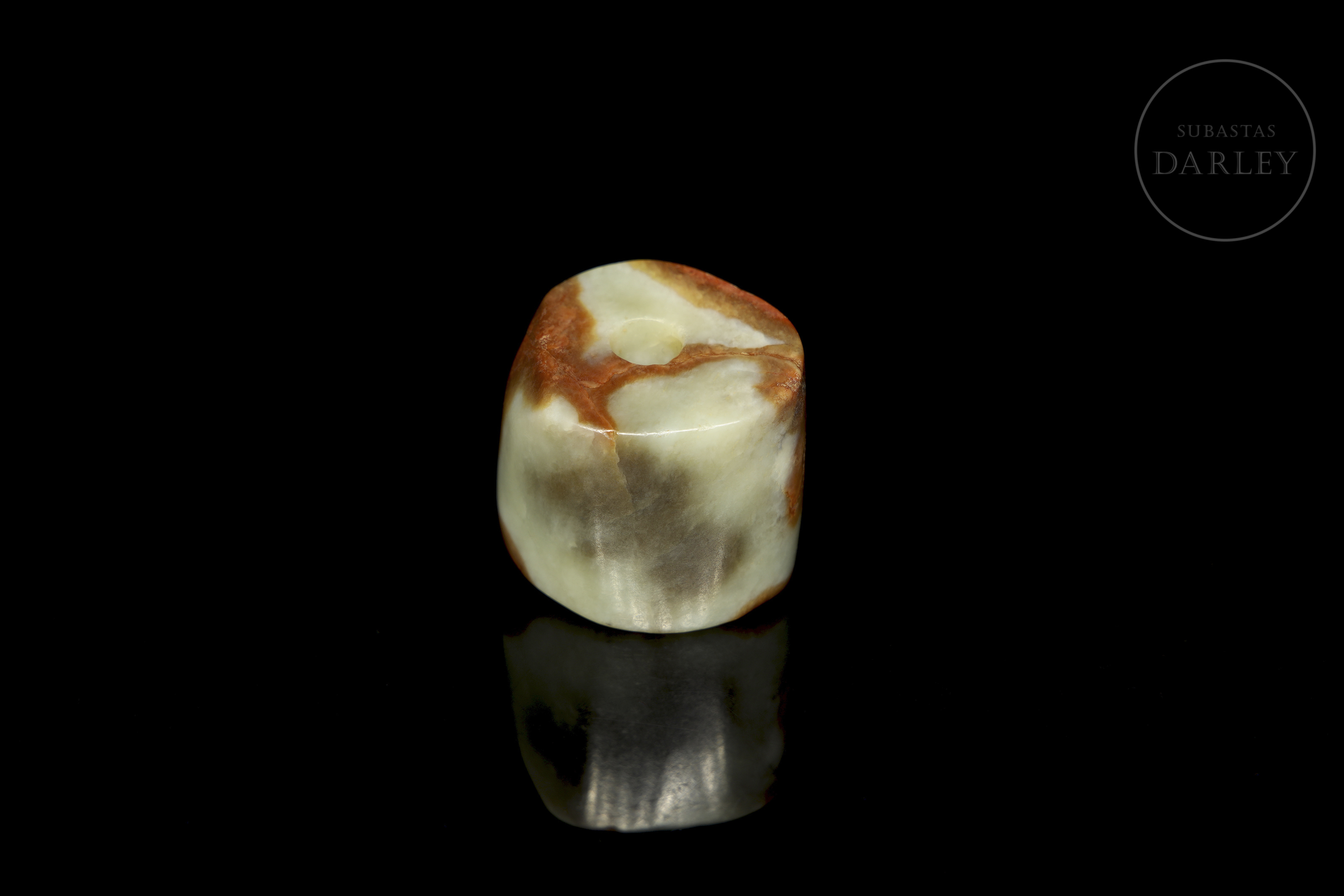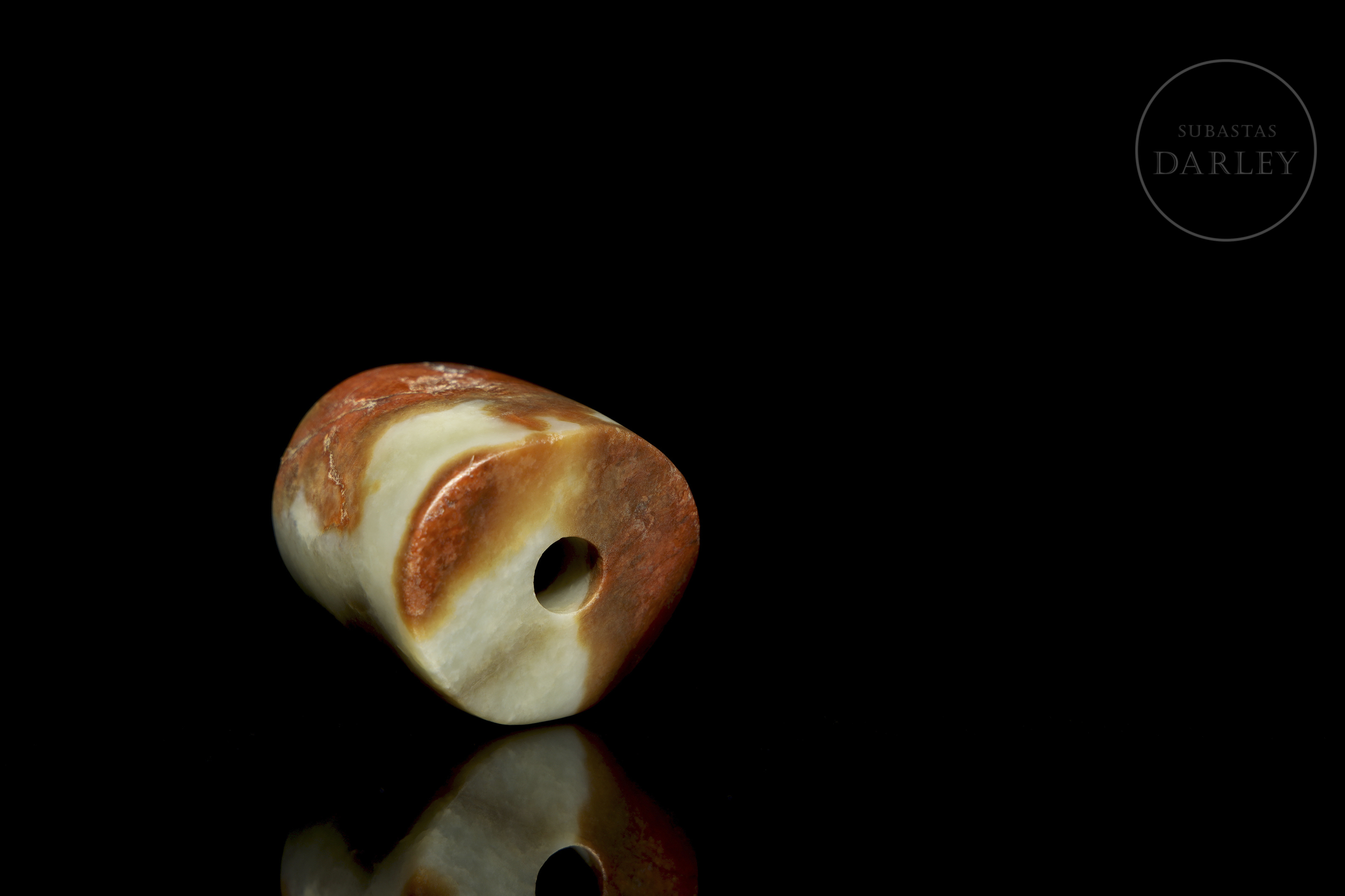 Cuenta u ornamento de jade de forma tubular corta e irregular, con un orificio central para su uso como colgante. La pieza es de superficie lisa y pulida. El jade presenta un tono verde celadón pálido con marcadas áreas de pátina color marrón rojizo. Cuenta de jade, cultura Hongshan.