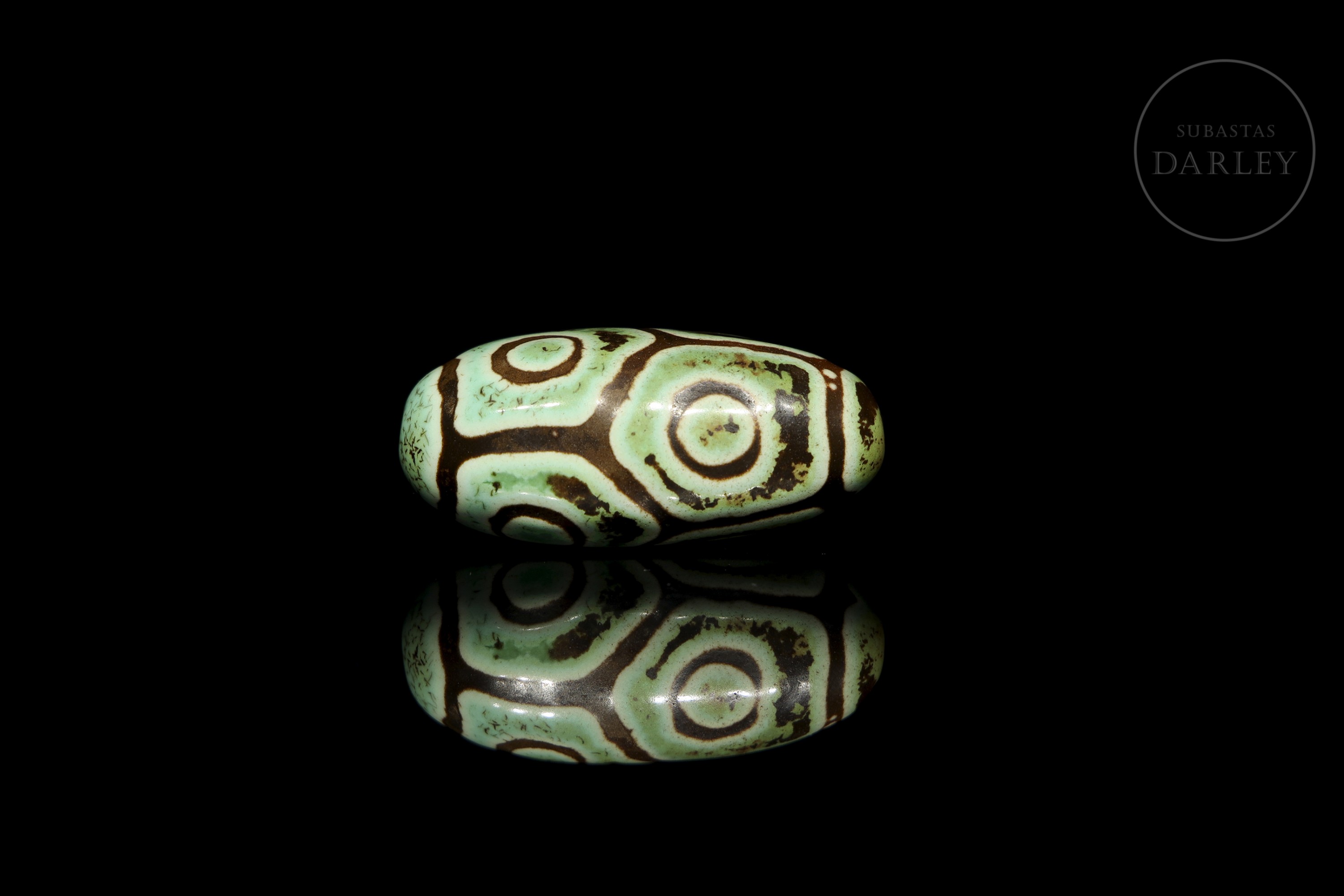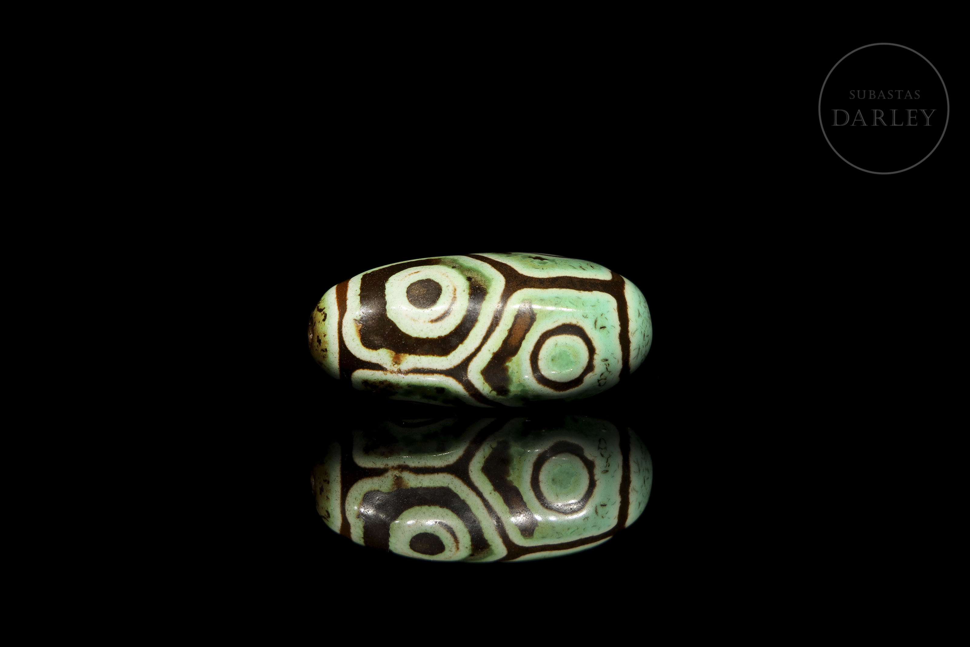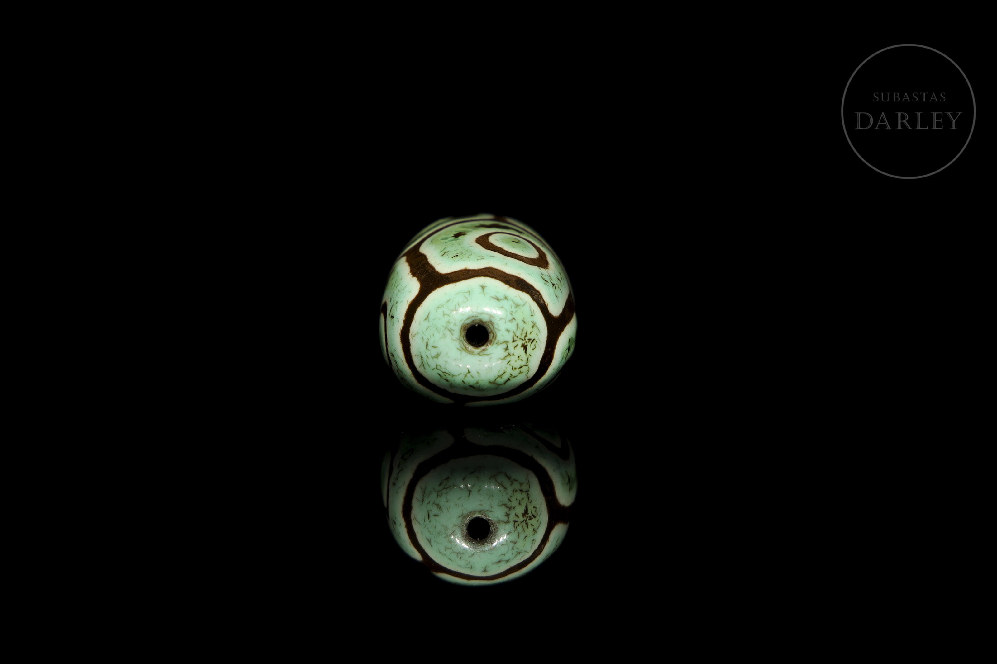 Cuenta tipo Dzi (གཟི།), tallada en piedra de tonalidad verde menta. La pieza presenta una decoración de "ojos", delimitados por bandas sinuosas que recorren todo el cuerpo globular abombado en el centro. Con perforación longitudinal y pátina por envejecimiento. Dinastía Ming (1368–1644).