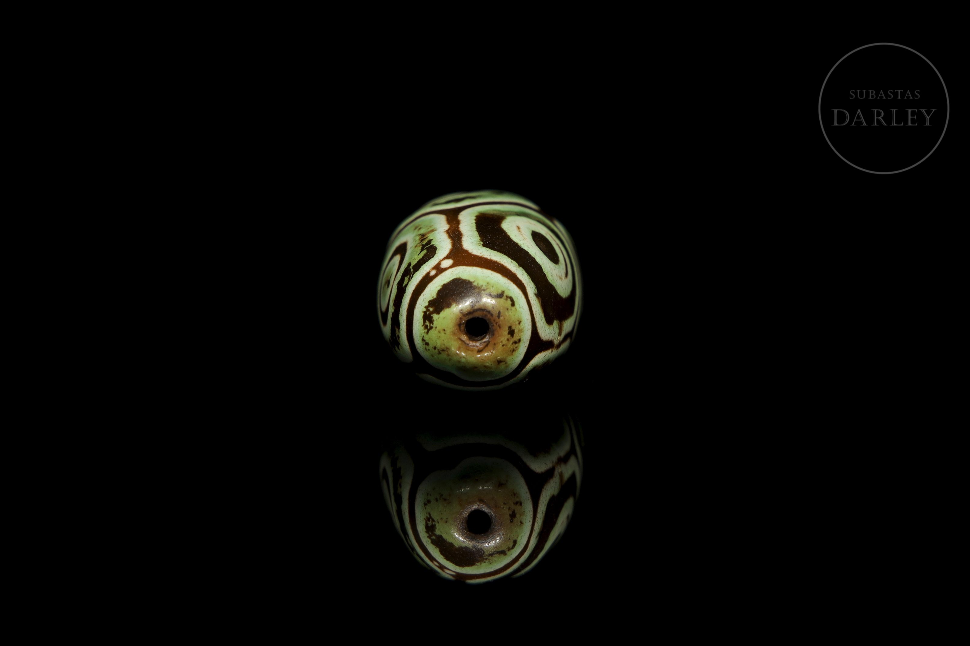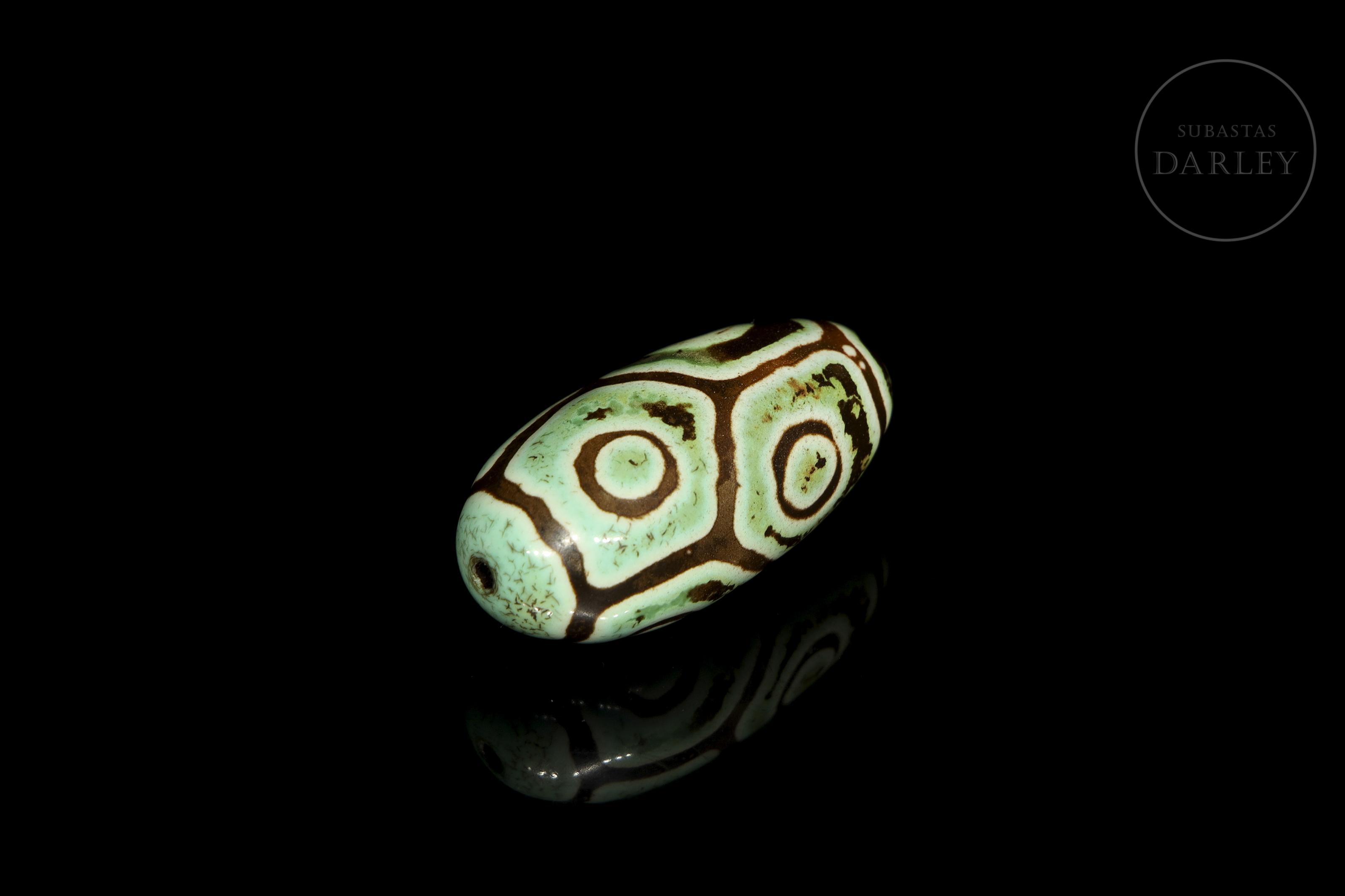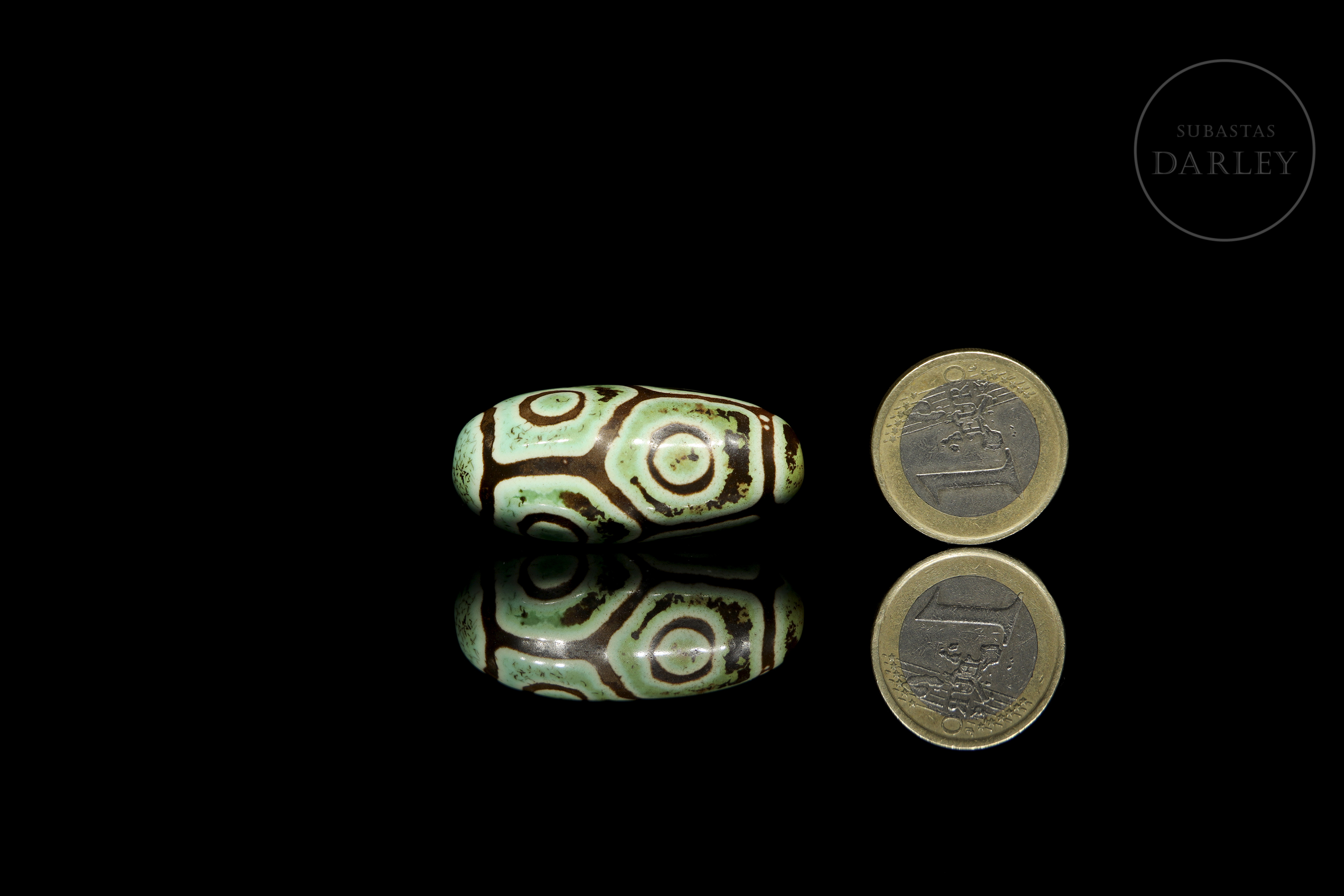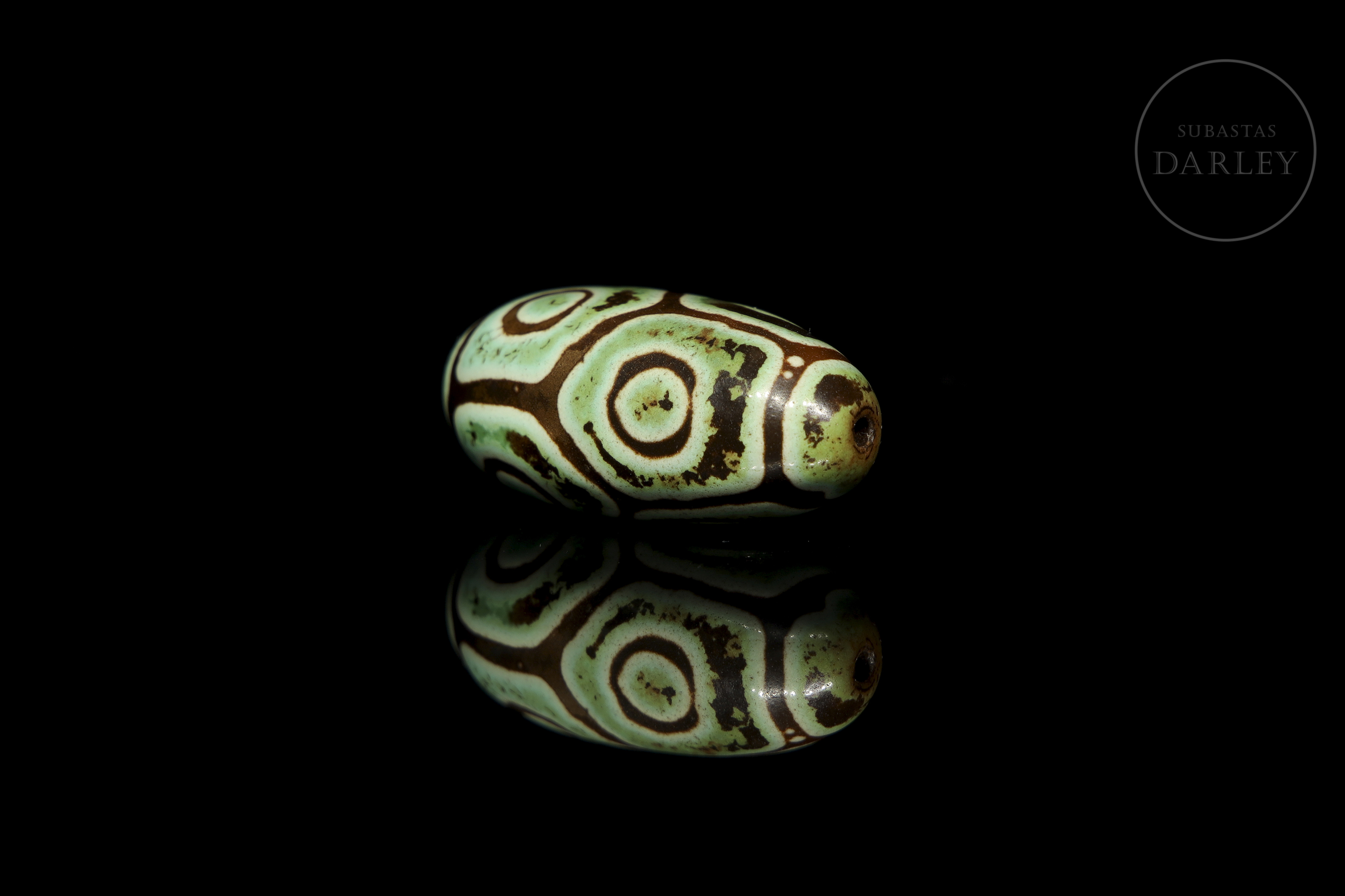 Cuenta tipo Dzi (གཟི།), tallada en piedra de tonalidad verde menta. La pieza presenta una decoración de "ojos", delimitados por bandas sinuosas que recorren todo el cuerpo globular abombado en el centro. Con perforación longitudinal y pátina por envejecimiento. Dinastía Ming (1368–1644).