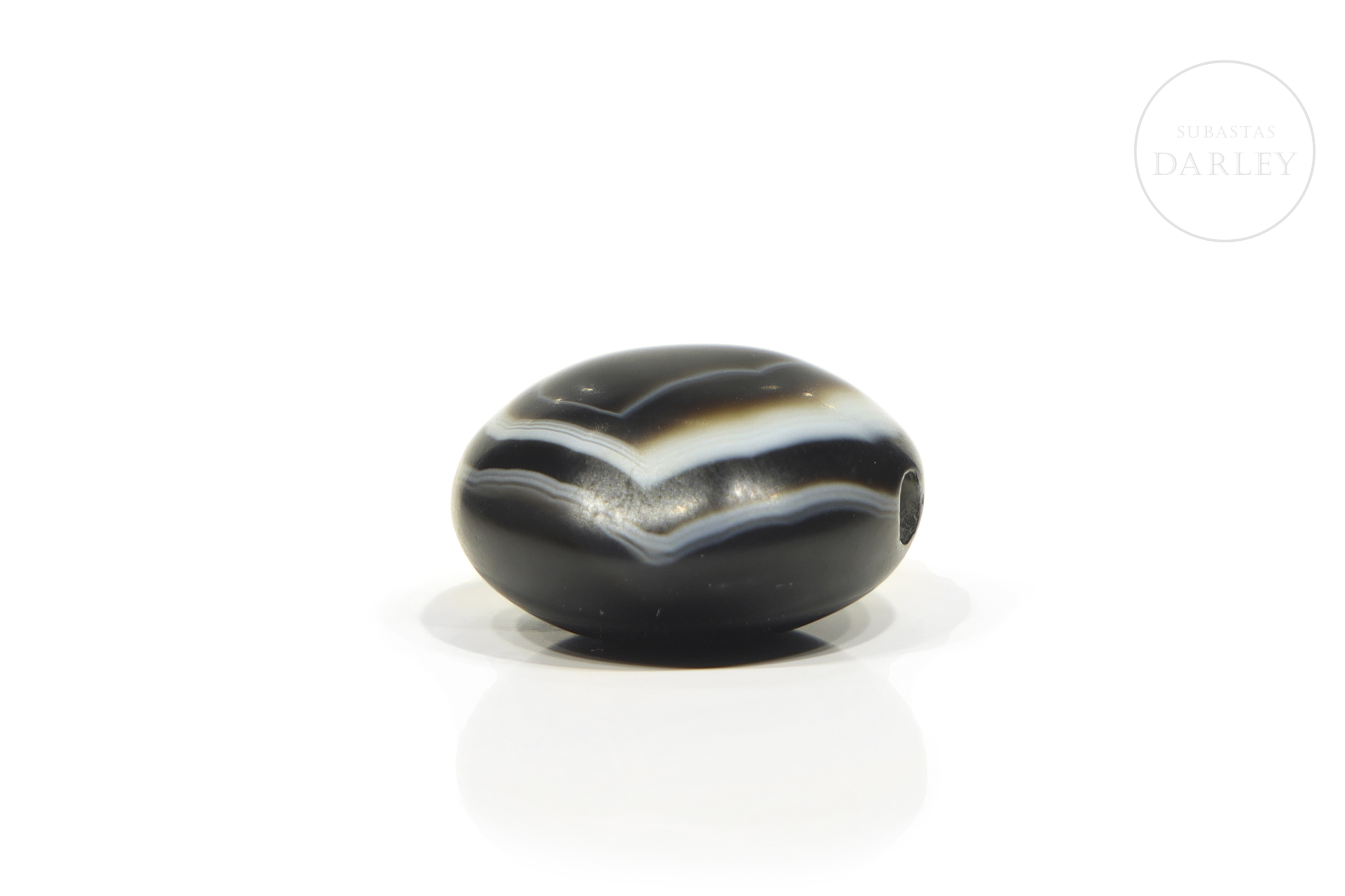 Cuenta de ágata tipo "Banzhu" (板珠), de formato circular aplanado. La pieza destaca por su veteado natural en forma de "ojo" central, con bandas concéntricas en tonos crema, gris y marrón translúcido. La superficie presenta un pulido suave con una pátina de antigüedad. Cuenta con una perforación transversal. Dinastía Liao (907–1125).