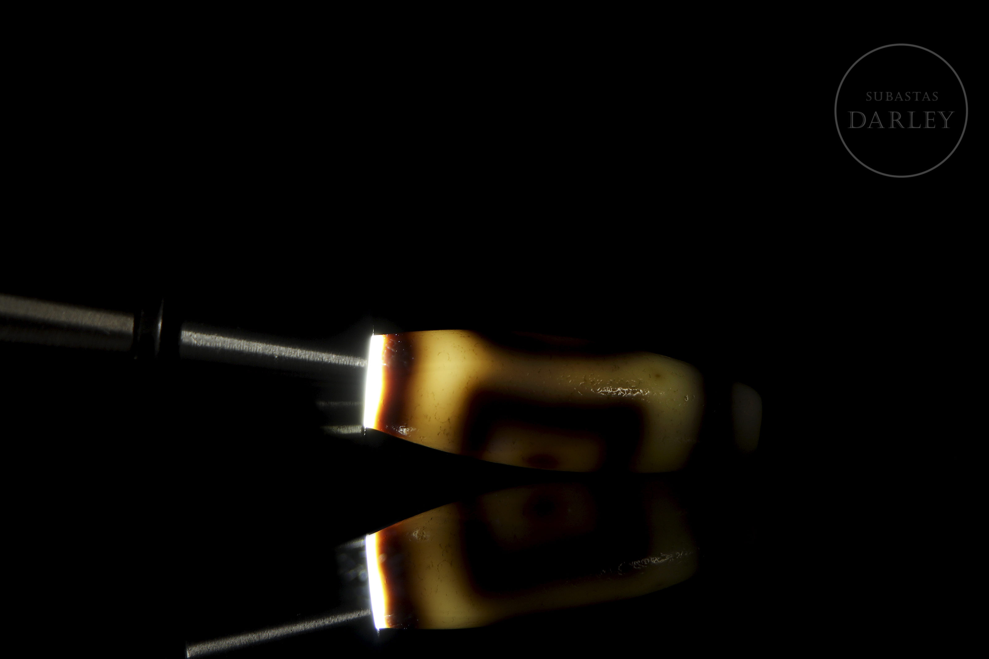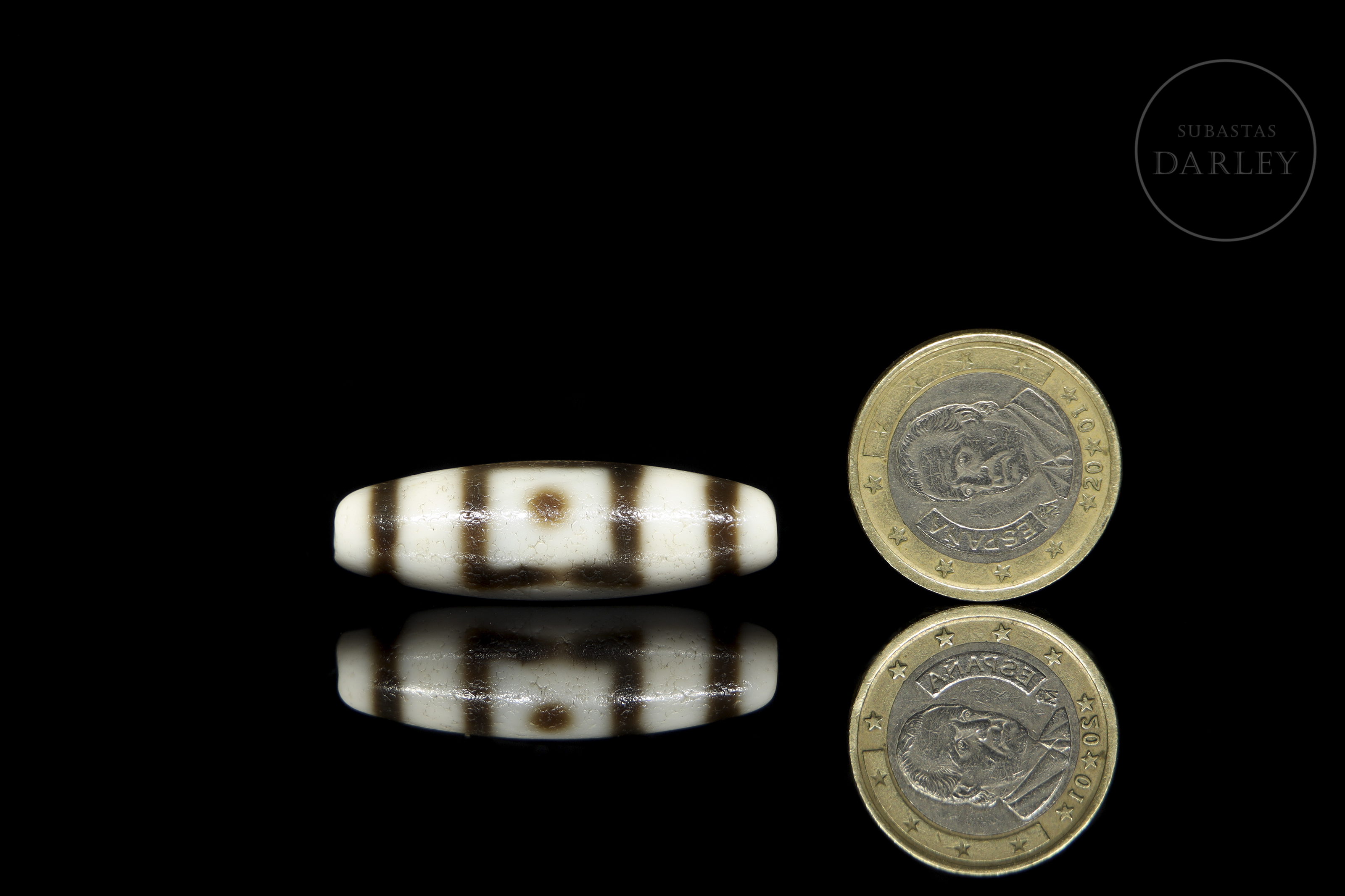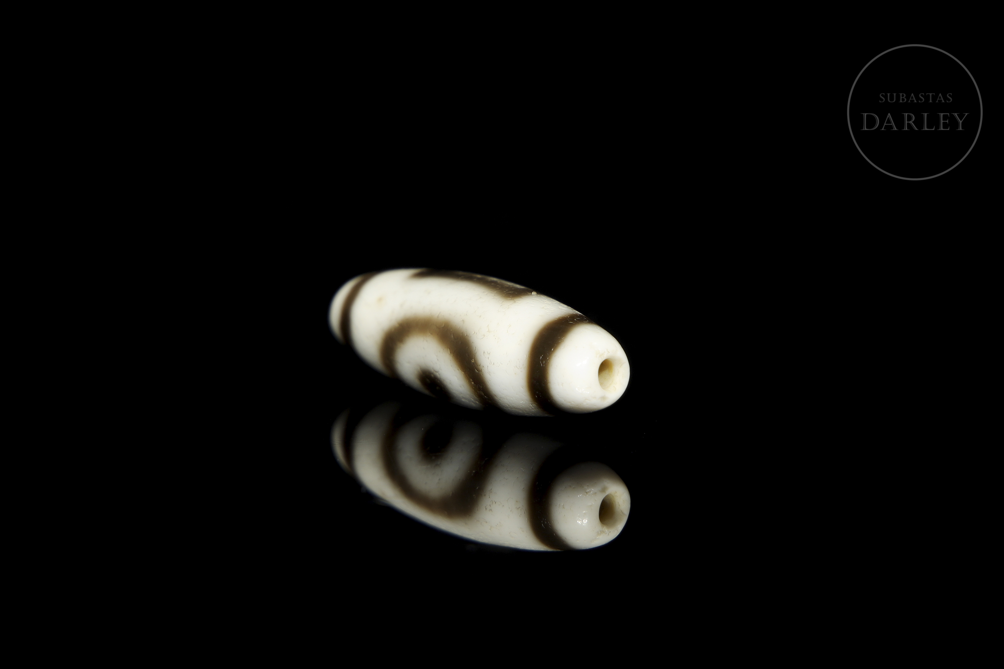 Ágata de una tonalidad blanco con decoraciones tono marrón oscuro. La pieza presenta un formato fusiforme con una perforación longitudinal. La figura se muestra con el diseño simbólico de "Cielo y Tierra", representado por un cuadrado que enmarca un círculo u "ojo" central, flanqueado por bandas paralelas en los extremos. Dinastía Tang (618–907) o posterior.