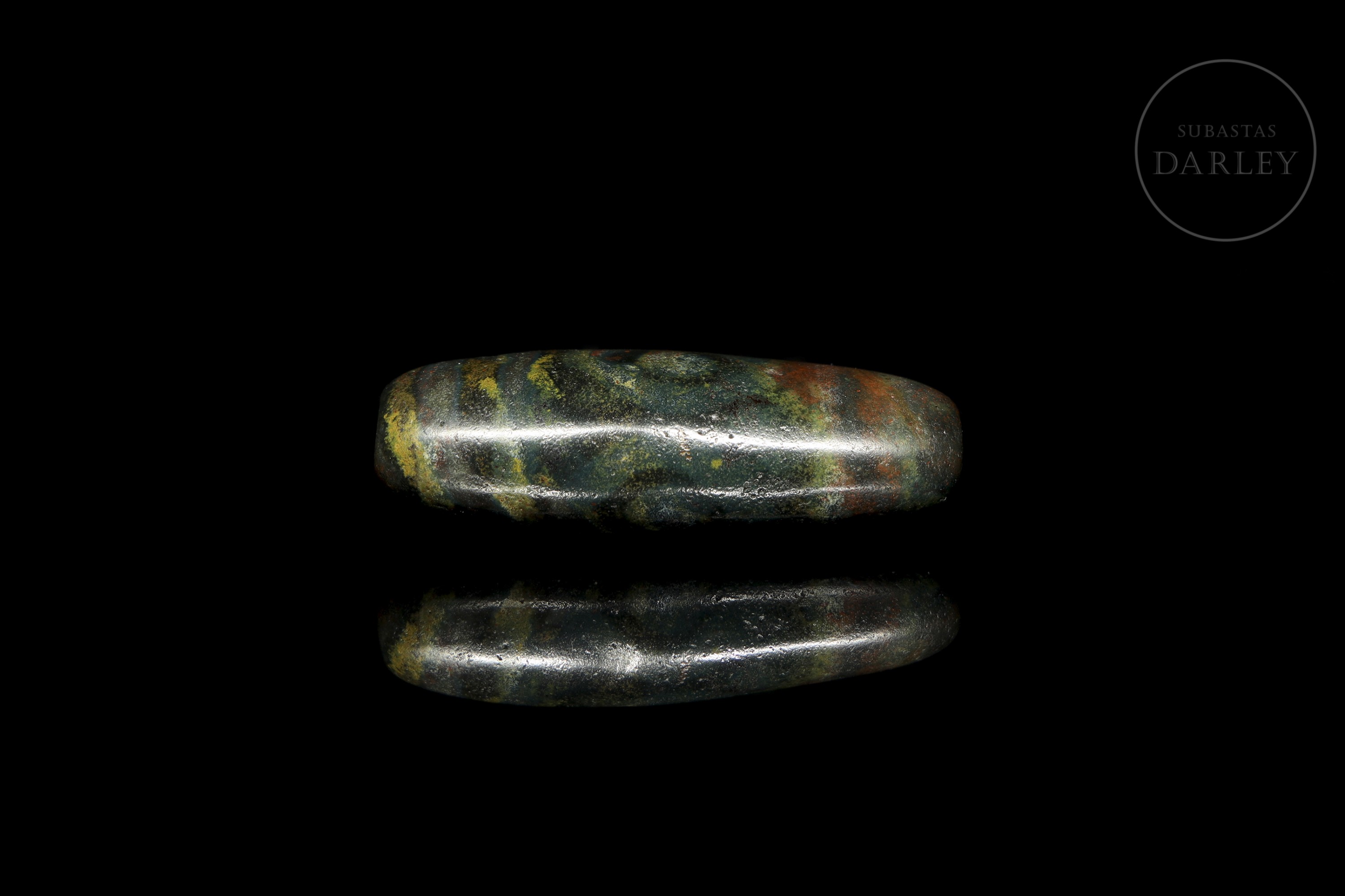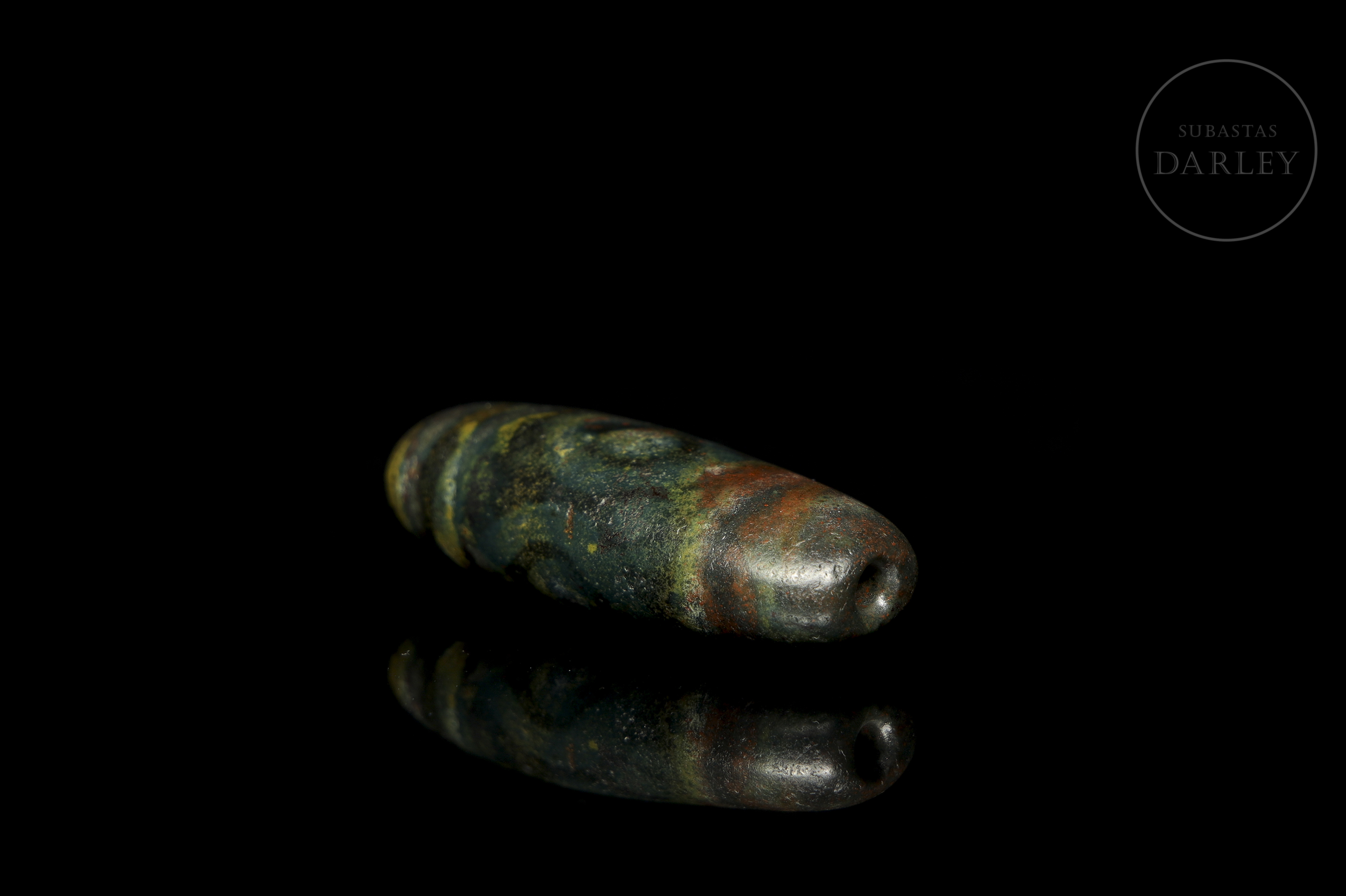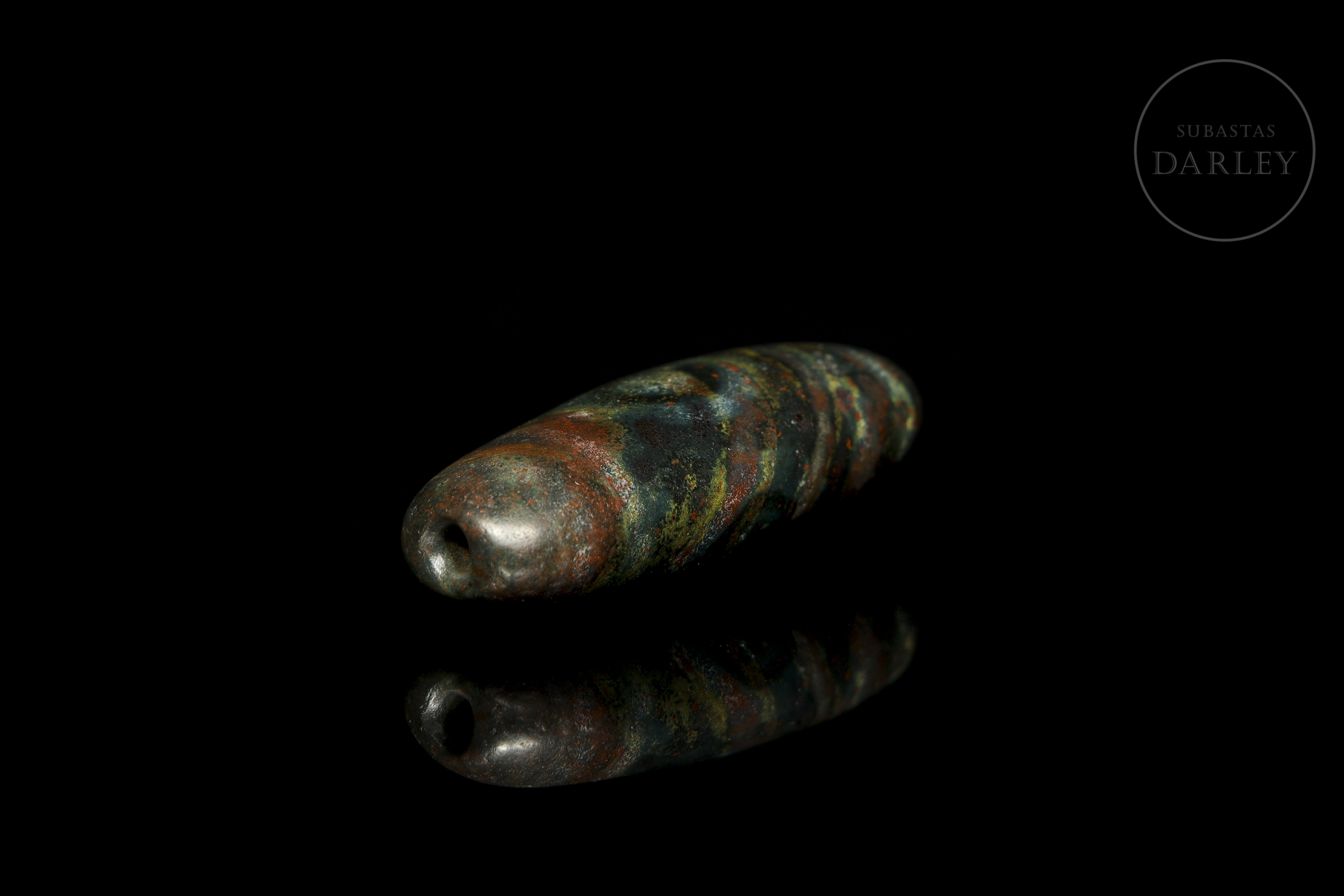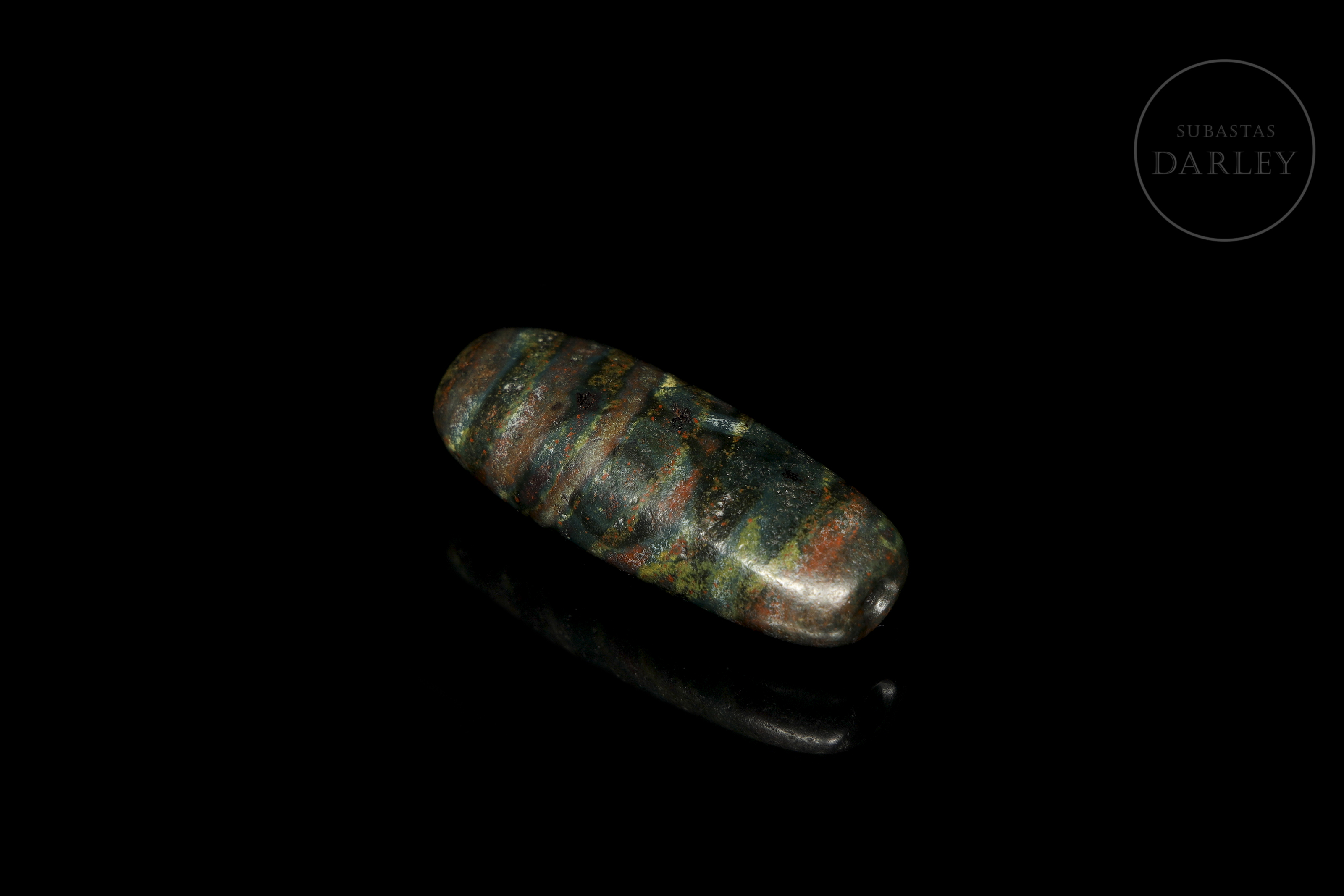 Cuenta alargada tipo Dzi (གཟི།), tallada en ágata de tonalidad terrosa oscura, casi negra, con una marcada e intensa pátina en tonos rojizos y verdosos. La pieza presenta una decoración de bandas paralelas y ojos almendrados que rodean el cuerpo fusiforme. Exhibe desgaste natural derivado de su gran antigüedad. Cultura Xiangxiang (aprox. 1500–1000 a.C.) o posterior.