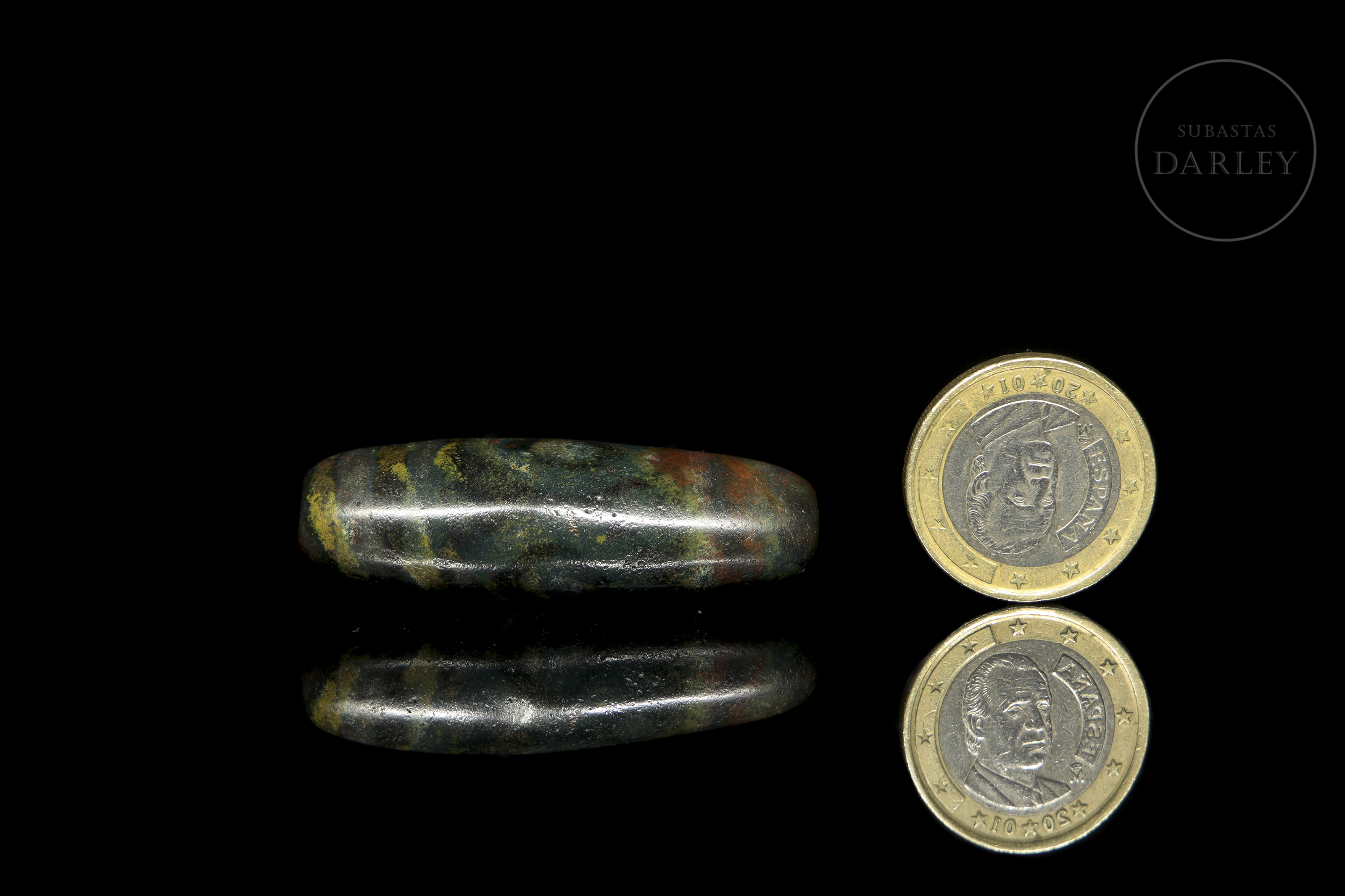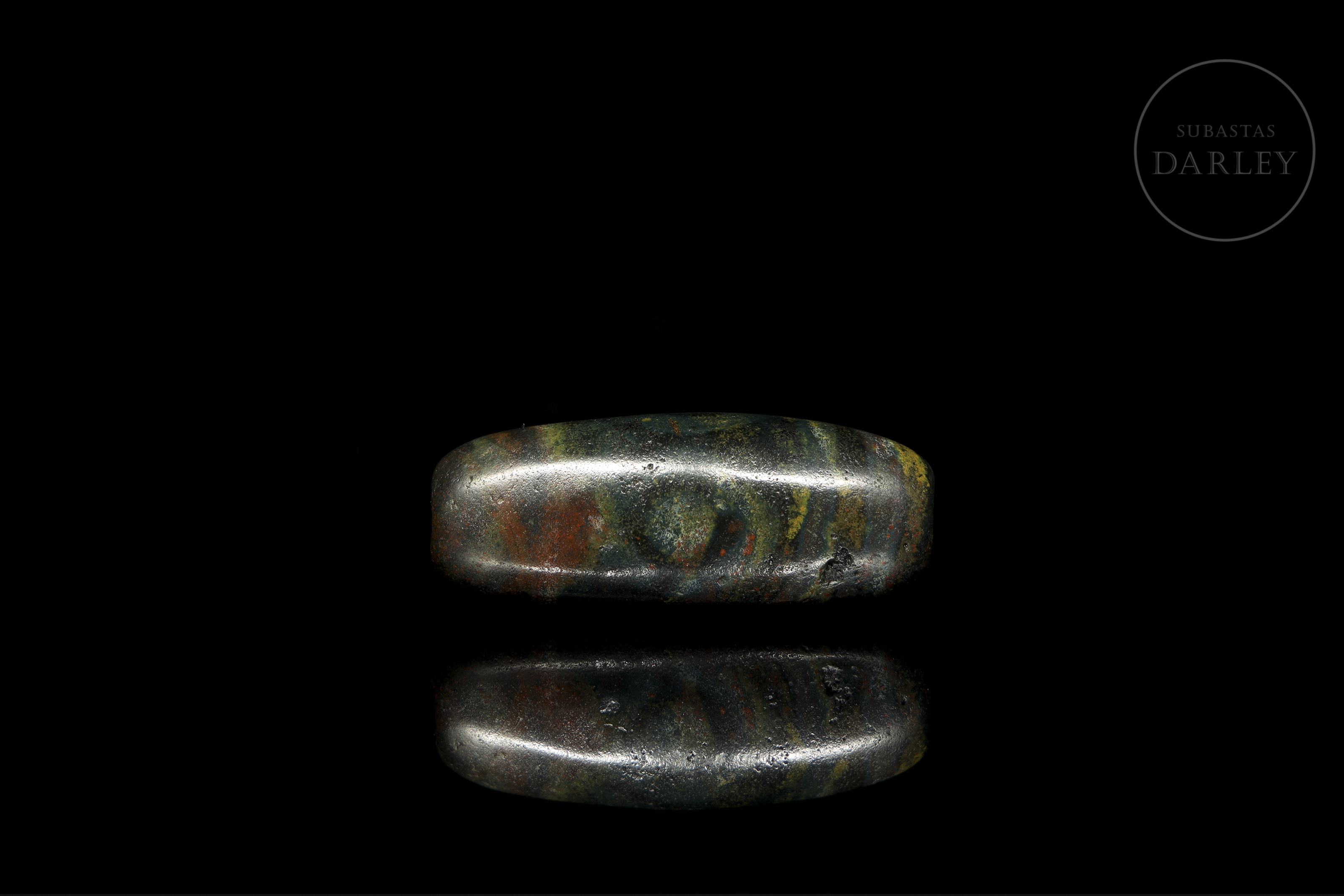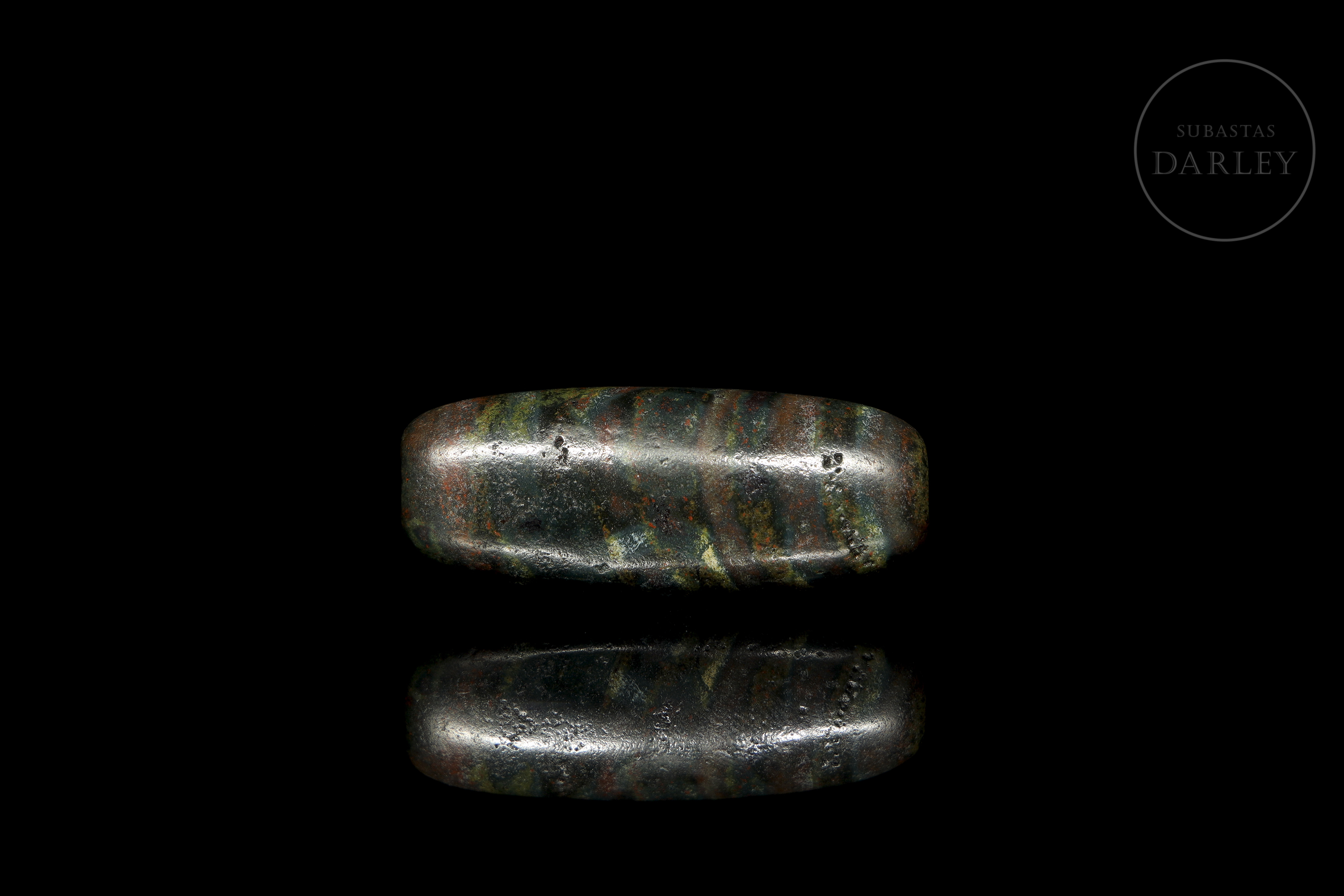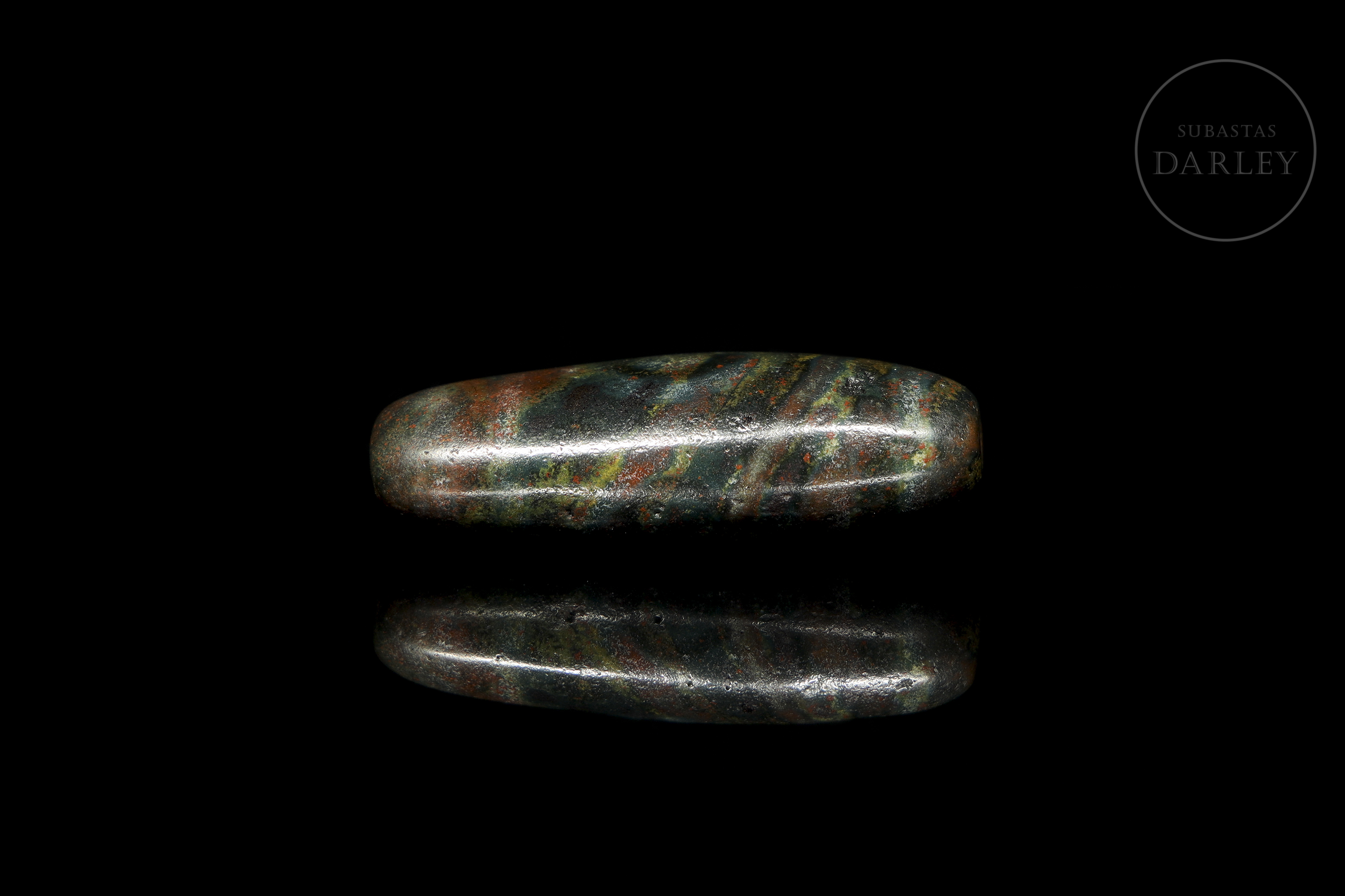 Cuenta alargada tipo Dzi (གཟི།), tallada en ágata de tonalidad terrosa oscura, casi negra, con una marcada e intensa pátina en tonos rojizos y verdosos. La pieza presenta una decoración de bandas paralelas y ojos almendrados que rodean el cuerpo fusiforme. Exhibe desgaste natural derivado de su gran antigüedad. Cultura Xiangxiang (aprox. 1500–1000 a.C.) o posterior.