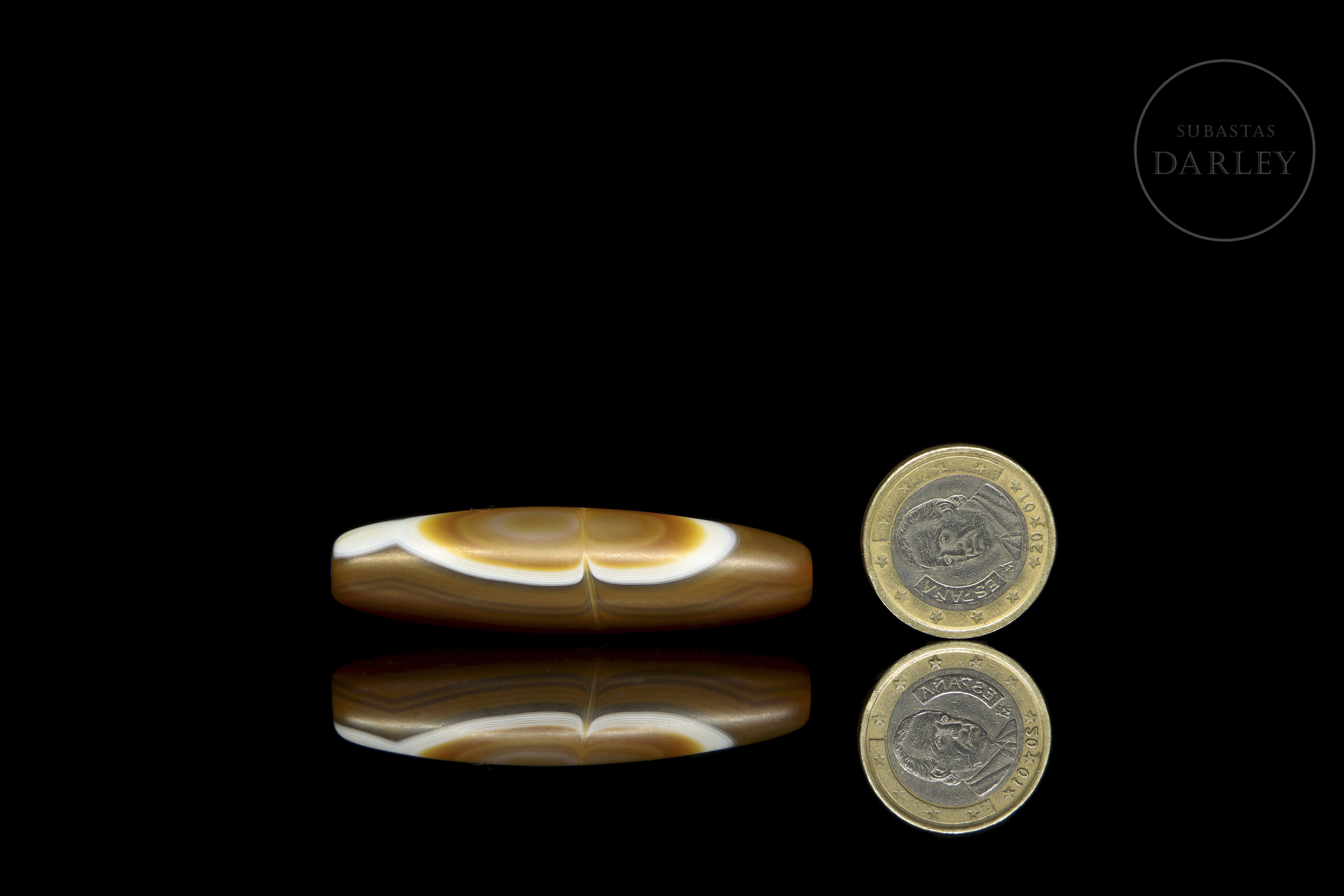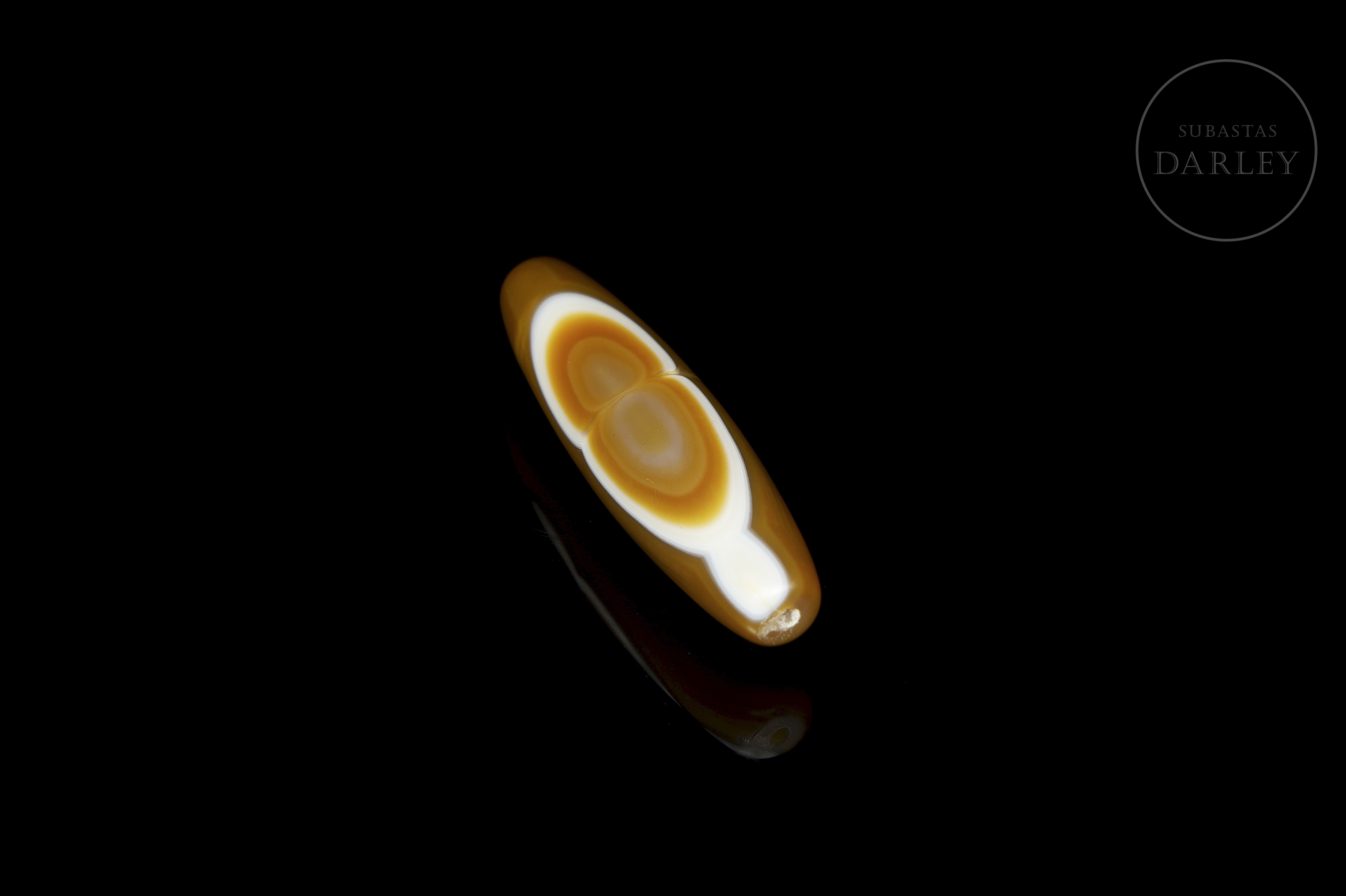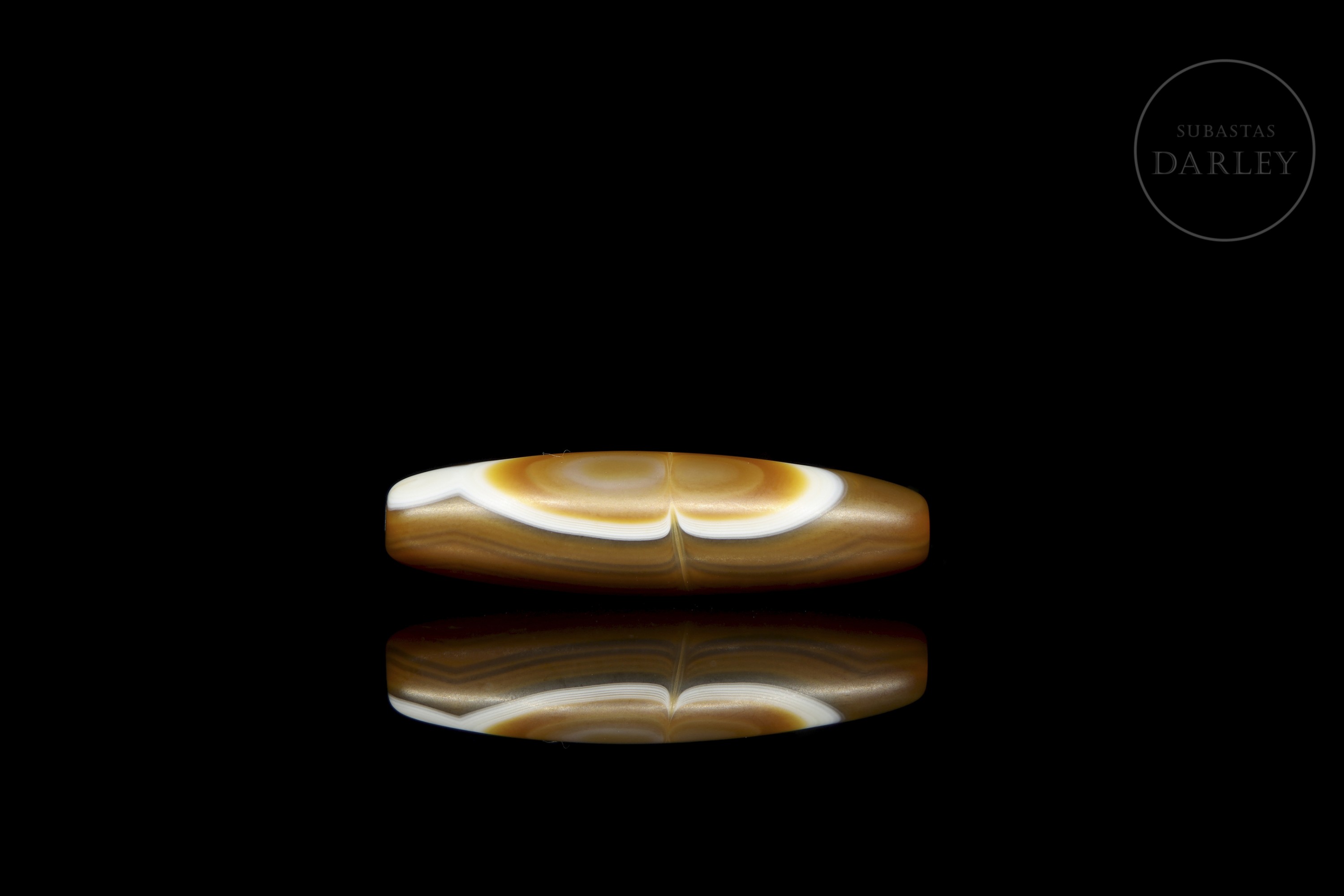 Cuenta Dizi de ágata natural en tonos caramelo, miel y blanco. La pieza presenta un formato abarrilado con los extremos suavemente redondeados. Destaca por su decoración natural: se aprecia un patrón de bandas concéntricas que forman un gran ojo central altamente valorado por su simbolismo protector. Posee una perforación central. Muestra pátina por antigüedad. Dinastía Liao (916–1125) o posterior.