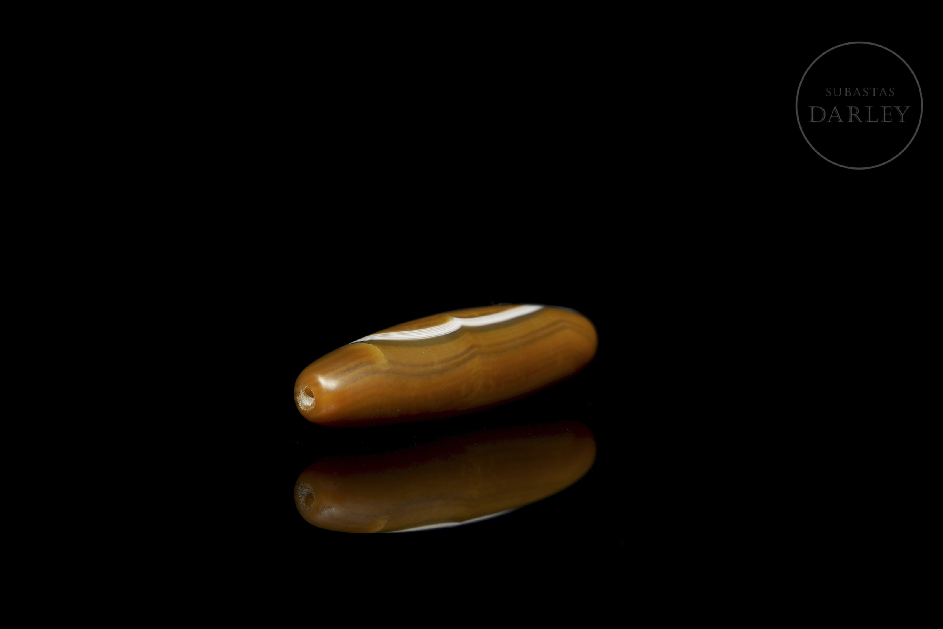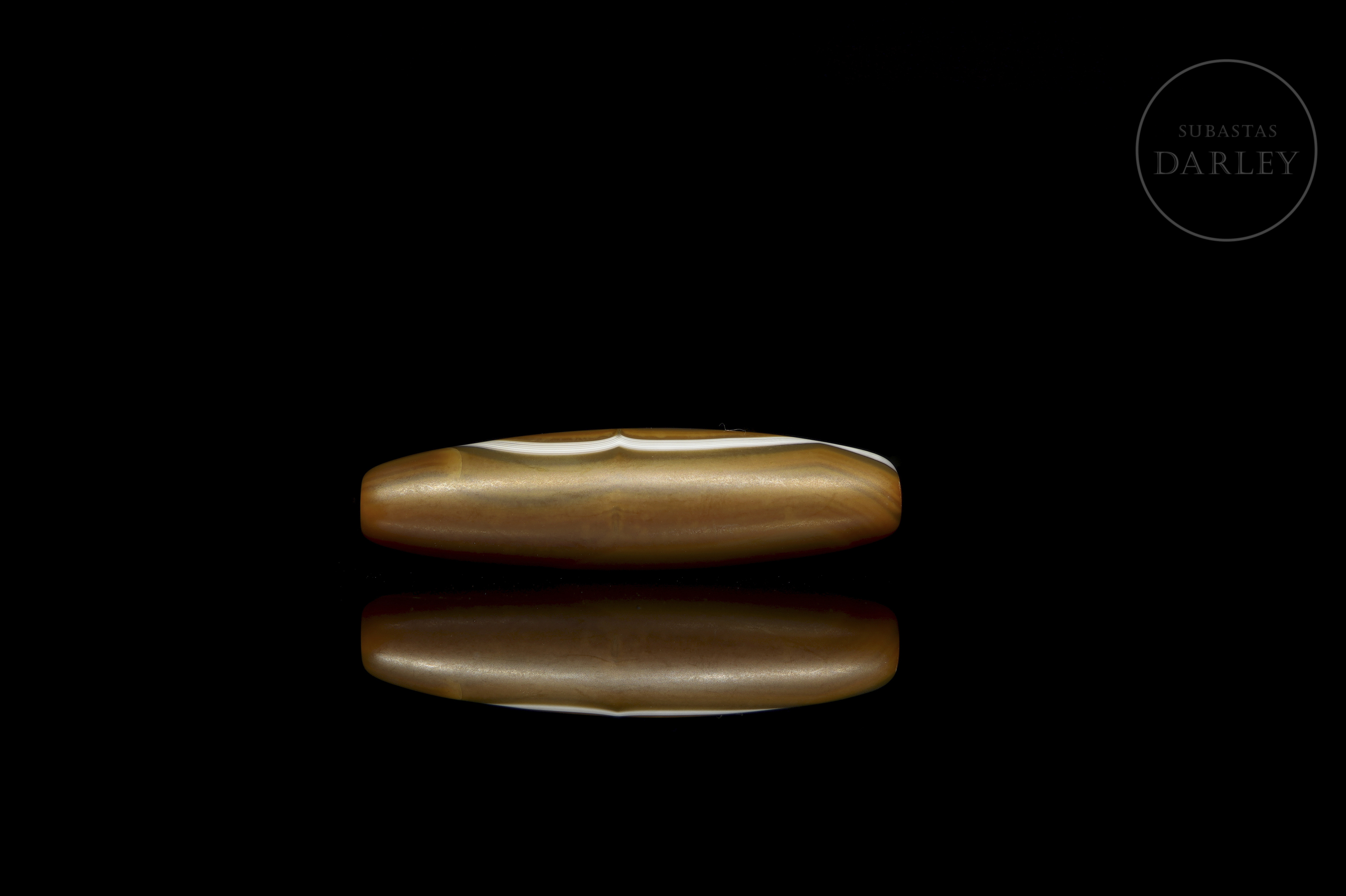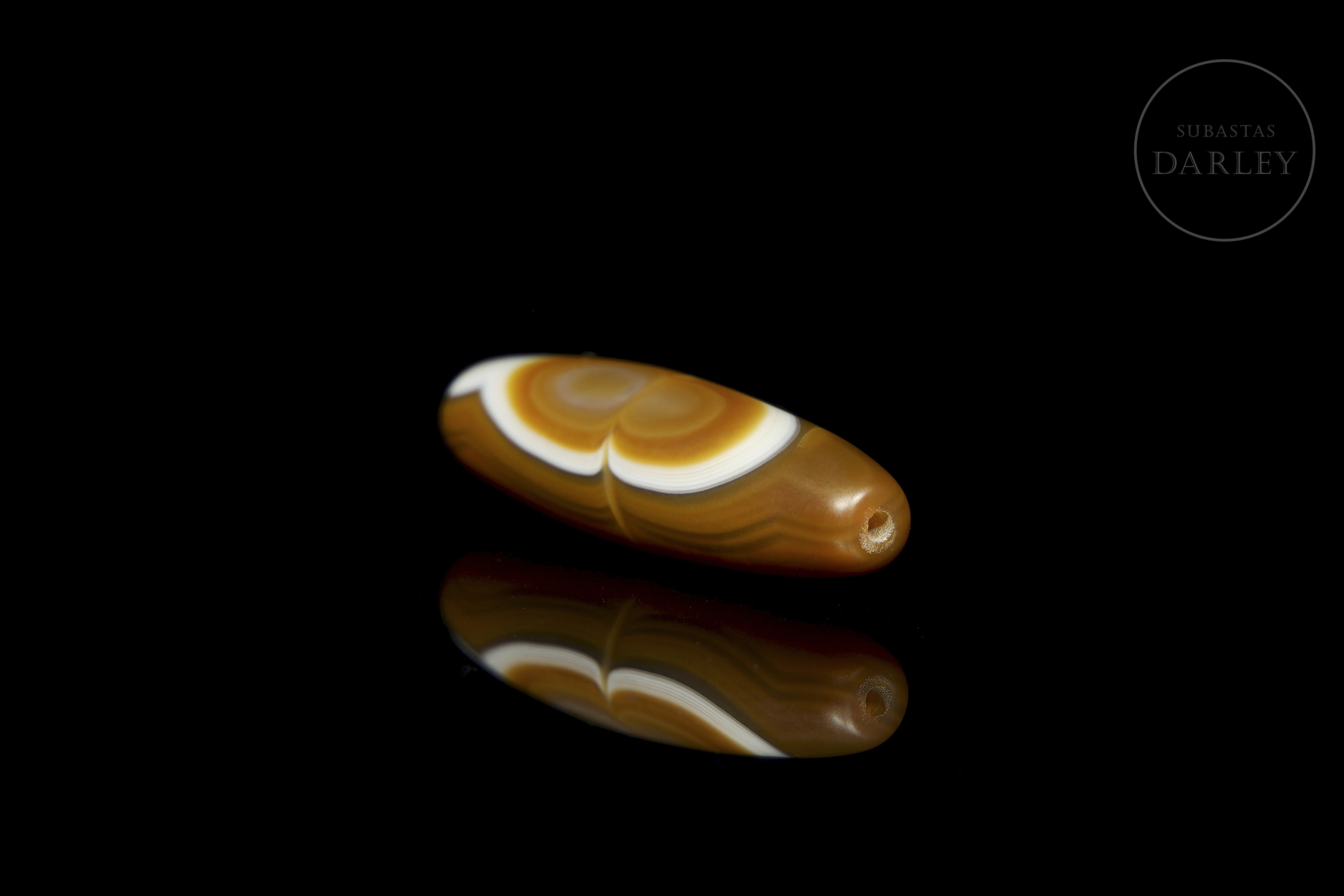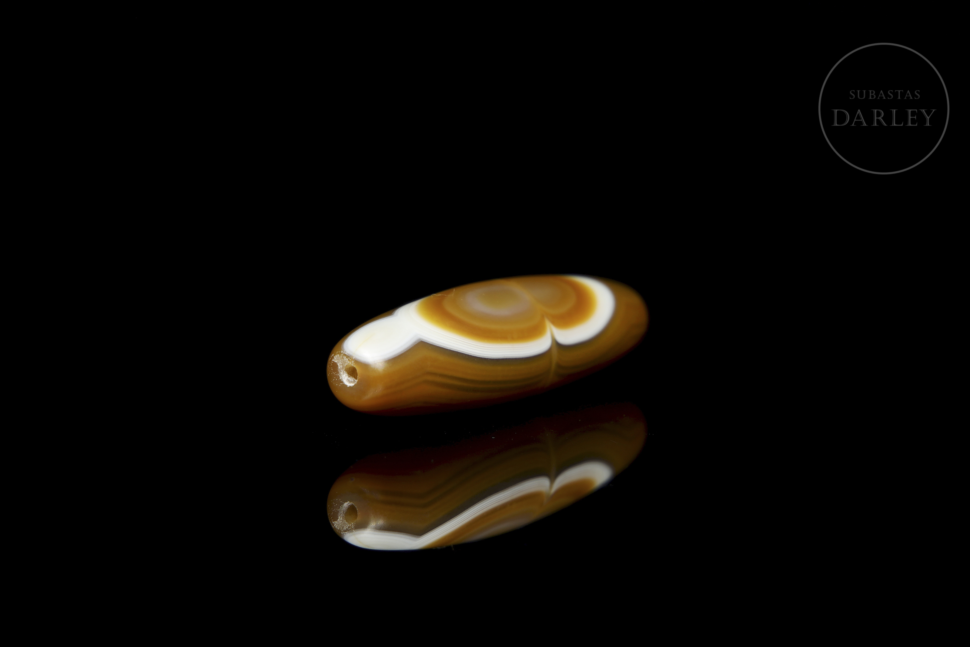 Cuenta Dizi de ágata natural en tonos caramelo, miel y blanco. La pieza presenta un formato abarrilado con los extremos suavemente redondeados. Destaca por su decoración natural: se aprecia un patrón de bandas concéntricas que forman un gran ojo central altamente valorado por su simbolismo protector. Posee una perforación central. Muestra pátina por antigüedad. Dinastía Liao (916–1125) o posterior.