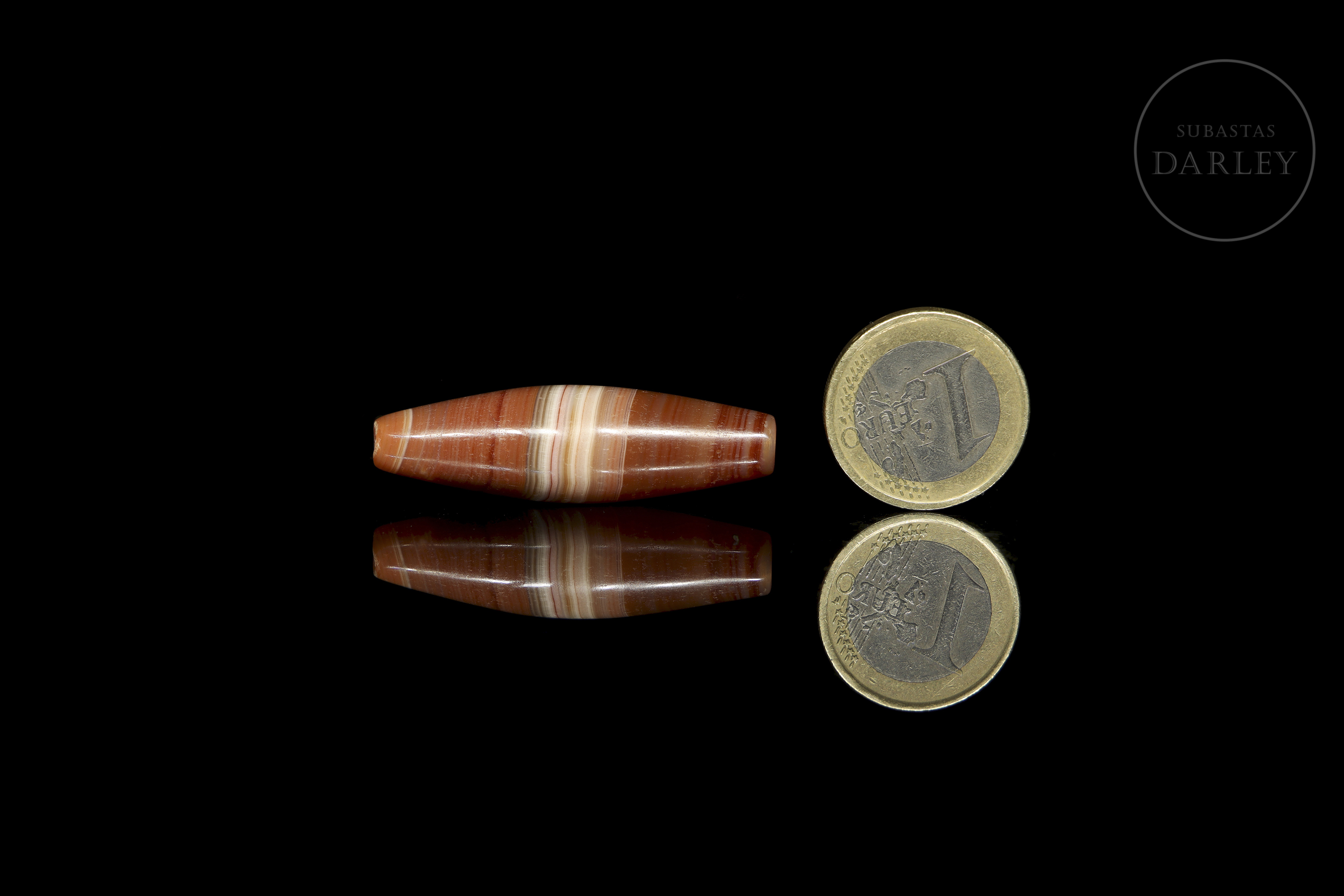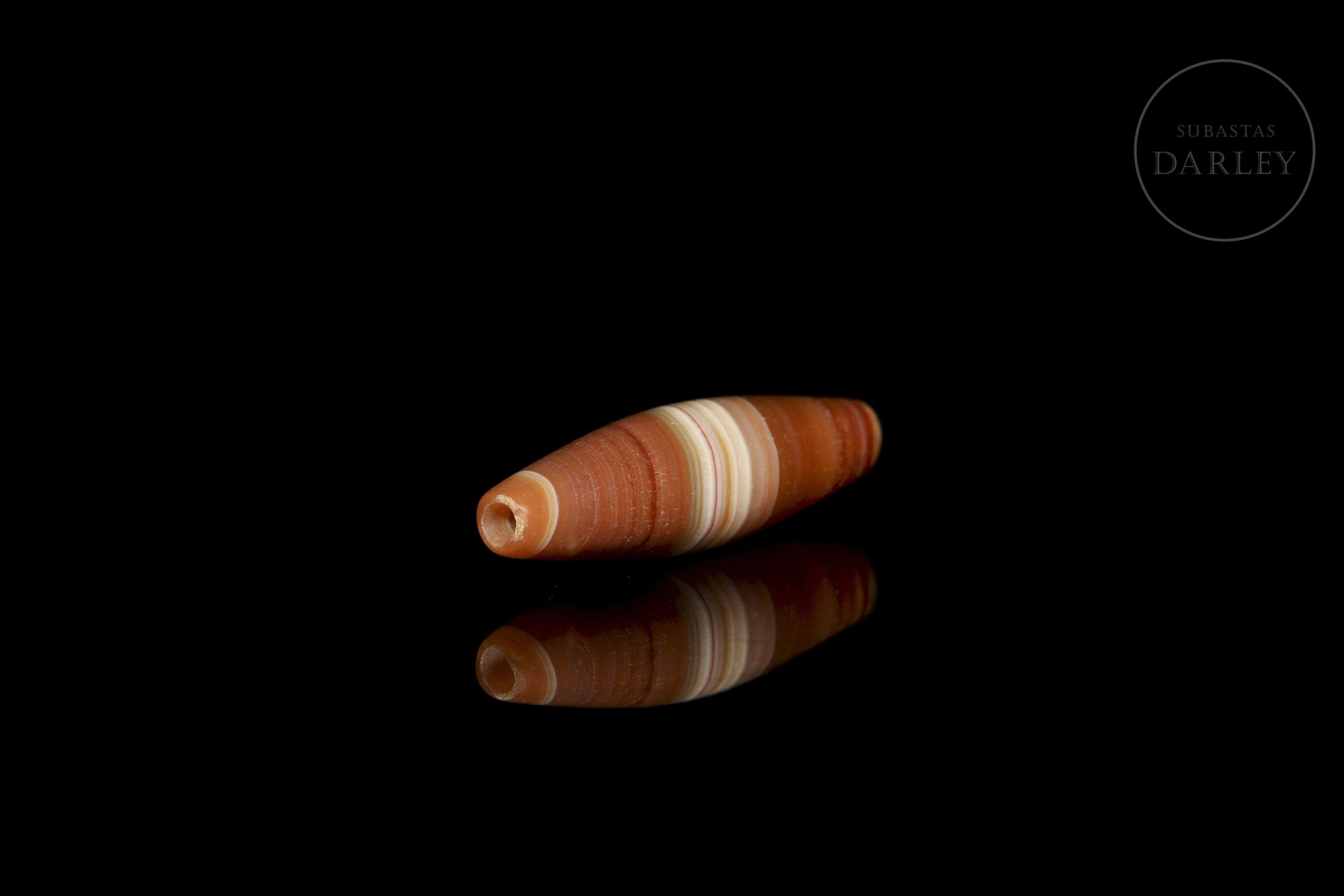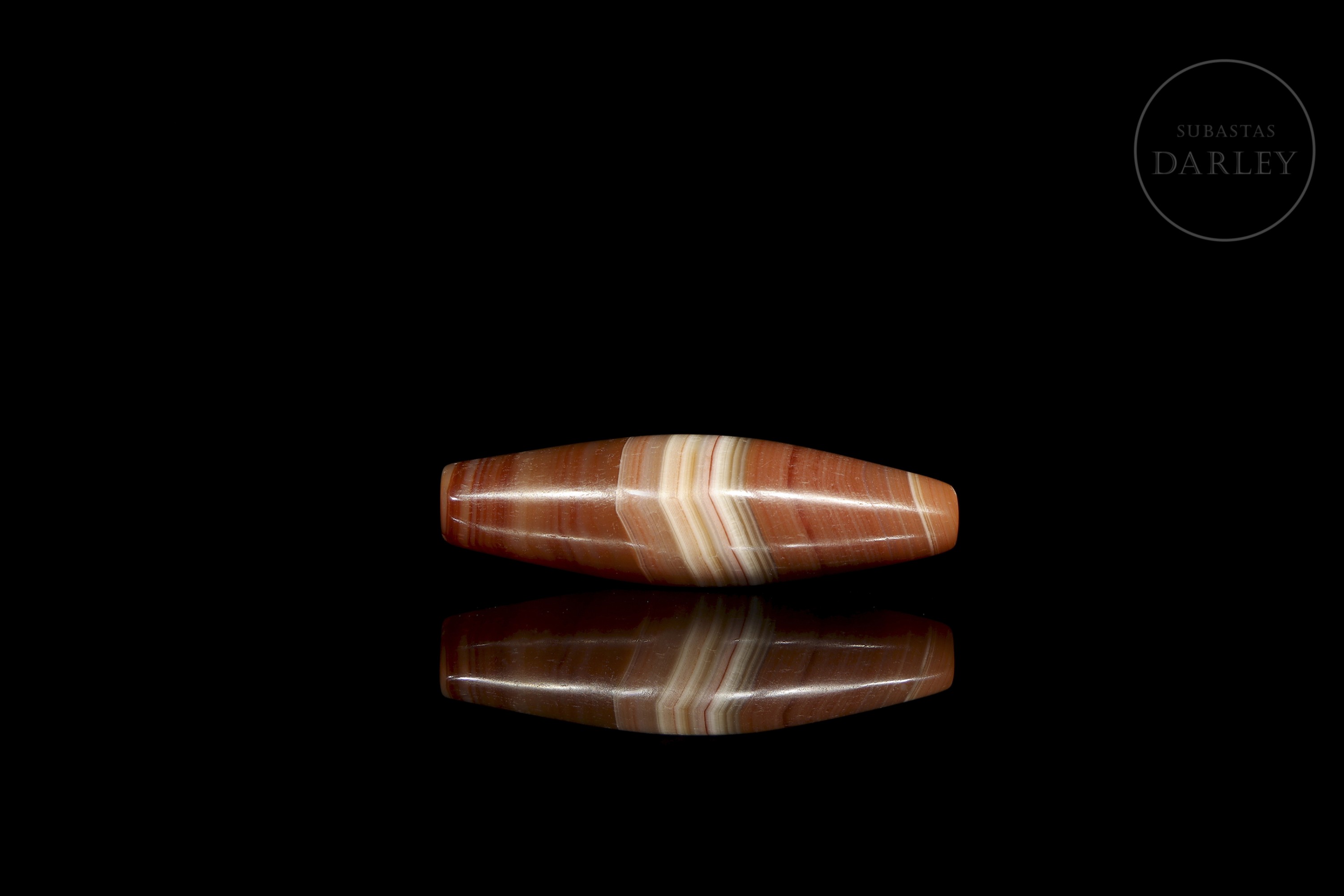 Realizada en ágata de tonalidad roja anaranjada con una excepcional alternancia de bandas naturales concéntricas en blanco y crema que crean un patrón lineal definido. La pieza presenta un formato alargado, que se ensancha en el centro, con los extremos redondeados. Muestra pátina por envejecimiento. Dinastía Liao (916–1125) o posterior.