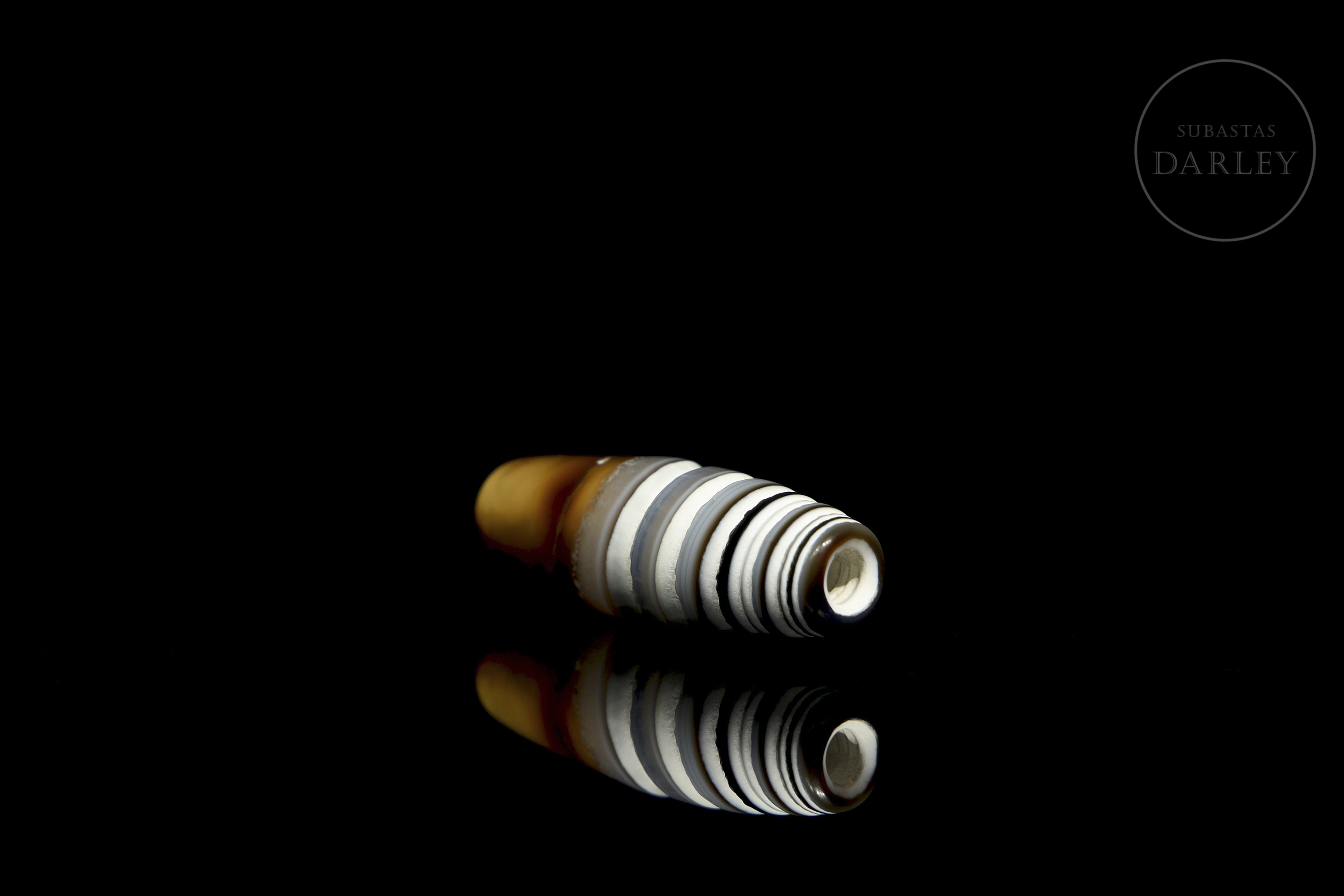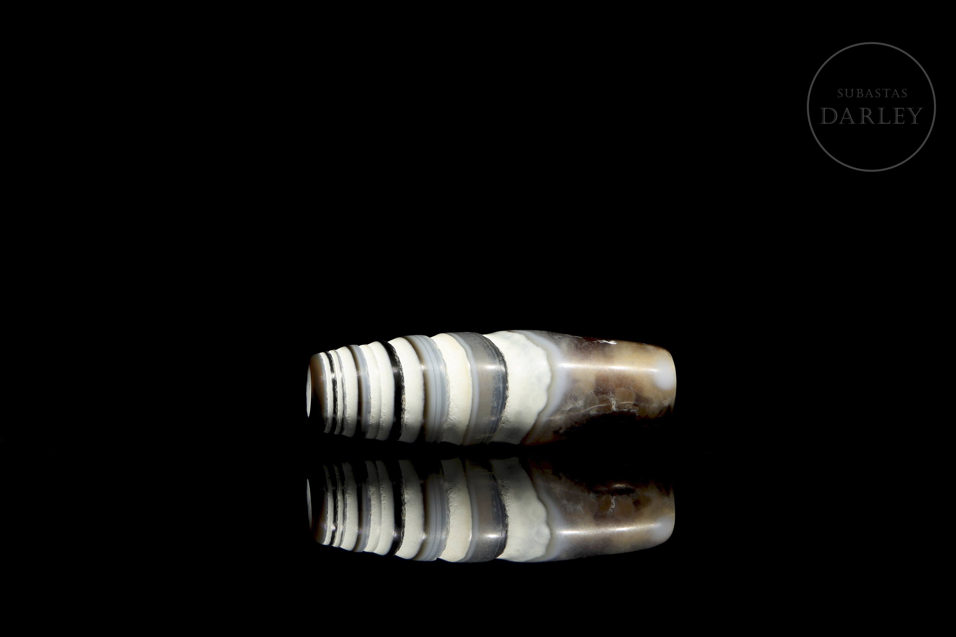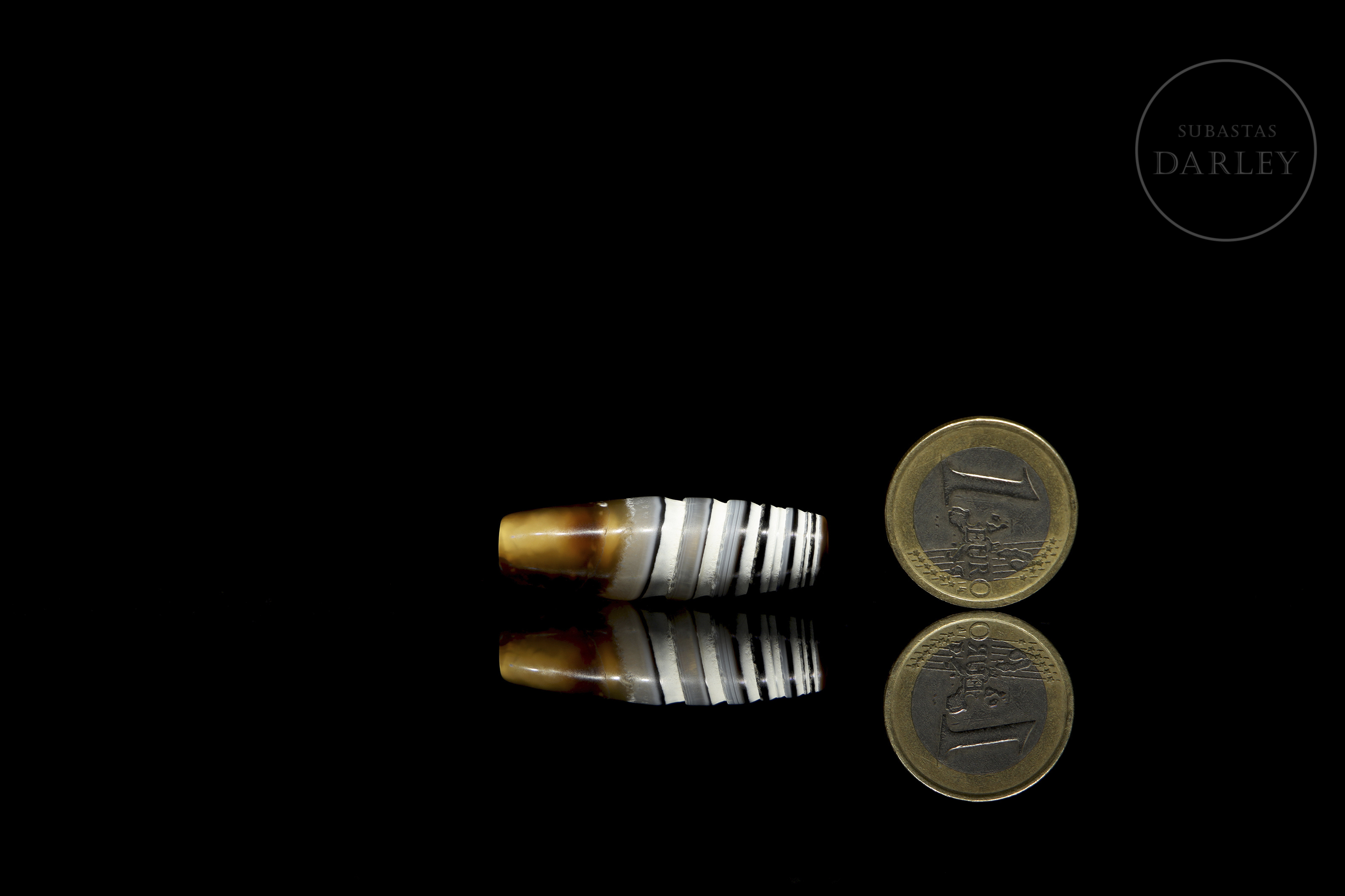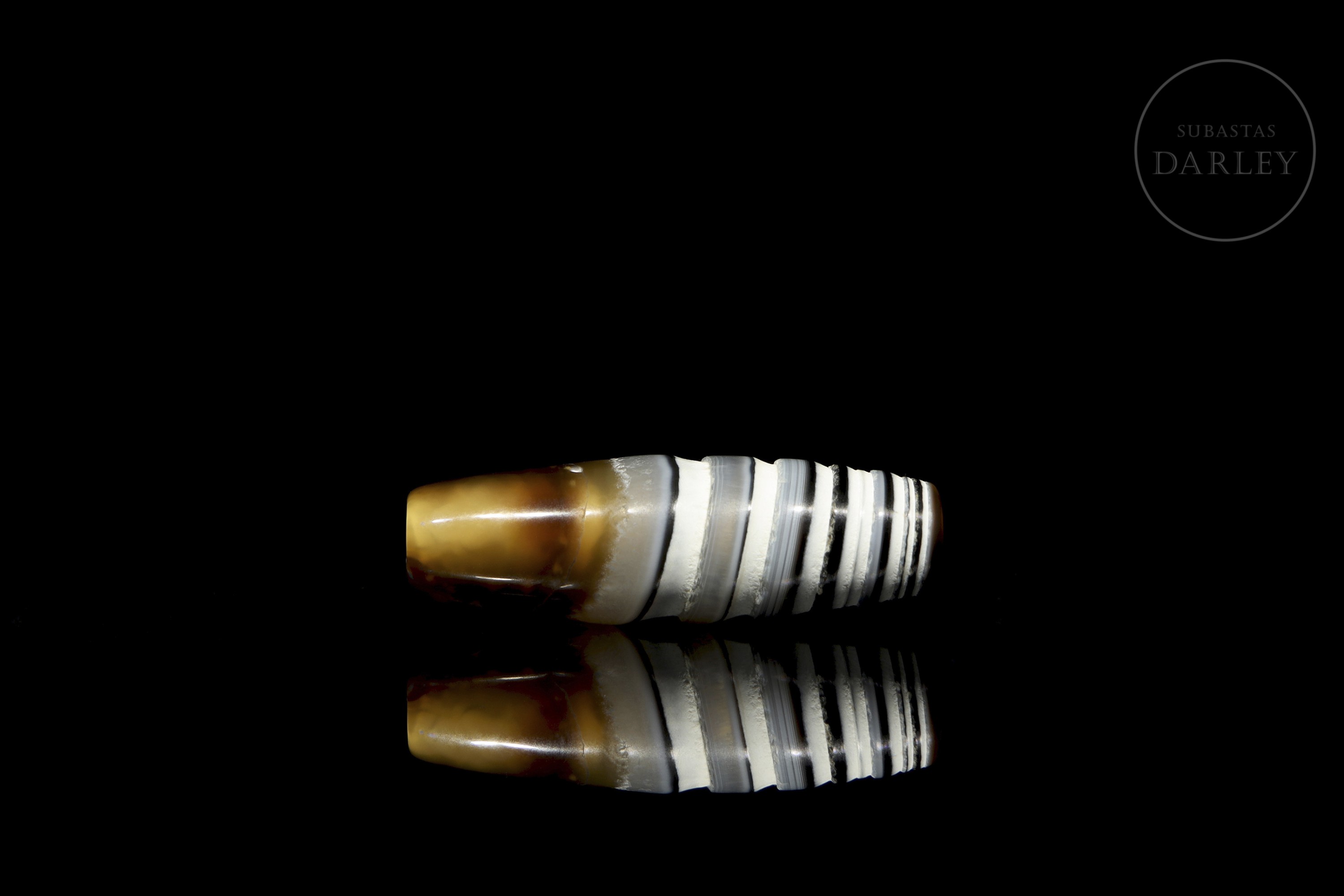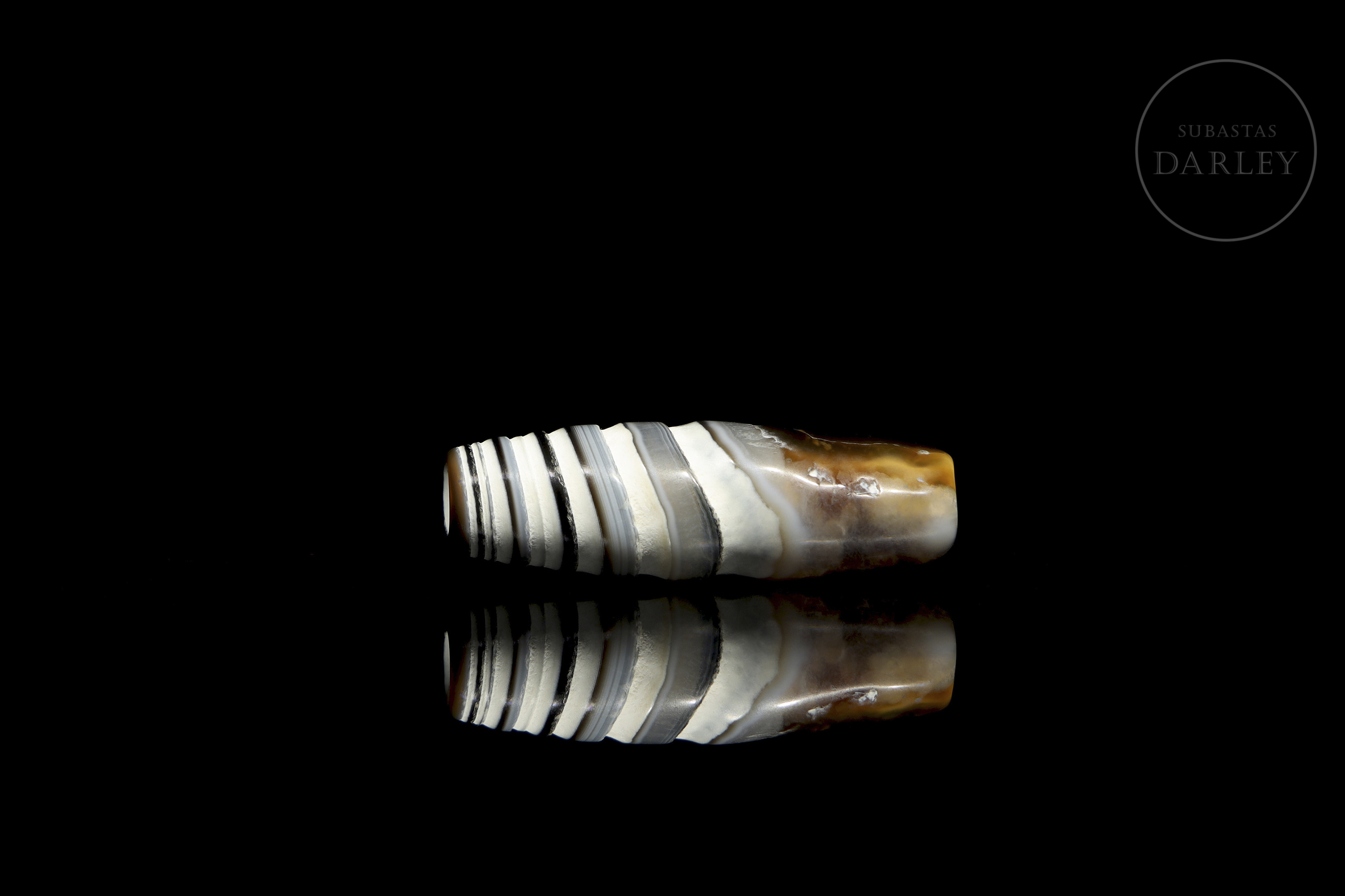 Ágata tallada y pulida, con una forma cilíndrica y perfil abombado perforada longitudinalmente. Es multicolor y utiliza las bandas naturales de la piedra, alternando tonos de blanco cremoso, gris oscuro y marrón. La decoración se basa en el diseño geométrico de las bandas concéntricas. Dinastía Liao (907–1125 d.C.).