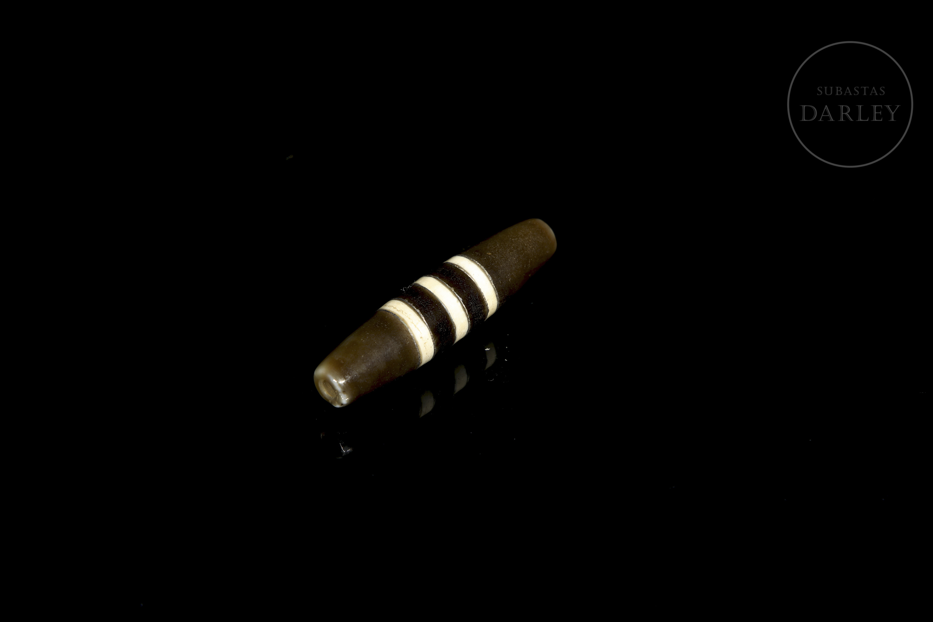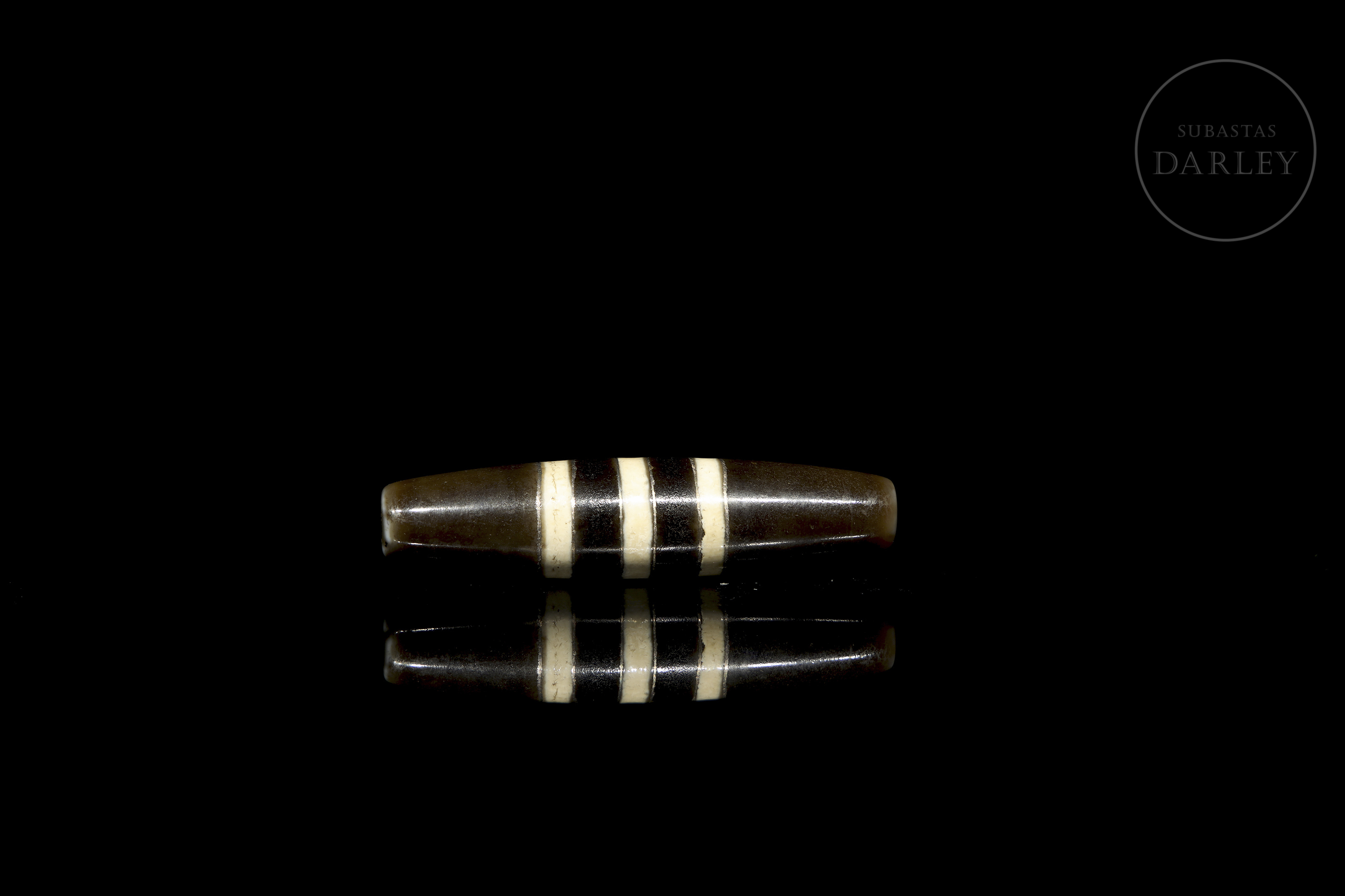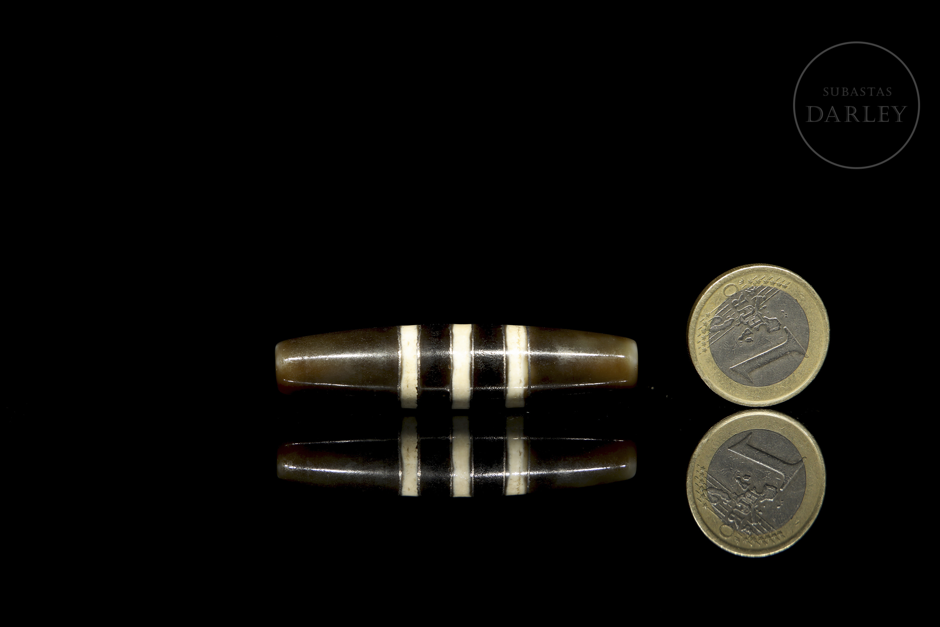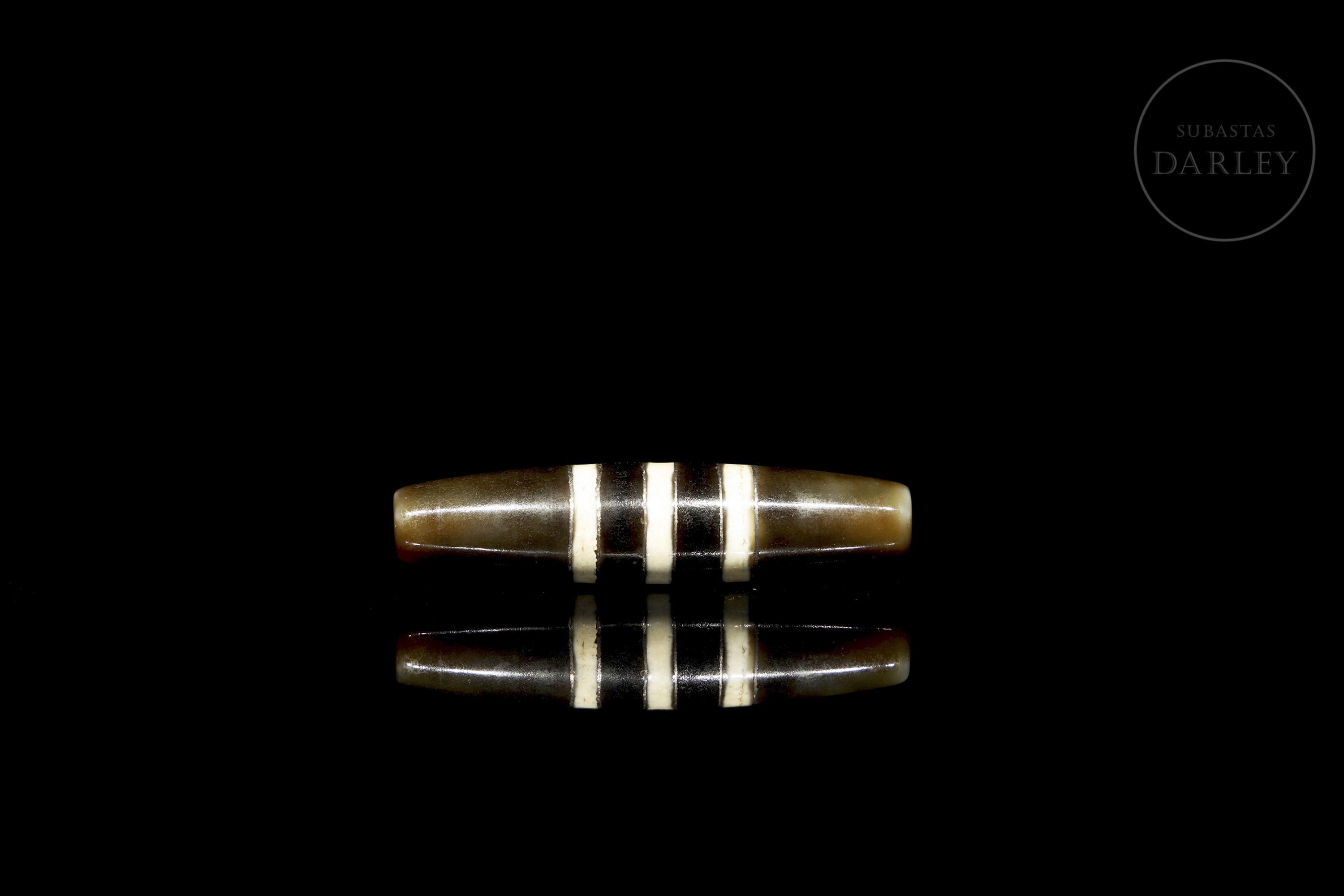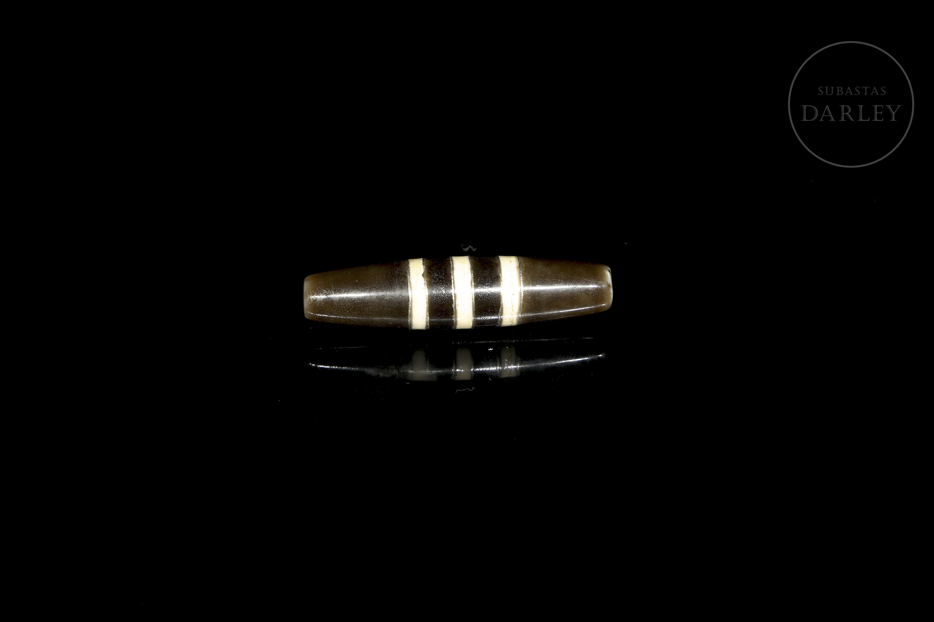 Cuenta Dzi (གཟི།) de ágata tallada, de forma tubular y perfil de barril. Presenta un cuerpo de color marrón oscuro, sutilmente más claro hacia los extremos, decorado con tres anchas bandas longitudinales de color blanco. La pieza muestra una pátina suave por antigüedad. Dinastía Tang (618-906).