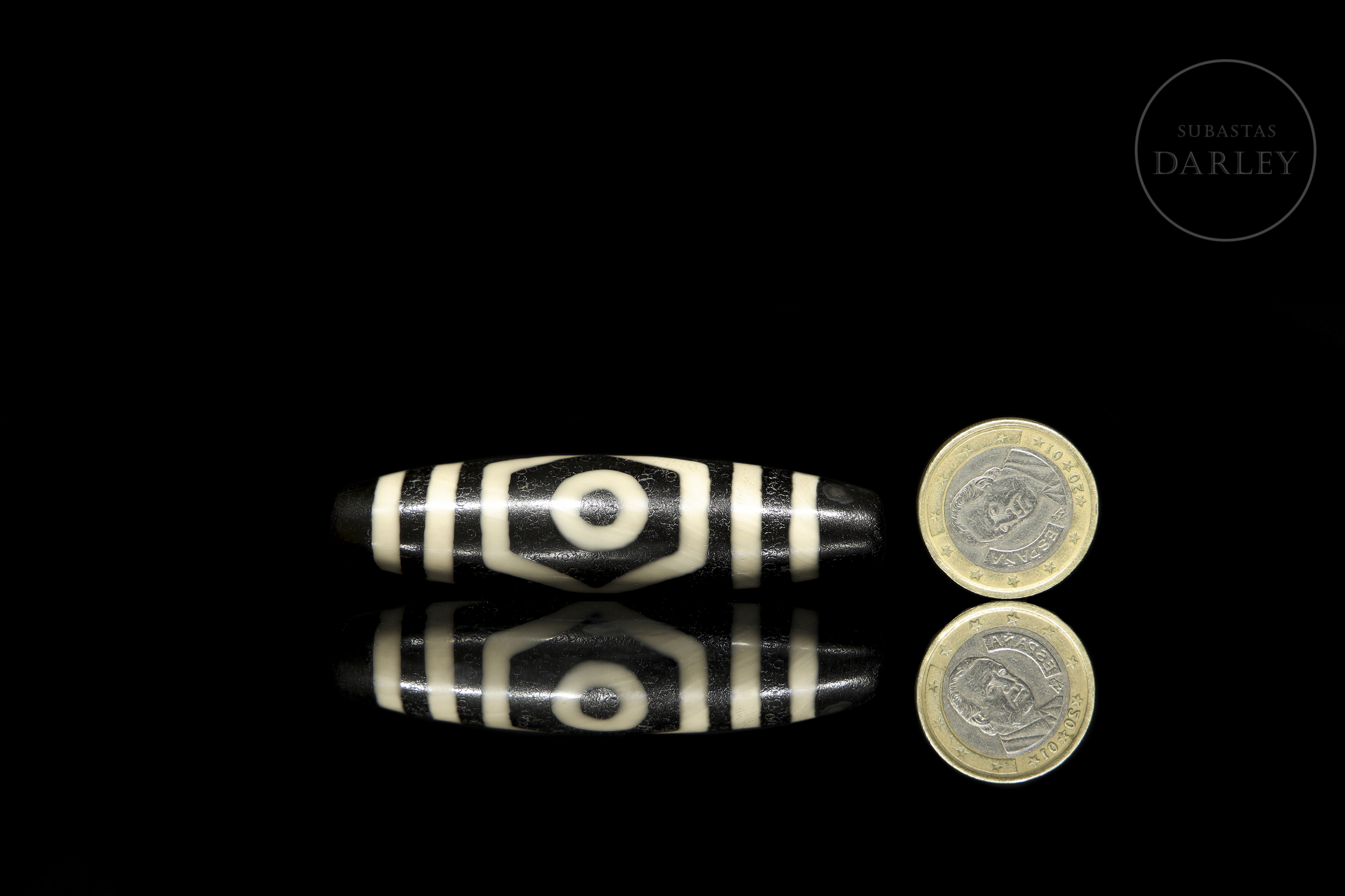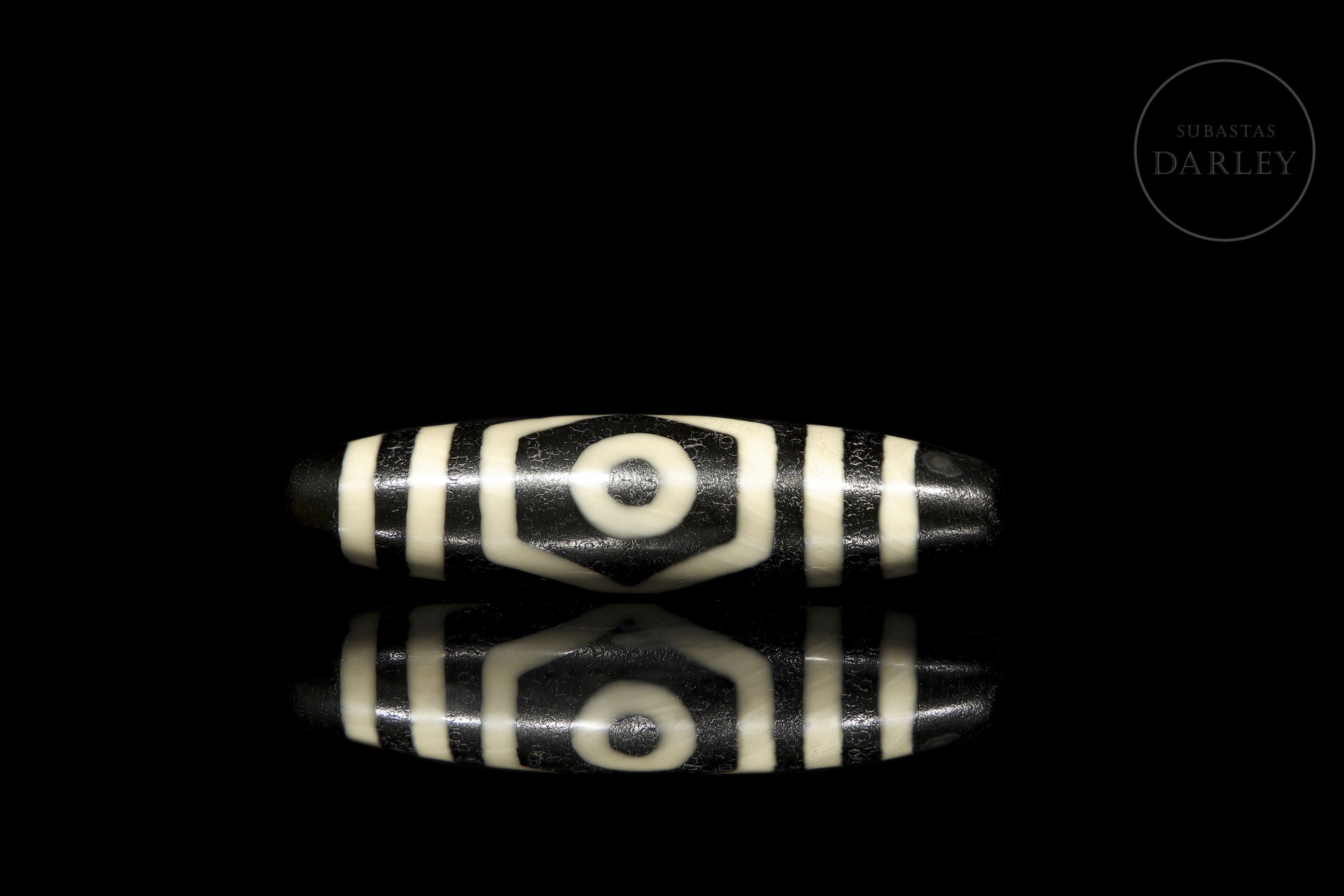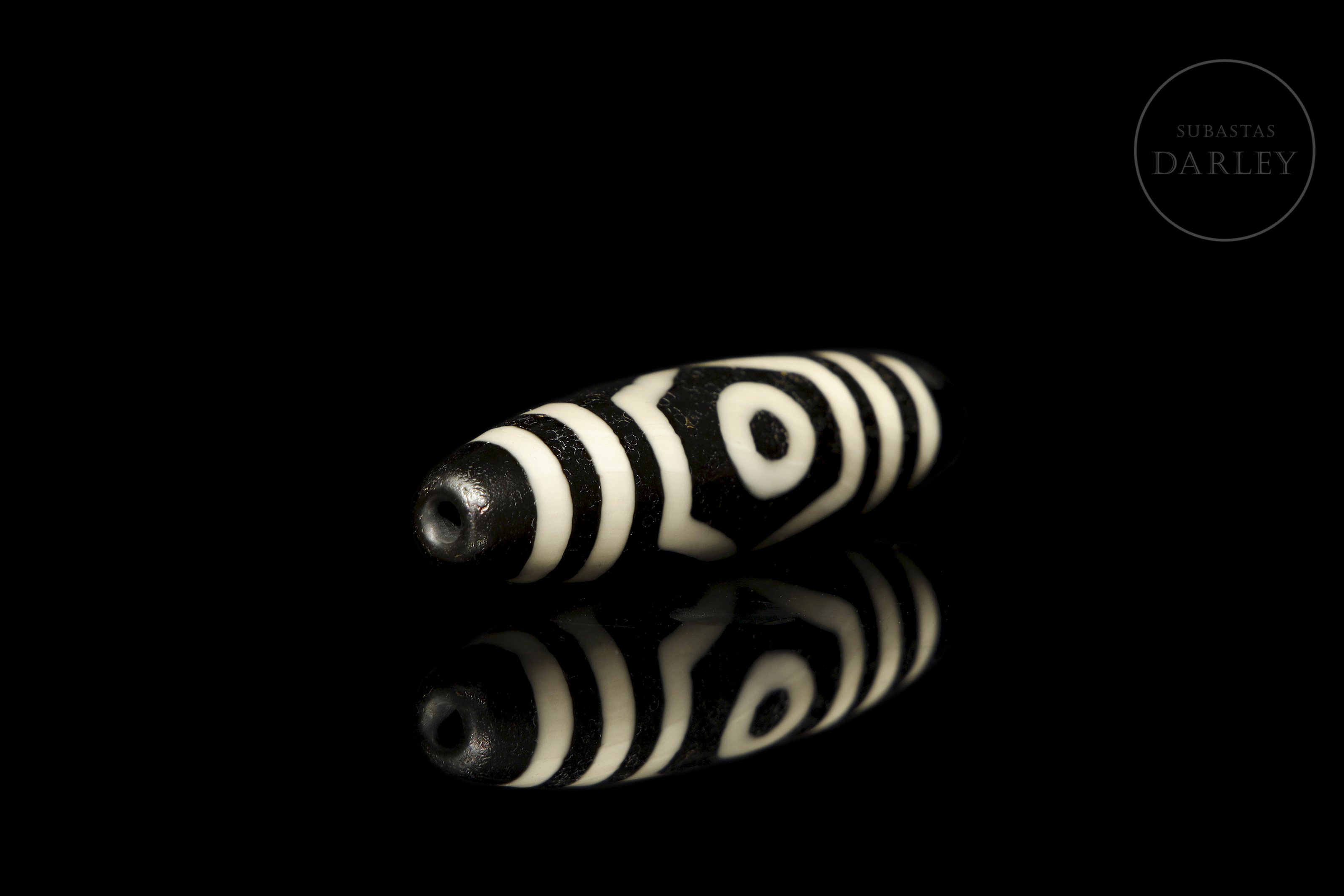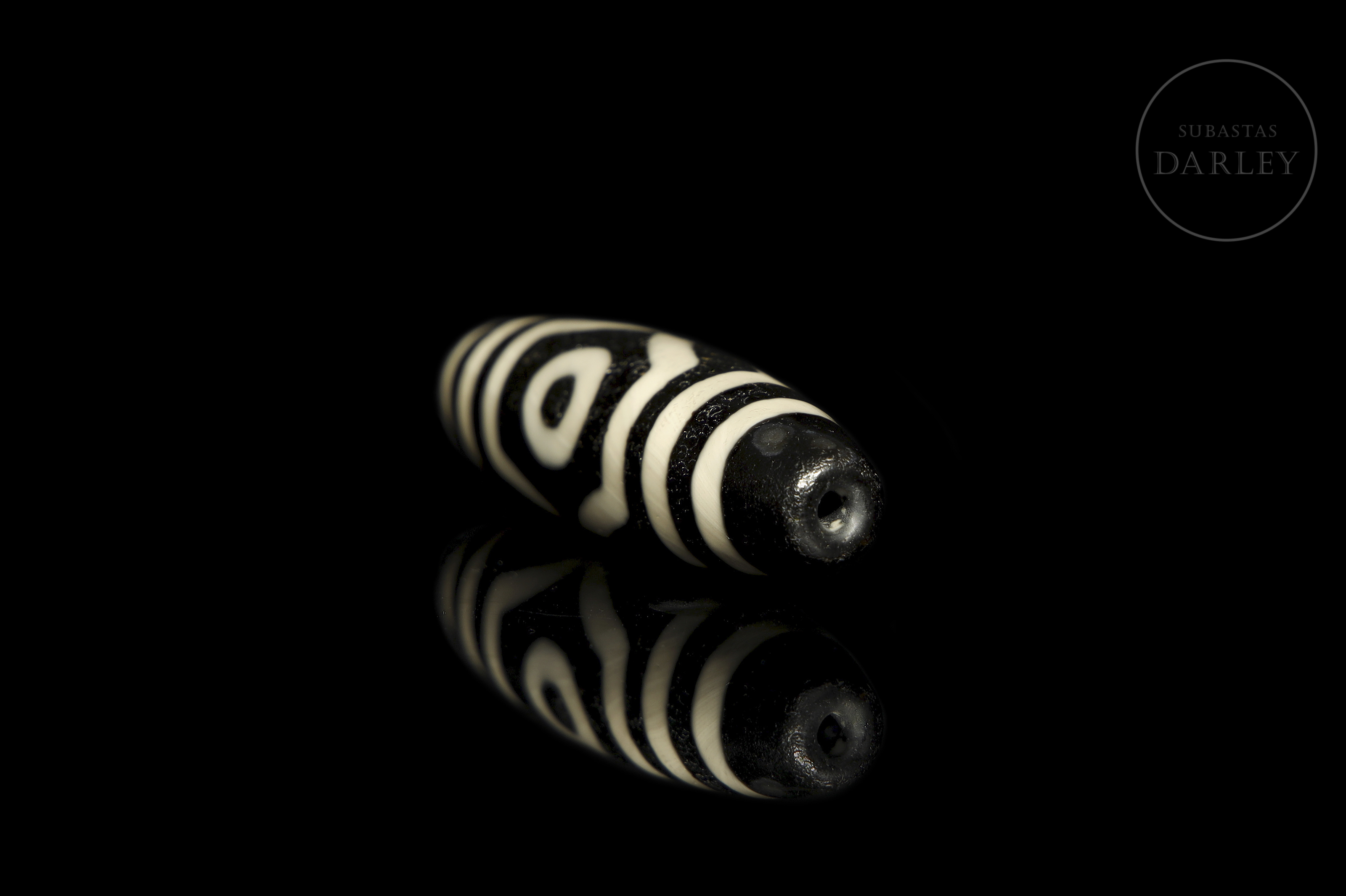 Cuenta de ágata de una tonalidad marrón oscura, casi negra, con decoraciones en un nítido color blanco lechoso. La pieza presenta un formato fusiforme robusto con una perforación longitudinal. Muestra un diseño geométrico de "tres ojos" circulares, enmarcados por bandas angulares en el cuerpo central, delimitado por dos bandas paralelas en cada extremo. Dinastía Tang (618–907) o posterior.