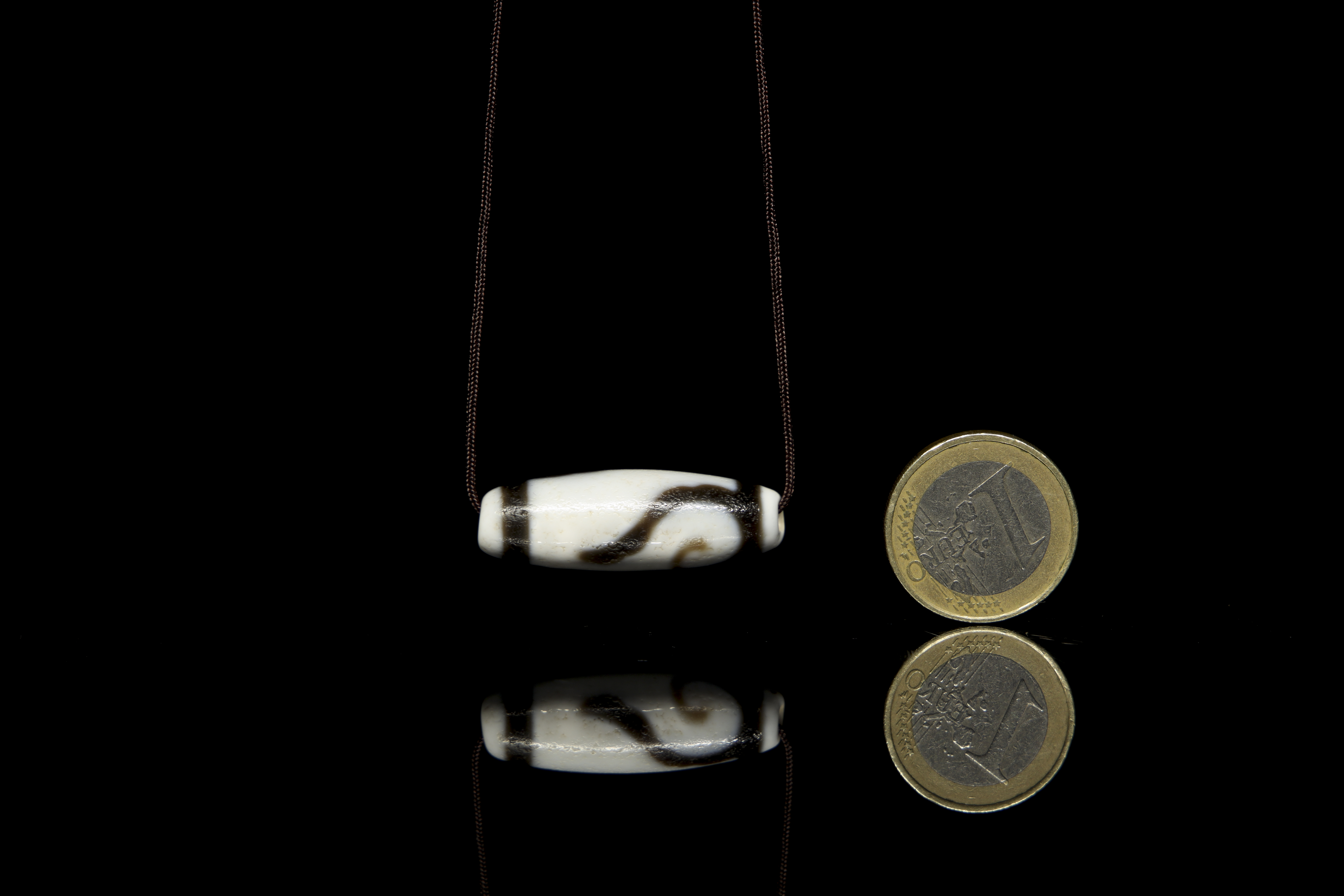 Ágata tallada en forma de vaina, alargada con bordes redondeados, ligeramente más ancha en el centro. Posee un orificio central que lo atraviesa para la colocación de un cordón. Conformada por dos colores, marrón que dibuja líneas y roleos sobre el fondo blanco.