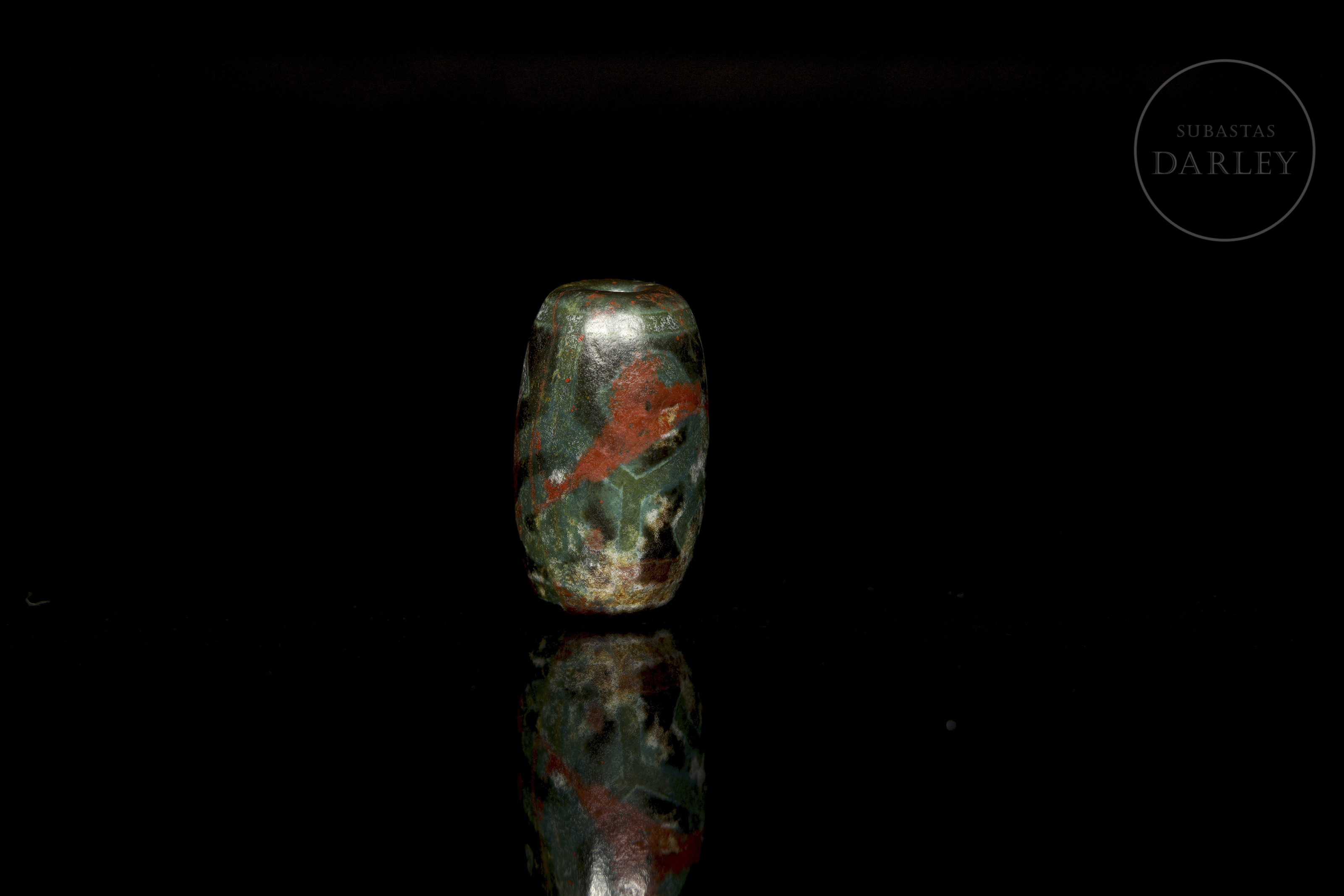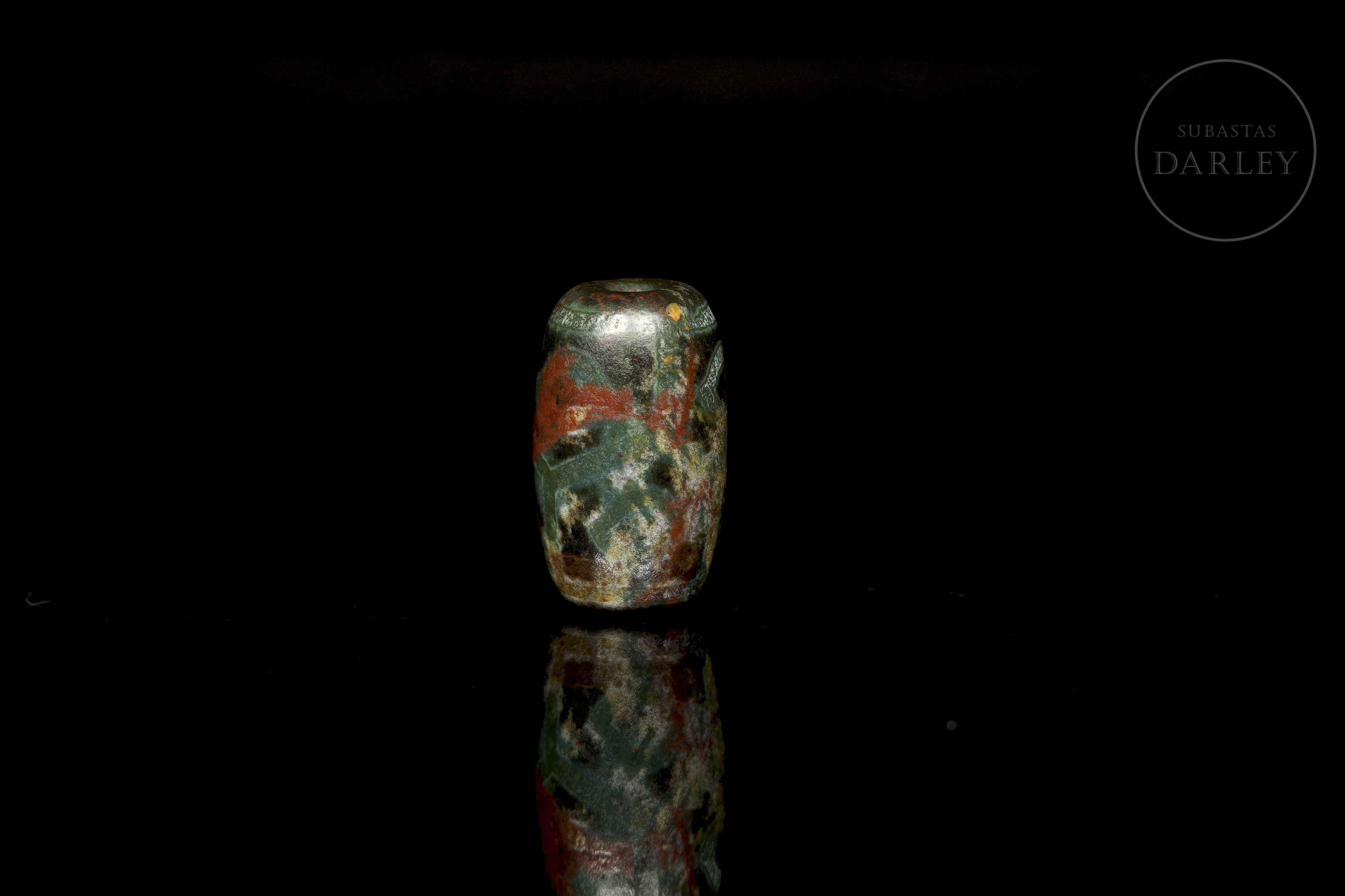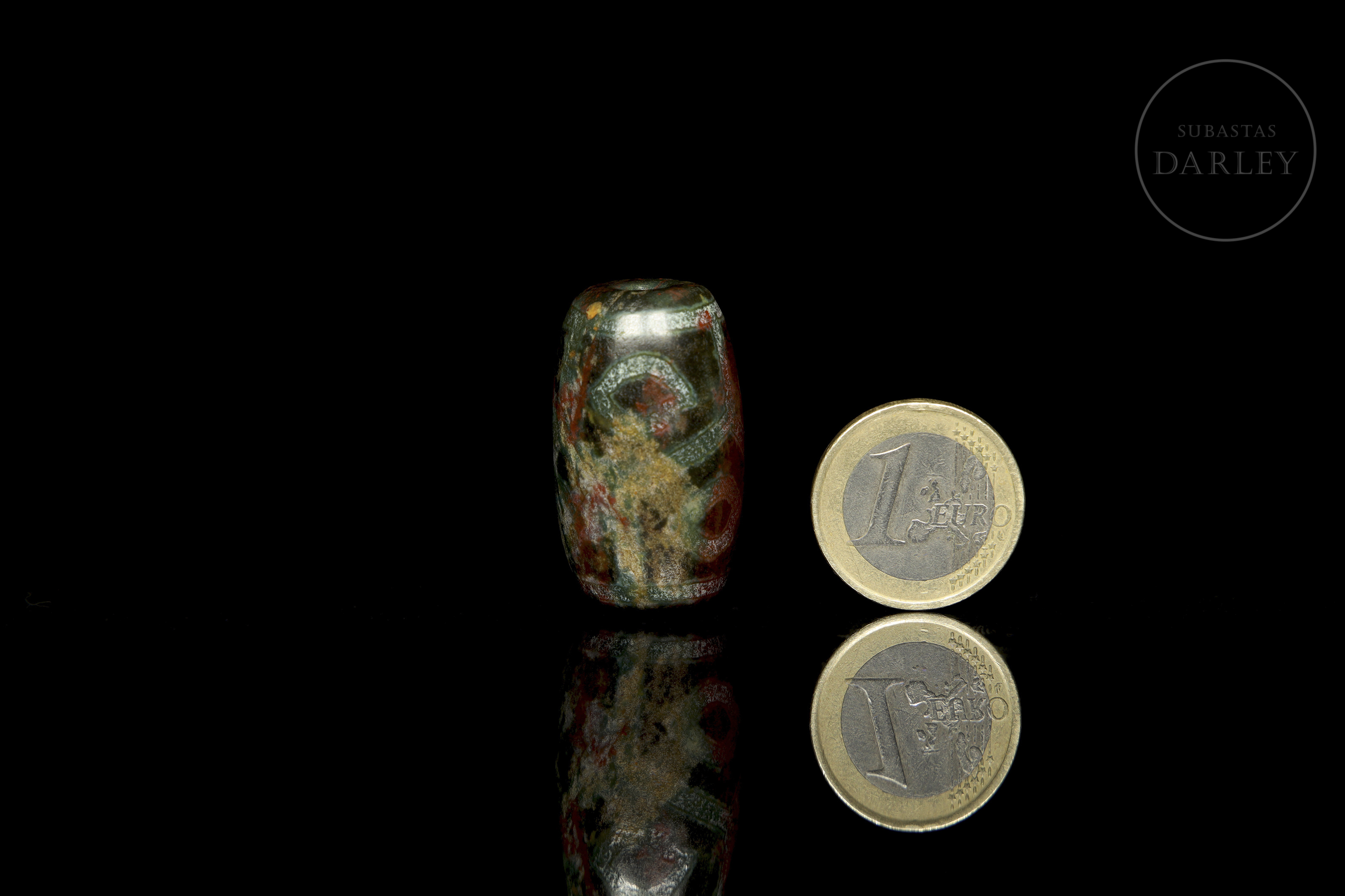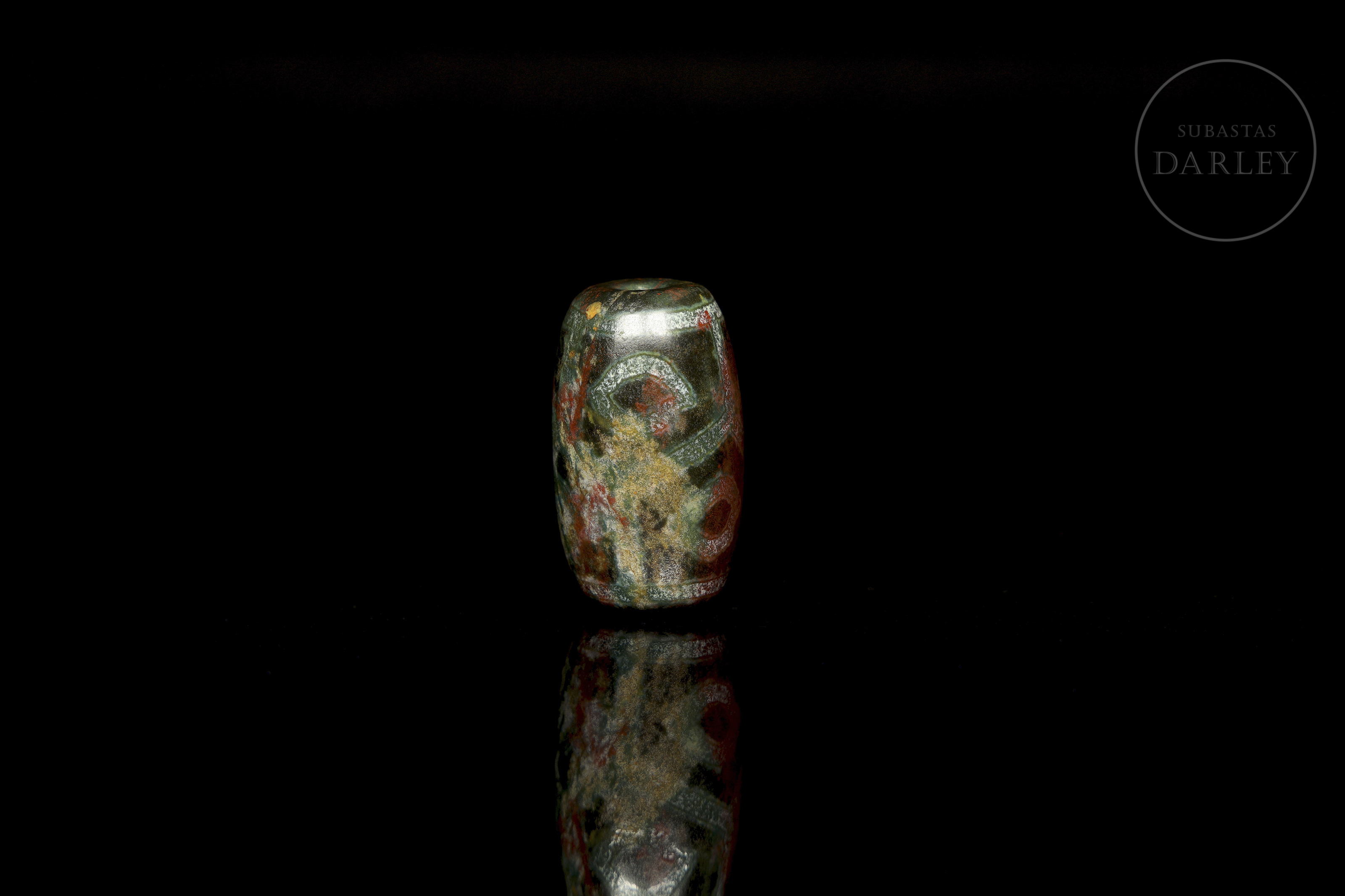Cuenta Dzi de ágata tallada forma de barril. Presenta un fondo oscuro, decorado con un patrón blanco de "ojos" almendrados enmarcados por motivos geométricos. Muestra restos de policromía y pátina por envejecimiento.