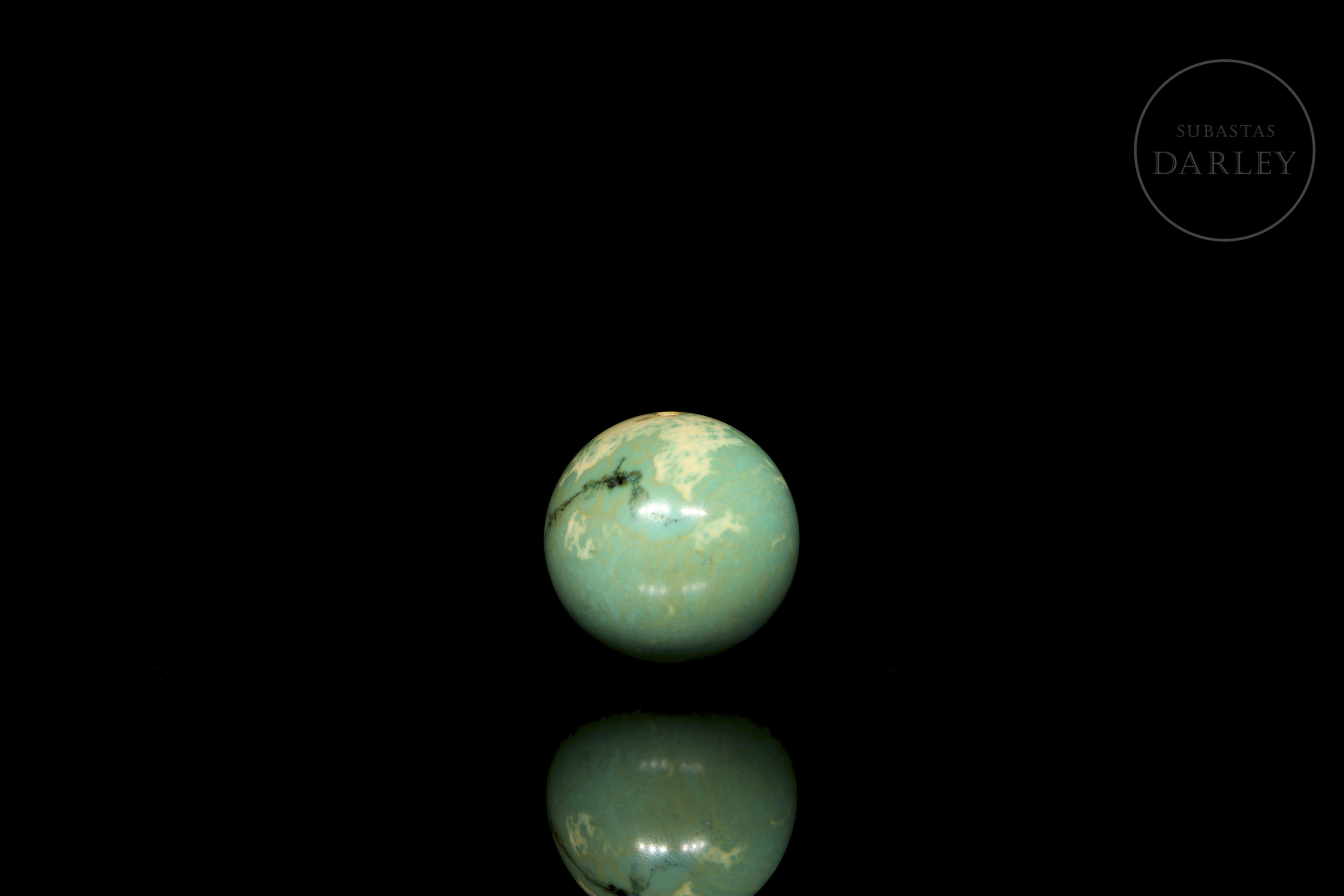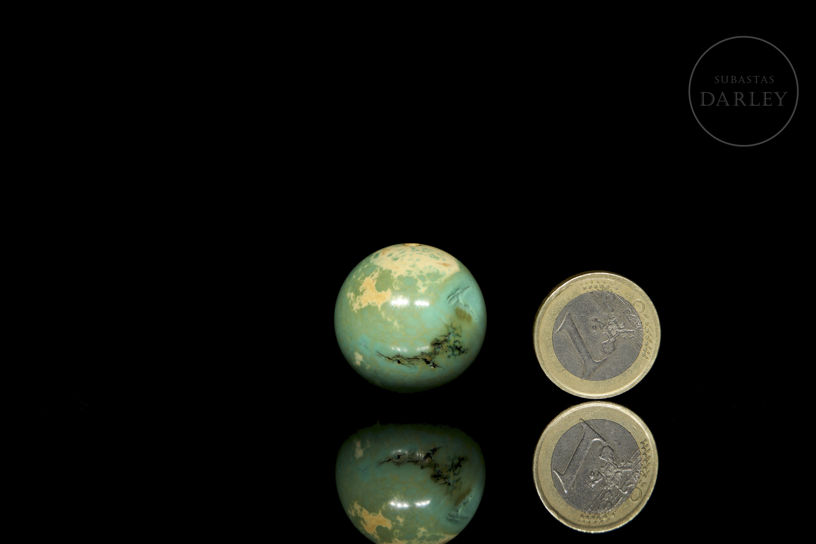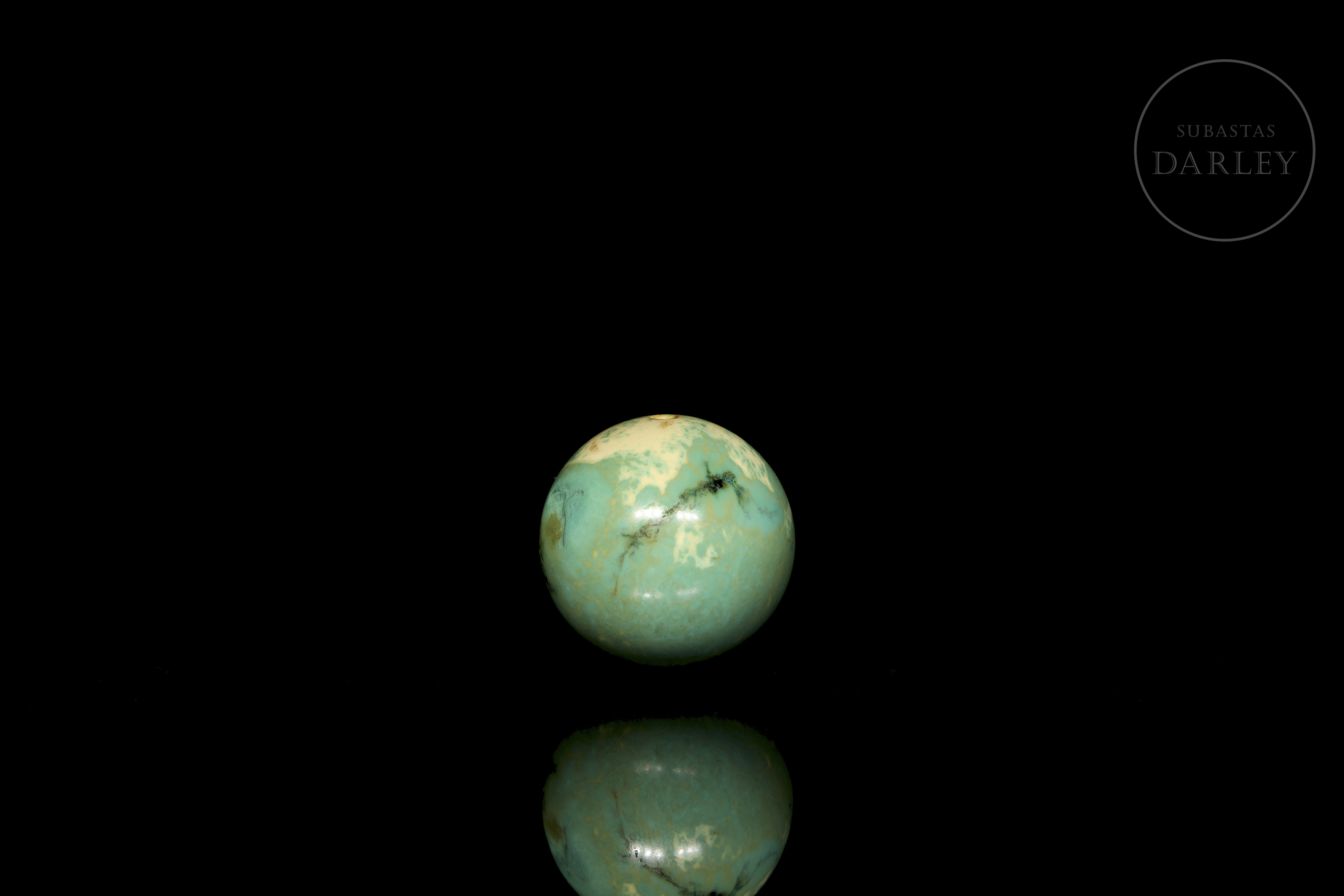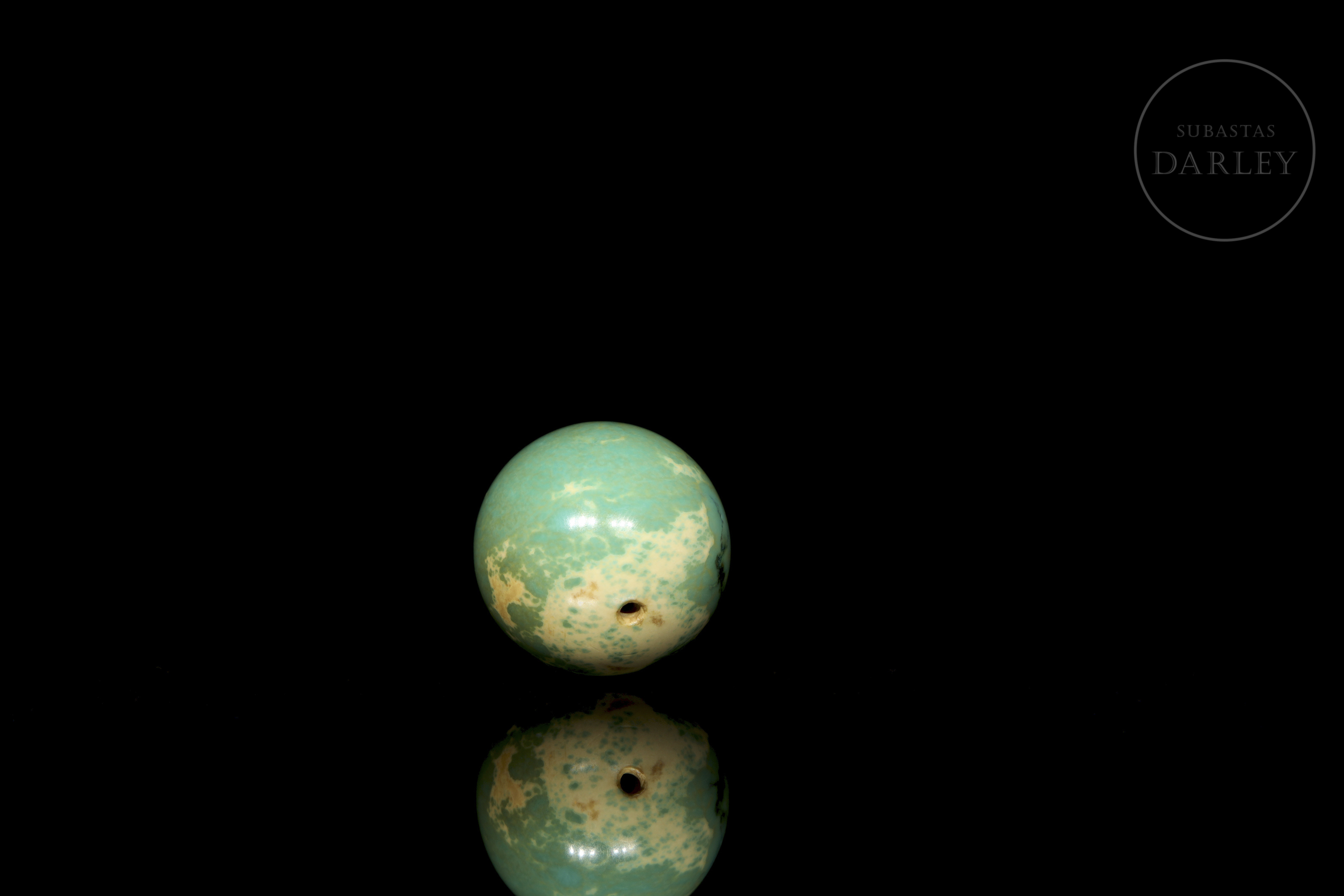 Gran cuenta de turquesa natural de forma esférica. La piedra presenta un intenso color azul verdoso con una matriz visible en tonos crema y vetas oscuras. Muestra una superficie pulida con brillo ceroso y pátina por envejecimiento. Dinastía Liao (907-1125 d.C.).