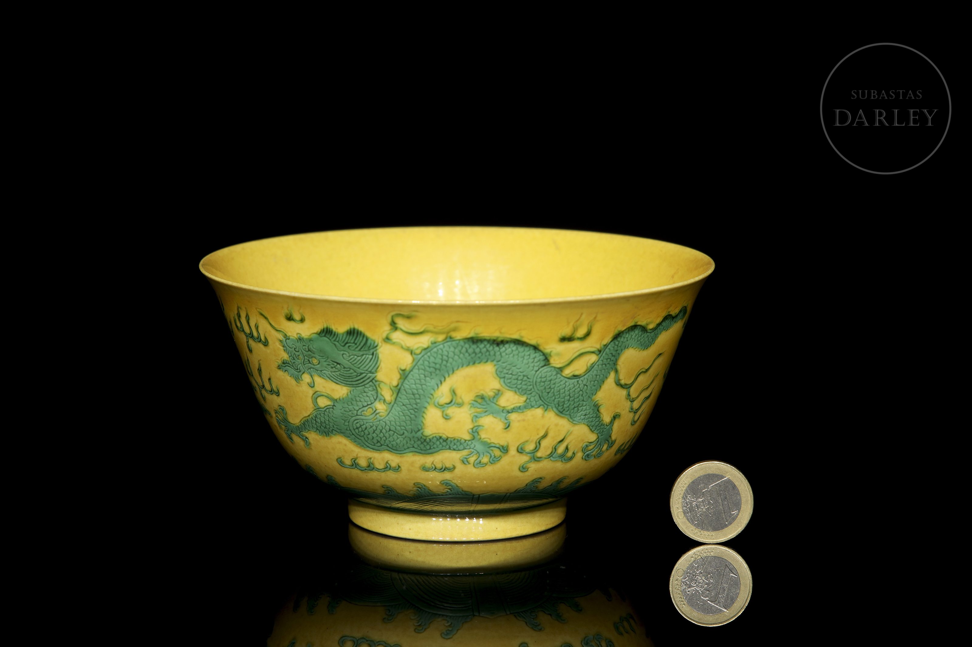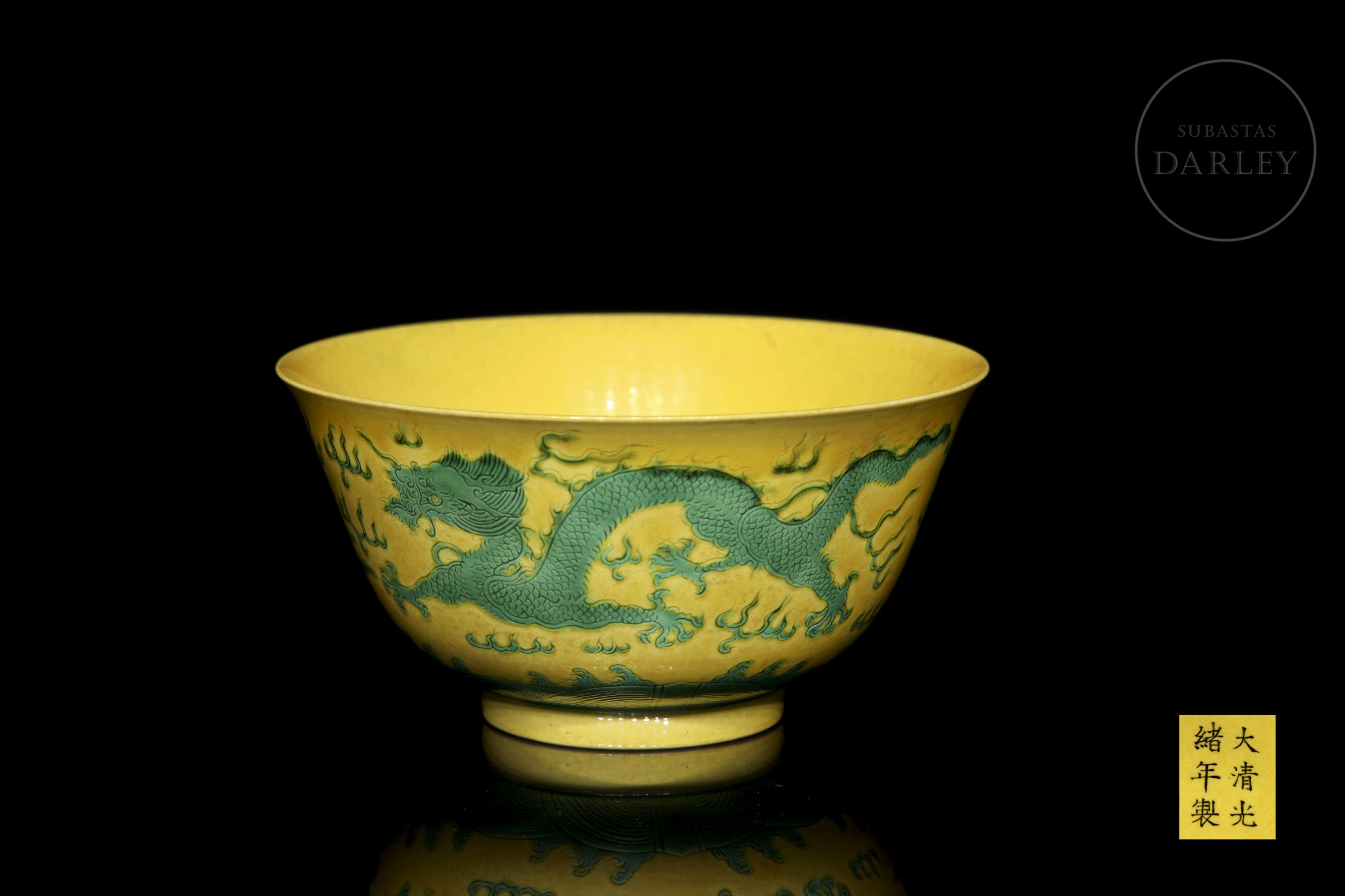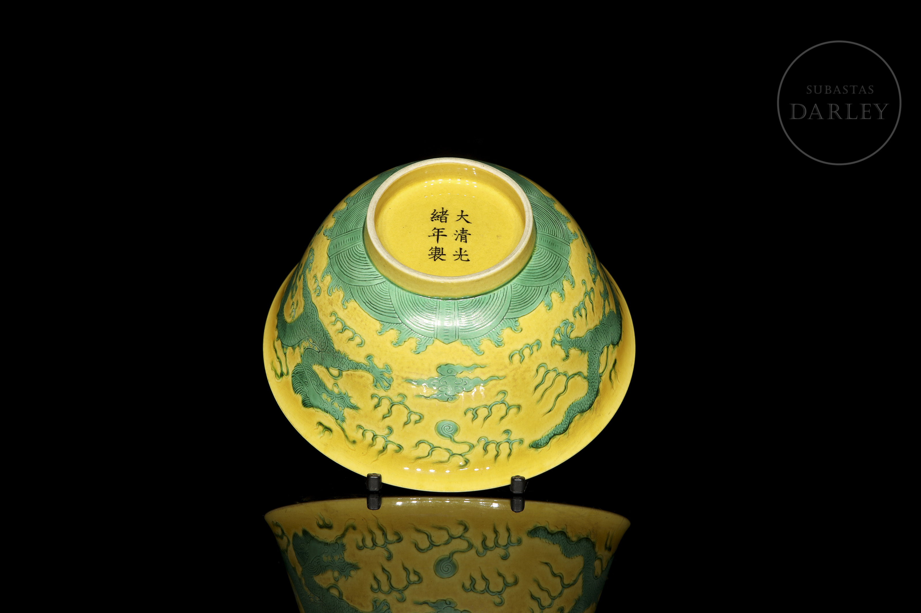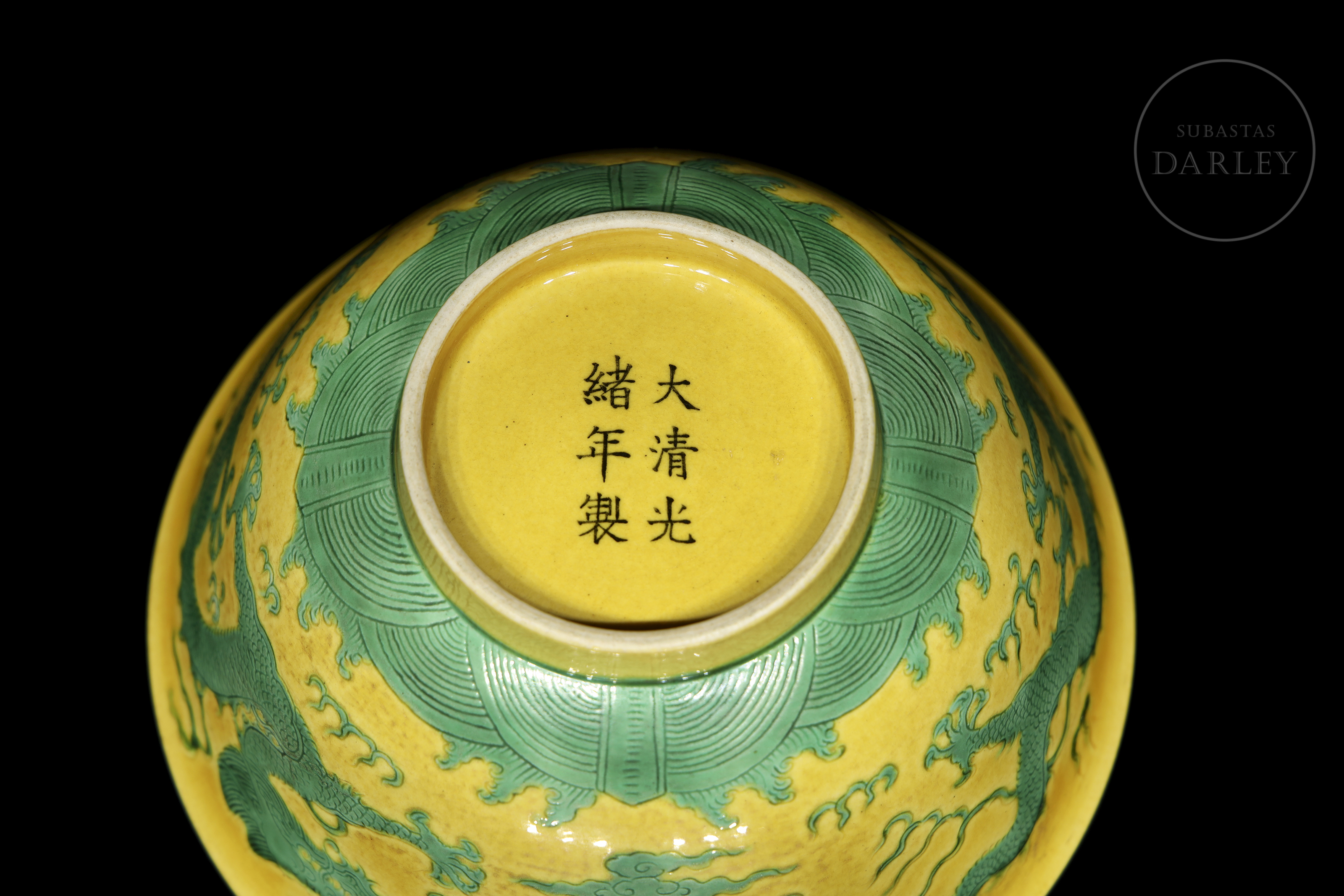 Cunenco de porcelana esmaltada "Dragón", con sello Guangxu