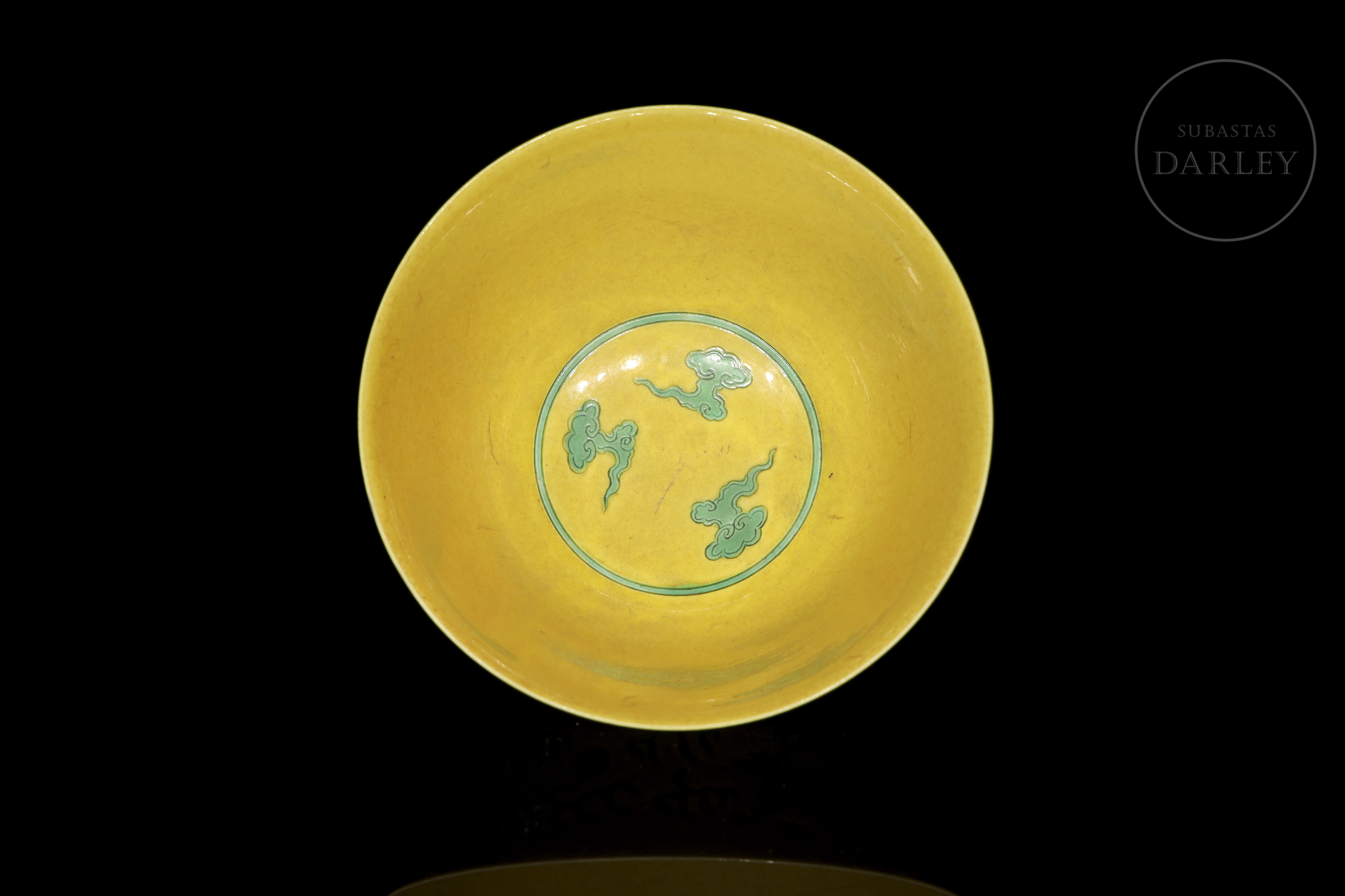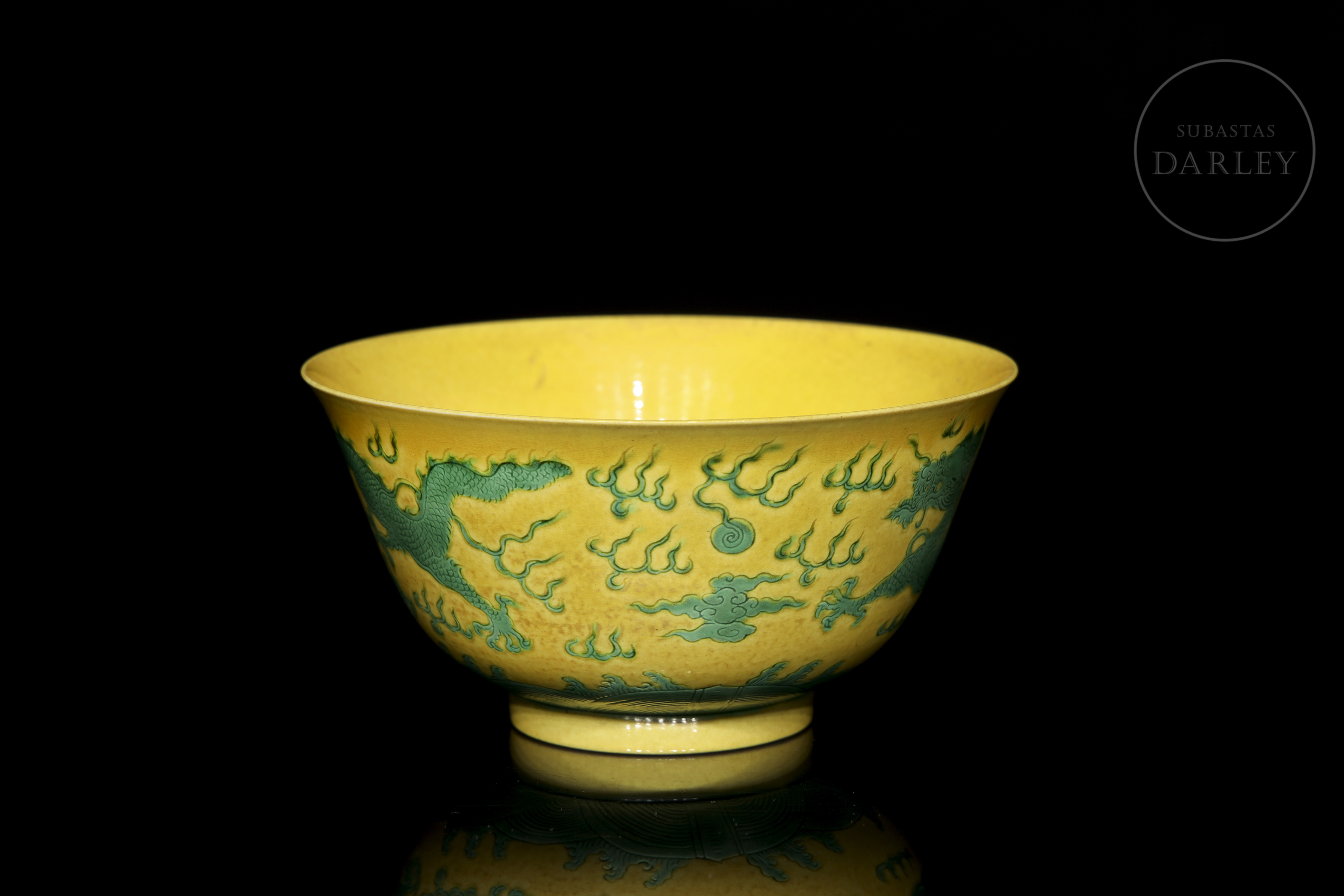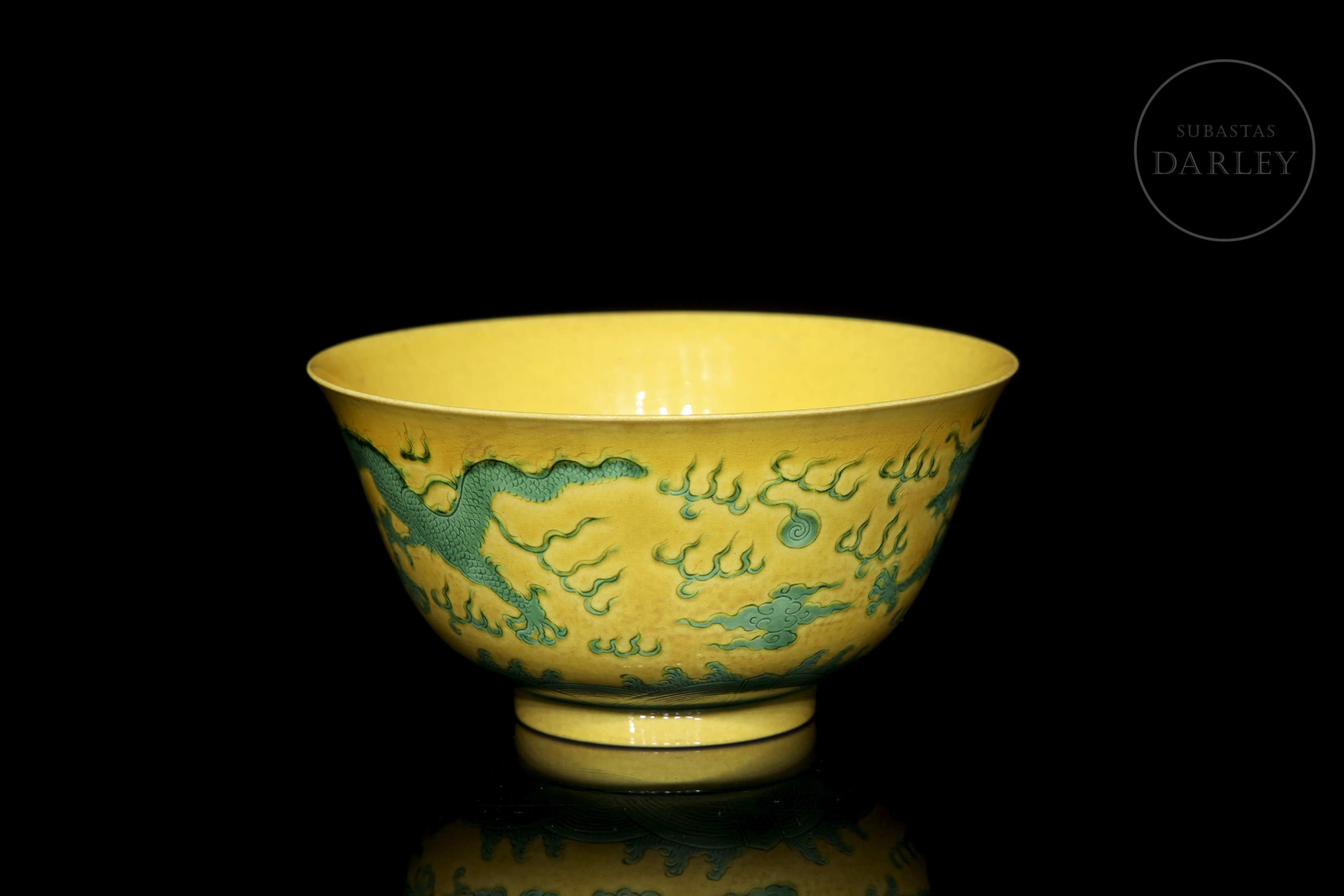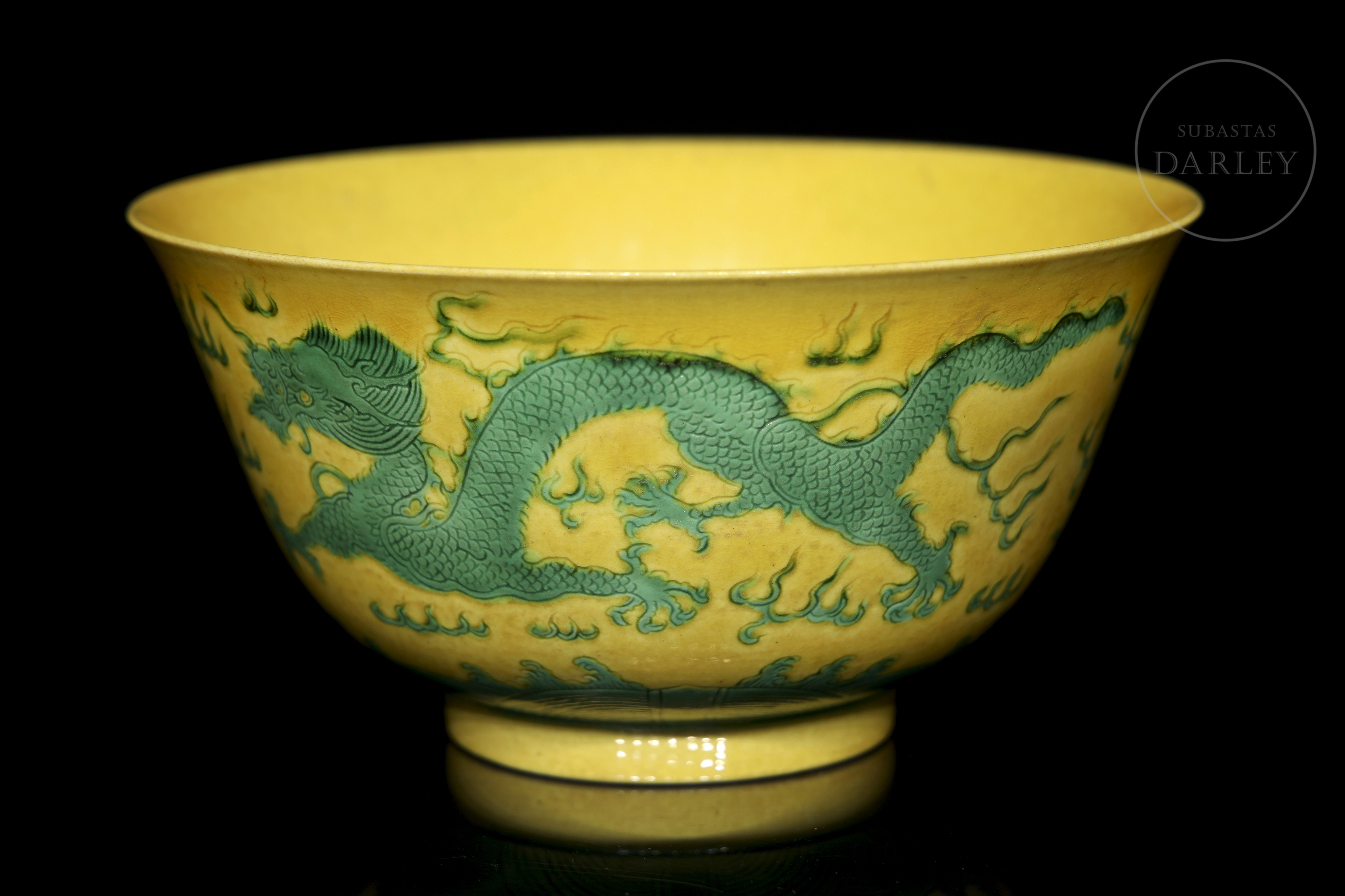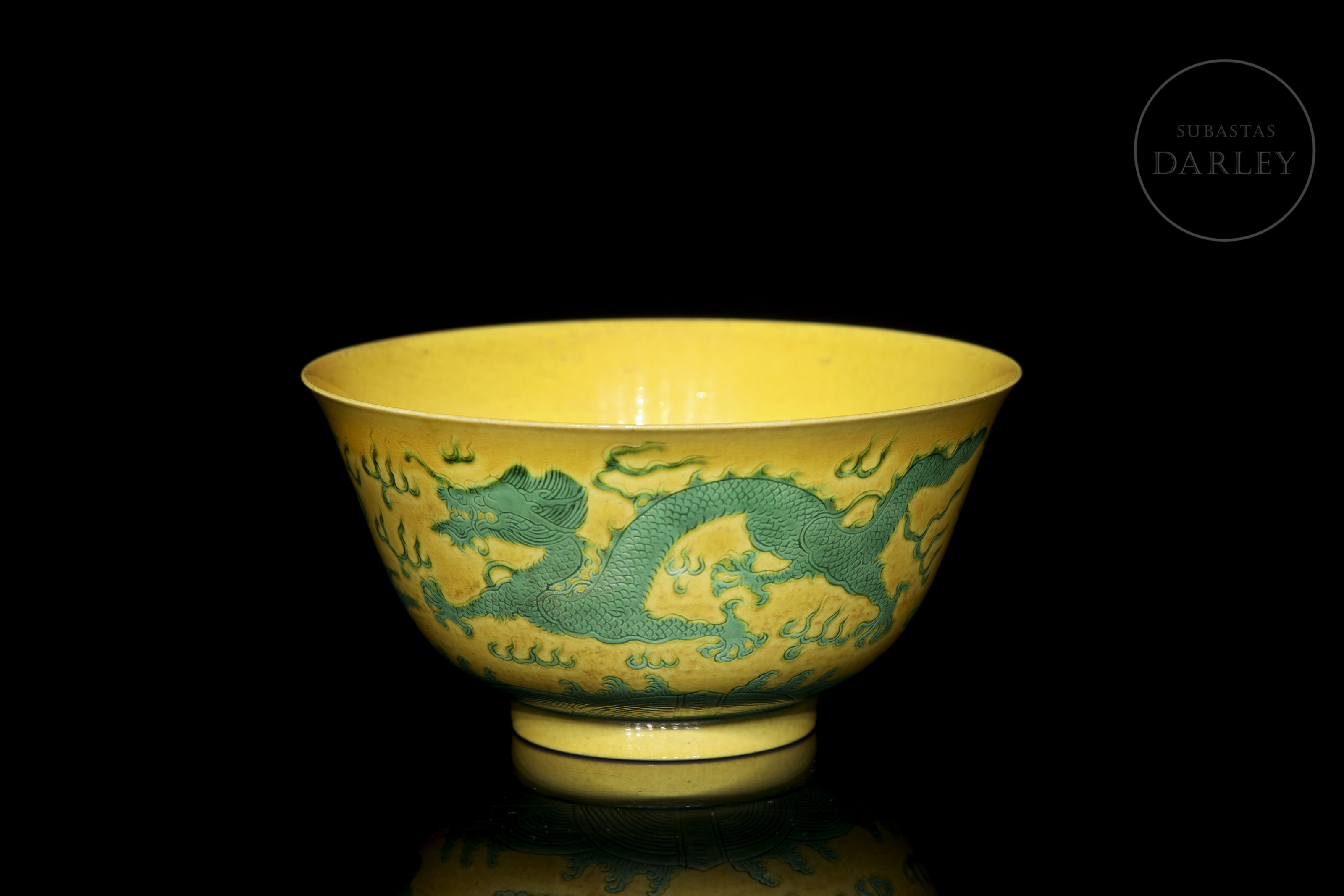 Cunenco de porcelana esmaltada "Dragón", con sello Guangxu