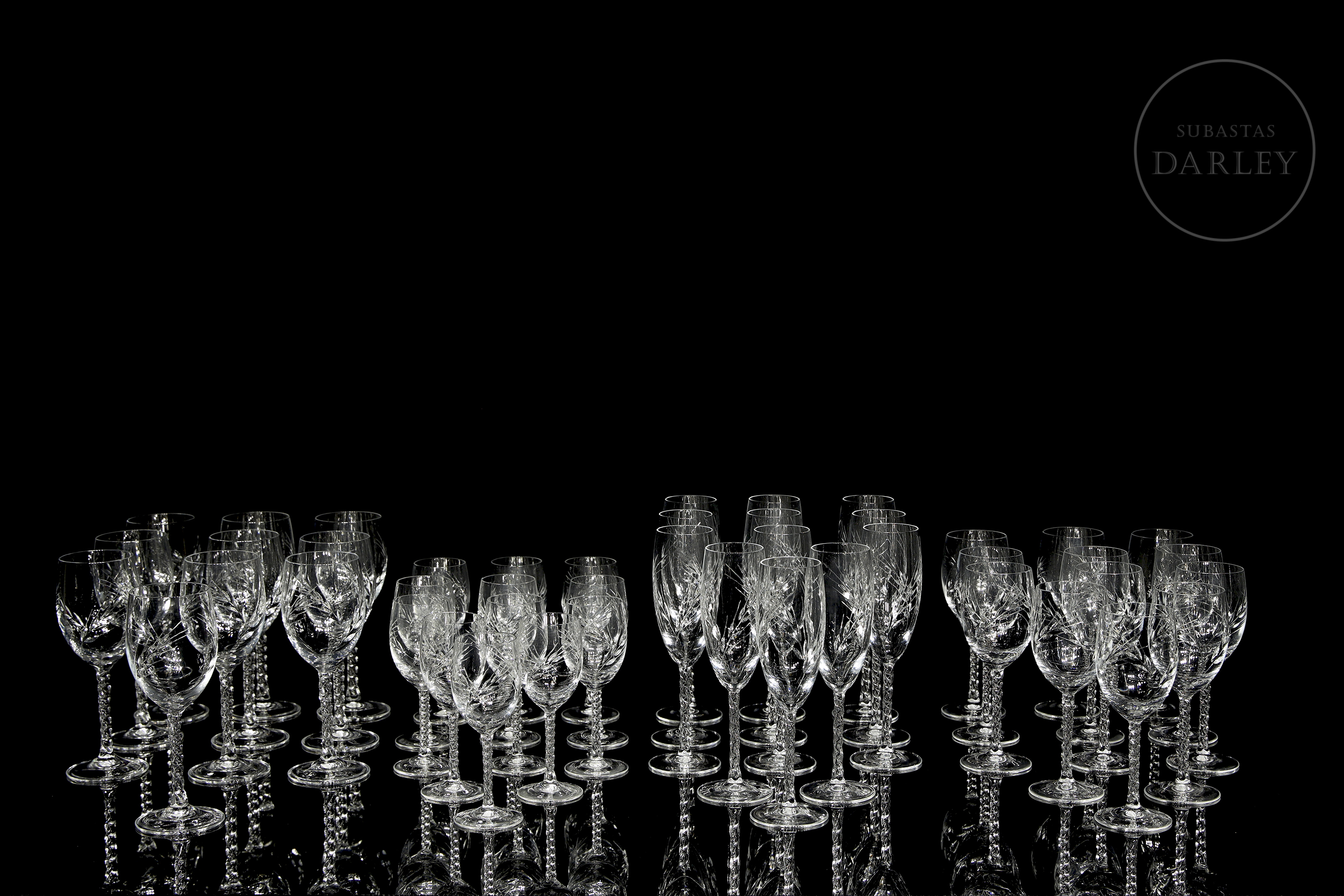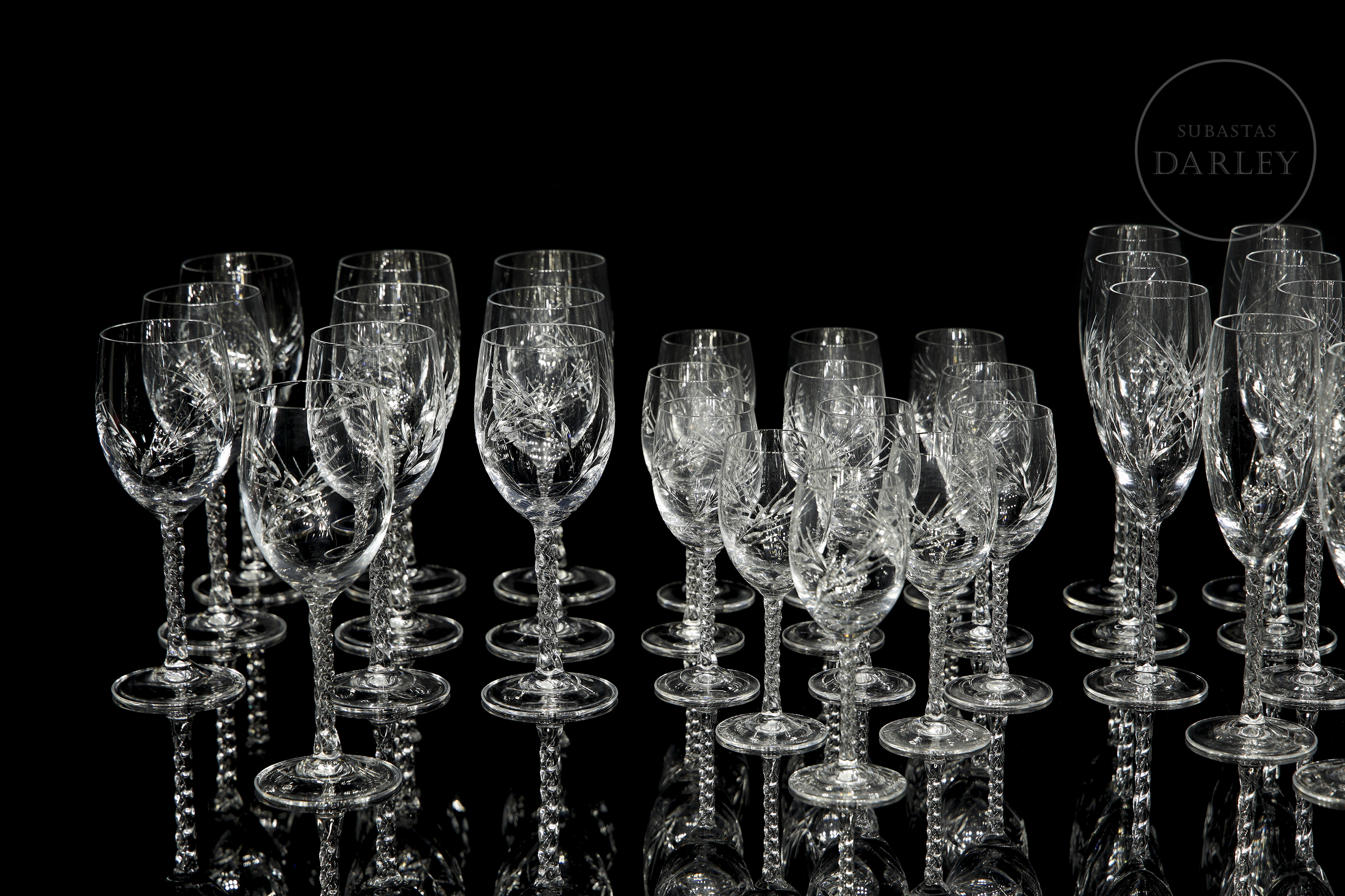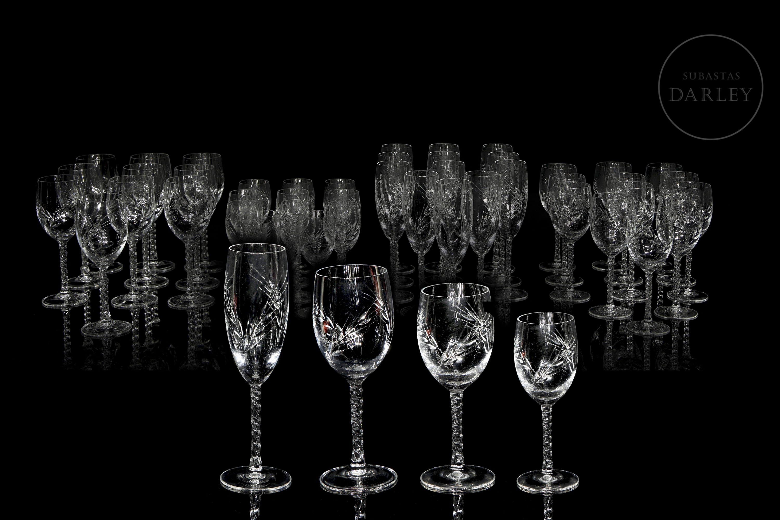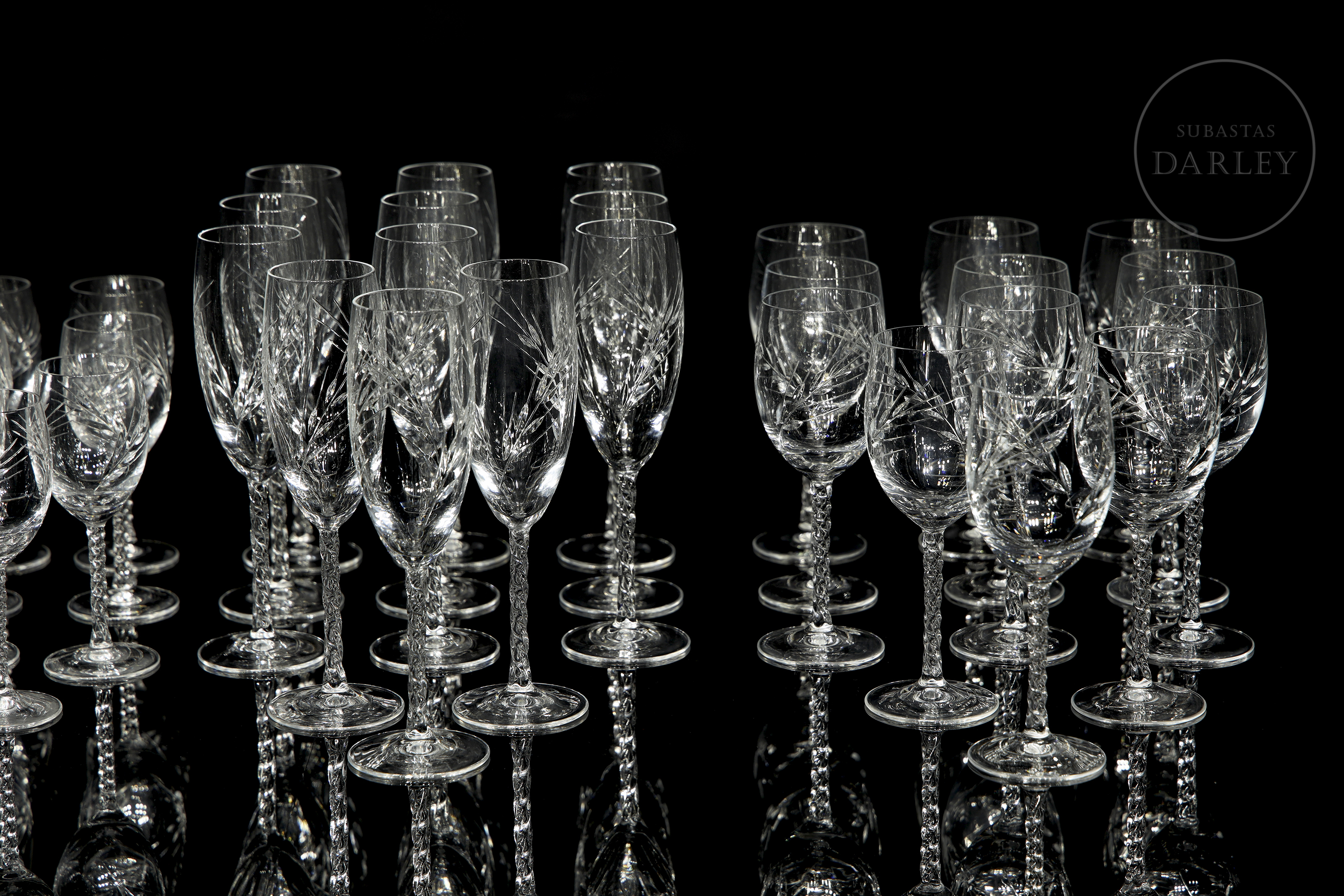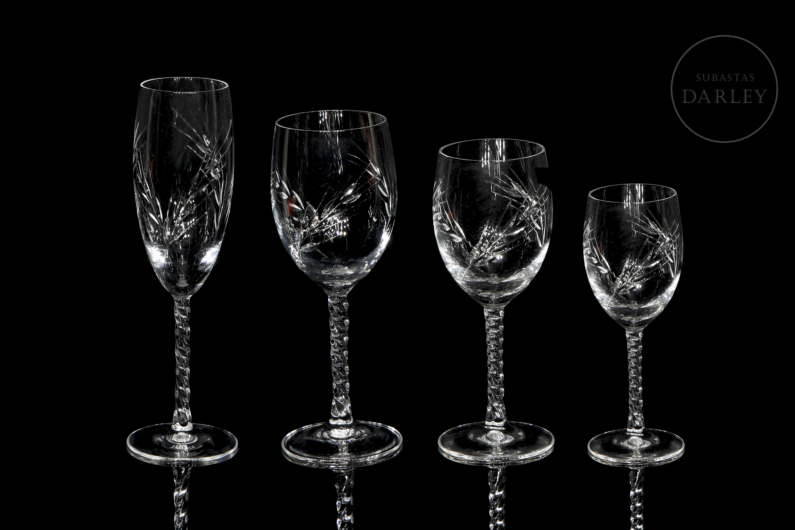 Completo servicio de copas realizado en cristal de alta transparencia con decoración tallada de espigas y tallo de diseño helicoidal. El conjunto incluye servicios de 12 unidades para agua, vino, cava y licor.