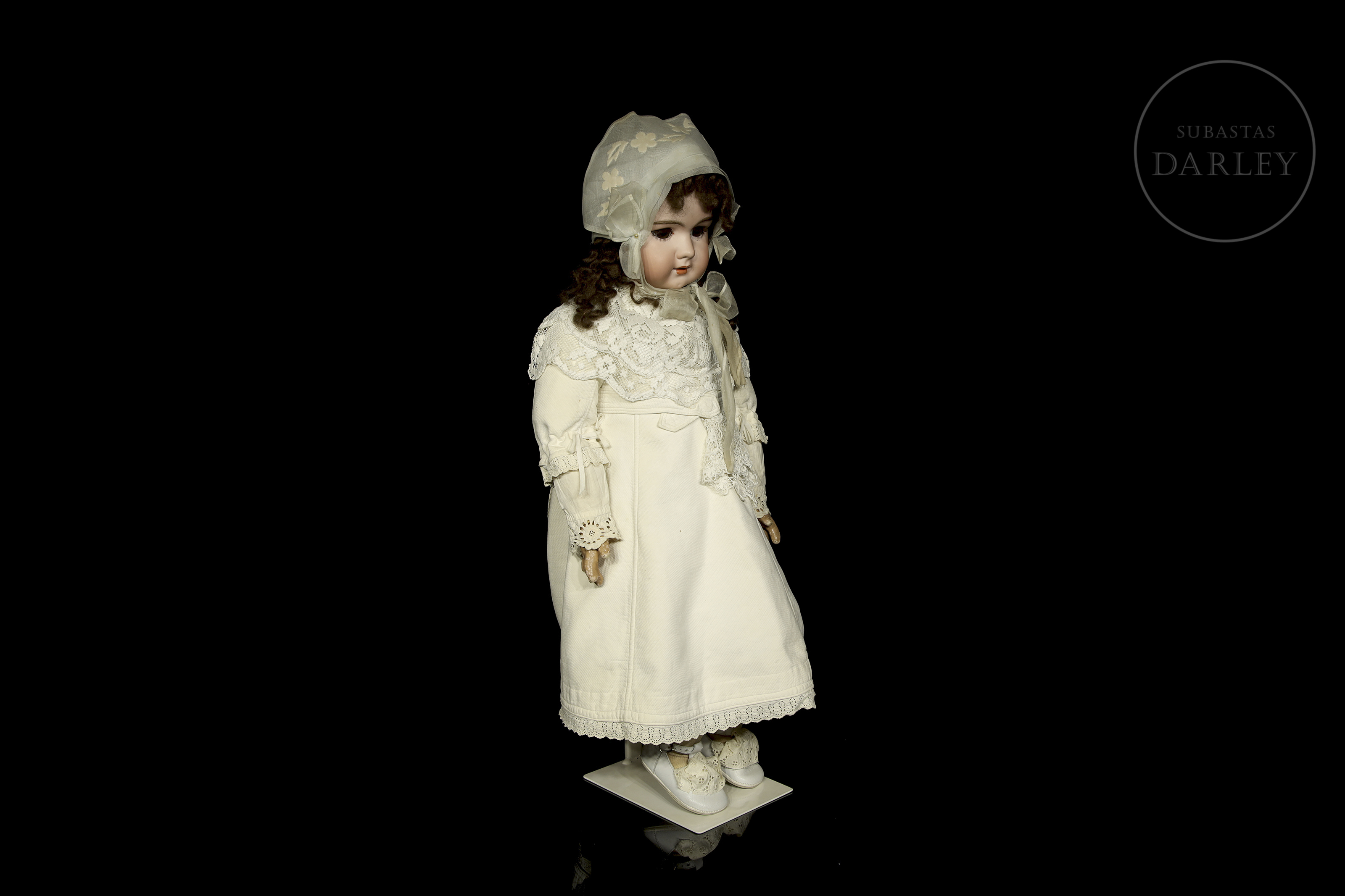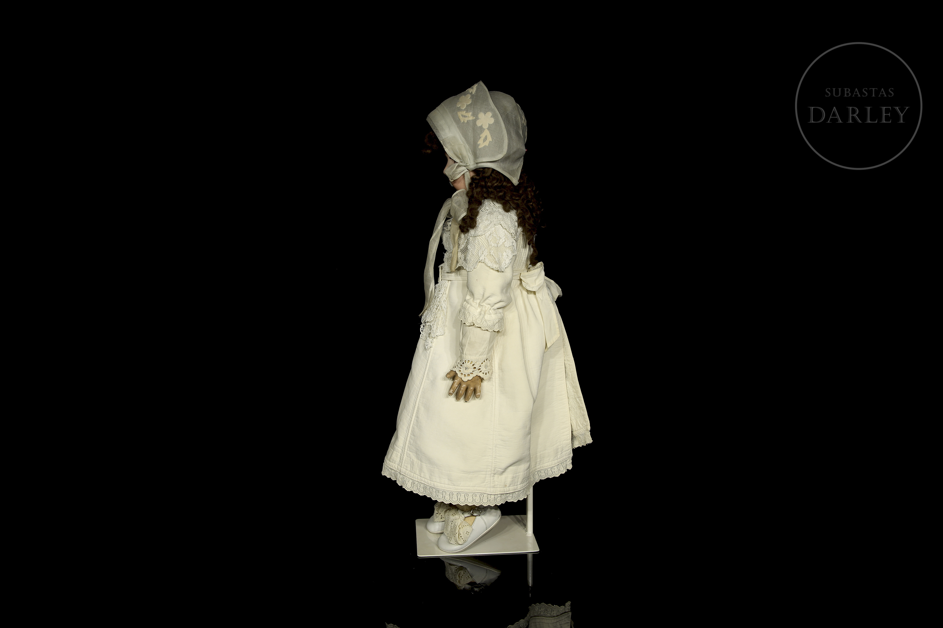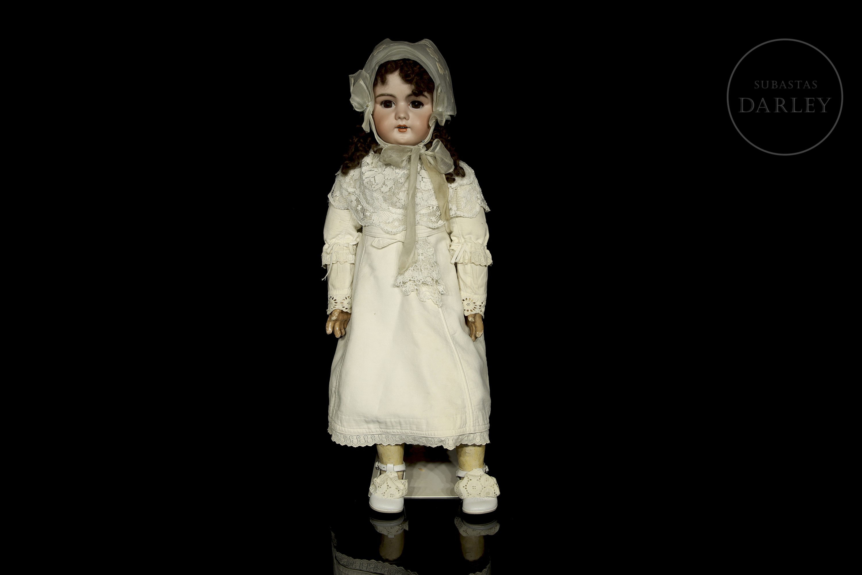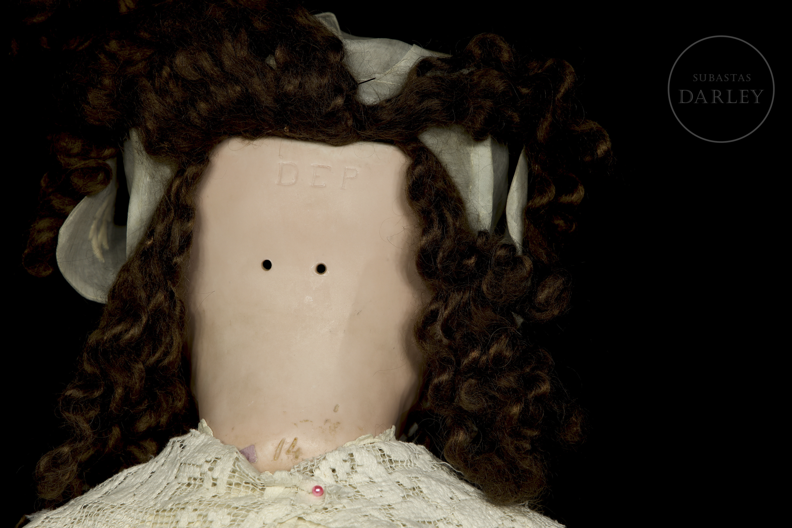 Muñeca antigua de gran formato con cabeza de biscuit alemana y cuerpo articulado de composición. Presenta rasgos finamente pintados, ojos de cristal durmientes, boca abierta con dientes de porcelana y peluca. Ataviada con vestido original y sombreso y mantilla de época. Marca incisa en la nuca: "DEP / 14".