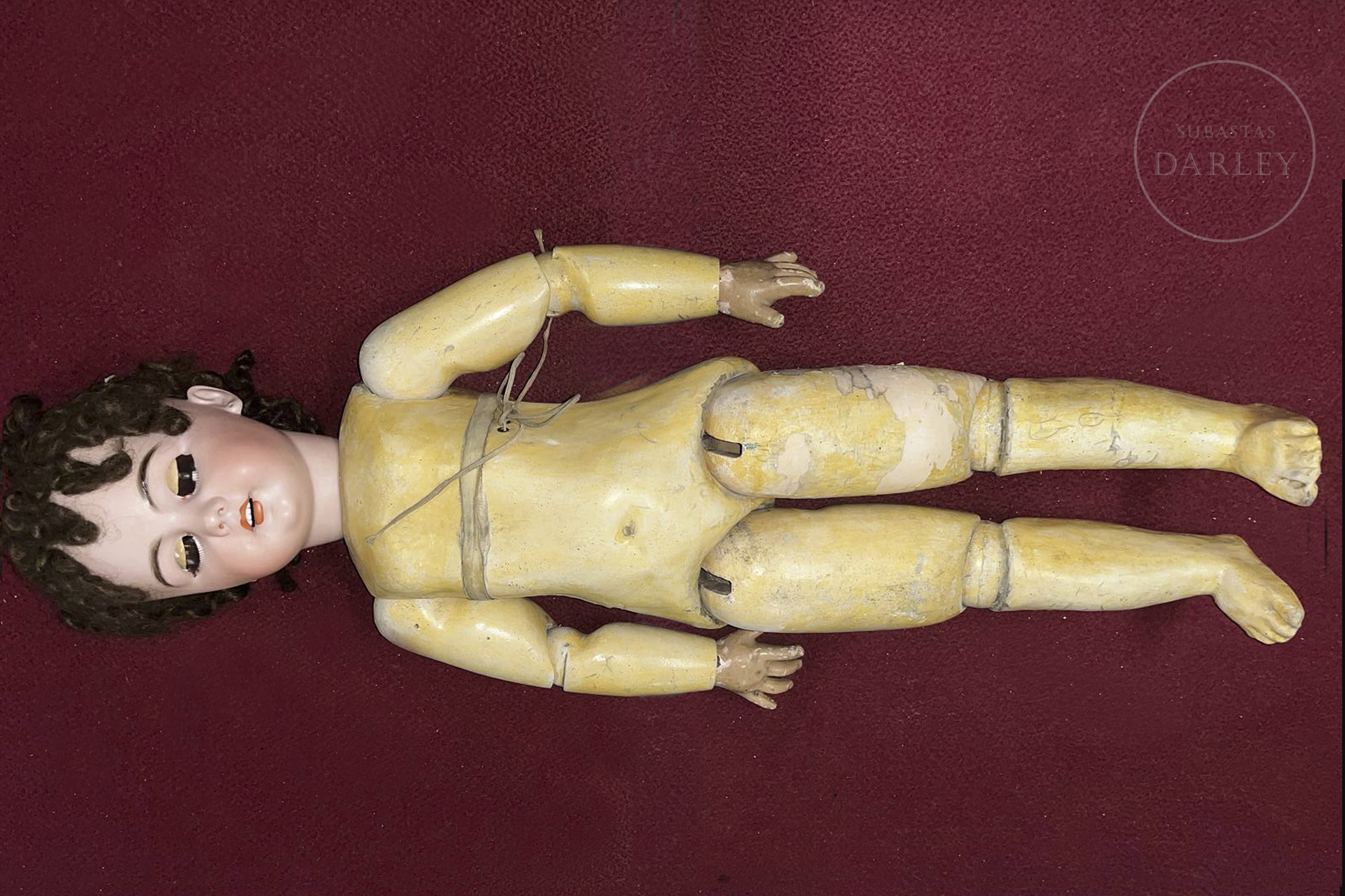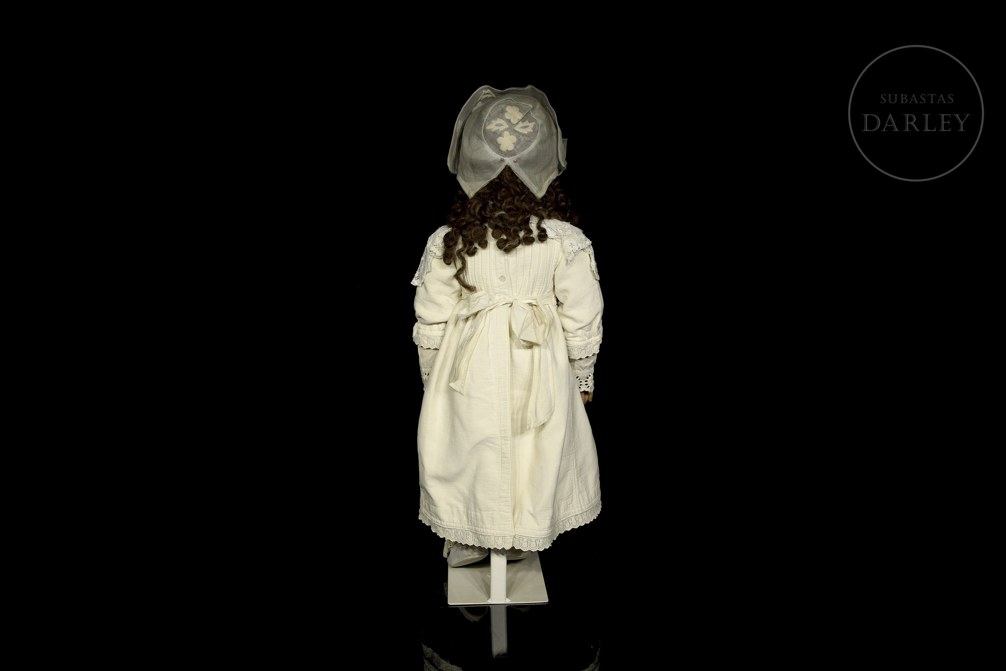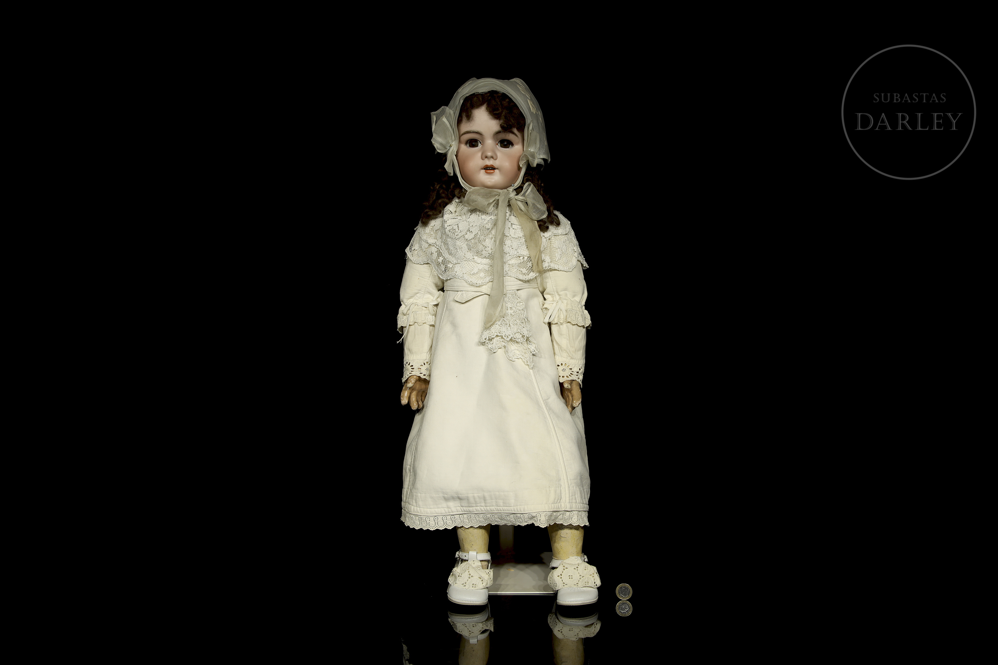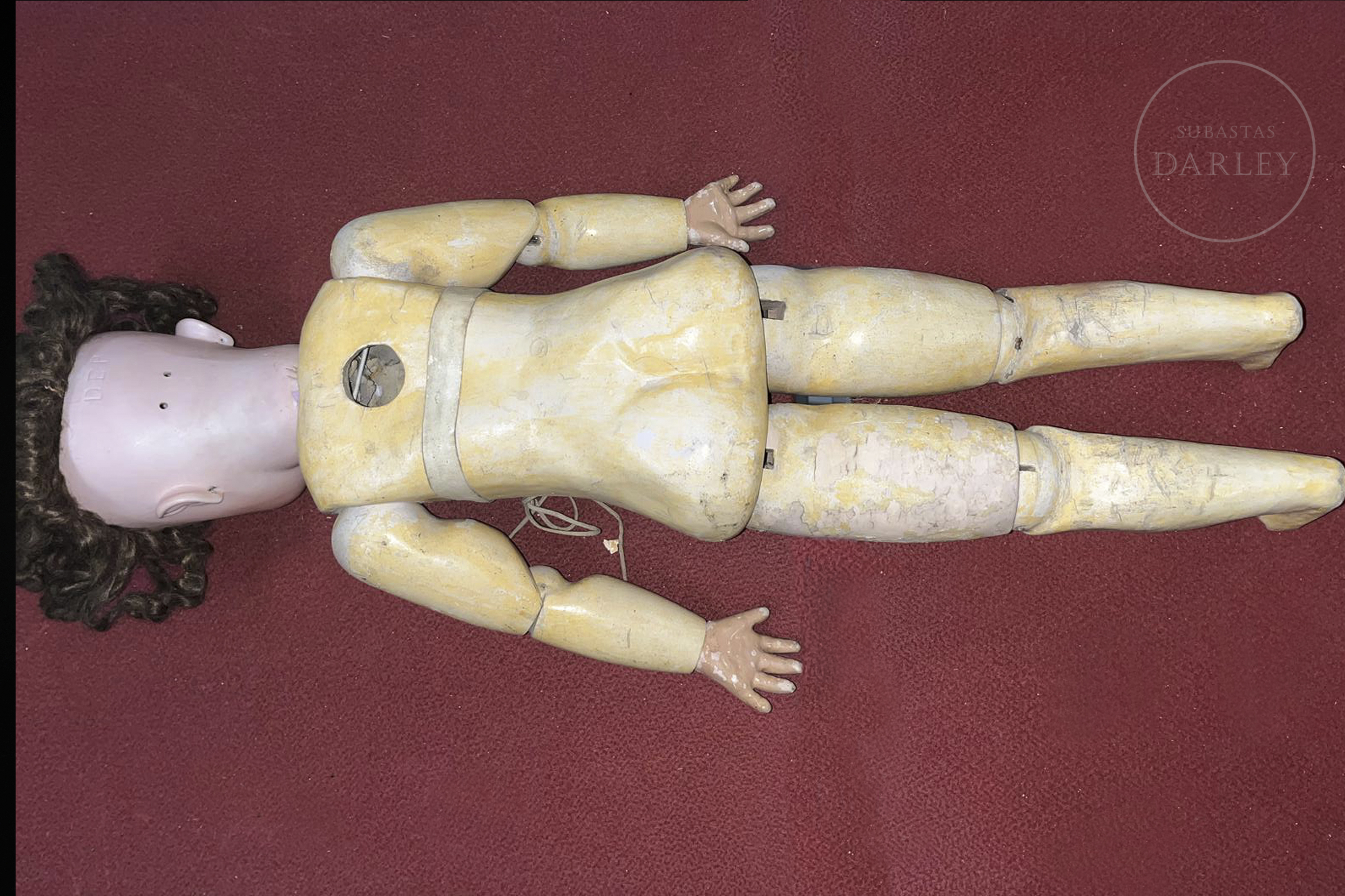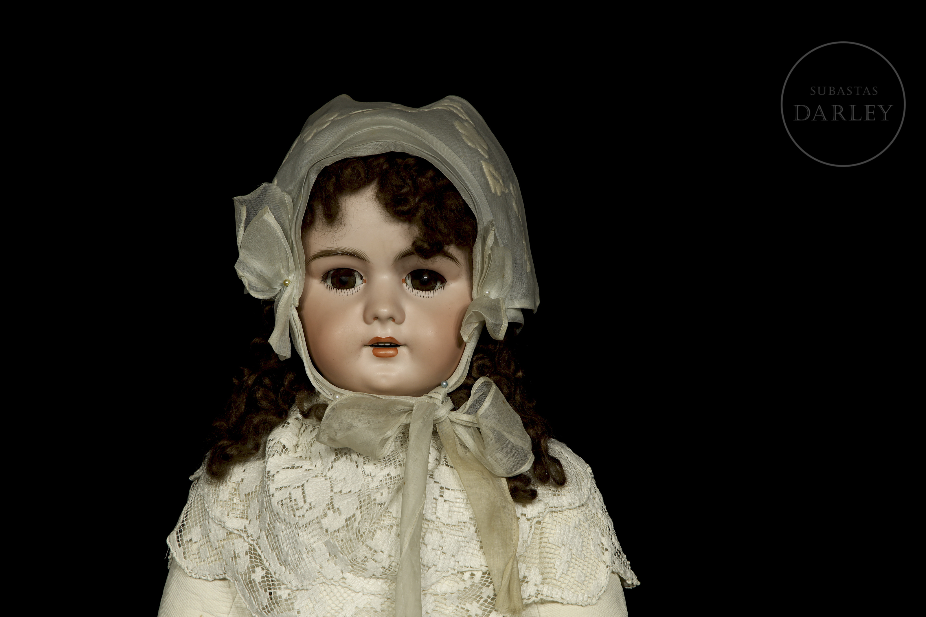 Muñeca antigua de gran formato con cabeza de biscuit alemana y cuerpo articulado de composición. Presenta rasgos finamente pintados, ojos de cristal durmientes, boca abierta con dientes de porcelana y peluca. Ataviada con vestido original y sombreso y mantilla de época. Marca incisa en la nuca: "DEP / 14".