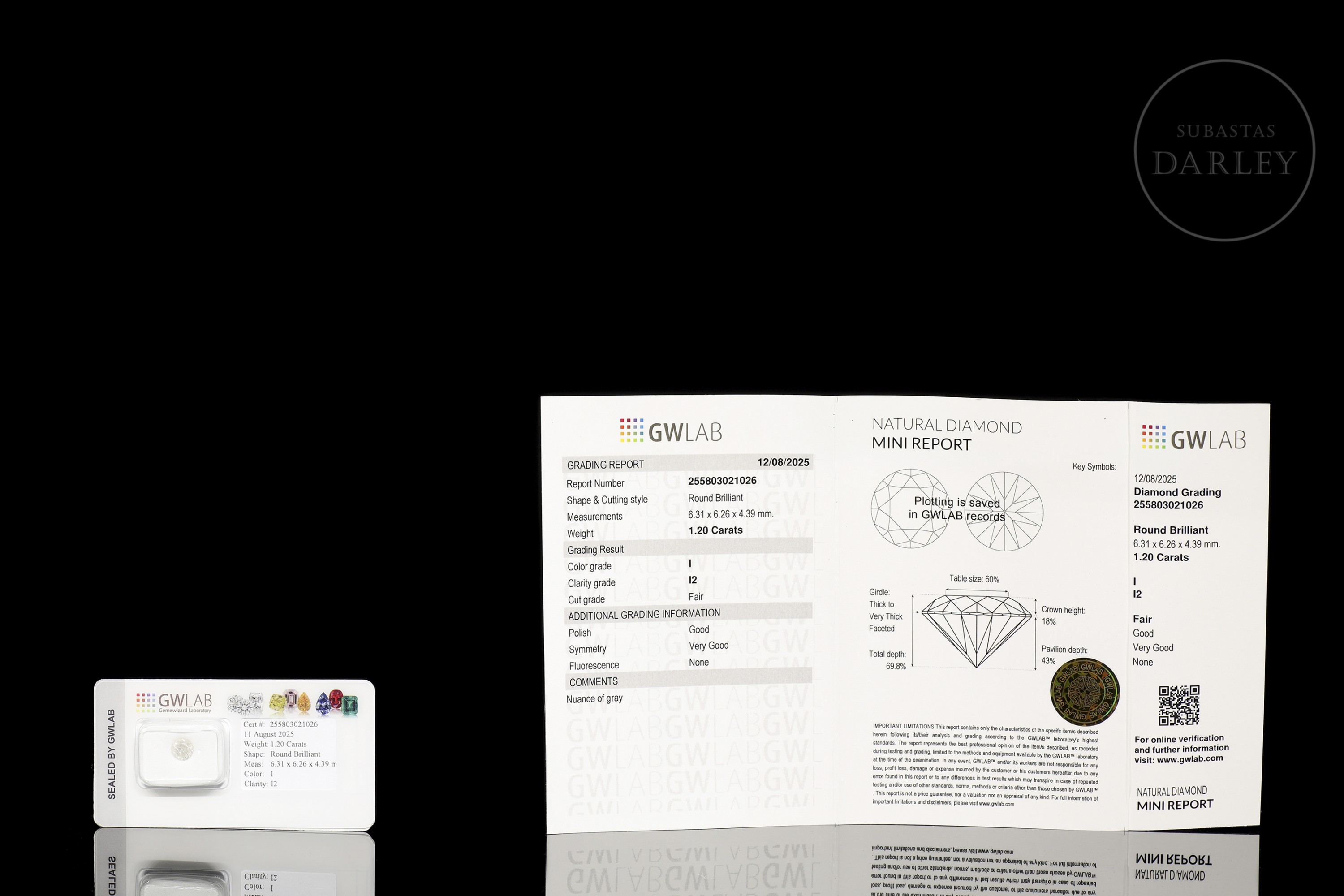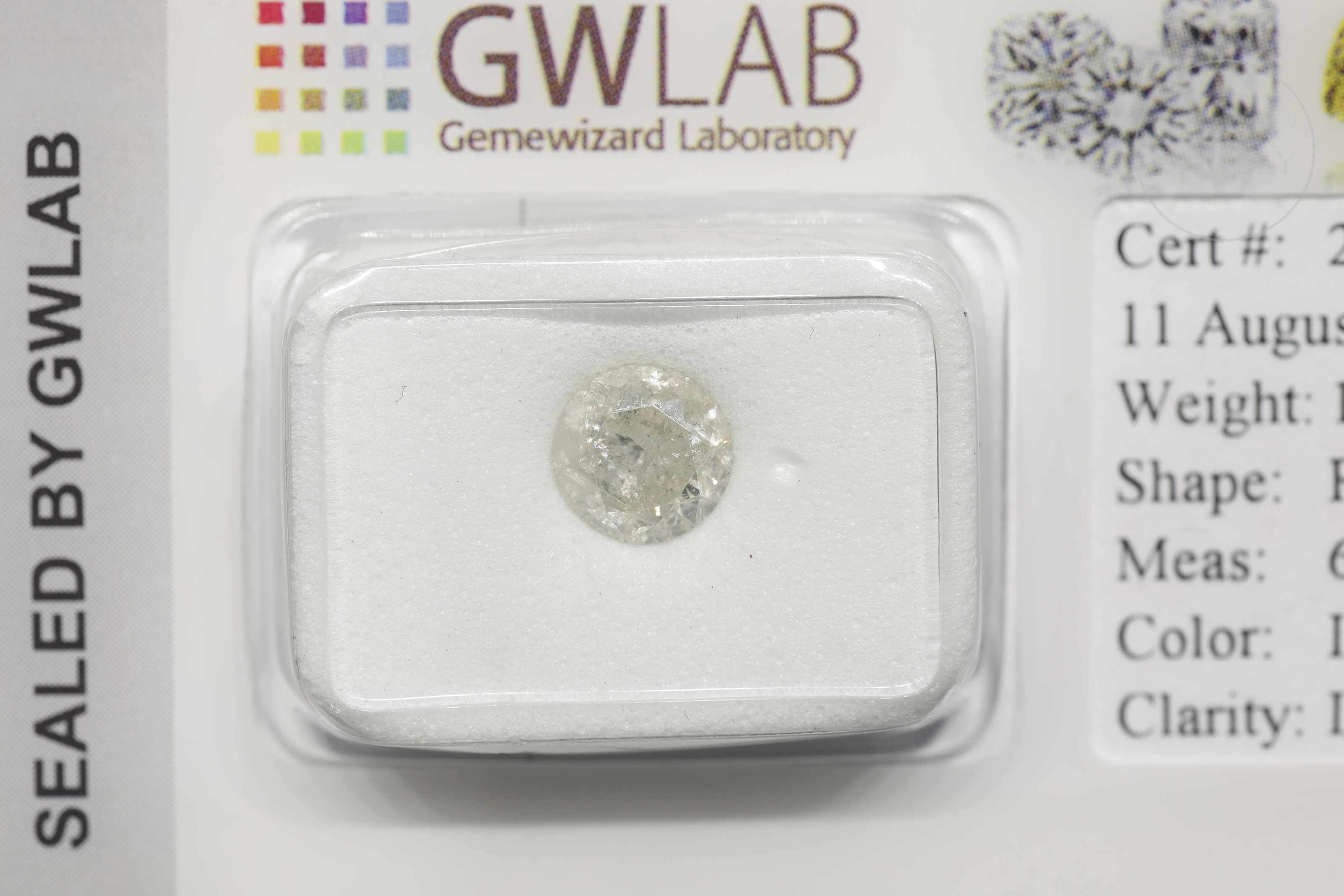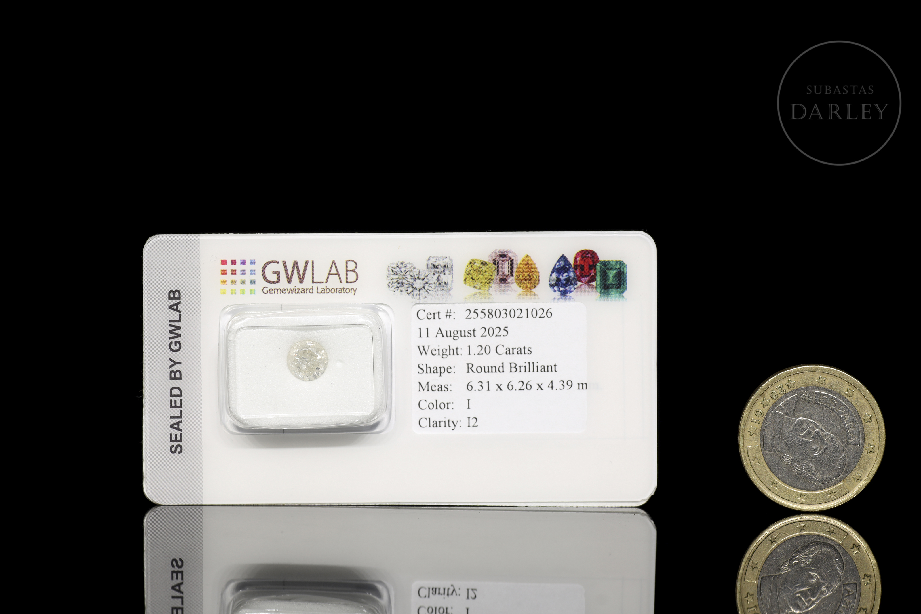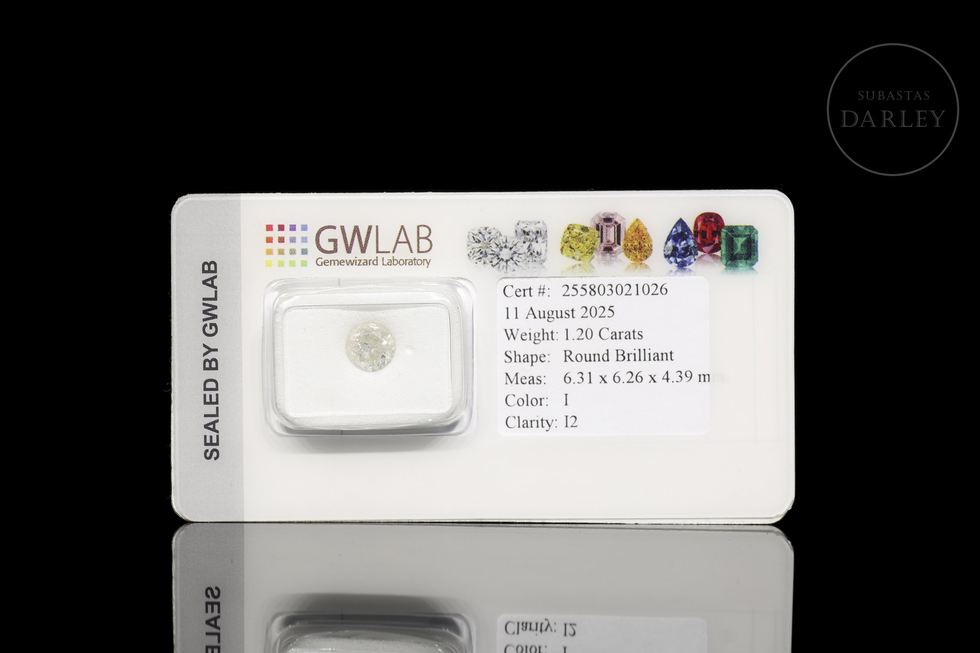 Se presenta encapsulado y sellado por el laboratorio, acompañado de su certificado realizado por GWLAB (Gemewizard Laboratory) con el número 255803021026 y fecha 11 de agosto de 2025.