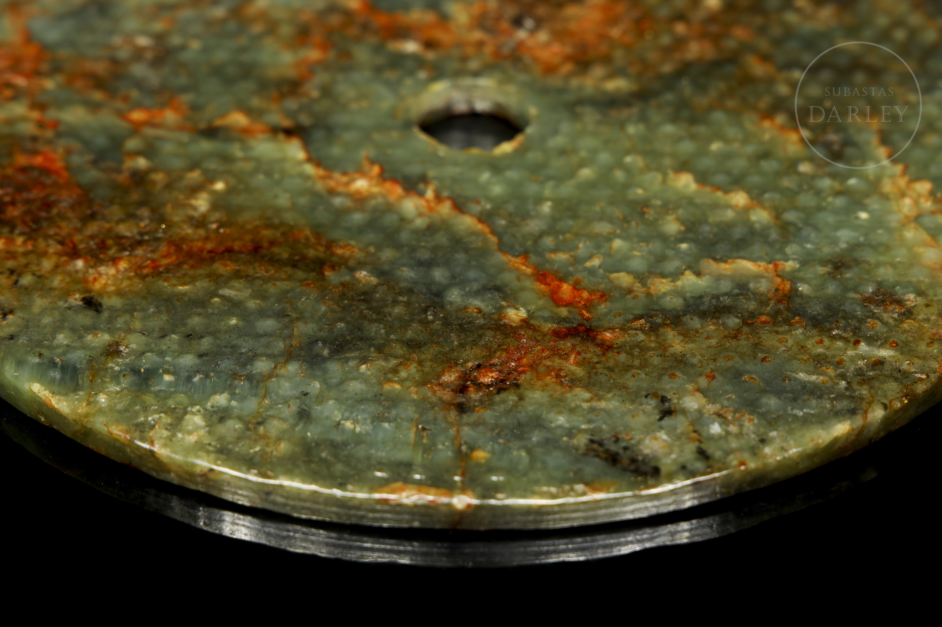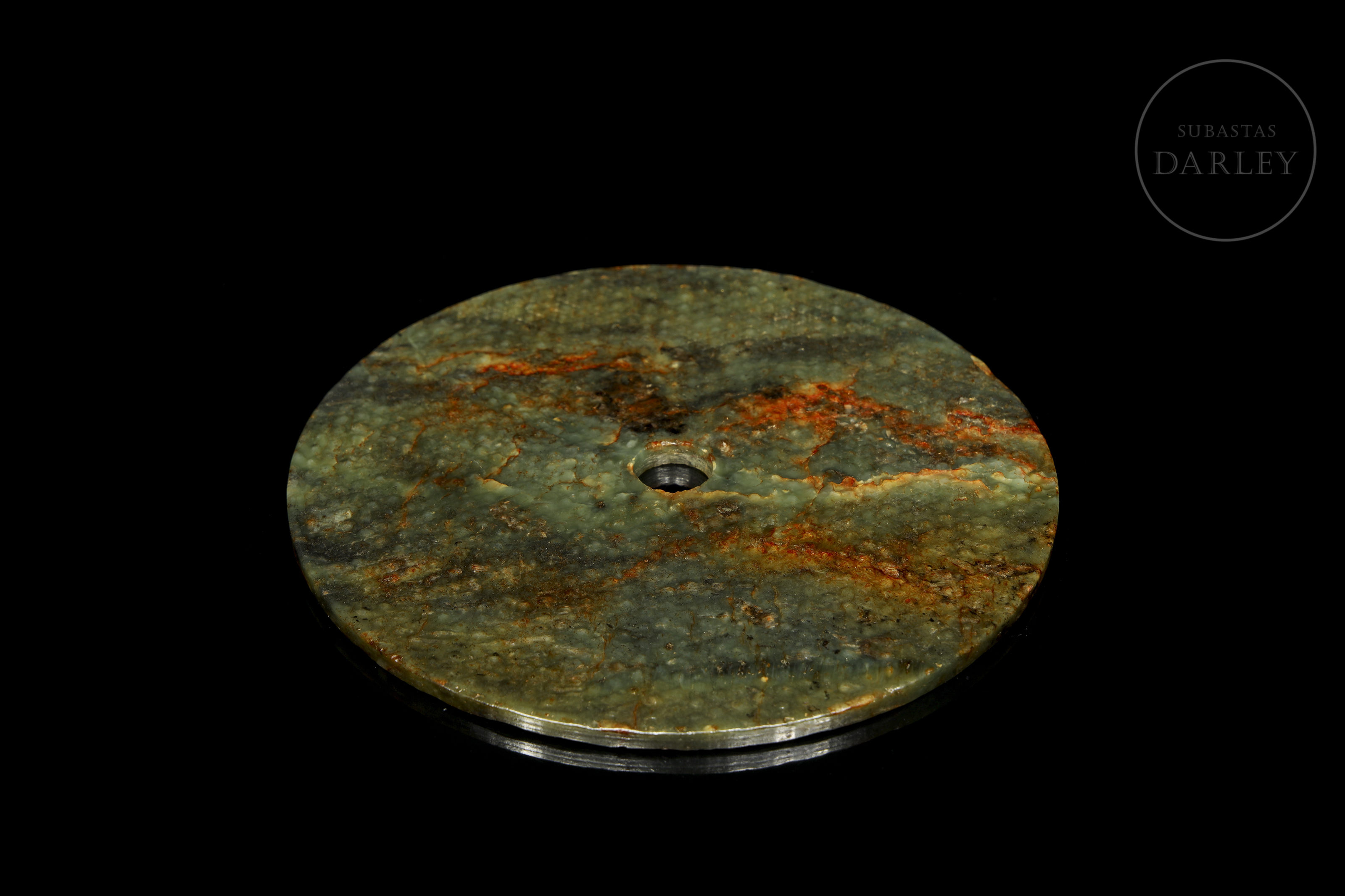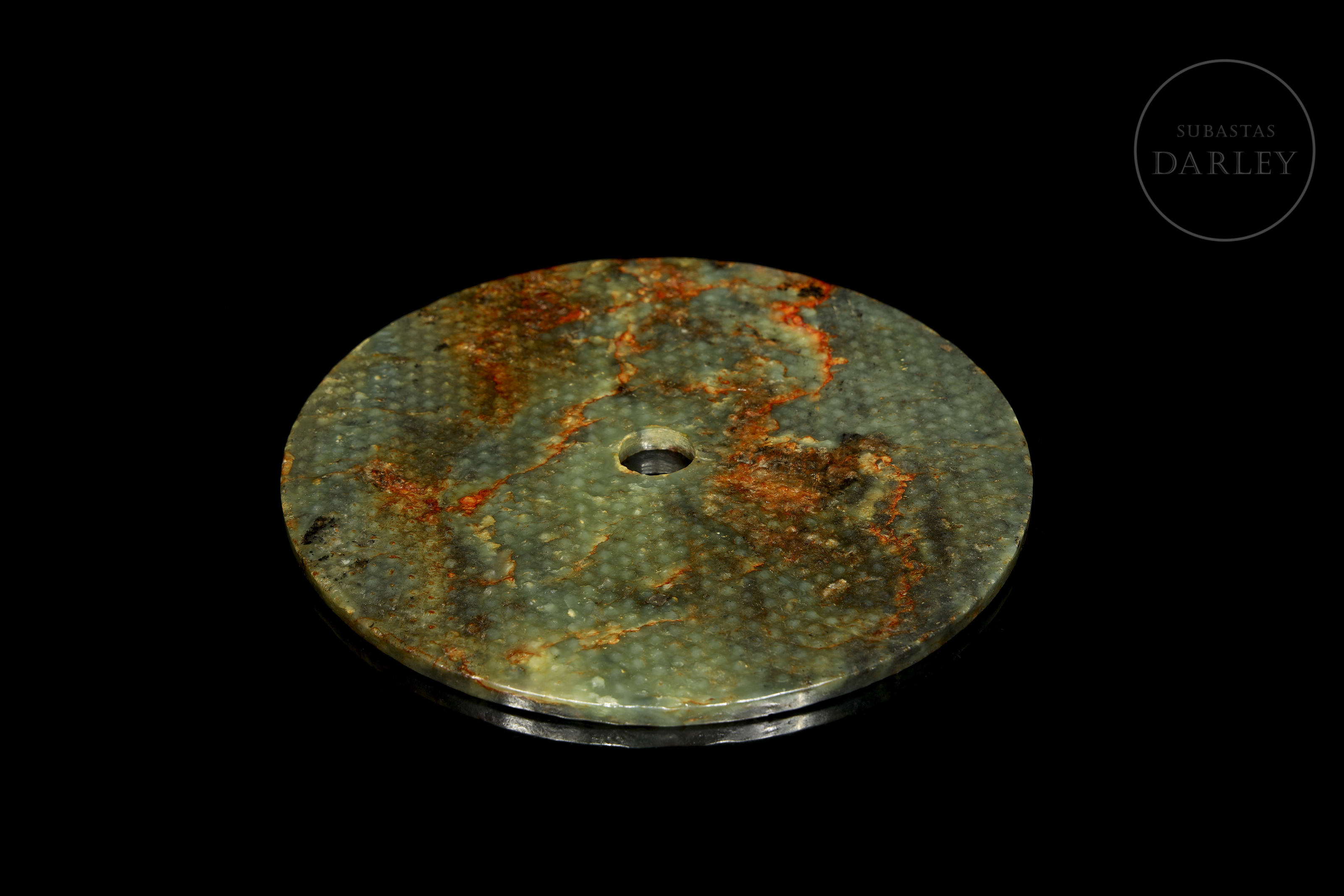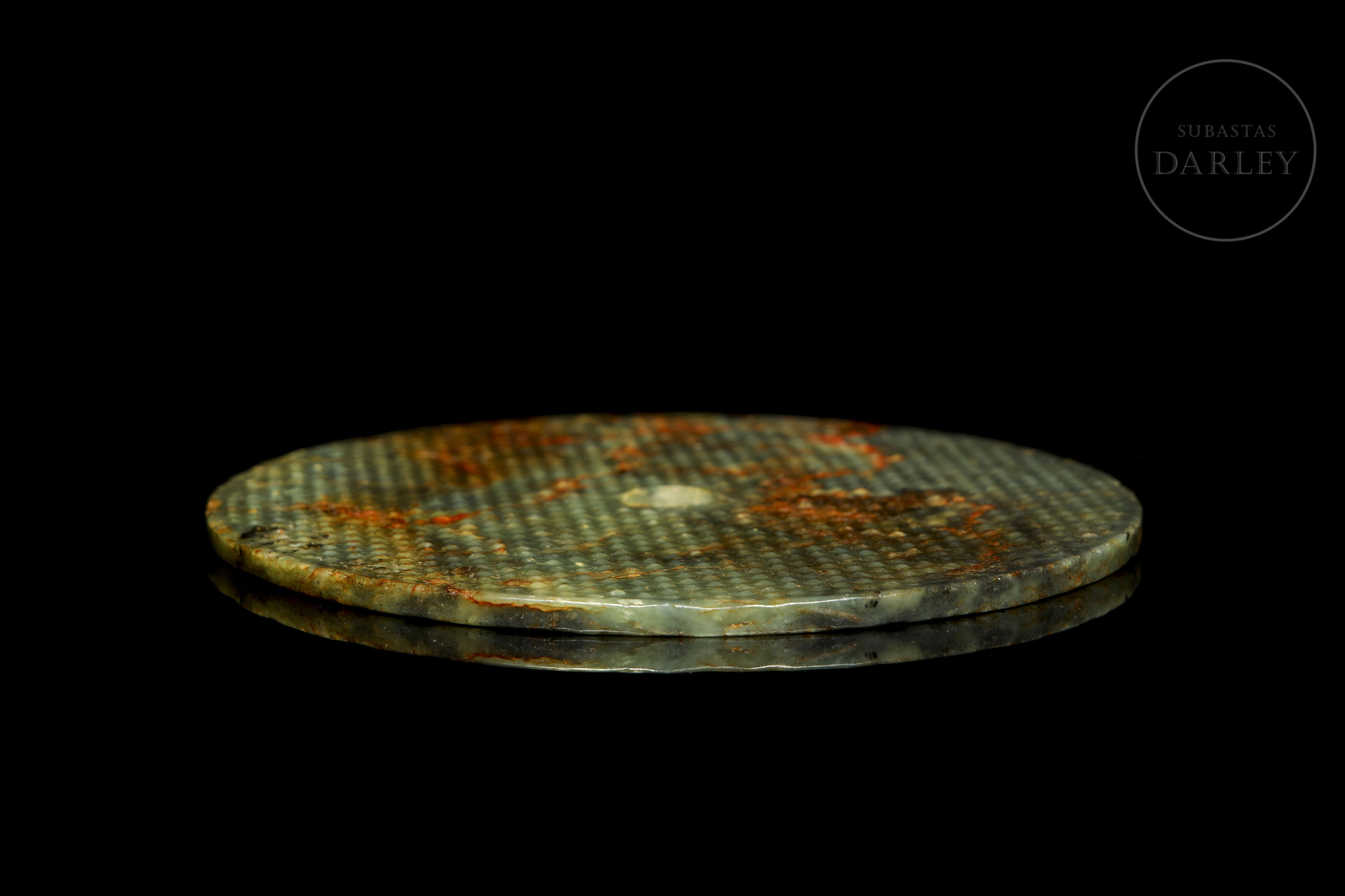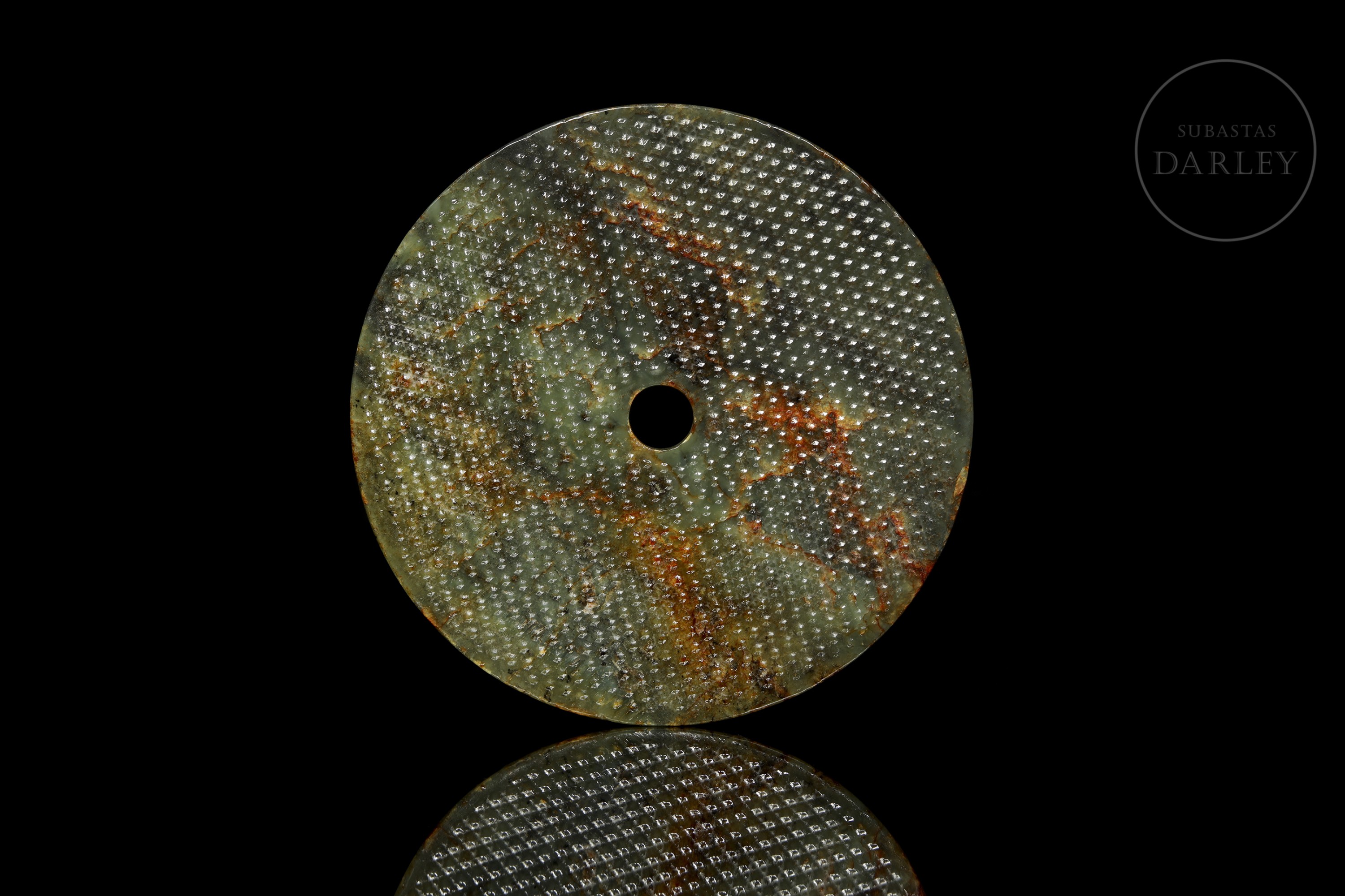 Jade de tonalidad verde oliva con una profusa pátina de color verde pálido y rojizo. Presenta el formato circular clásico con una perforación; y se encuentra adornado en toda su superficie con una retícula de punto o "motivo de granos" (guwen), tallados en relieve.