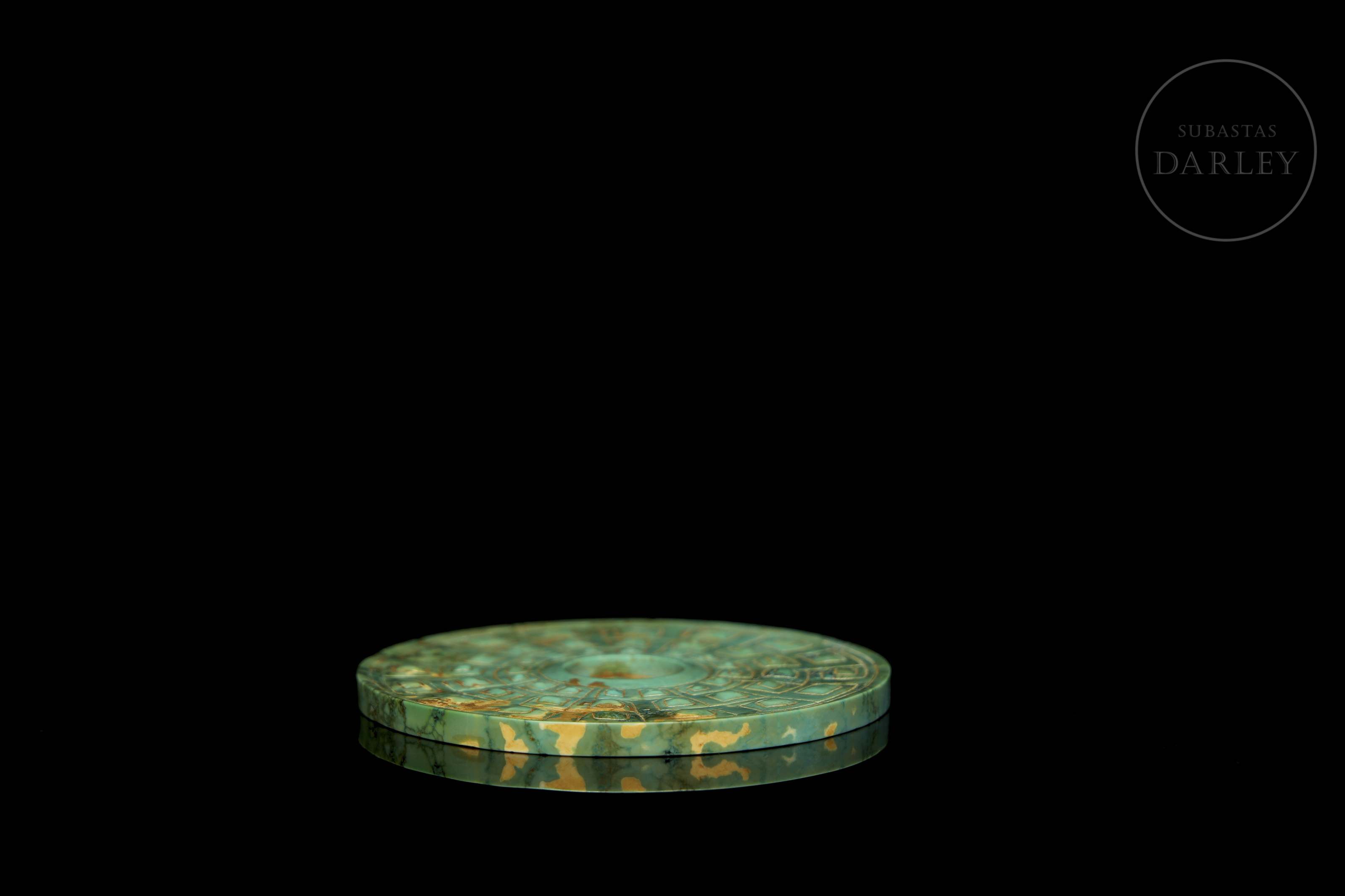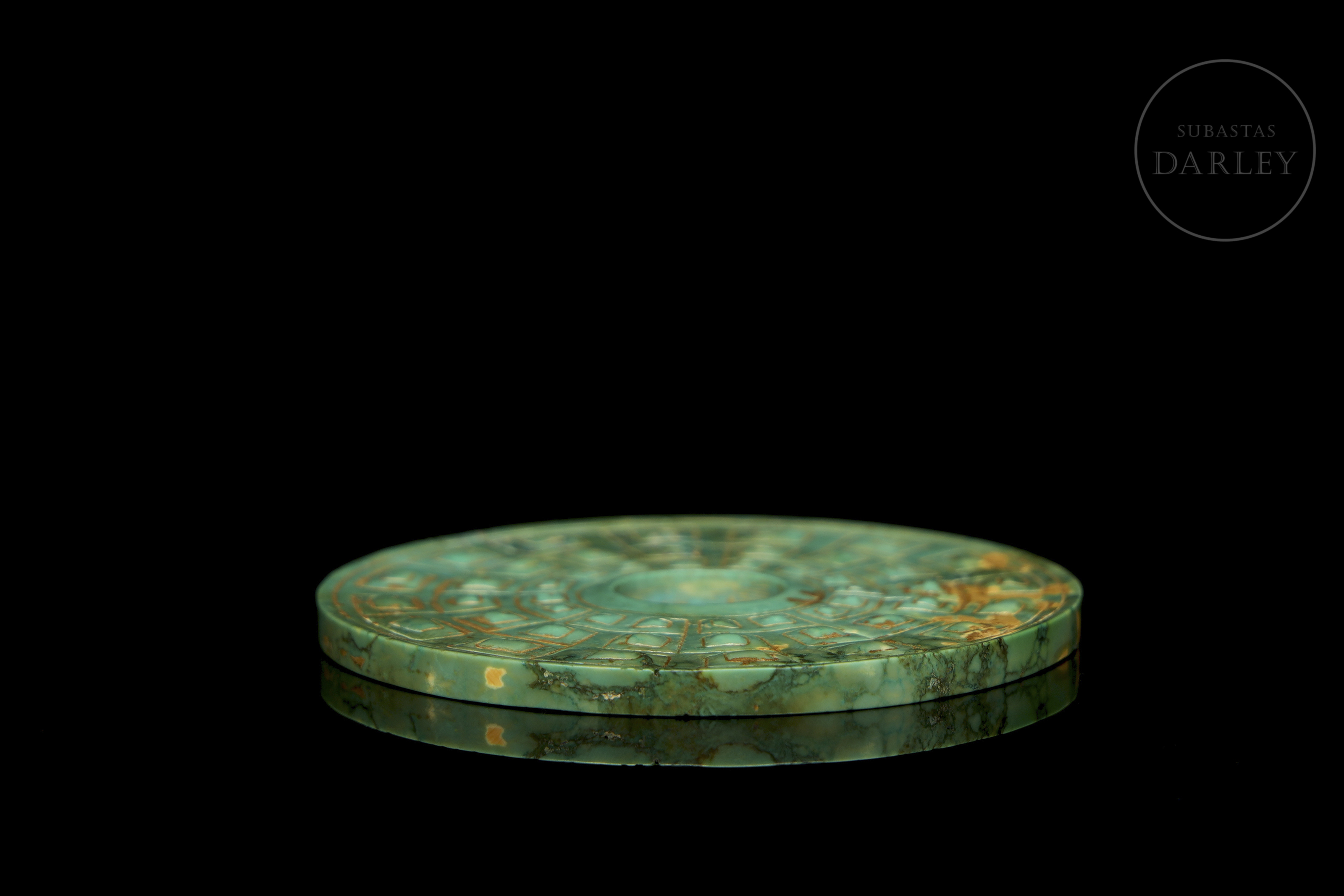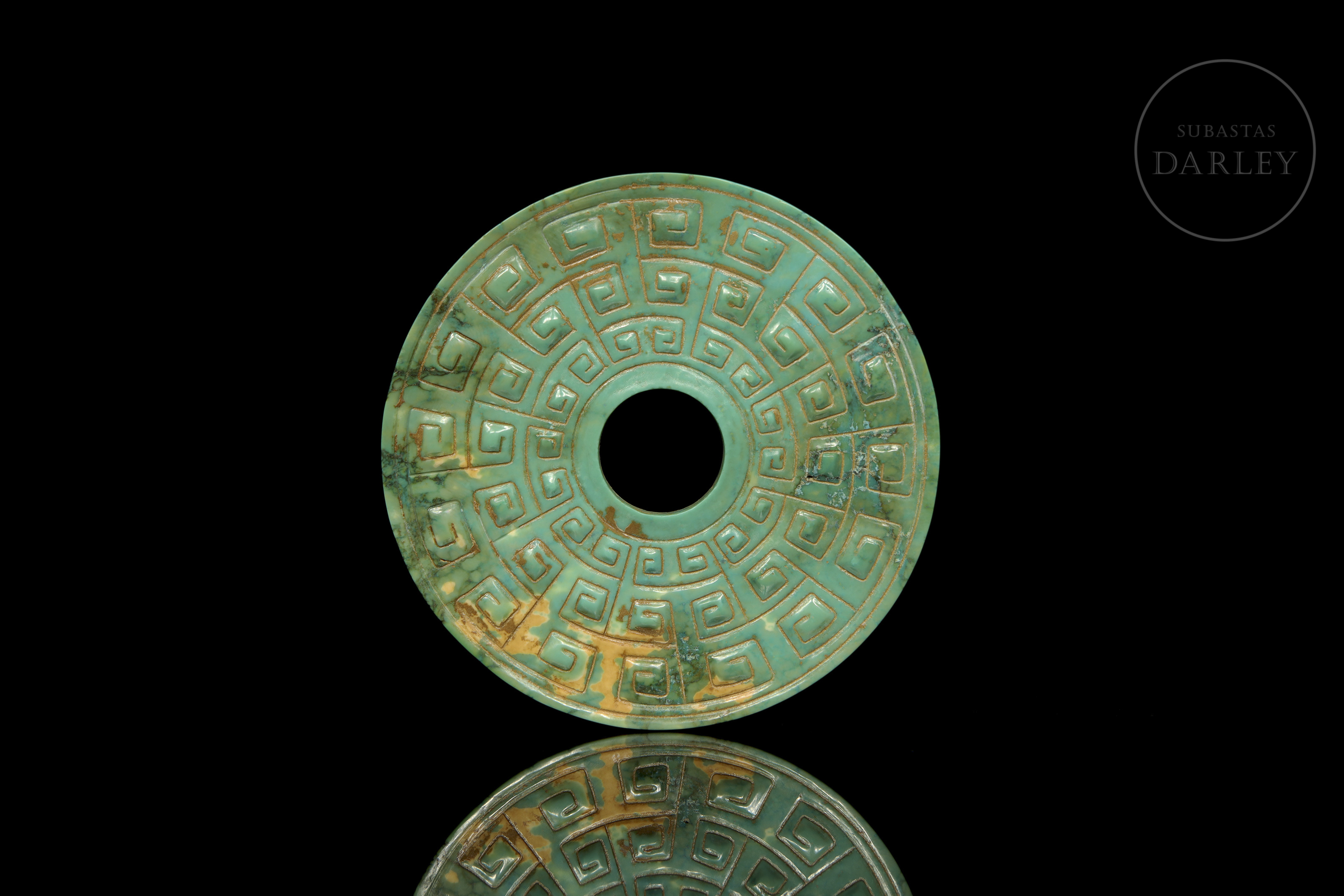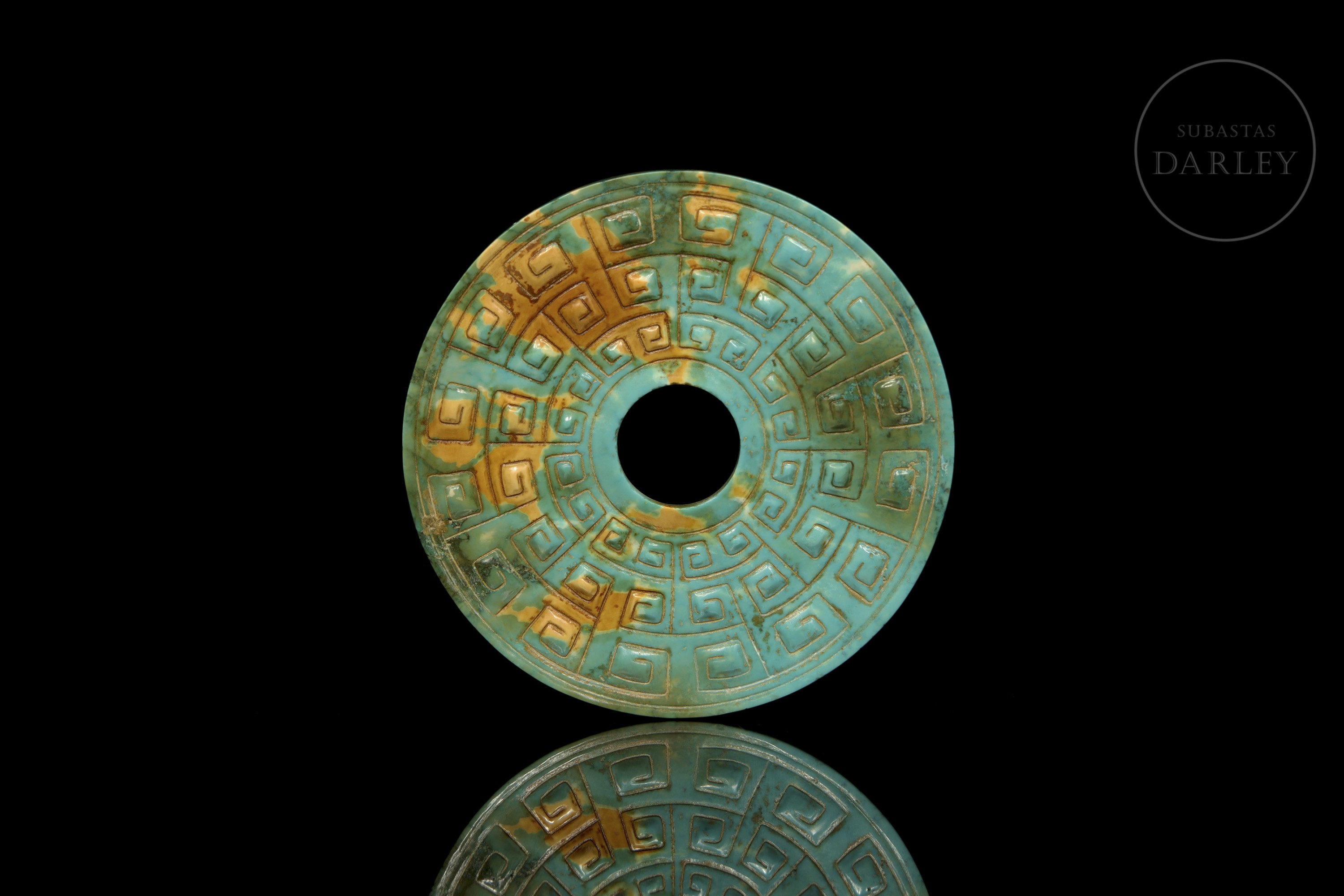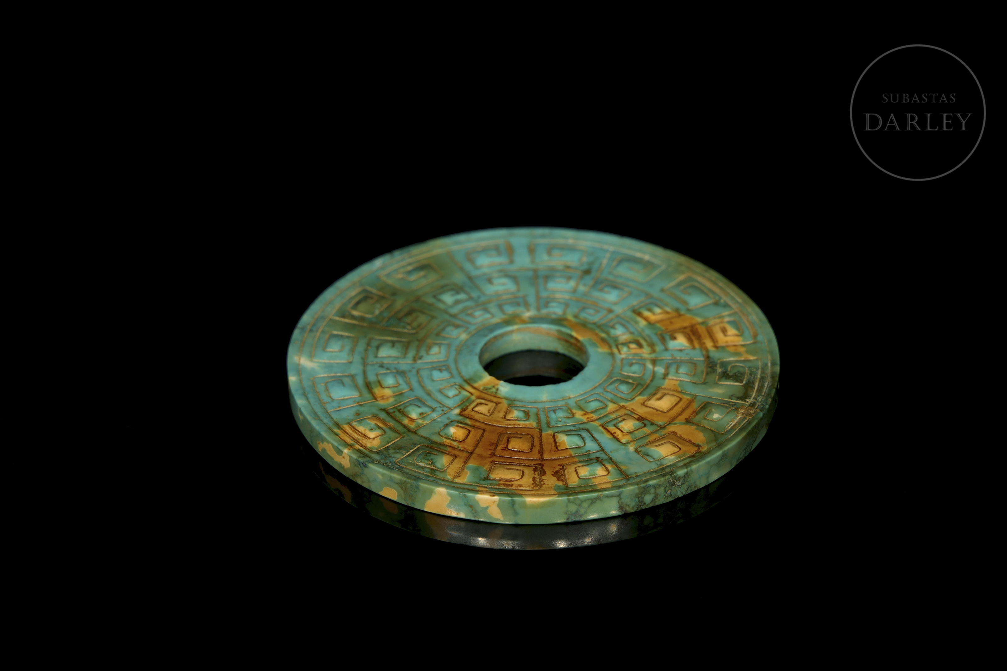 Turquesa tallada, de una vibrante tonalidad azul con marcadas vetas e inclusiones naturales en tonos ocre y marrón. La pieza presenta el formato de un disco plano con perforación circular central, decorado por ambas caras con un complejo patrón geométrico. Dinastía Han (206 a.C. – 220 d.C.) o posterior.