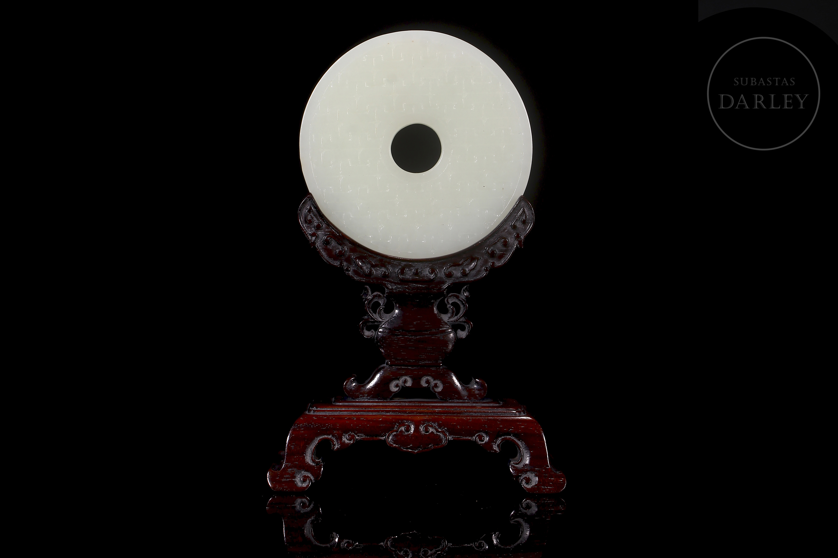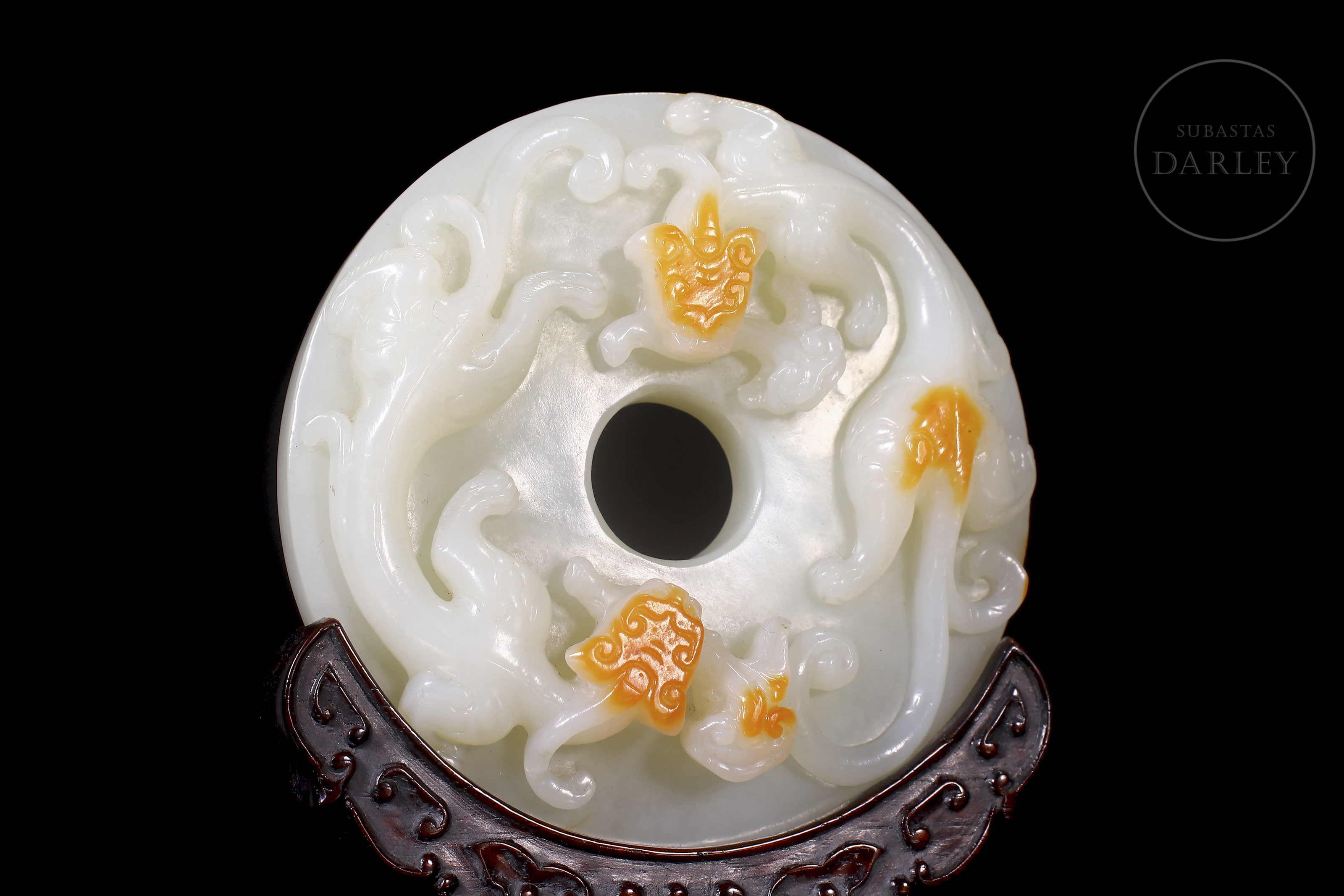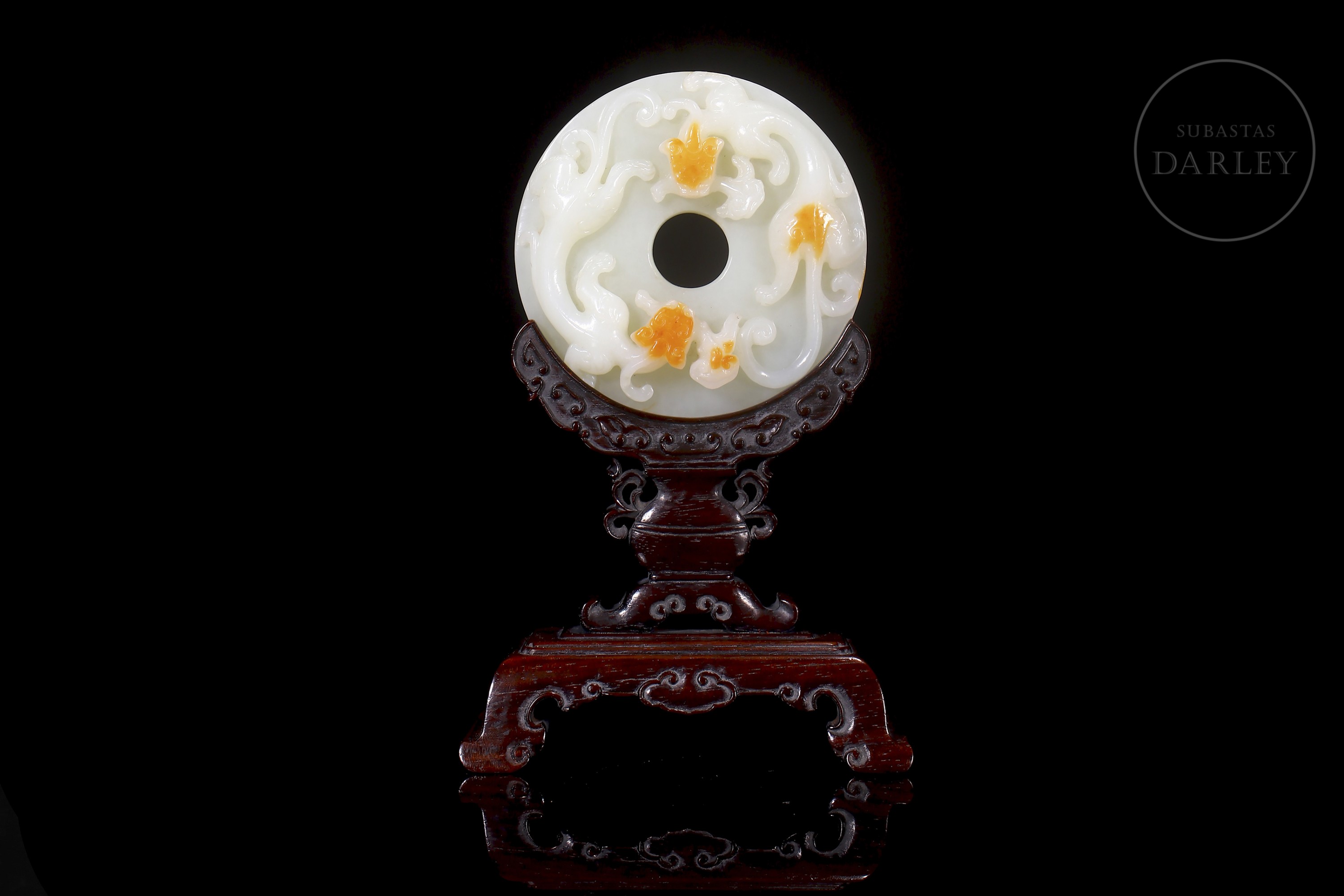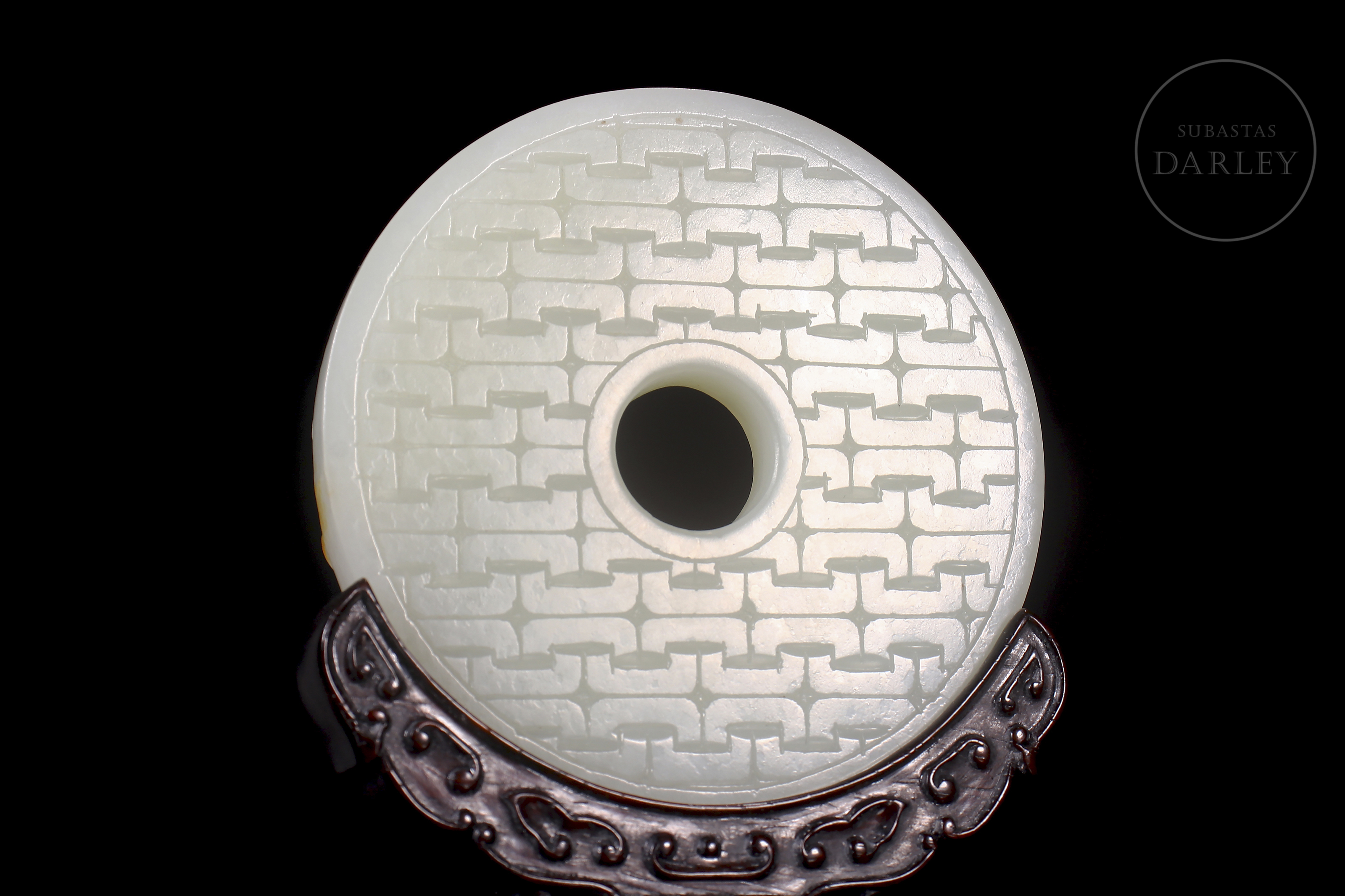 Disco ceremonial (bi) tallado de jade blanco y de forma circular, con una perforación central. La decoración muestra en una cara dos dragones realizados en altorrelieve, de cuerpo serpenteante y portando un lingzhi en sus fauces. El jade es de color blanco cremoso, con atractivas vetas de color naranja óxido. La cara posterior está decorada con un patrón geométrico de estilo arcaico. El disco dispone sobre una base de madera tallada (posiblemente zitan) de color oscuro, con un diseño de jarrón central y volutas decorativas. Dinastía Qing (1644–1912).
