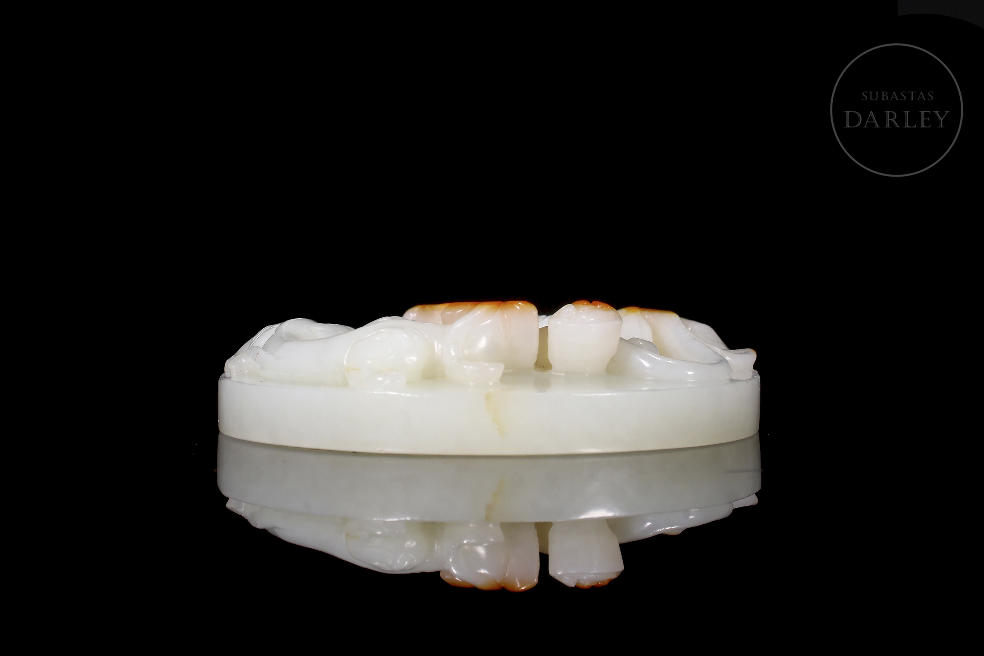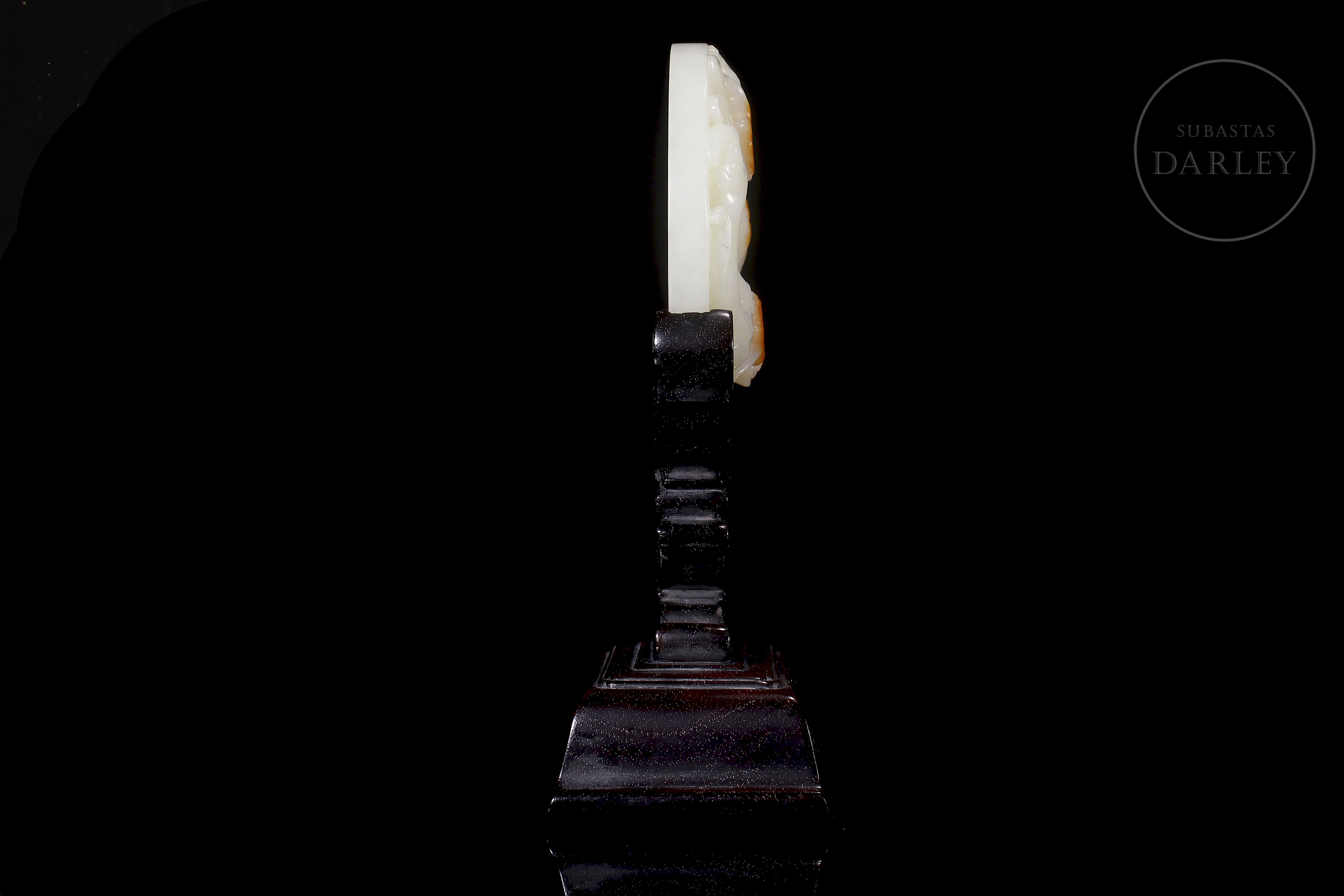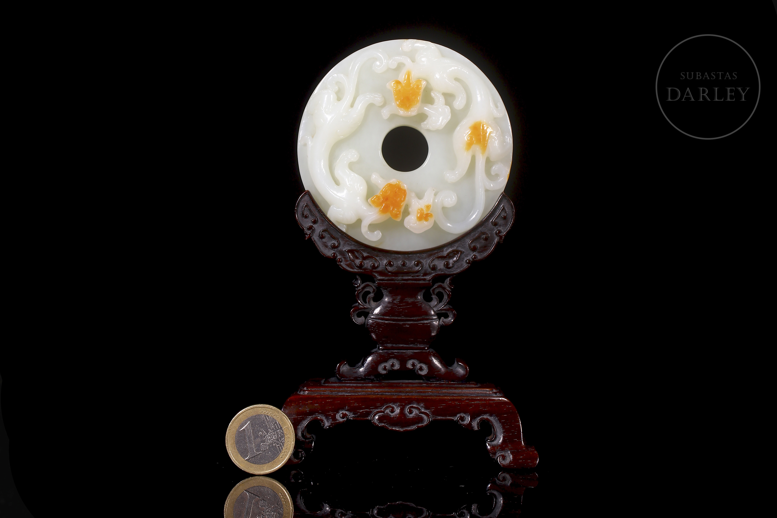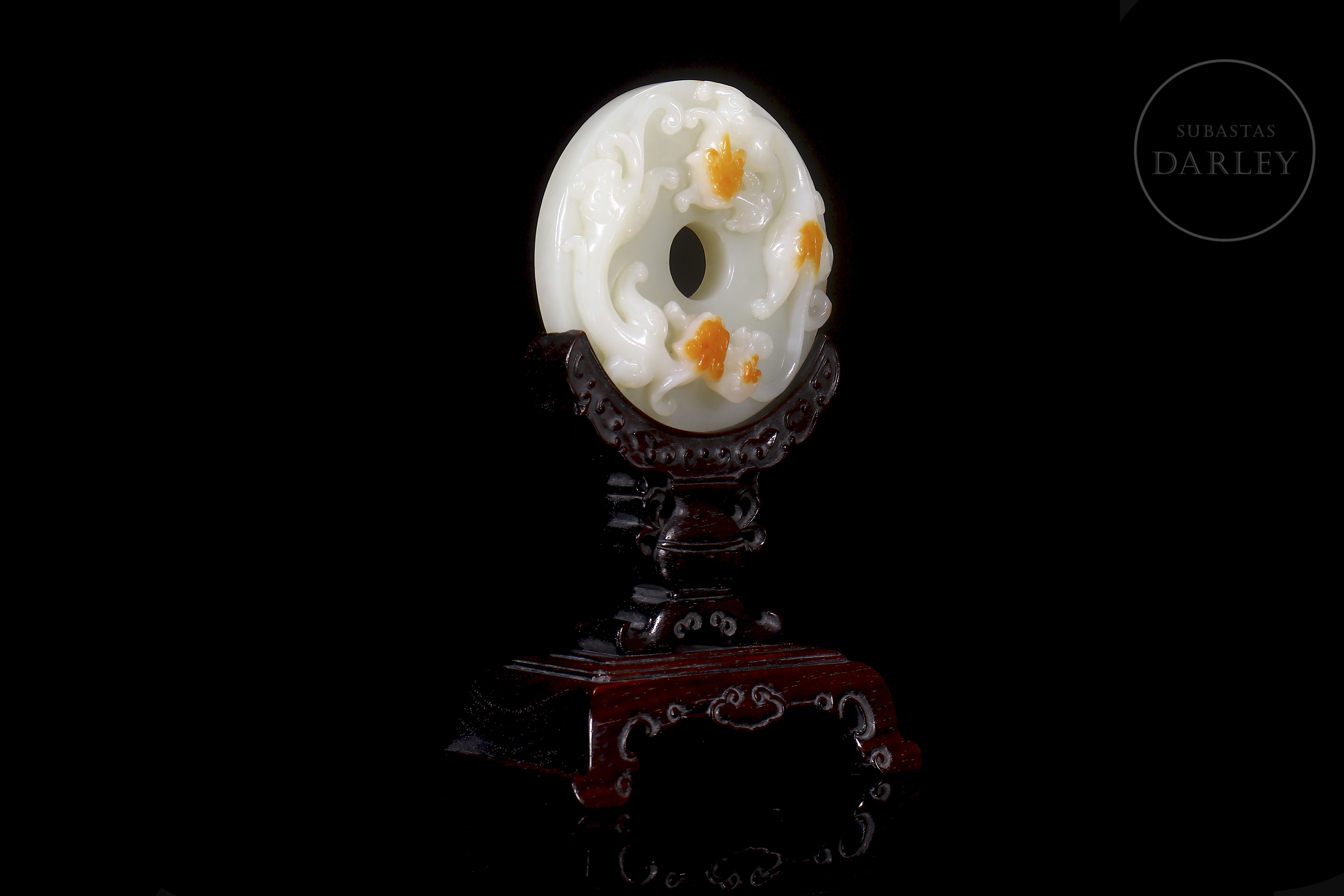 Disco ceremonial (bi) tallado de jade blanco y de forma circular, con una perforación central. La decoración muestra en una cara dos dragones realizados en altorrelieve, de cuerpo serpenteante y portando un lingzhi en sus fauces. El jade es de color blanco cremoso, con atractivas vetas de color naranja óxido. La cara posterior está decorada con un patrón geométrico de estilo arcaico. El disco dispone sobre una base de madera tallada (posiblemente zitan) de color oscuro, con un diseño de jarrón central y volutas decorativas. Dinastía Qing (1644–1912).