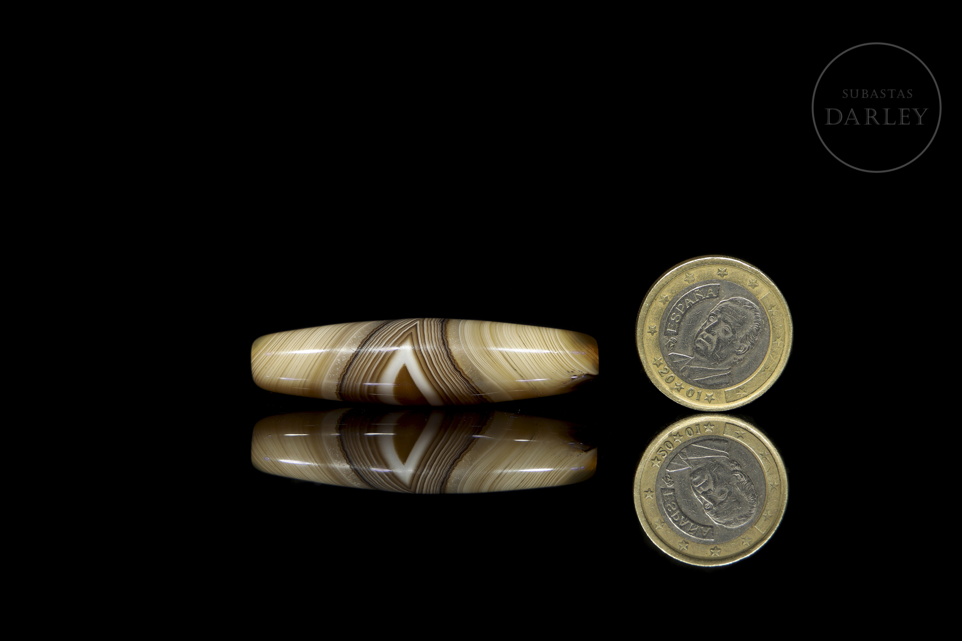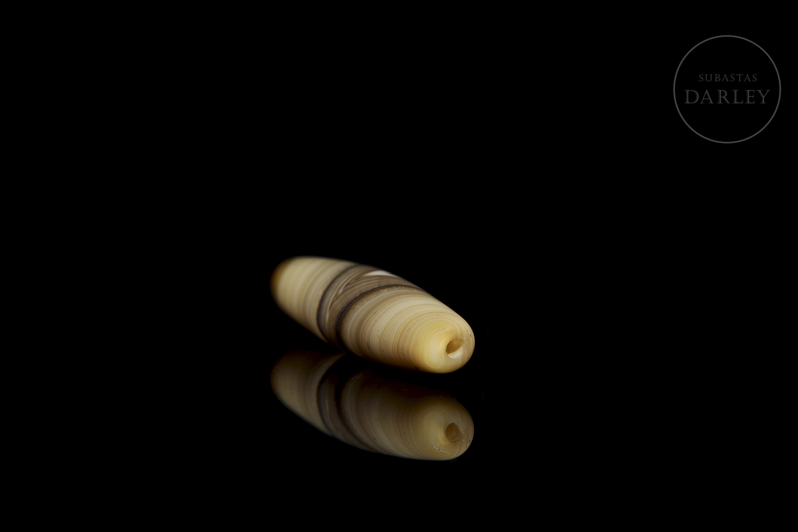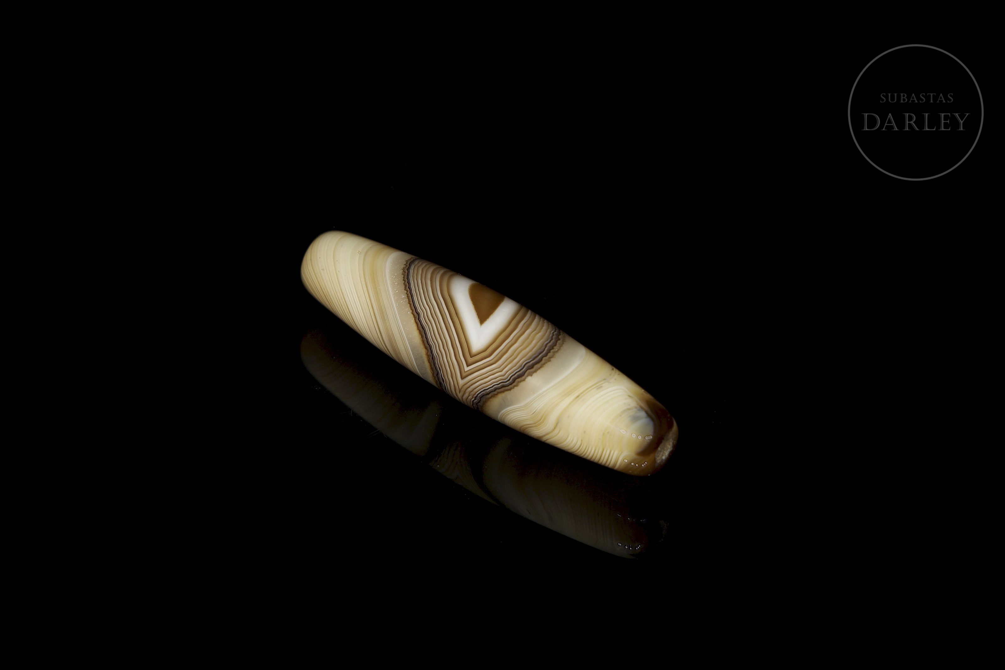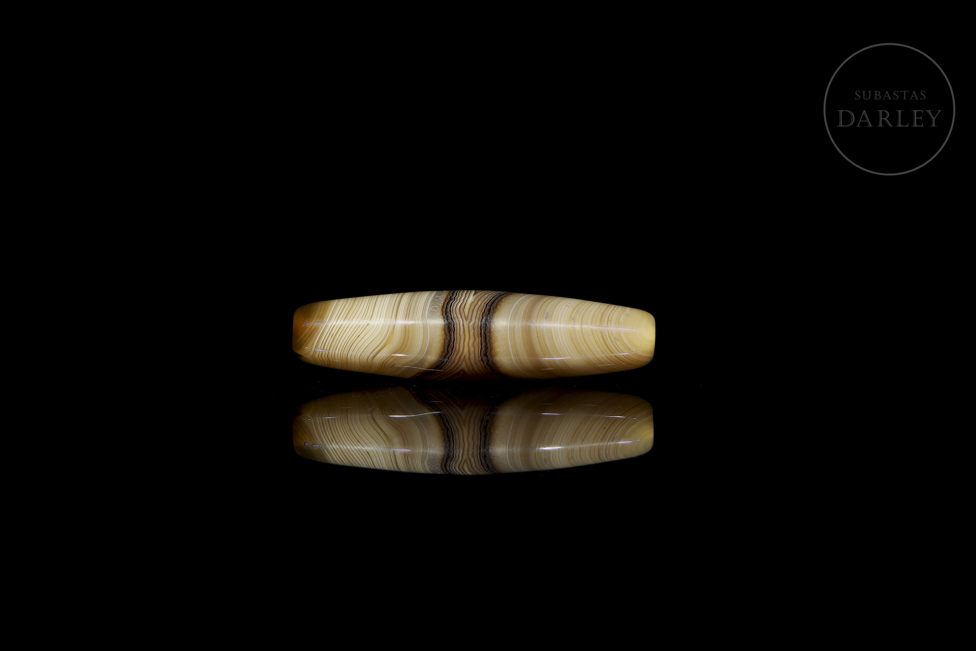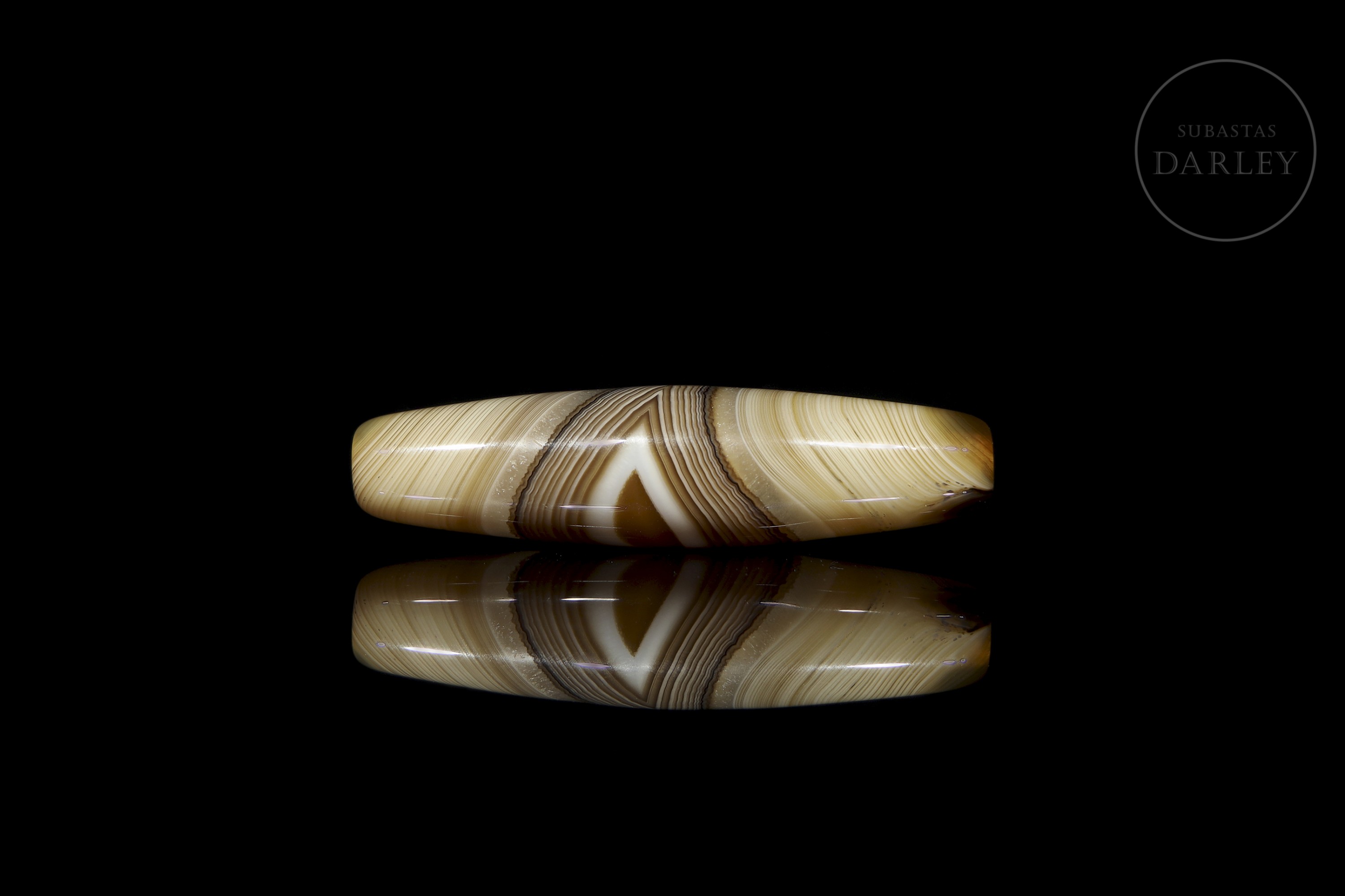 Dizi de ágata natural tallada, con una excepcional alternancia de bandas naturales en tonos crema, miel y marrón oscuro, que crean un patrón lineal y concéntrico. La pieza presenta un formato fusiforme alargado, con extremos redondeados. Destaca en su zona central un patrón de bandas en forma de "V". Posee una perforación longitudinal. Muestra pátina y desgaste por antigüedad. Dinastía Liao (916–1125) o posterior.