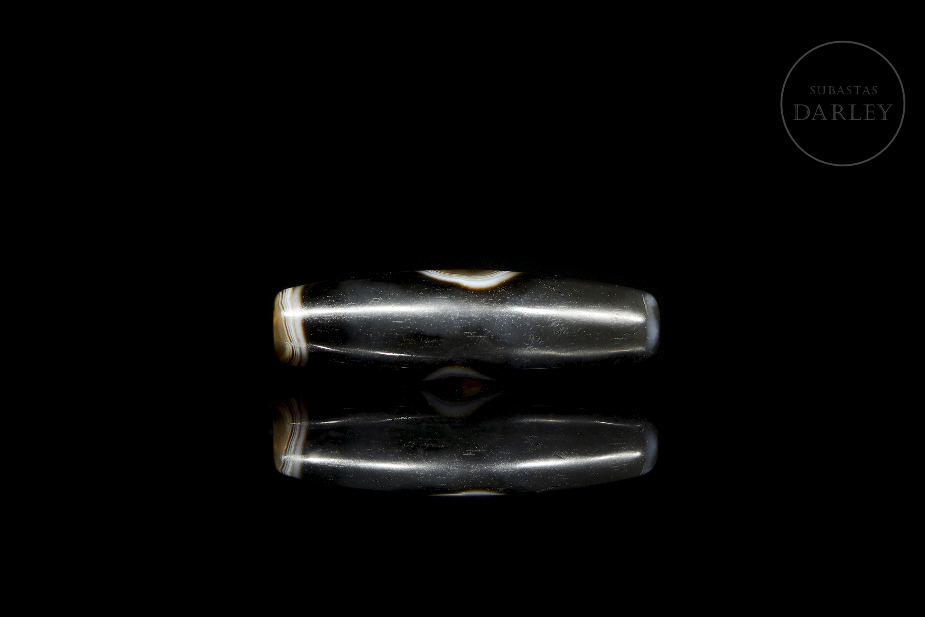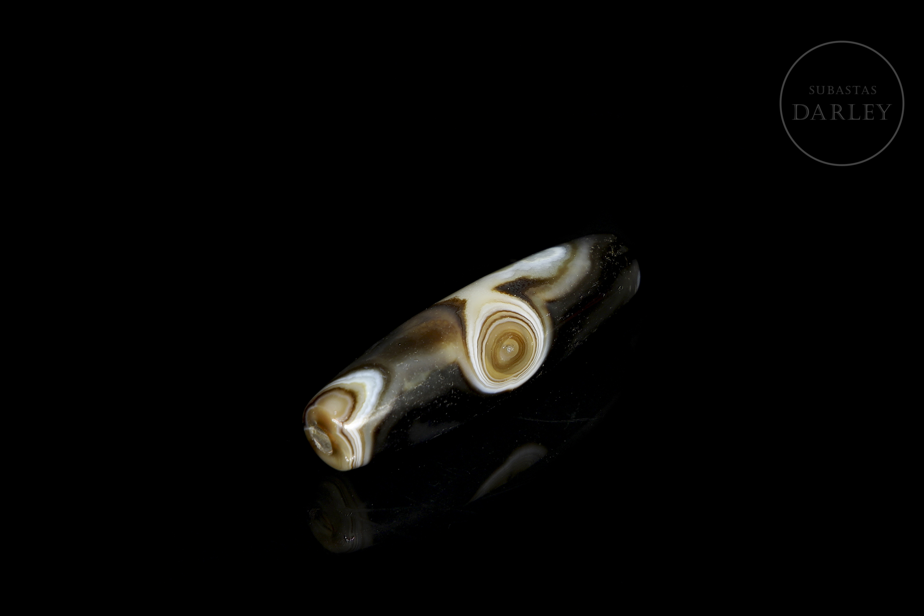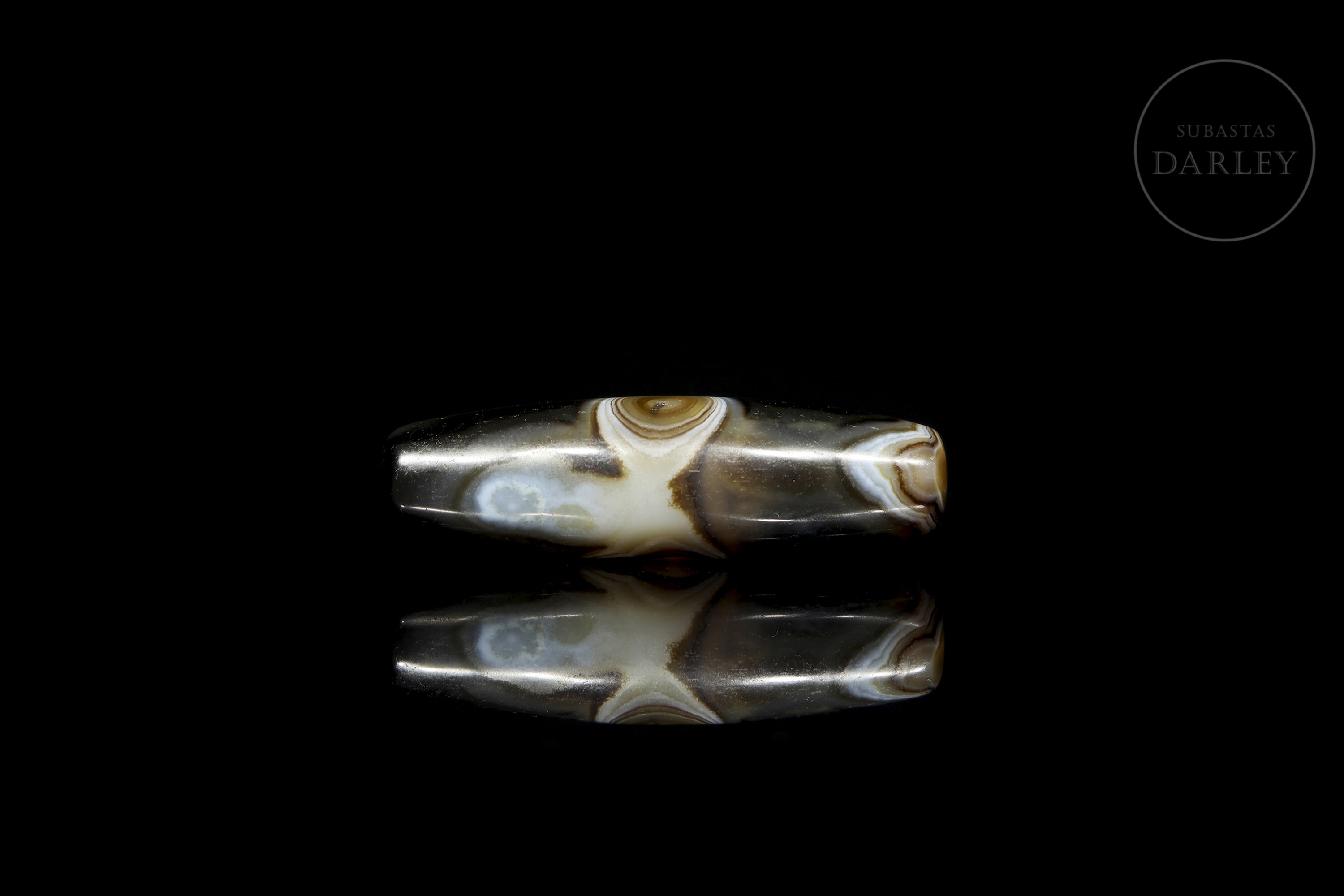 Realizado en ágata de tonalidad marrón oscuro y negra con una atractiva alternancia de bandas y vetas circulares naturales en blanco lechoso y tonos miel que forman patrones orgánicos. La pieza presenta un formato fusiforme alargado. Destaca por la disposición central de un "ojo" perfectamente circular, que actúa como foco visual y símbolo de protección espiritual. Dinastía Liao (916–1125) o posterior.