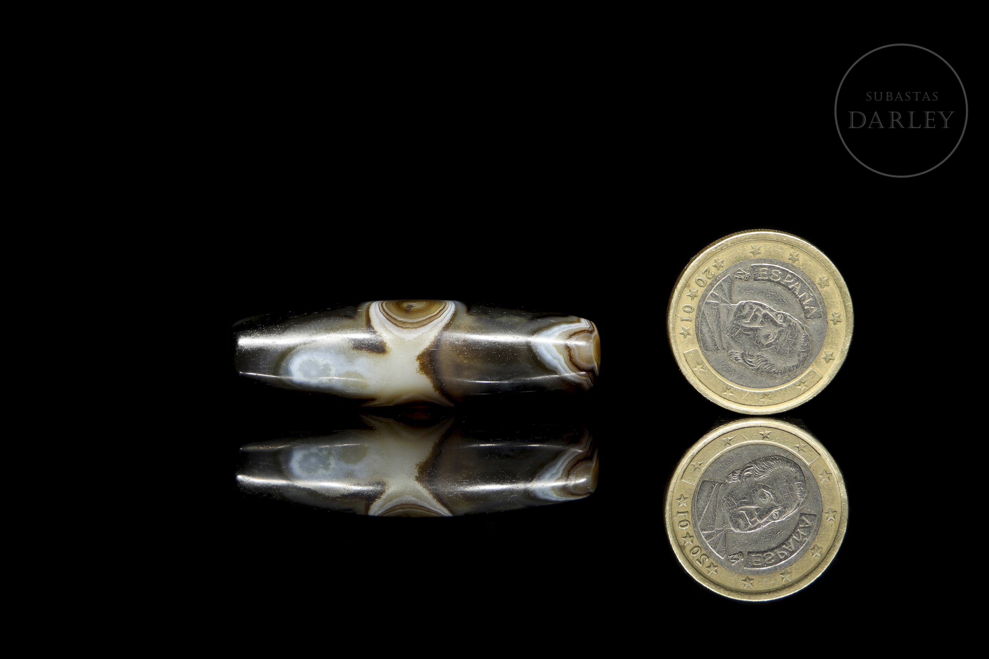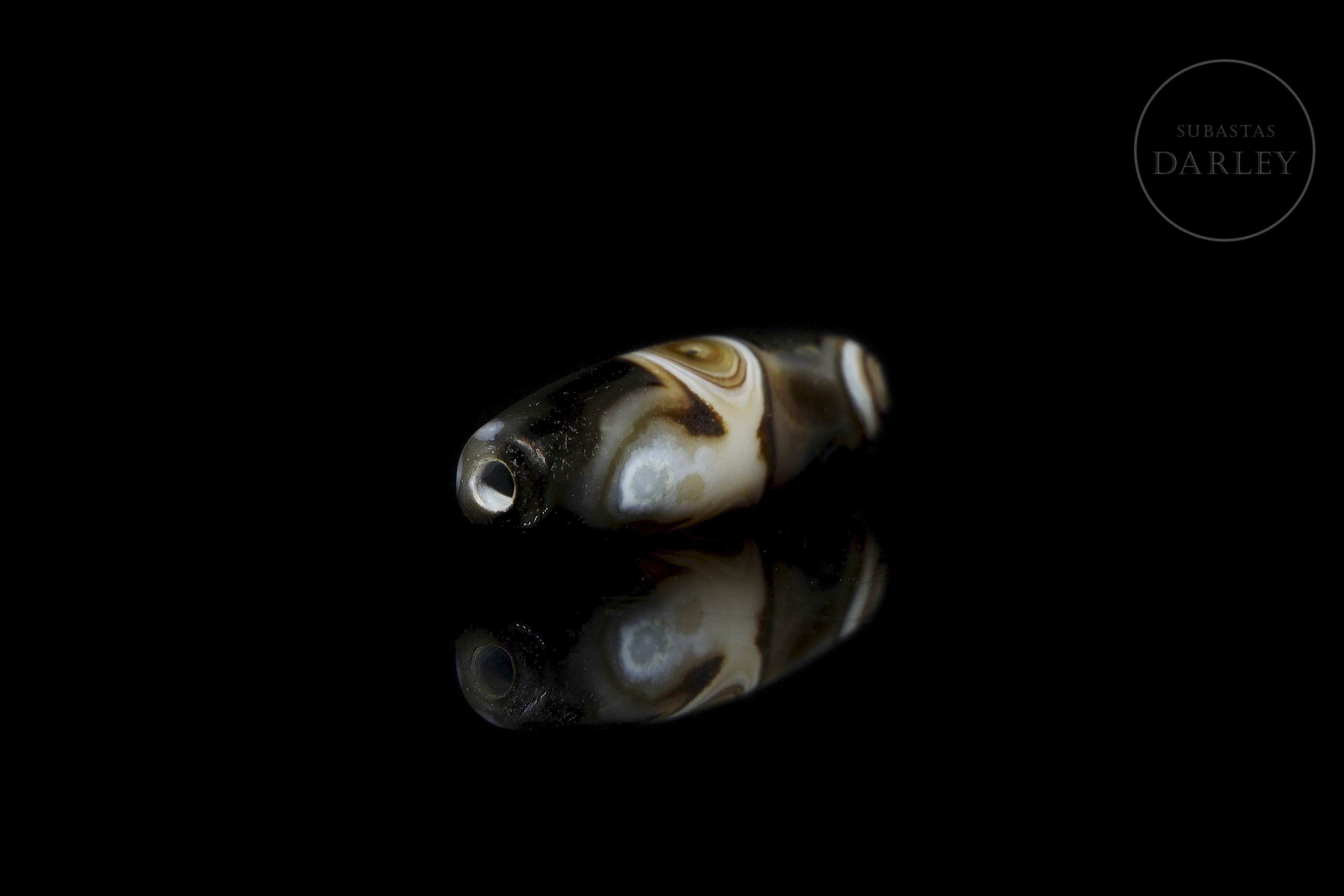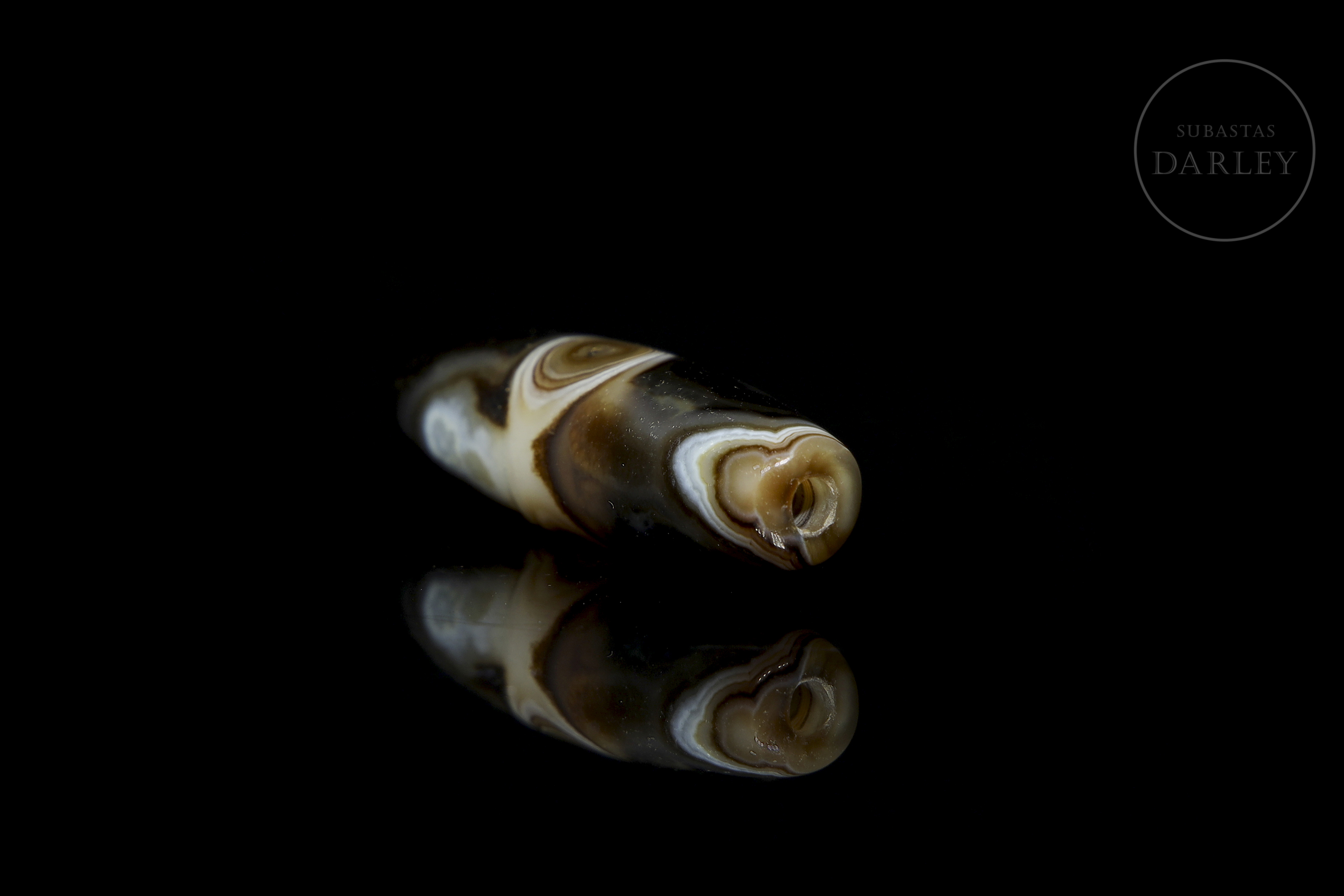 Realizado en ágata de tonalidad marrón oscuro y negra con una atractiva alternancia de bandas y vetas circulares naturales en blanco lechoso y tonos miel que forman patrones orgánicos. La pieza presenta un formato fusiforme alargado. Destaca por la disposición central de un "ojo" perfectamente circular, que actúa como foco visual y símbolo de protección espiritual. Dinastía Liao (916–1125) o posterior.
