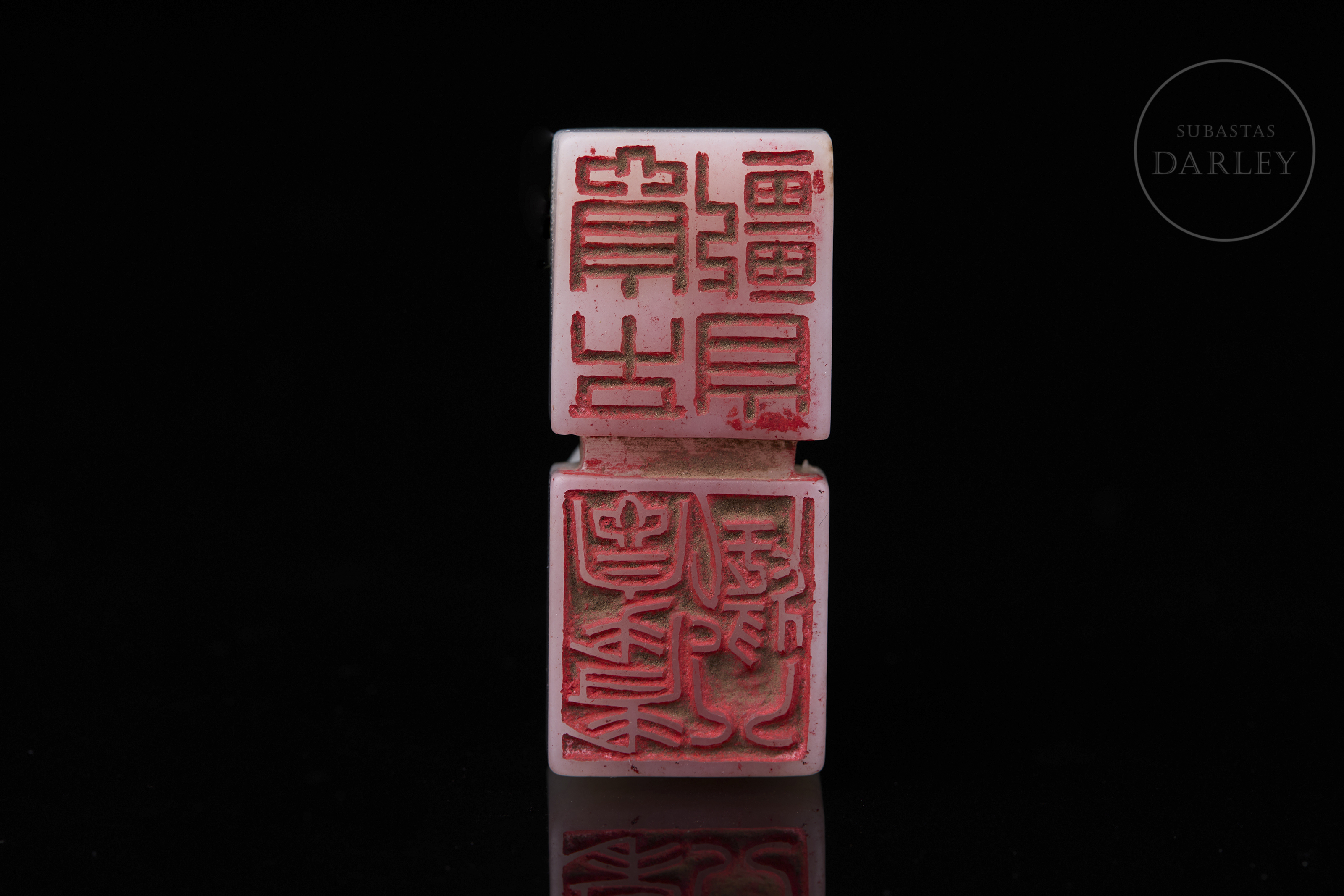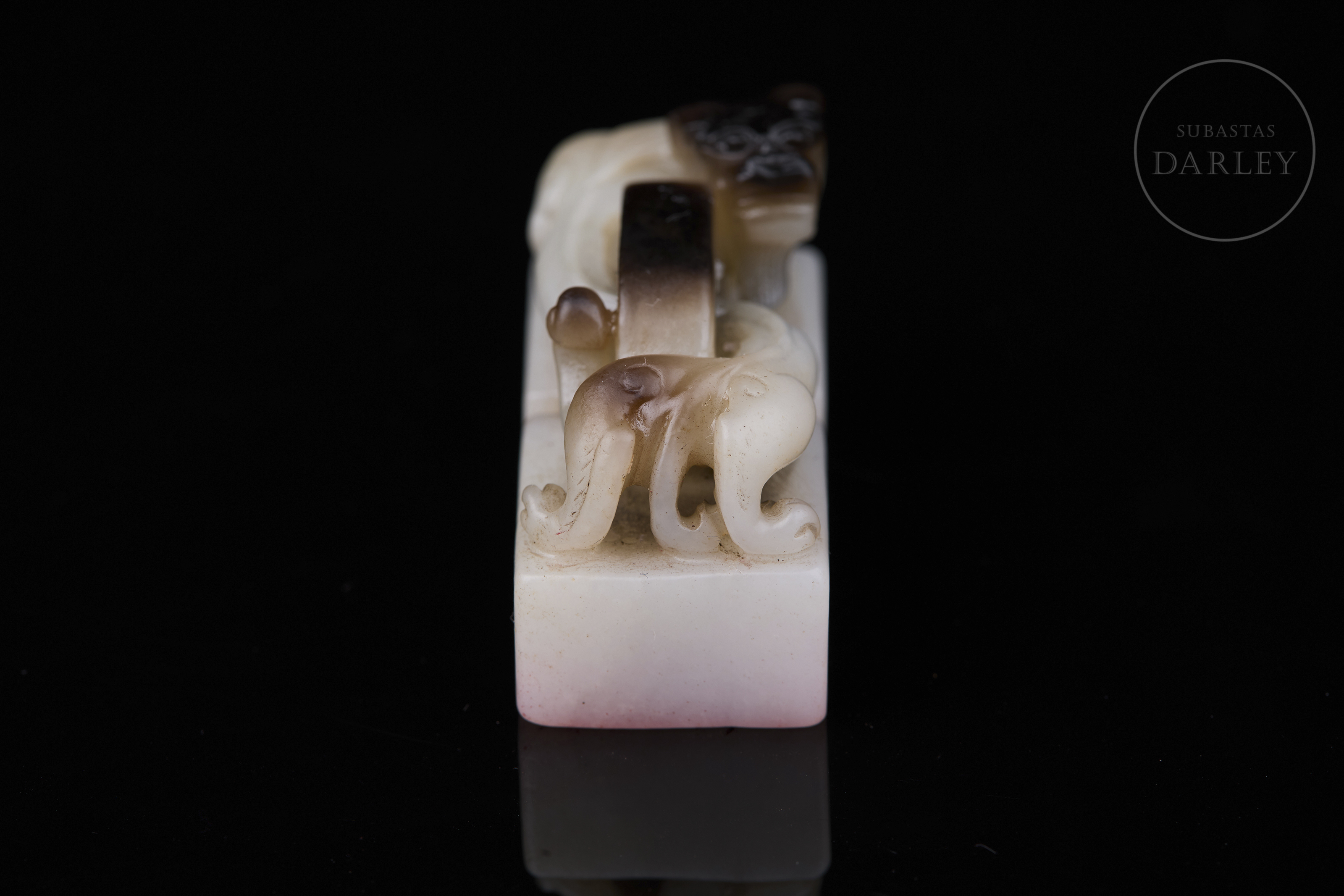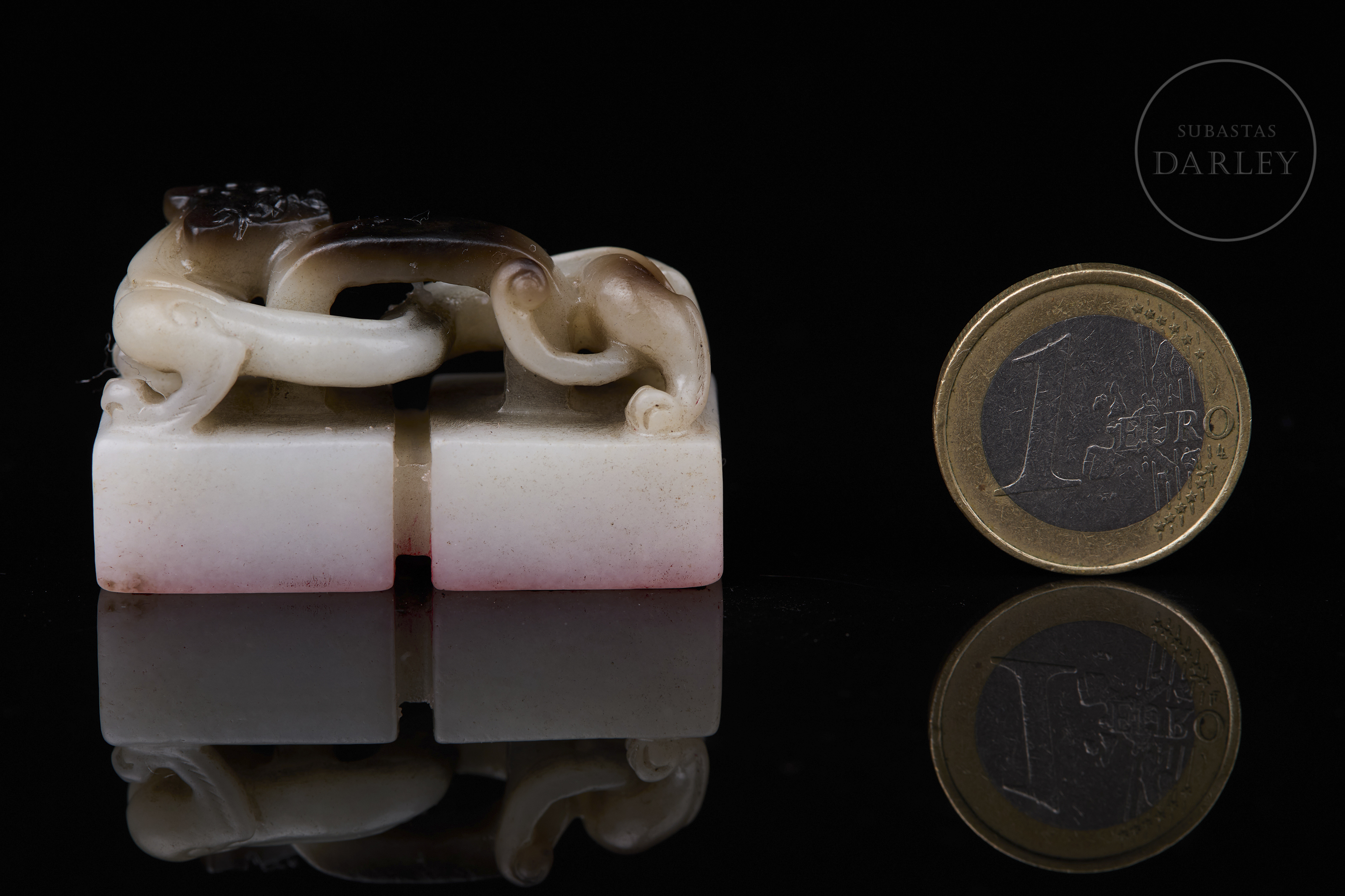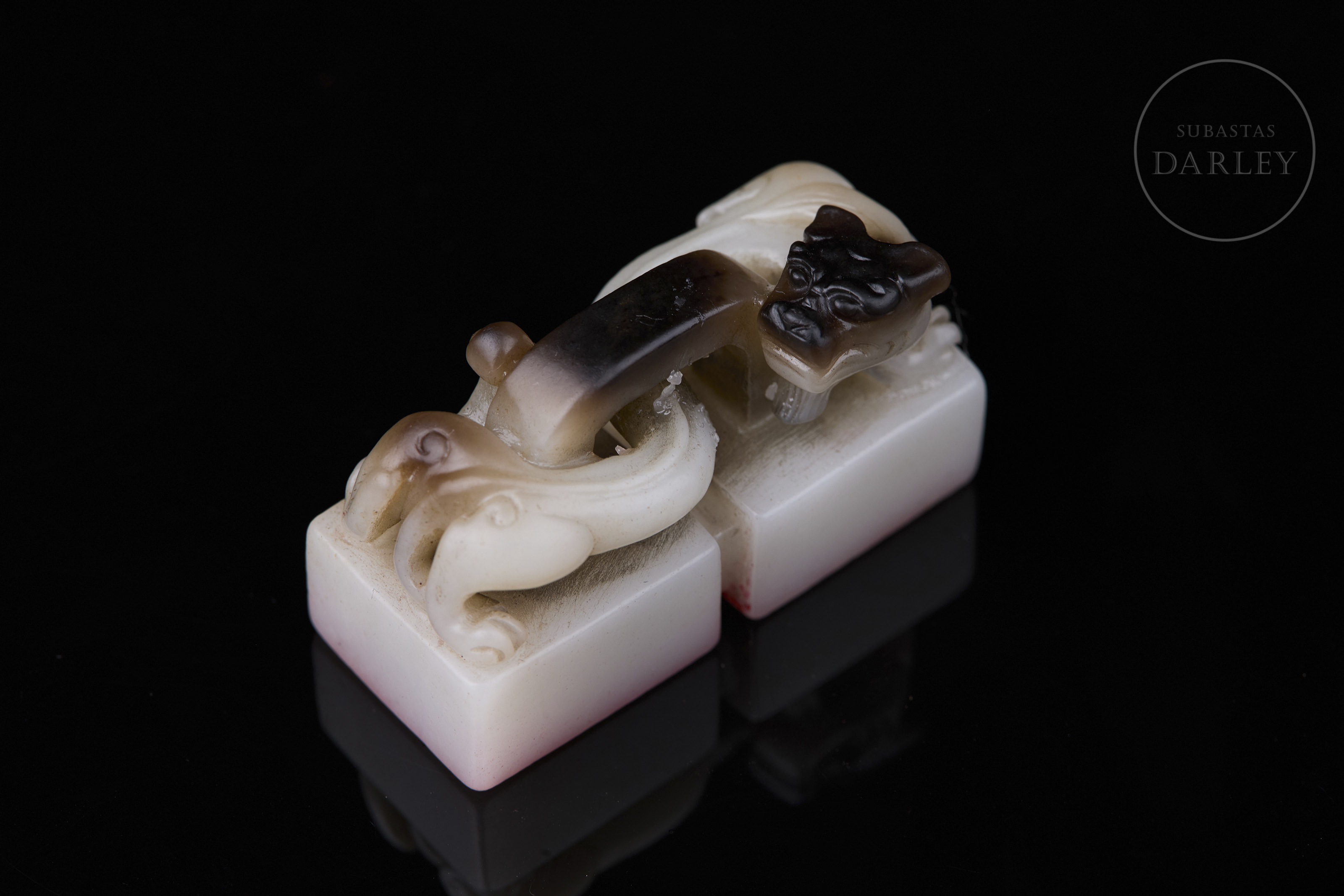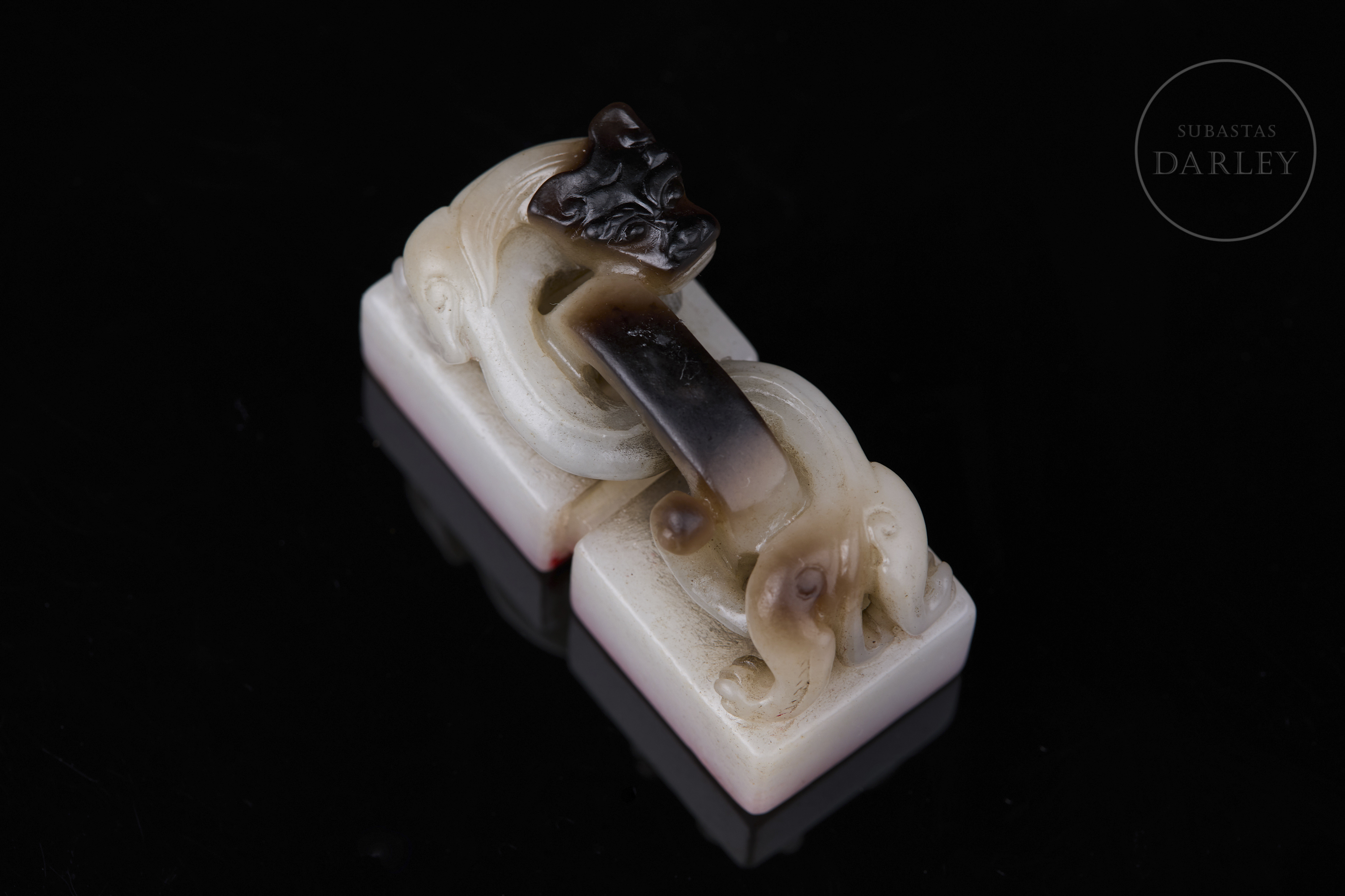 Doble sello tallado de jade, formado por dos bloques cuadrangulares unidos por un remate escultórico. Presenta un remate en forma de dragón chilong enroscado, con el cuerpo curvo y el rostro y la melena finamente esculpidos. El jade base es de color blanco lechoso y brillante con vetas de color marrón oscuro. La matriz muestra las inscripciones "八徵耄念,自强不息" grabadas. Dinastía Qing (1644–1912).
