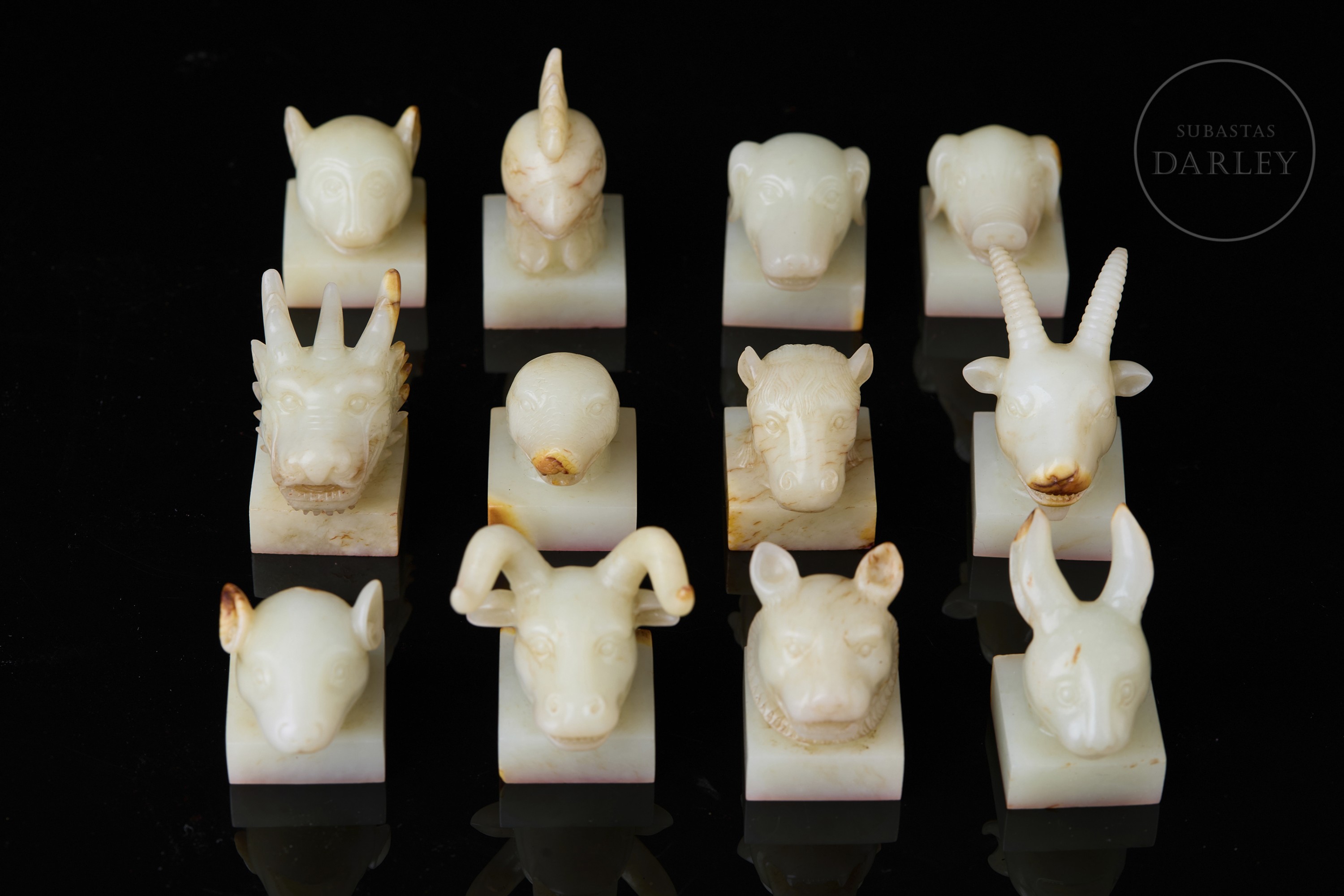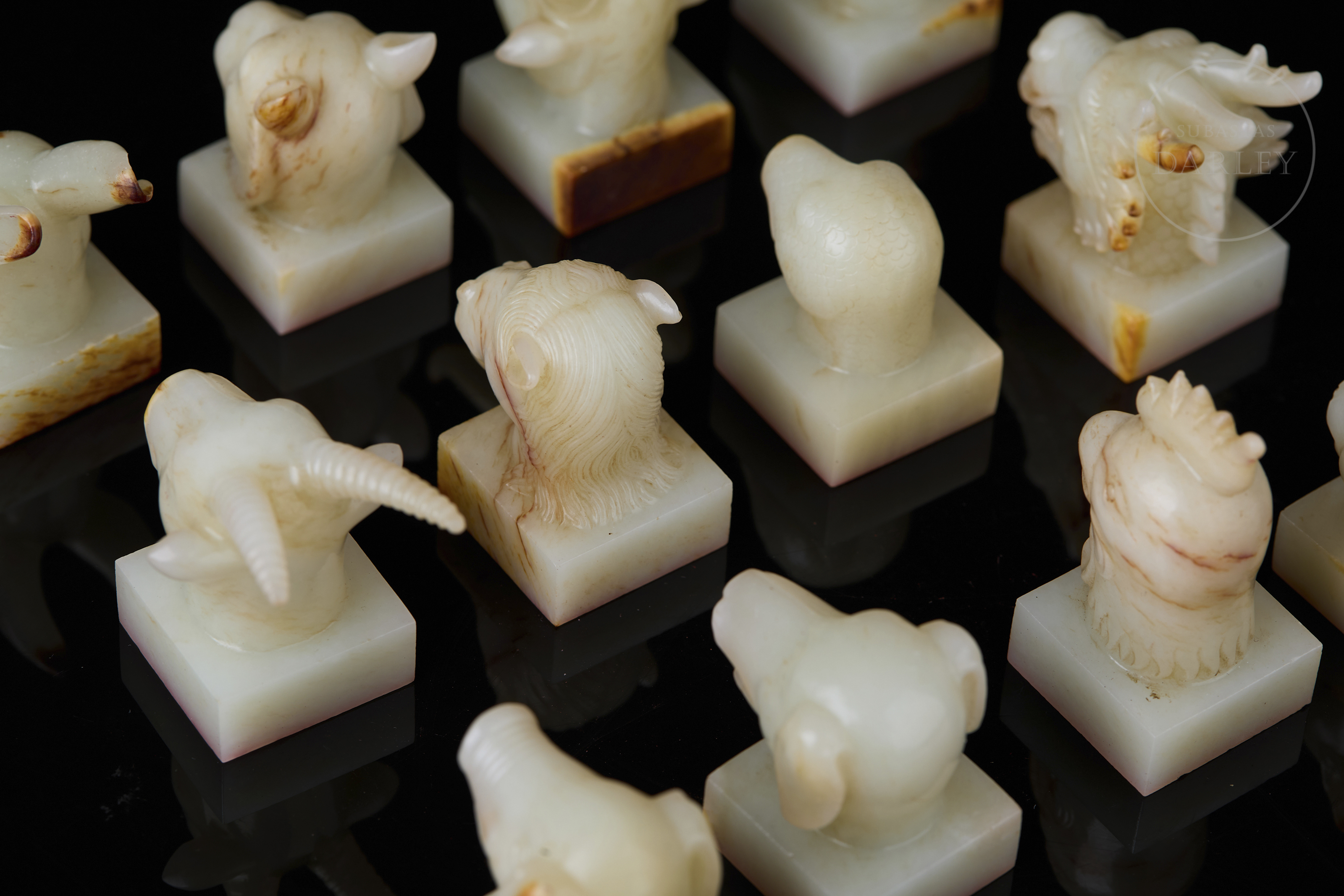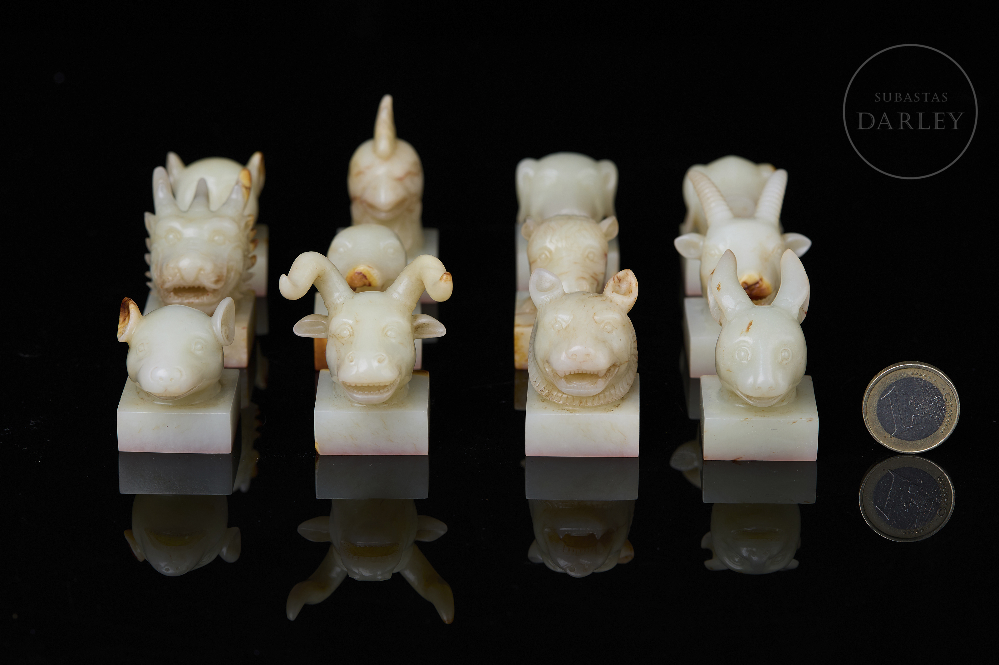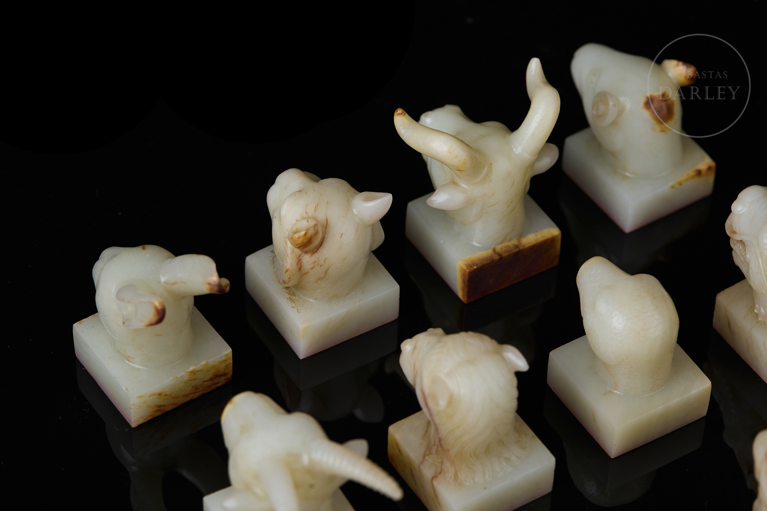 Doce sellos de jade de tonalidad blanca de gran pureza, con vetas naturales de color ocre rojizo. Cada sello está rematado por el bulto de uno de los animales del zodiaco chino (rata, buey, tigre, conejo, dragón, serpiente, caballo, cabra, mono, gallo, perro y cerdo). Las bases son de formato cuadrangular y contienen, en su cara inferior, caracteres grabados entintados en rojo cinabrio. El conjunto se presenta en su estuche original forrado en seda brocada con motivos tradicionales. Dinastía Qing (1644–1912).