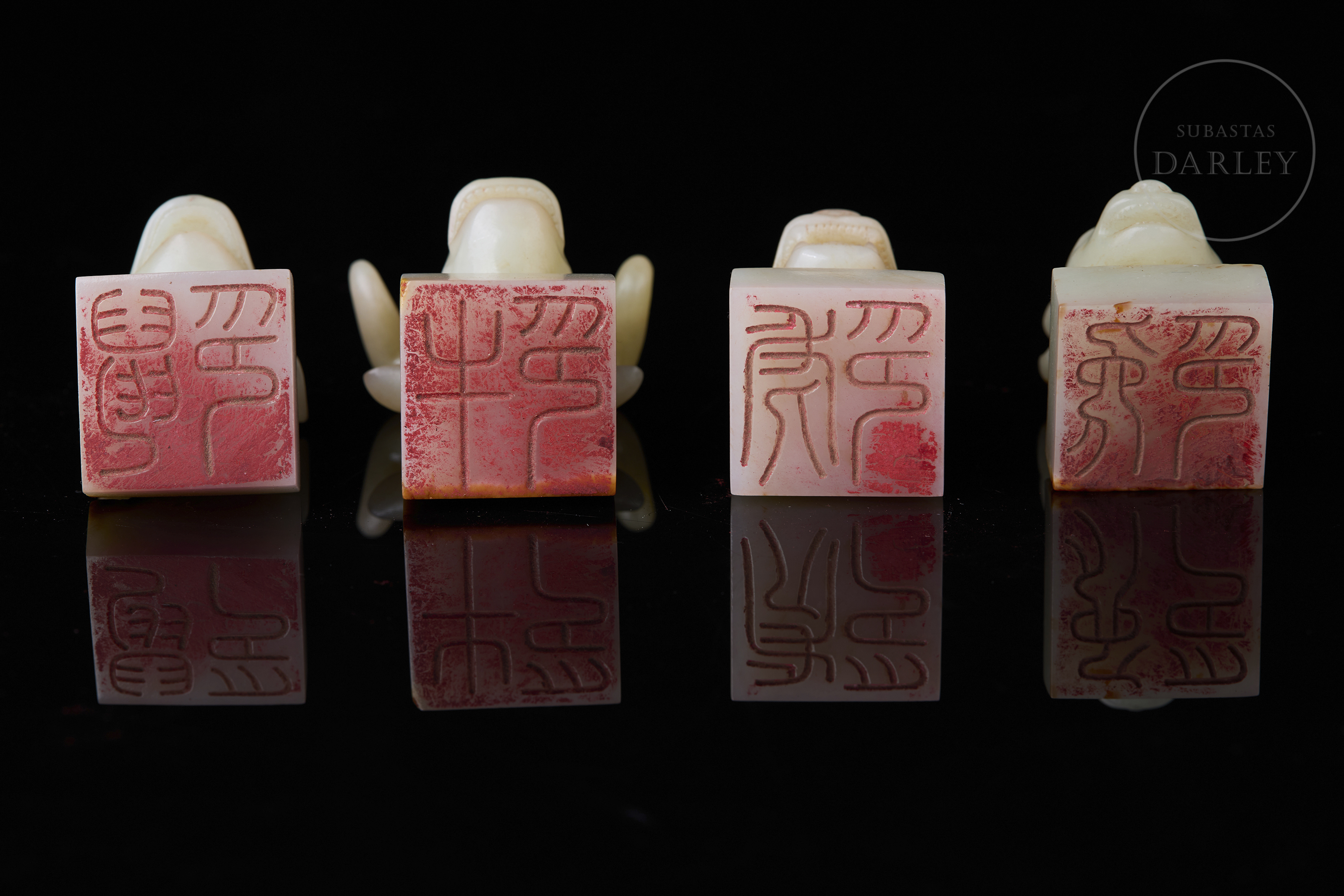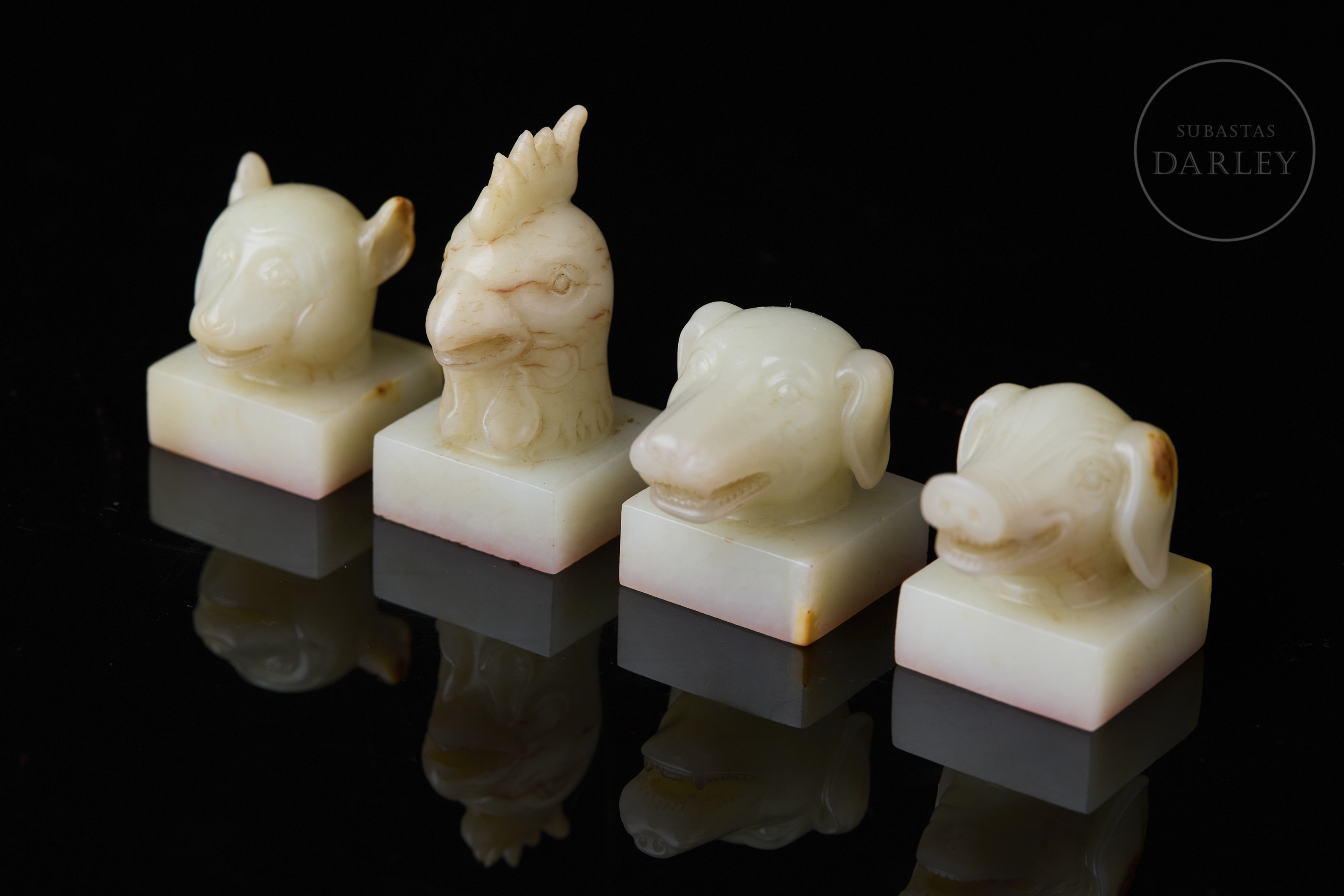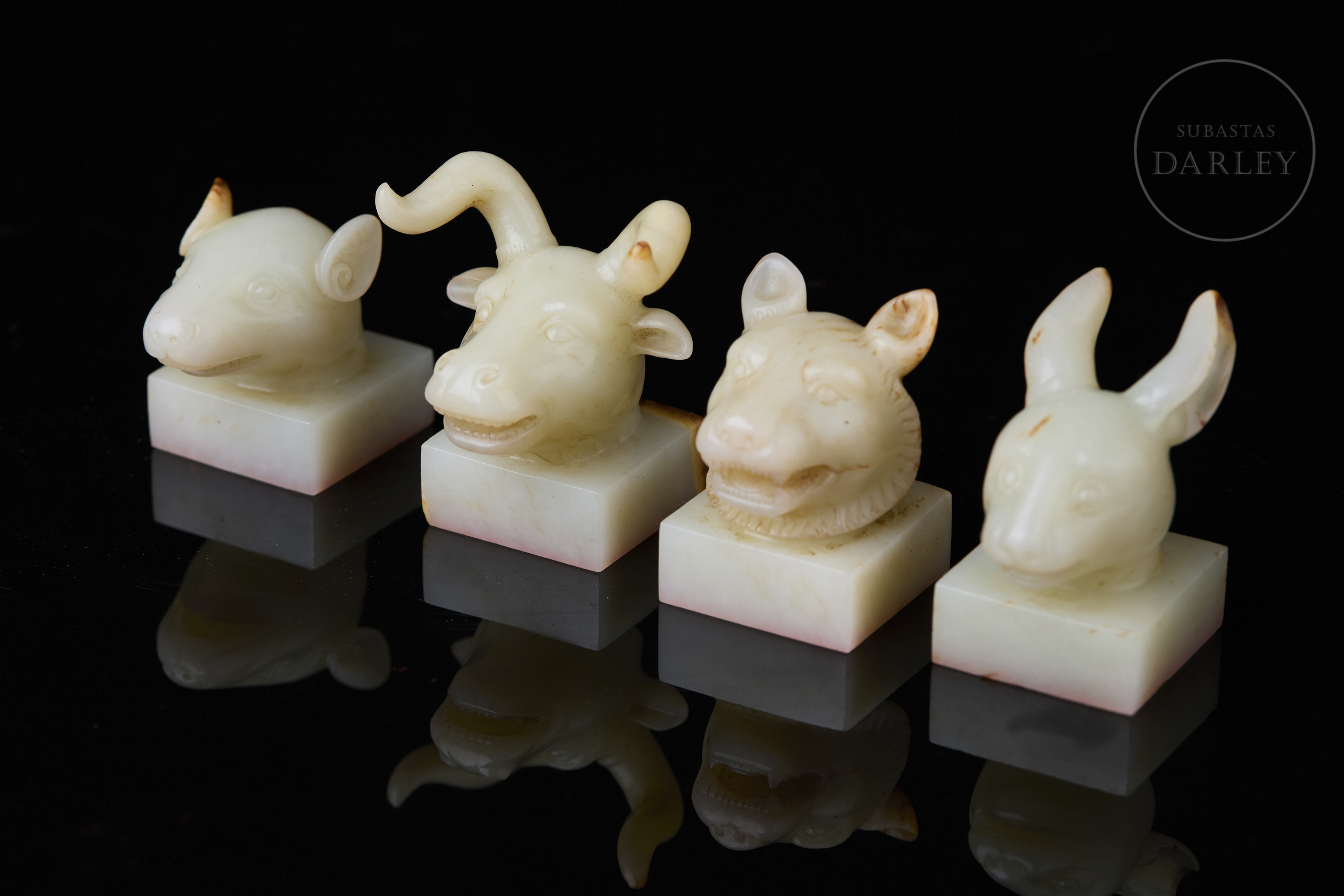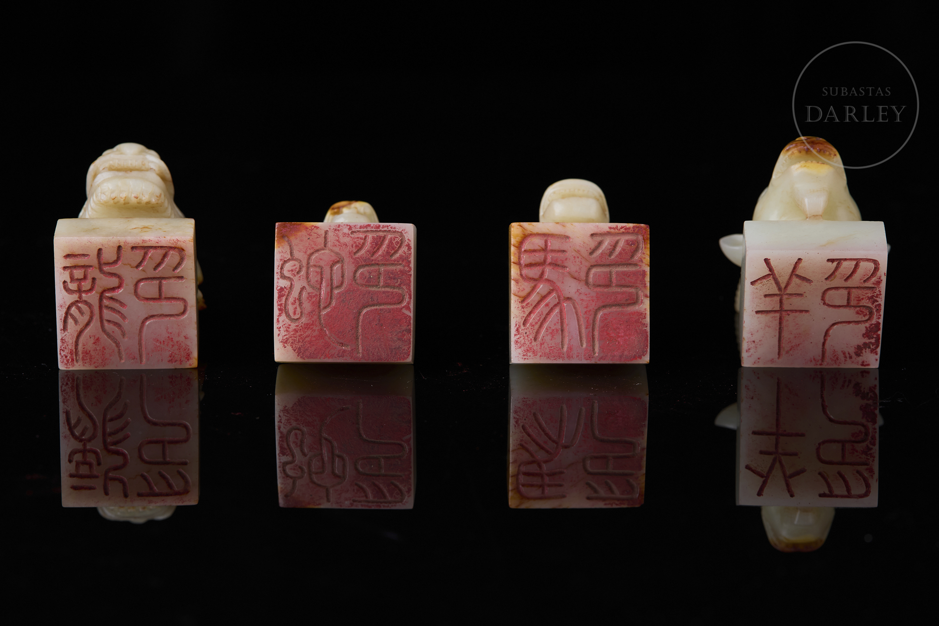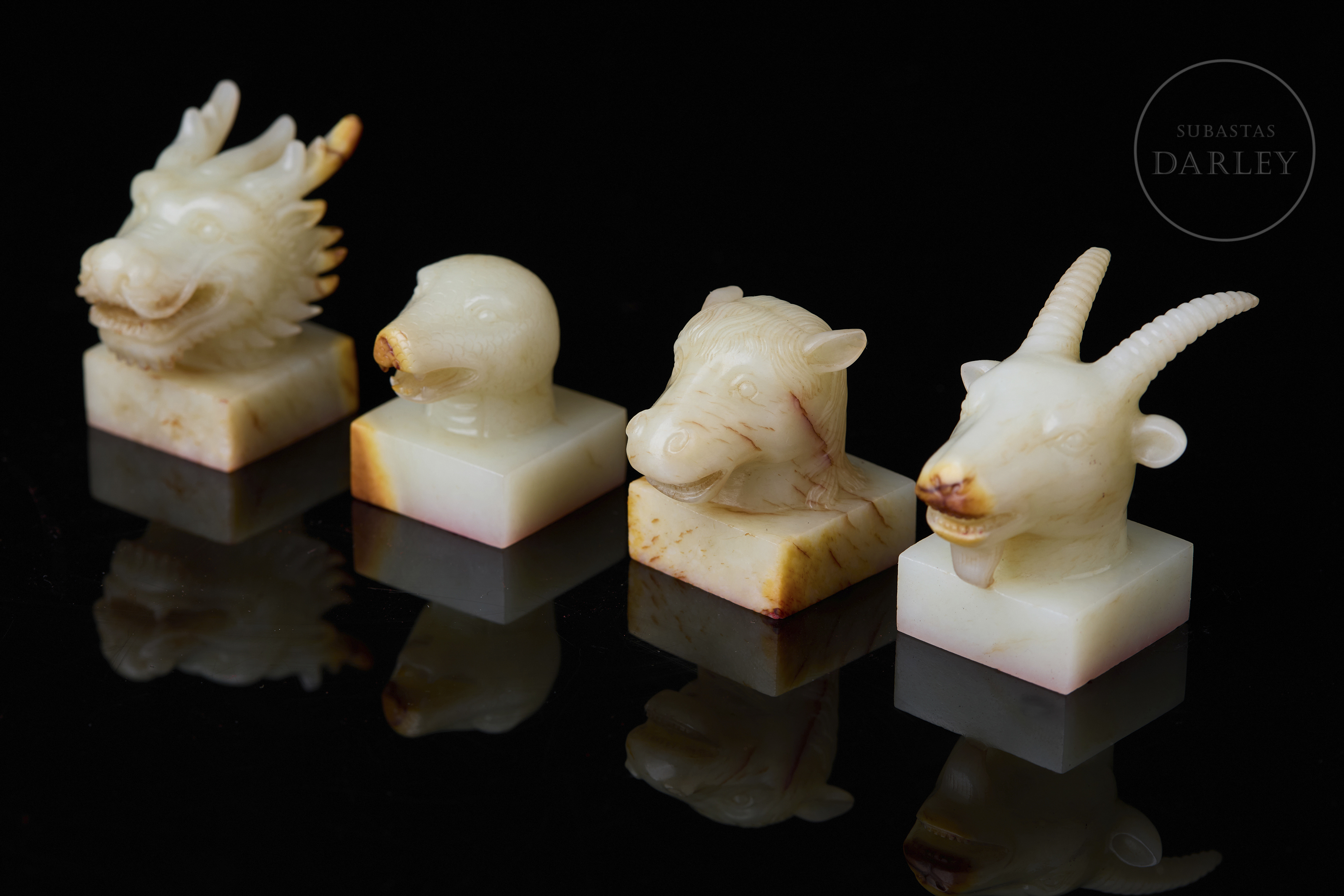 Doce sellos de jade de tonalidad blanca de gran pureza, con vetas naturales de color ocre rojizo. Cada sello está rematado por el bulto de uno de los animales del zodiaco chino (rata, buey, tigre, conejo, dragón, serpiente, caballo, cabra, mono, gallo, perro y cerdo). Las bases son de formato cuadrangular y contienen, en su cara inferior, caracteres grabados entintados en rojo cinabrio. El conjunto se presenta en su estuche original forrado en seda brocada con motivos tradicionales. Dinastía Qing (1644–1912).