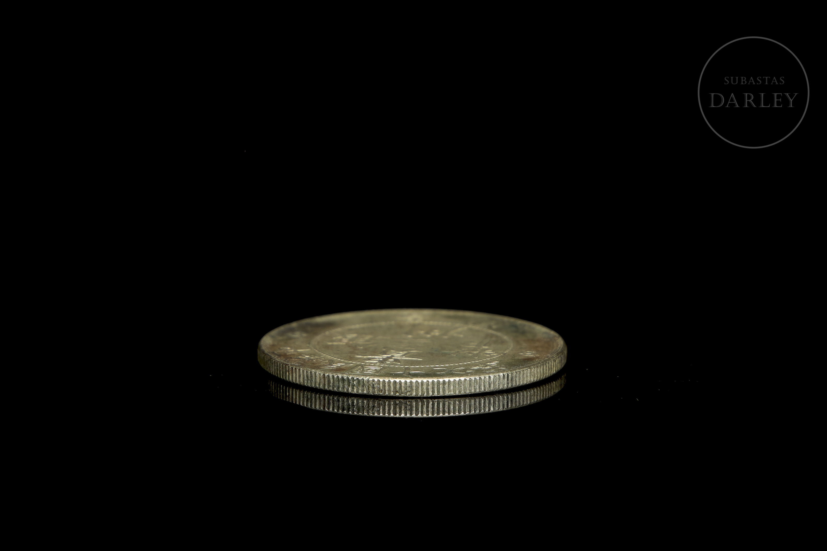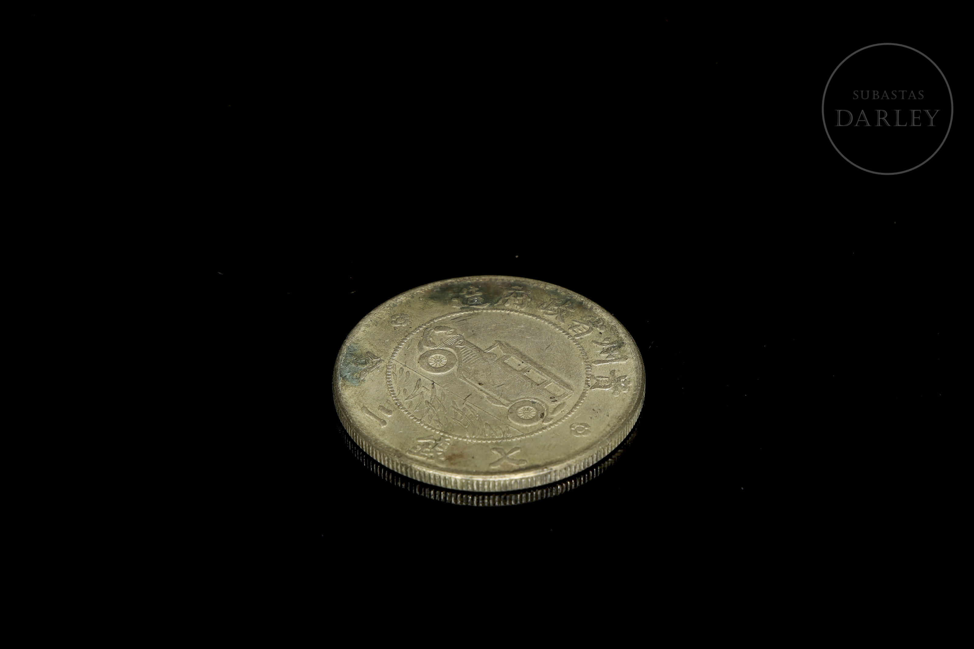 Realizada en plata. El anverso presenta un diseño de un automóvil de estilo americano, posiblemente un modelo Buick, circulando sobre un campo de hierba alta estilizada. El reverso contiene caracteres caligráficos centrales rodeados por una gráfila perlada, que indican la procedencia provincial y su valor nominal, flanqueados por dos flores de ciruelo en los laterales. La pieza destaca por su rareza iconográfica y su gran valor numismático, conservando una legibilidad clara en sus inscripciones y el relieve característico del vehículo.