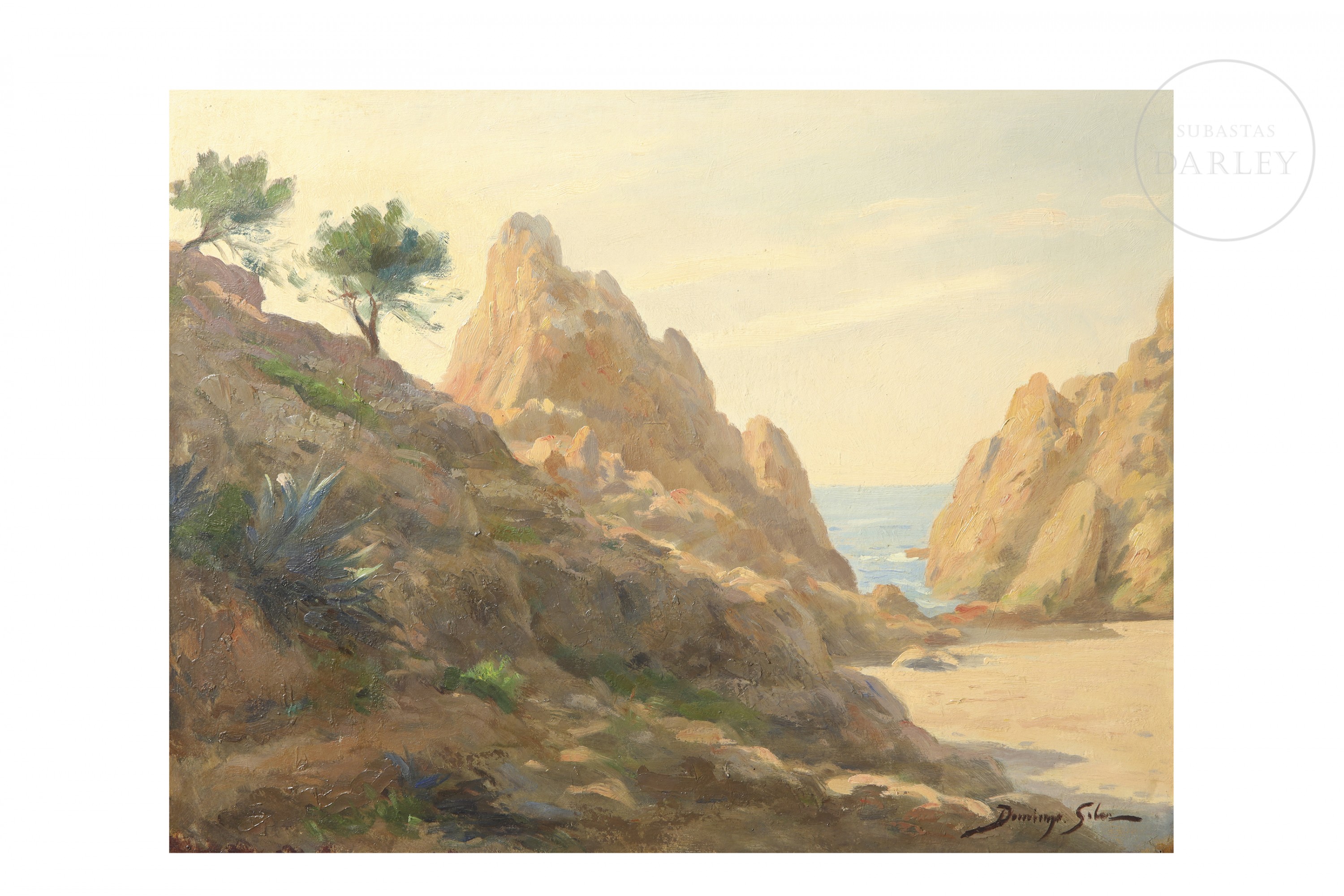 Óleo sobre DM. Marina que representa una cala rocosa de la costa mediterránea. Firmado "Domingo Soler" en la esquina inferior derecha.