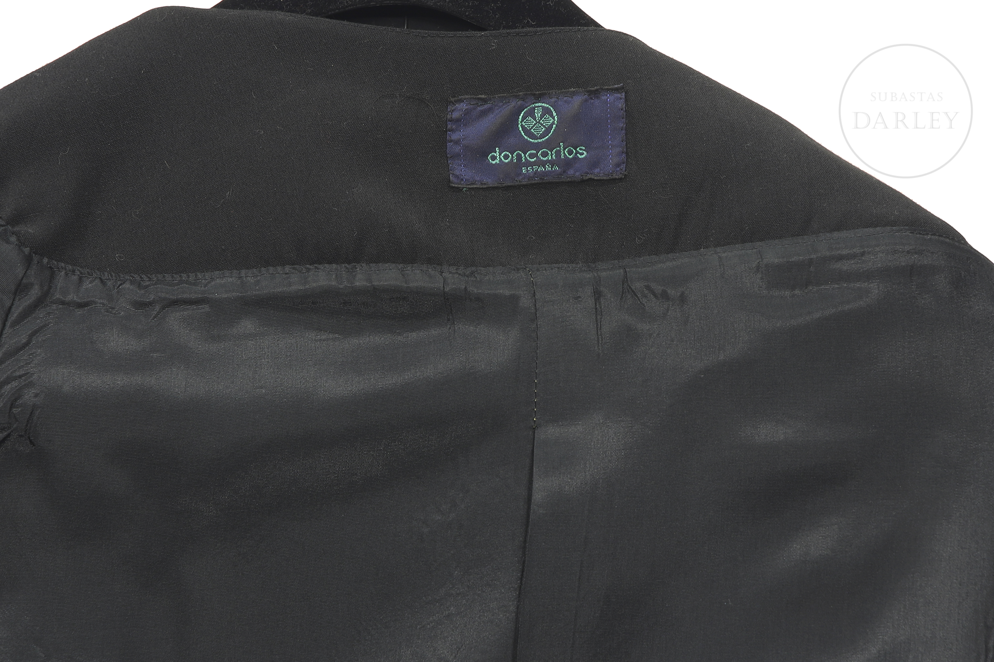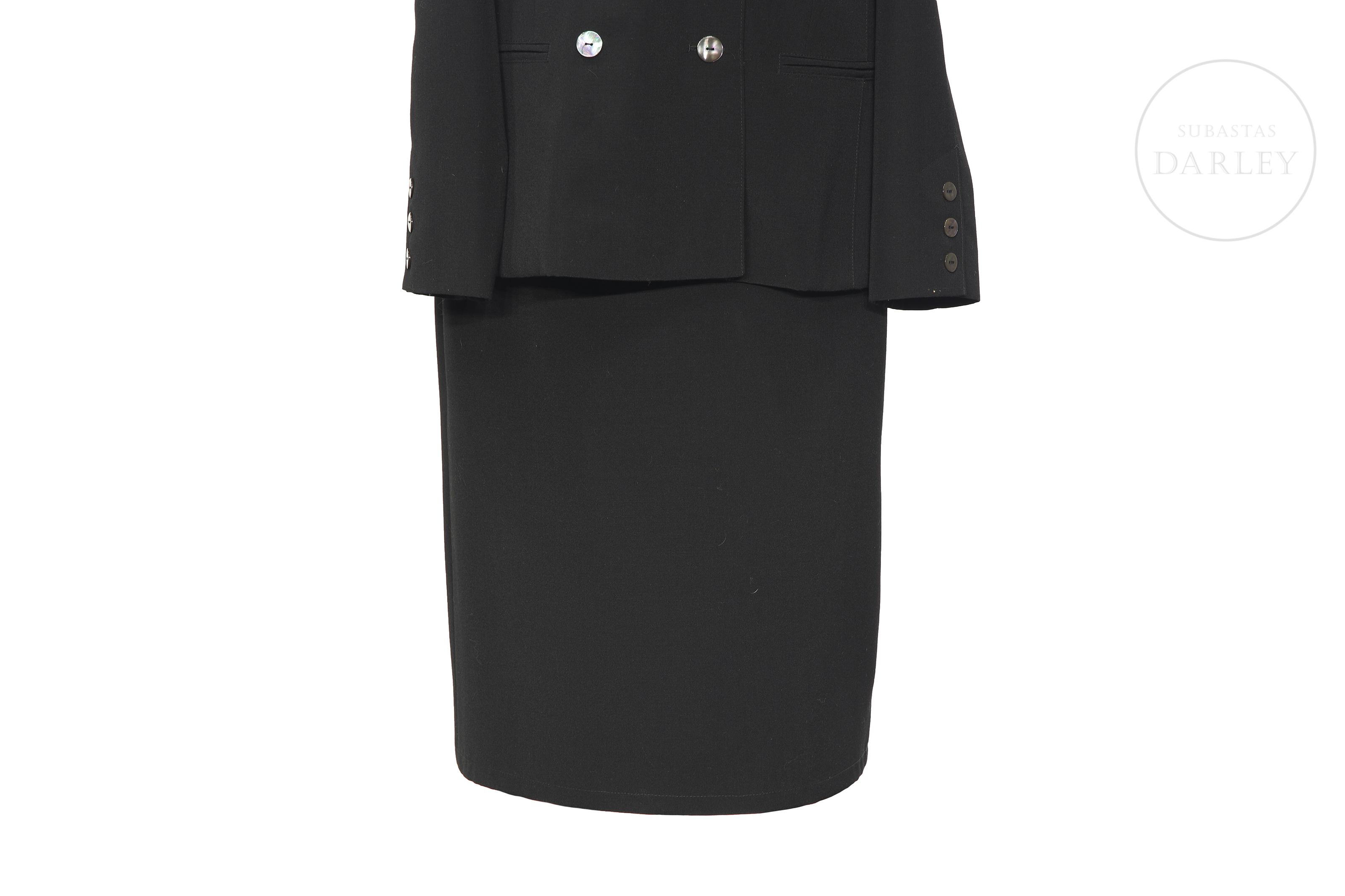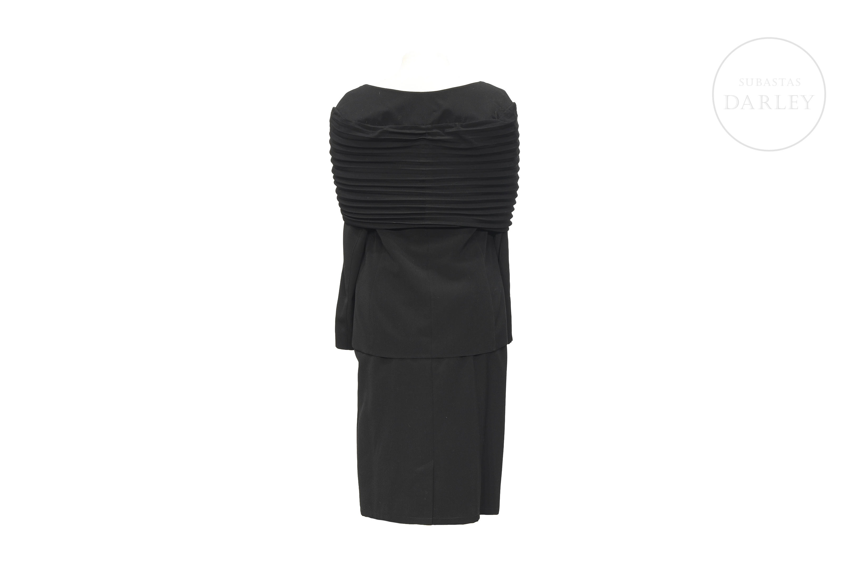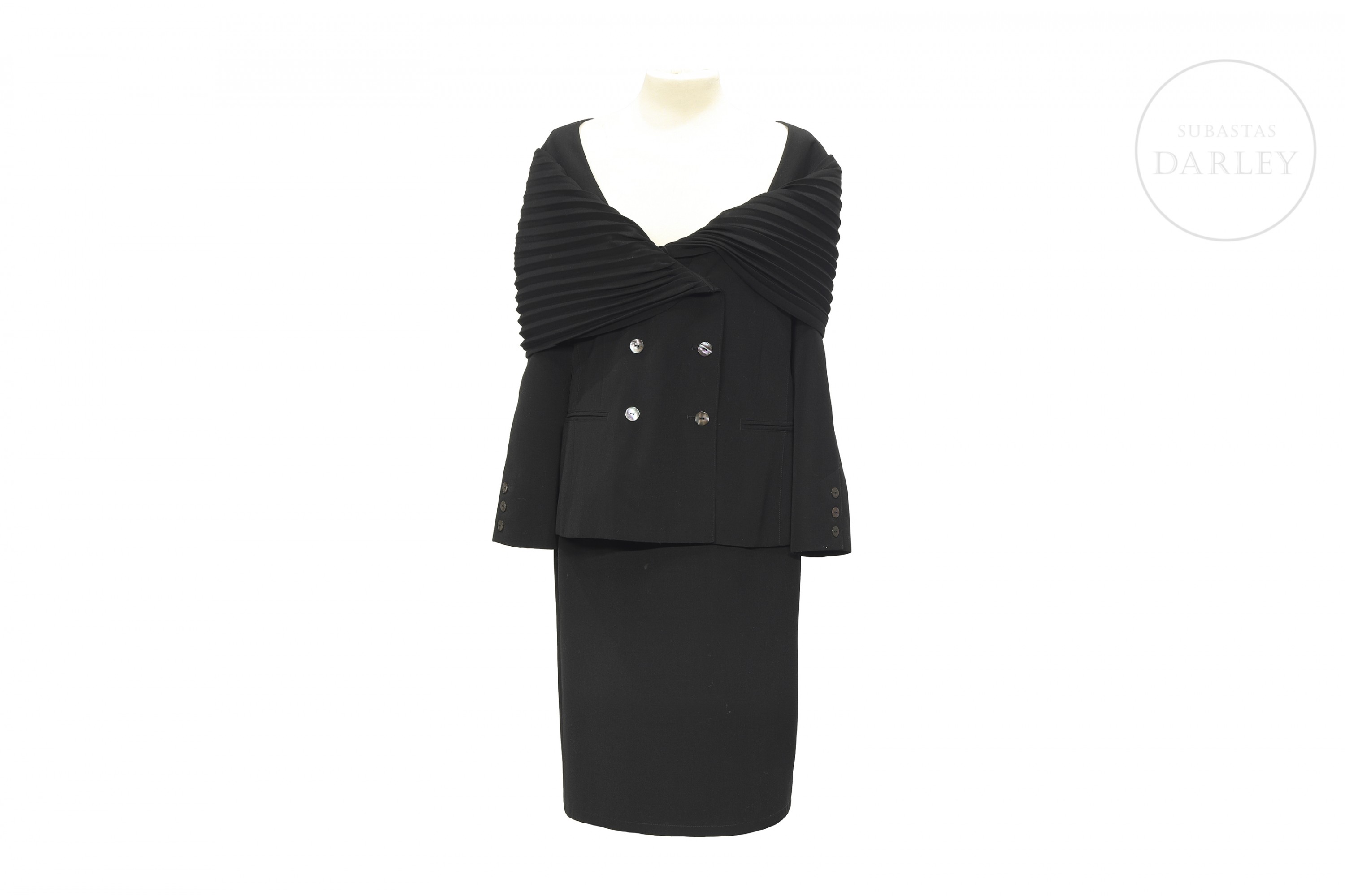 Conjunto compuesto por chaqueta y falda en color negro. La chaqueta destaca por doble botonadura con botones nacarados y un amplio drapeado plisado que envuelve los hombros. Etiqueta "doncarlos ESPAÑA" en el interior.
