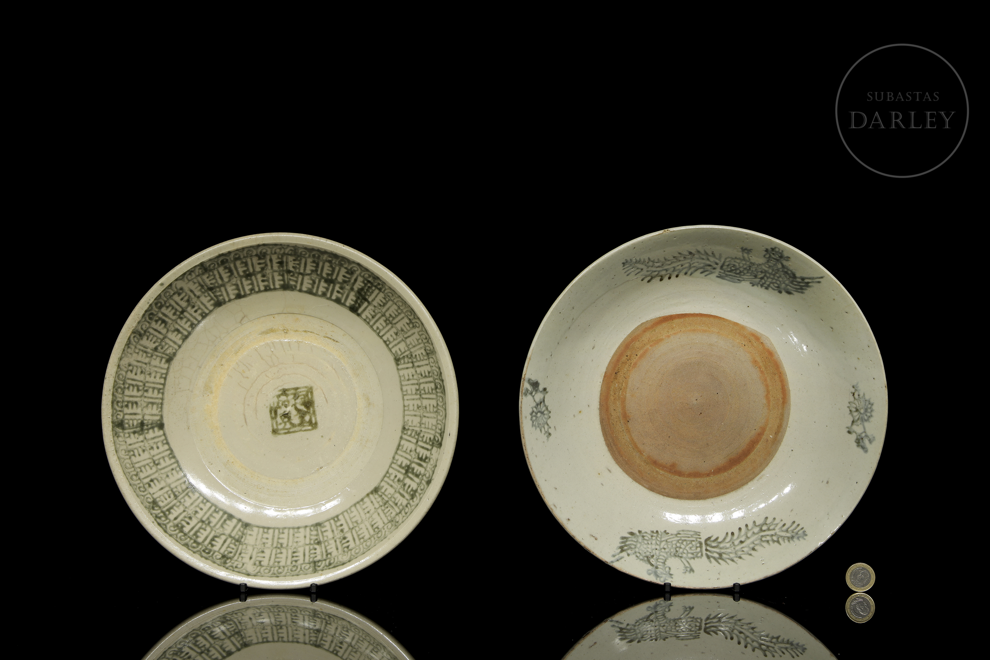 Cerámica esmaltada con decoración bajo vidriado en blanco, azul y verde. Poseen un cuerpo circular y paredes ligeramente acampanadas, asentados sobre un pequeño pie anular. Están decorados, uno de ellos, con un motivo de aves Fénix y flores, y el otro, con cenefas de patrones geométricos. Dinastía Qing (1644-1912).