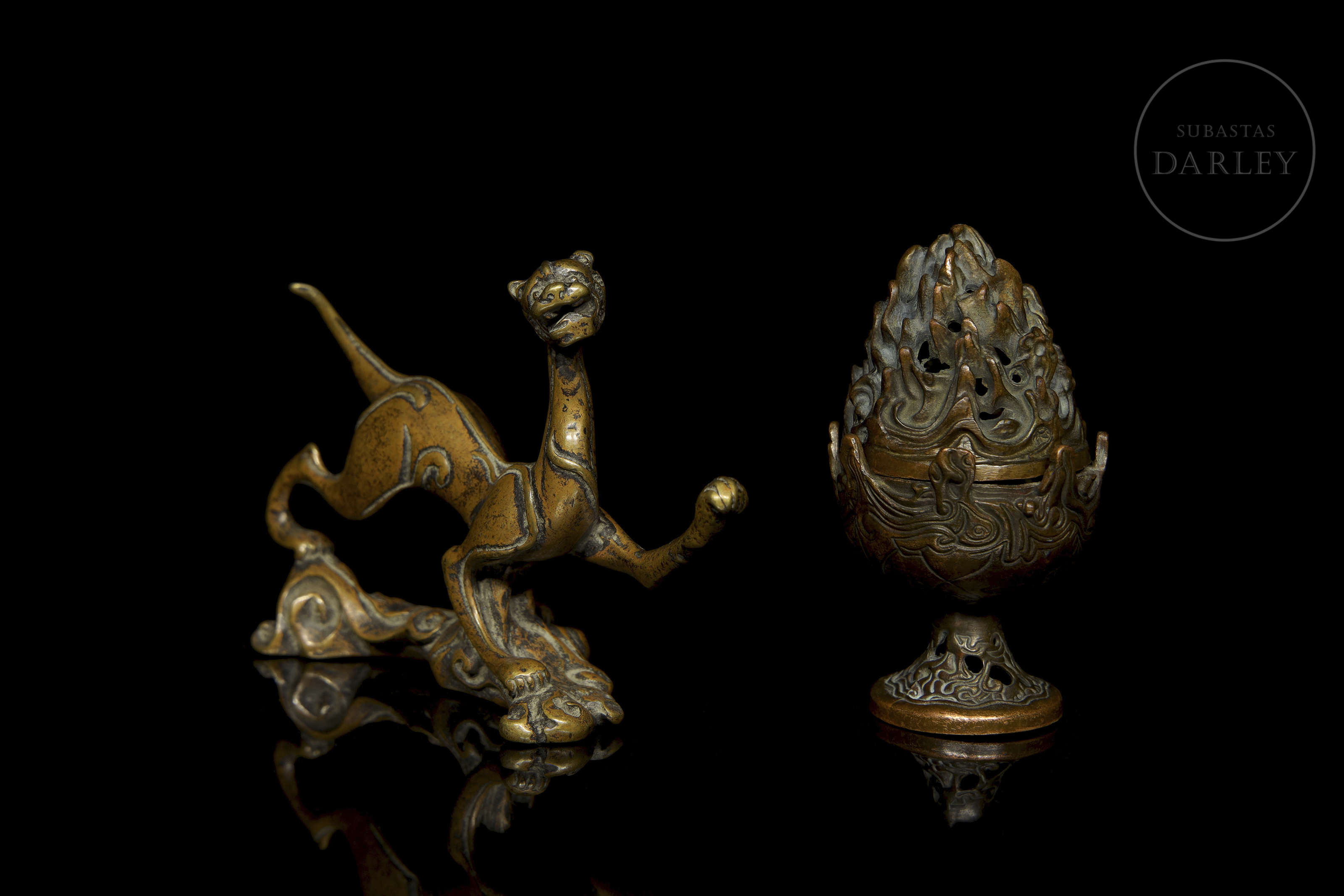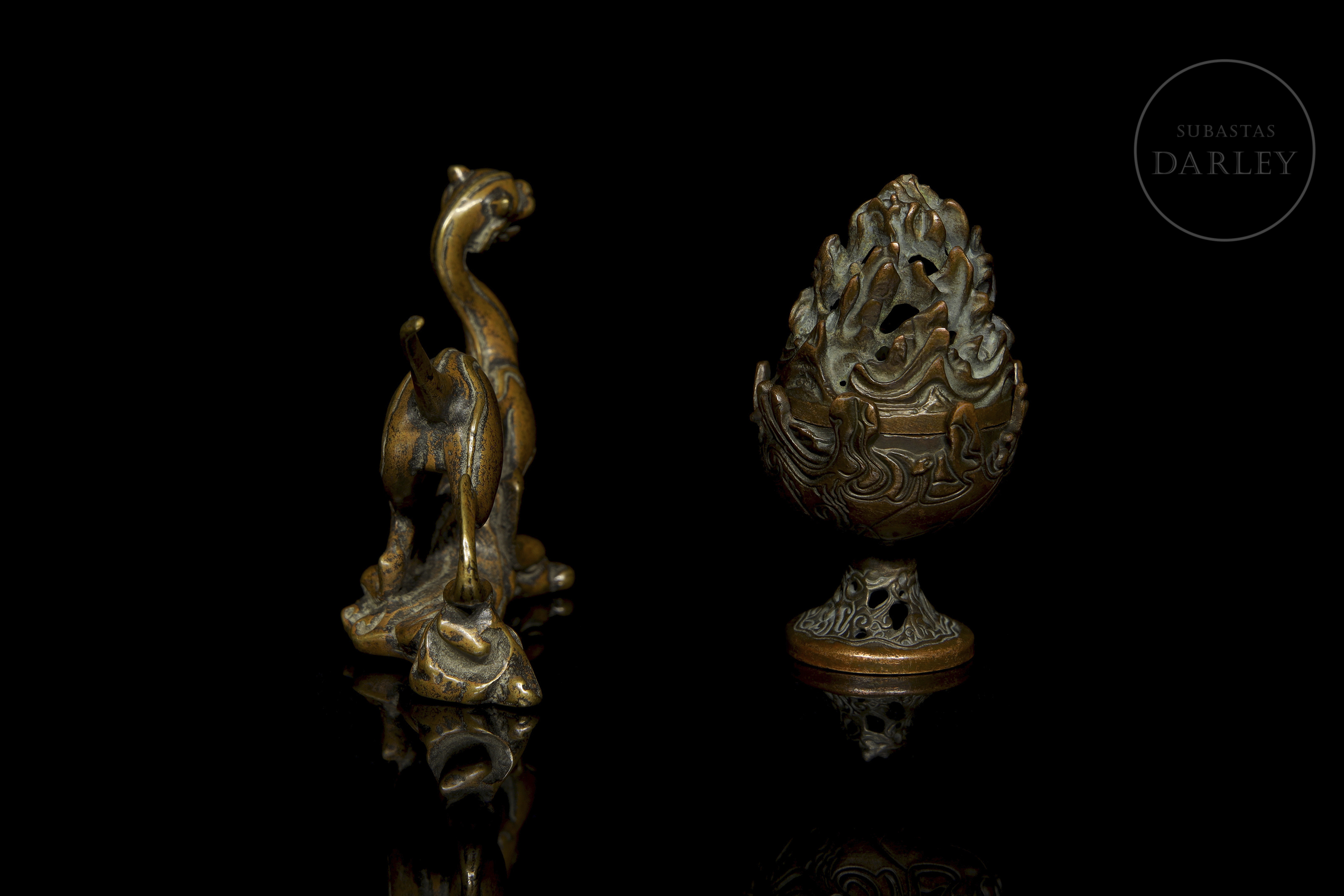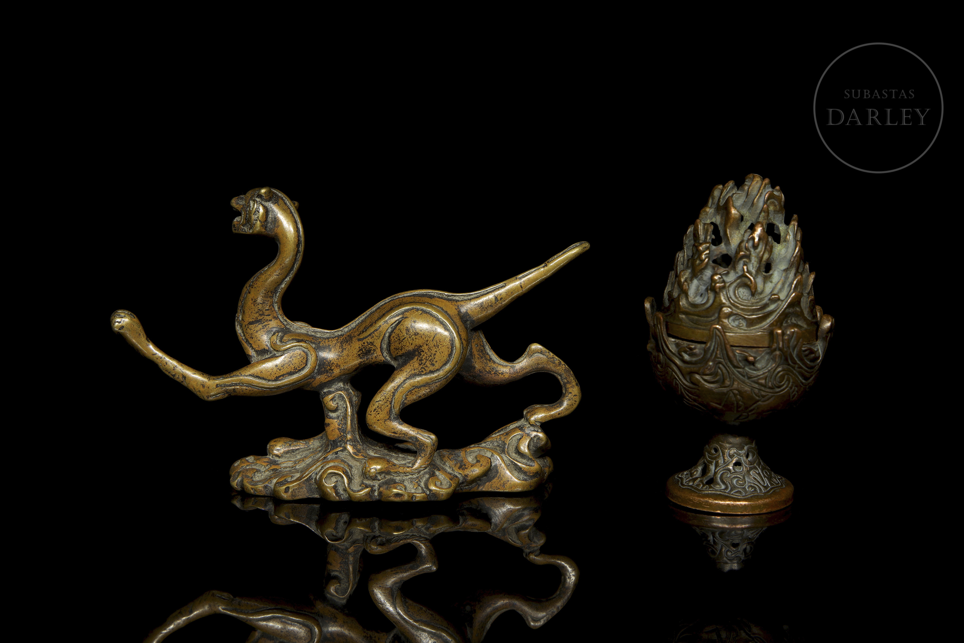 La primera pieza es una figura zoomorfa muy estilizada y alargada, que se yergue sobre tres de sus patas en una base irregular de roleos. La segunda pieza es un pequeño incensario, con cuerpo en forma de cáliz y tapa apuntada con motivo de olas caladas y entrelazadas.