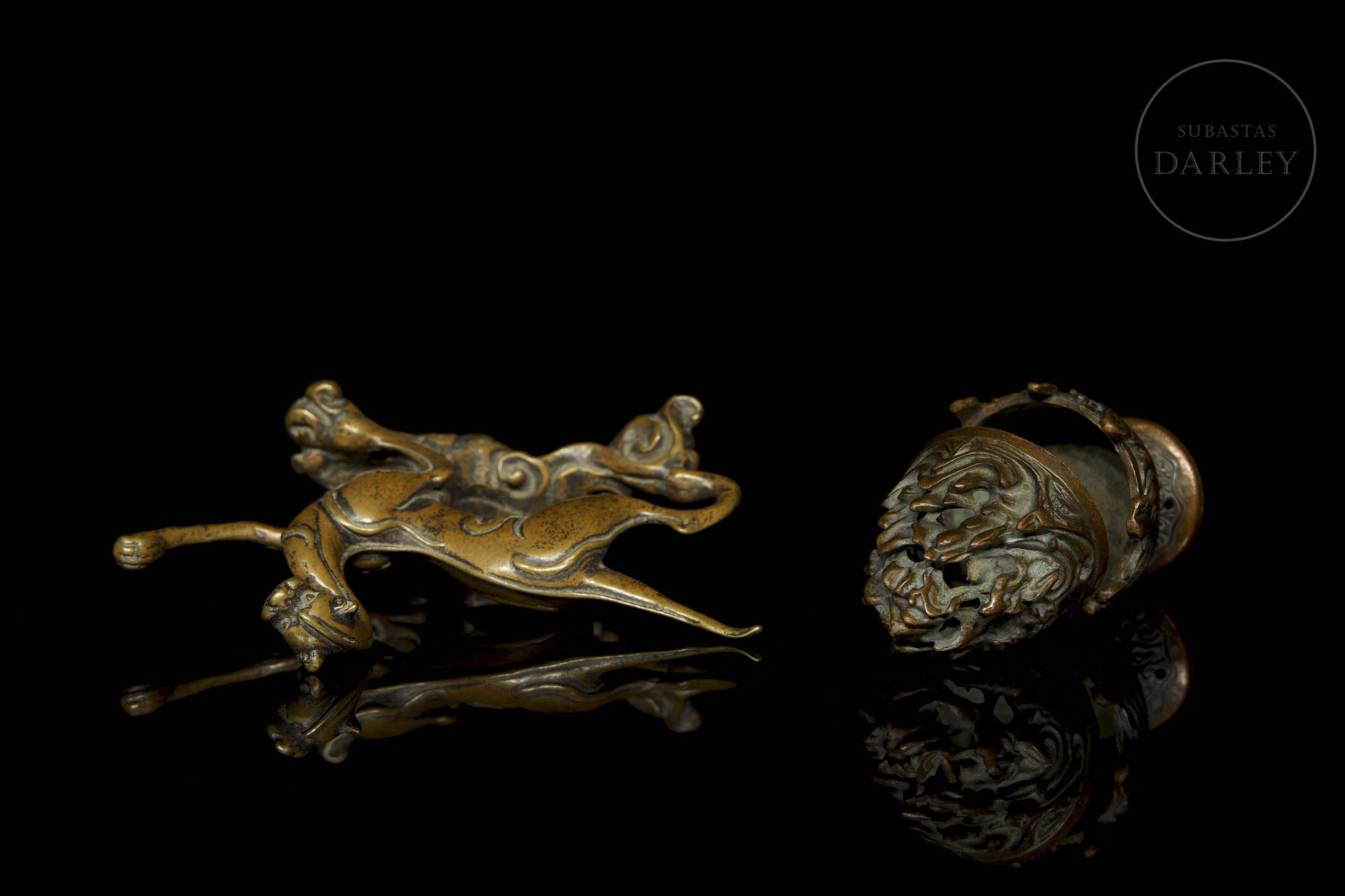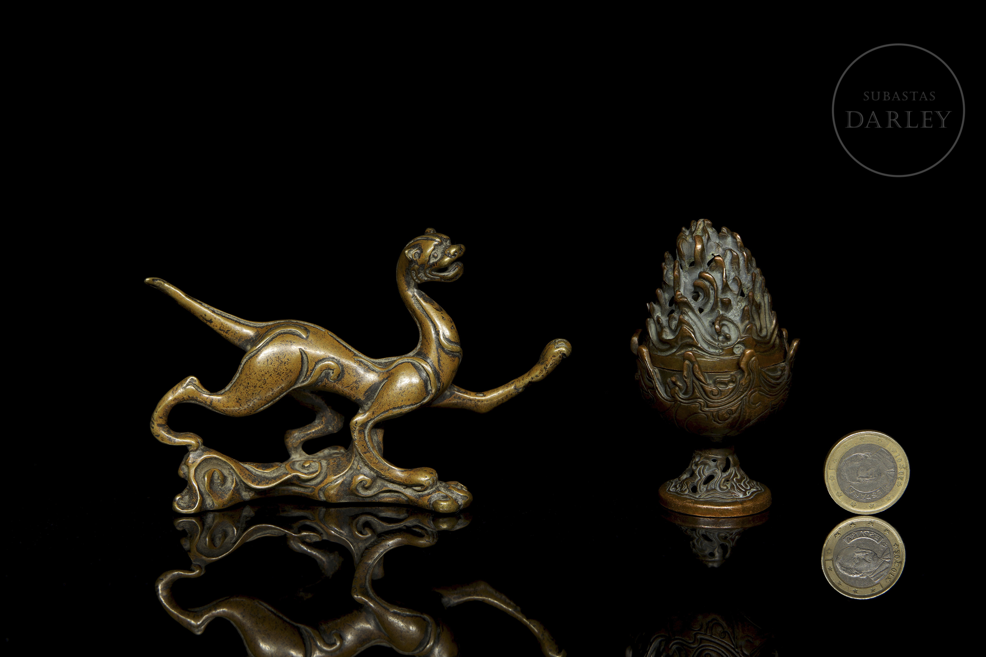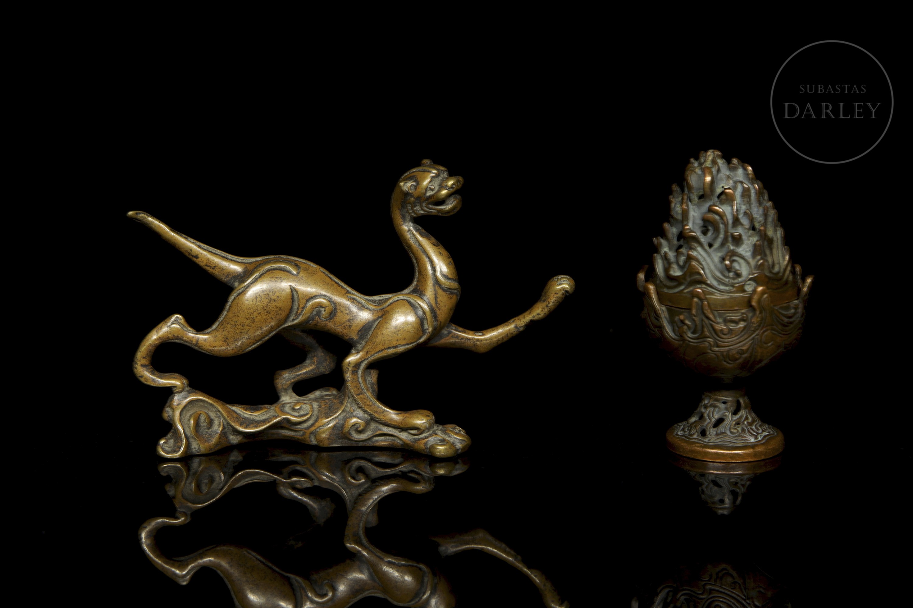 La primera pieza es una figura zoomorfa muy estilizada y alargada, que se yergue sobre tres de sus patas en una base irregular de roleos. La segunda pieza es un pequeño incensario, con cuerpo en forma de cáliz y tapa apuntada con motivo de olas caladas y entrelazadas.