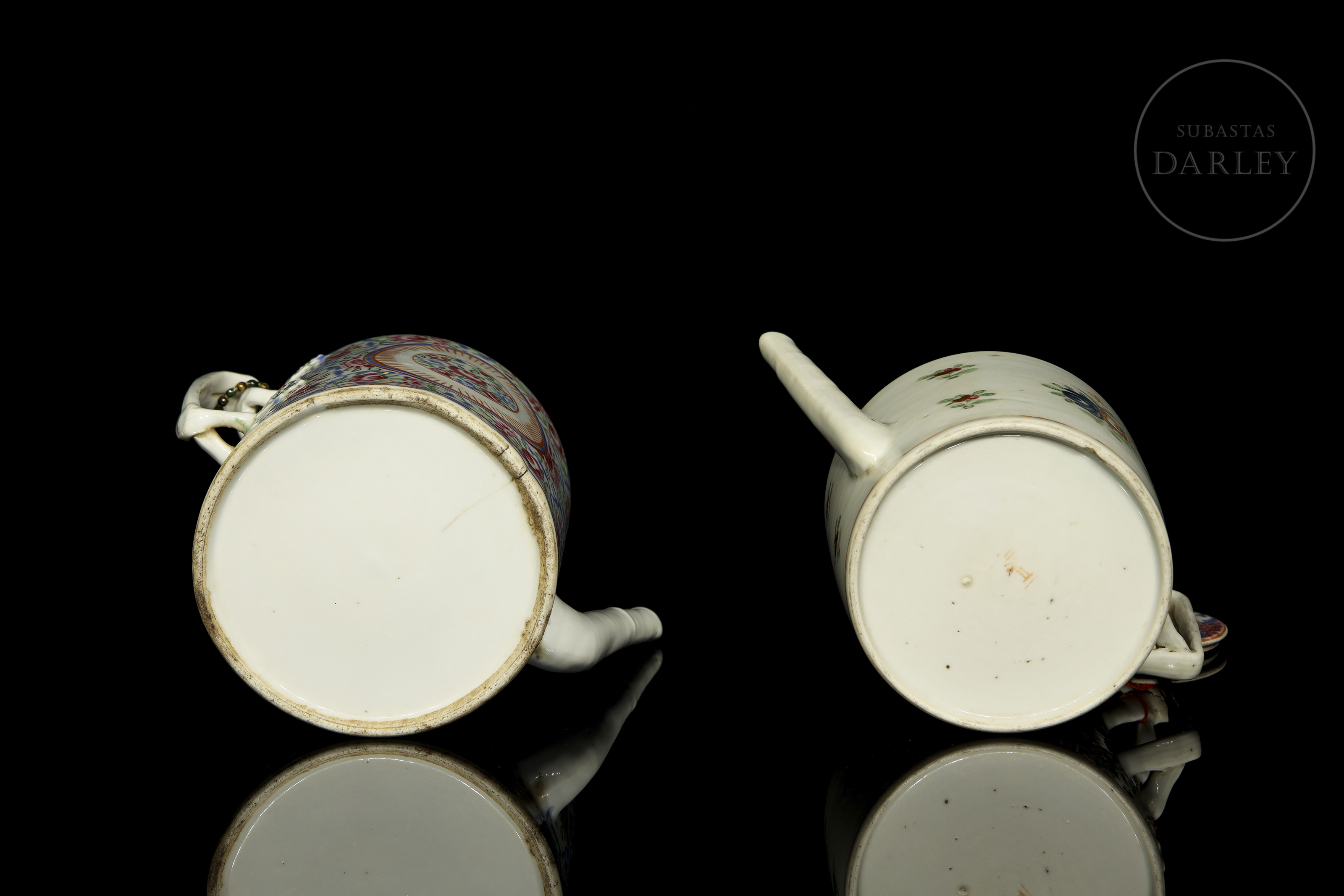 Porcelana esmaltada con decoración sobre vidriado en blanco y esmaltes policromados "Familia Rosa" Poseen un cuerpo cilíndrico con asas de oreja y picos alargados. Están decoradas con motivos florales densos y continuos. Dinastía Qing (1644-1912).