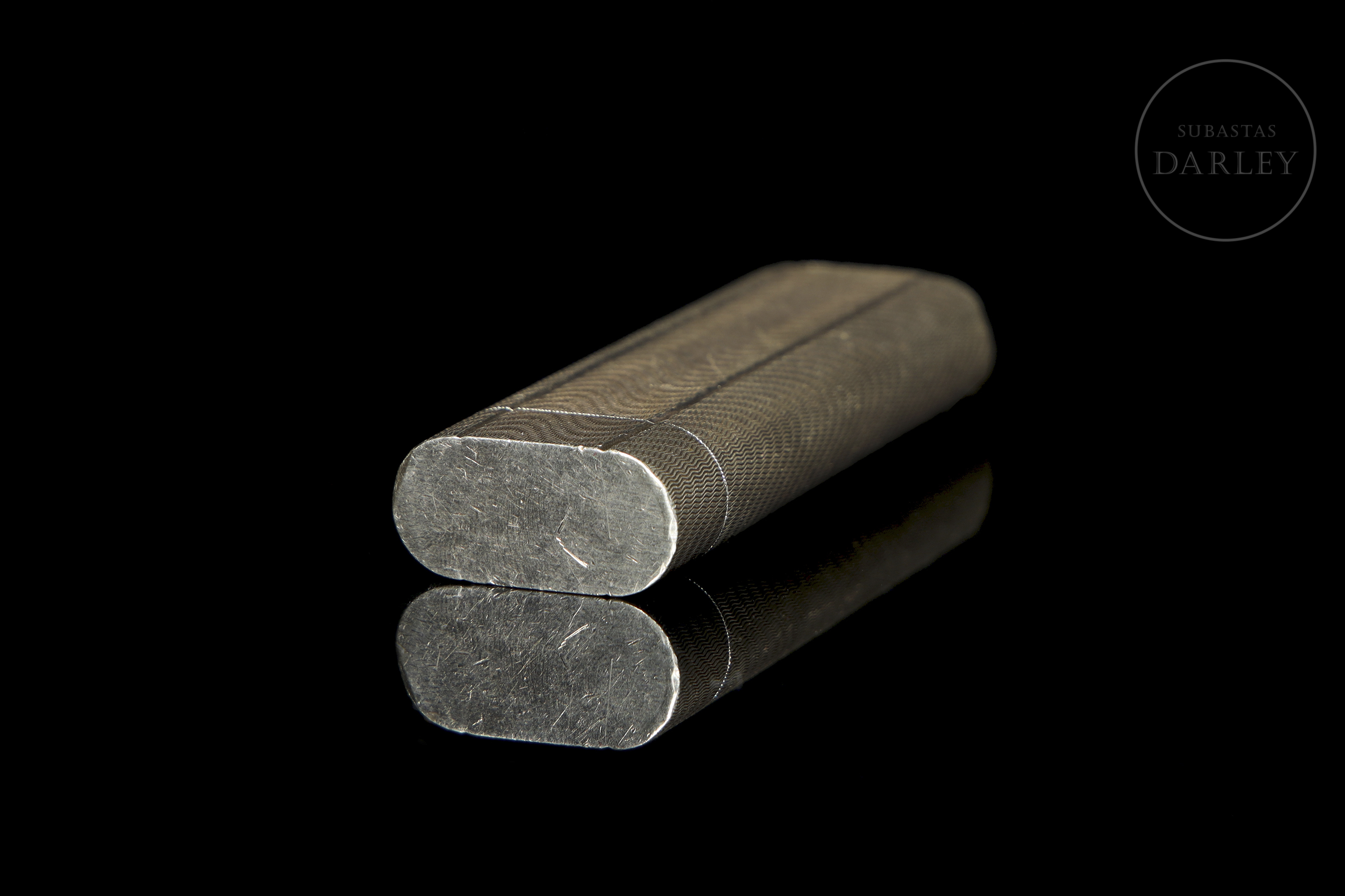 Encendedor de bolsillo de estilo Art Déco, de caja rectangular con detalles repujados, chapado en plata. Con bolsa de terciopelo original. En funcionamiento.