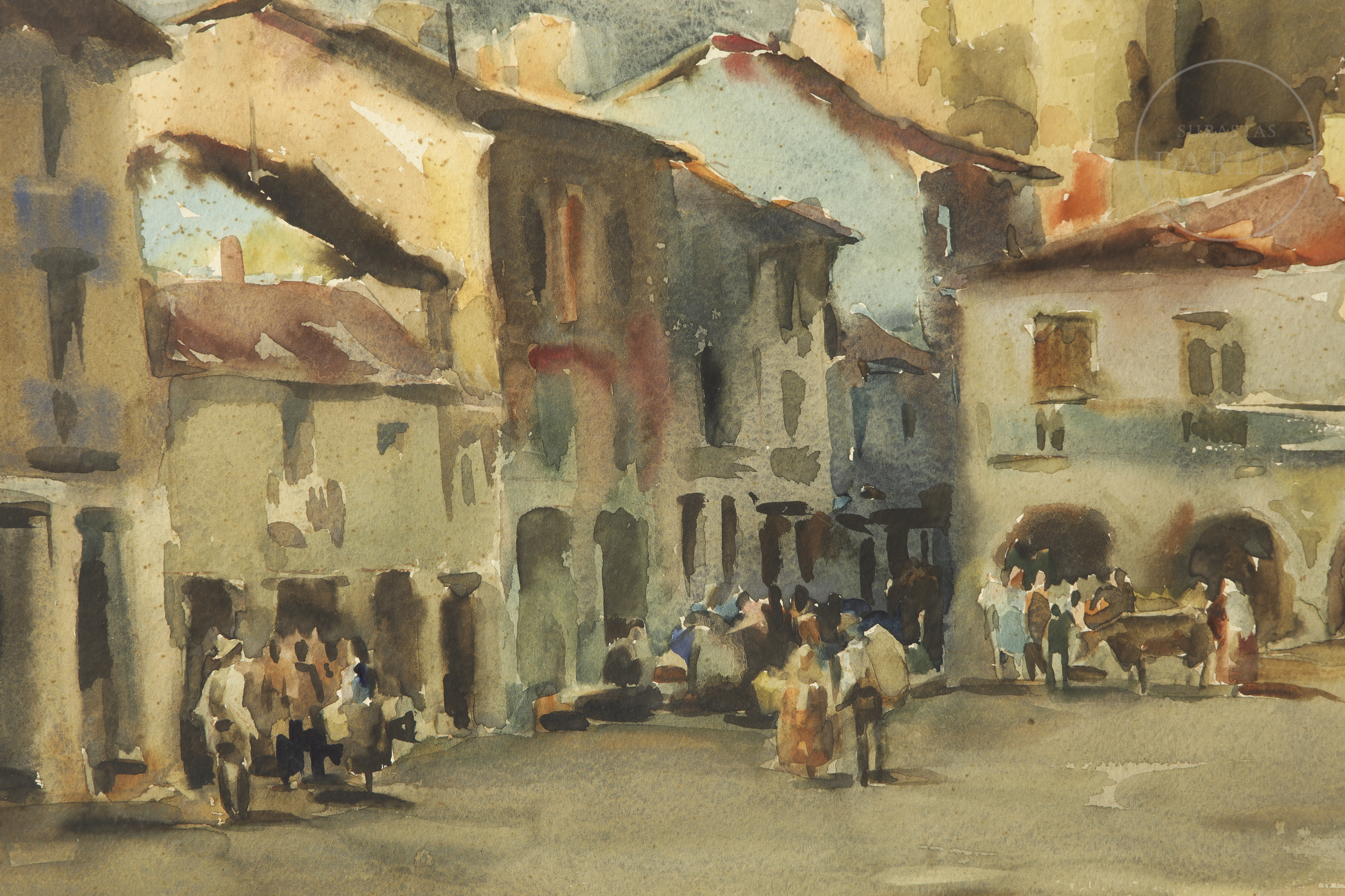 Acuarela sobre papel. Composición paisajística que muestra una plaza con figuras, dominada al fondo por la silueta monumental de una iglesia. Firmada y fechada "E. Furió/1963" en el ángulo inferior derecho.