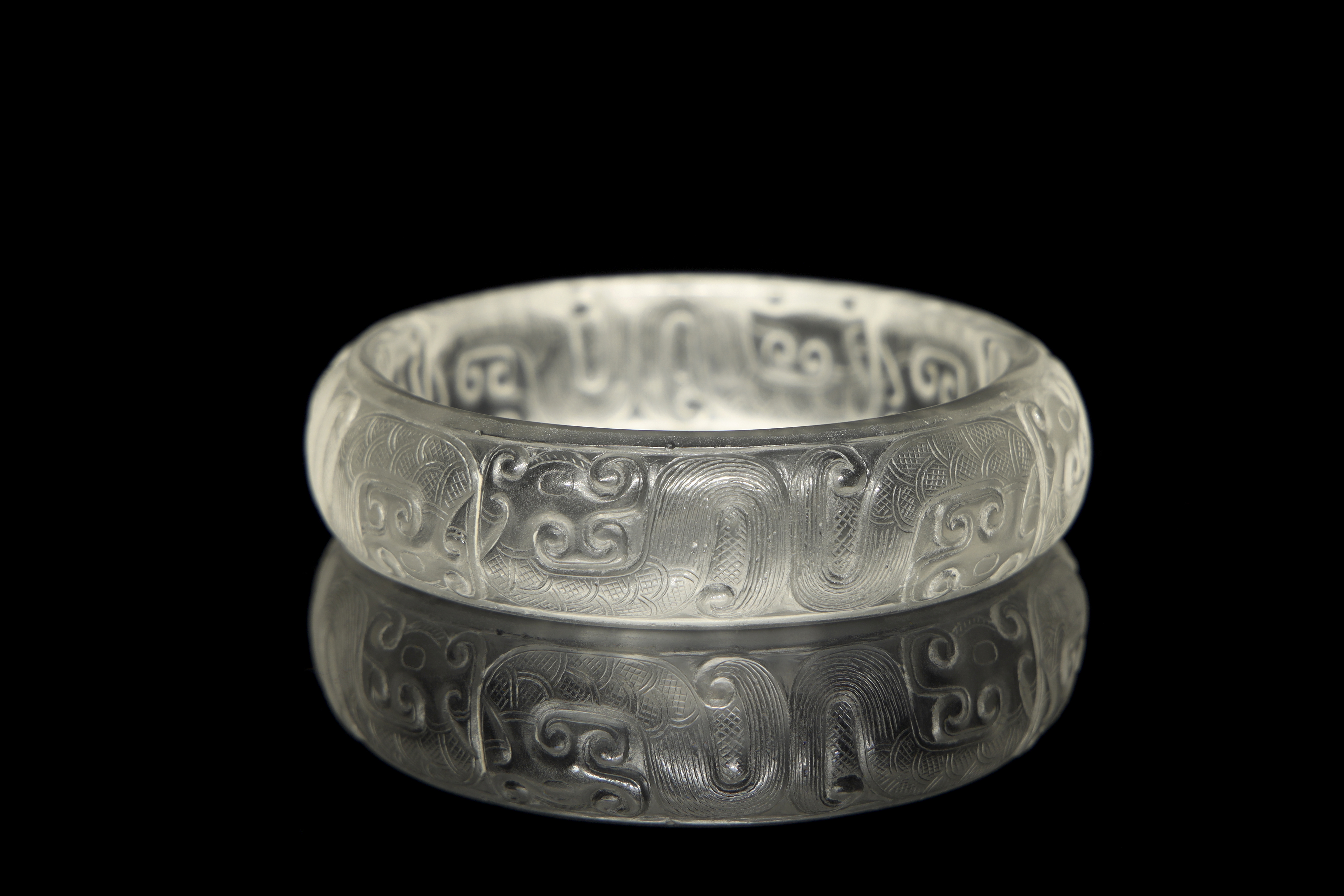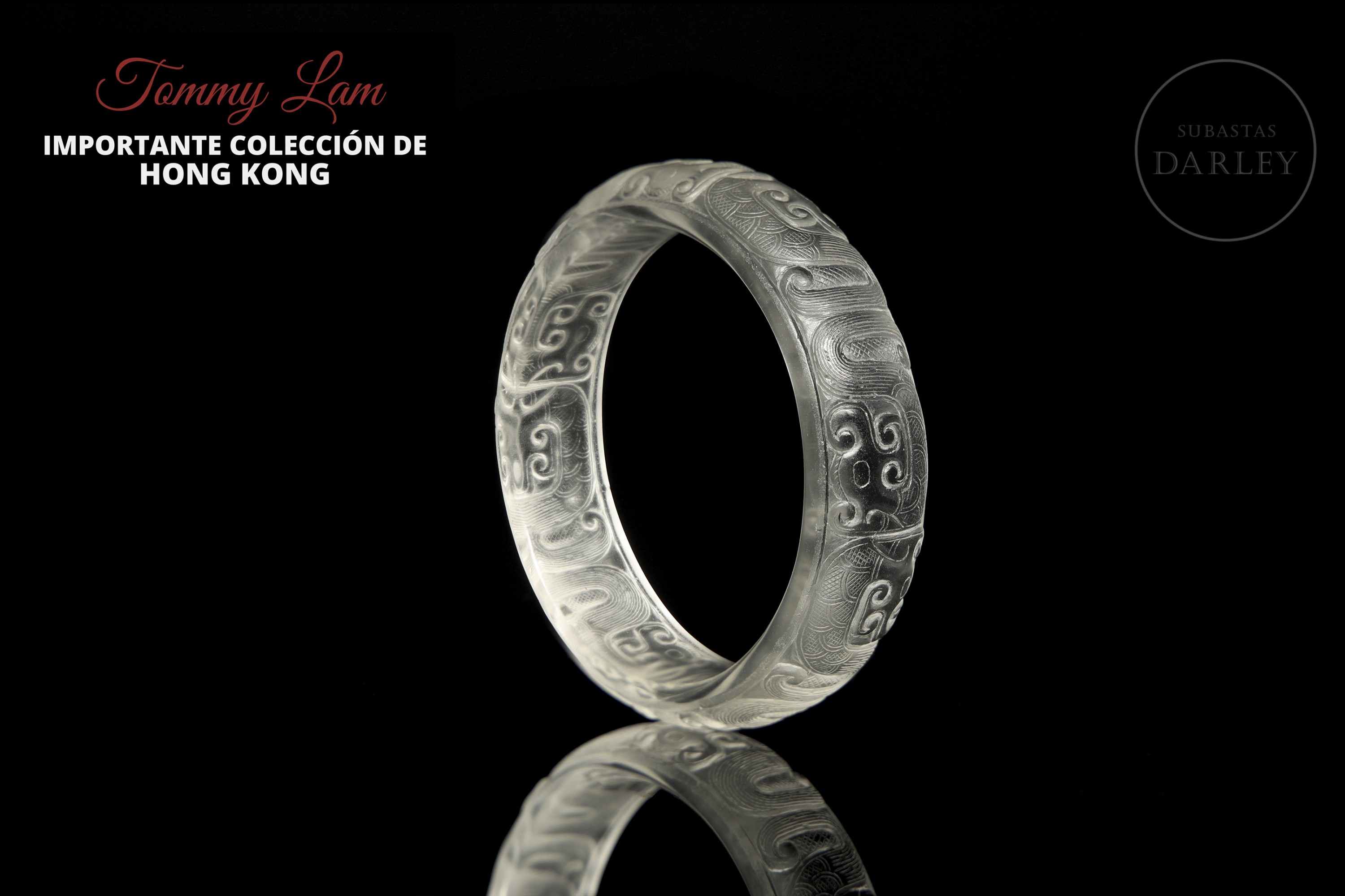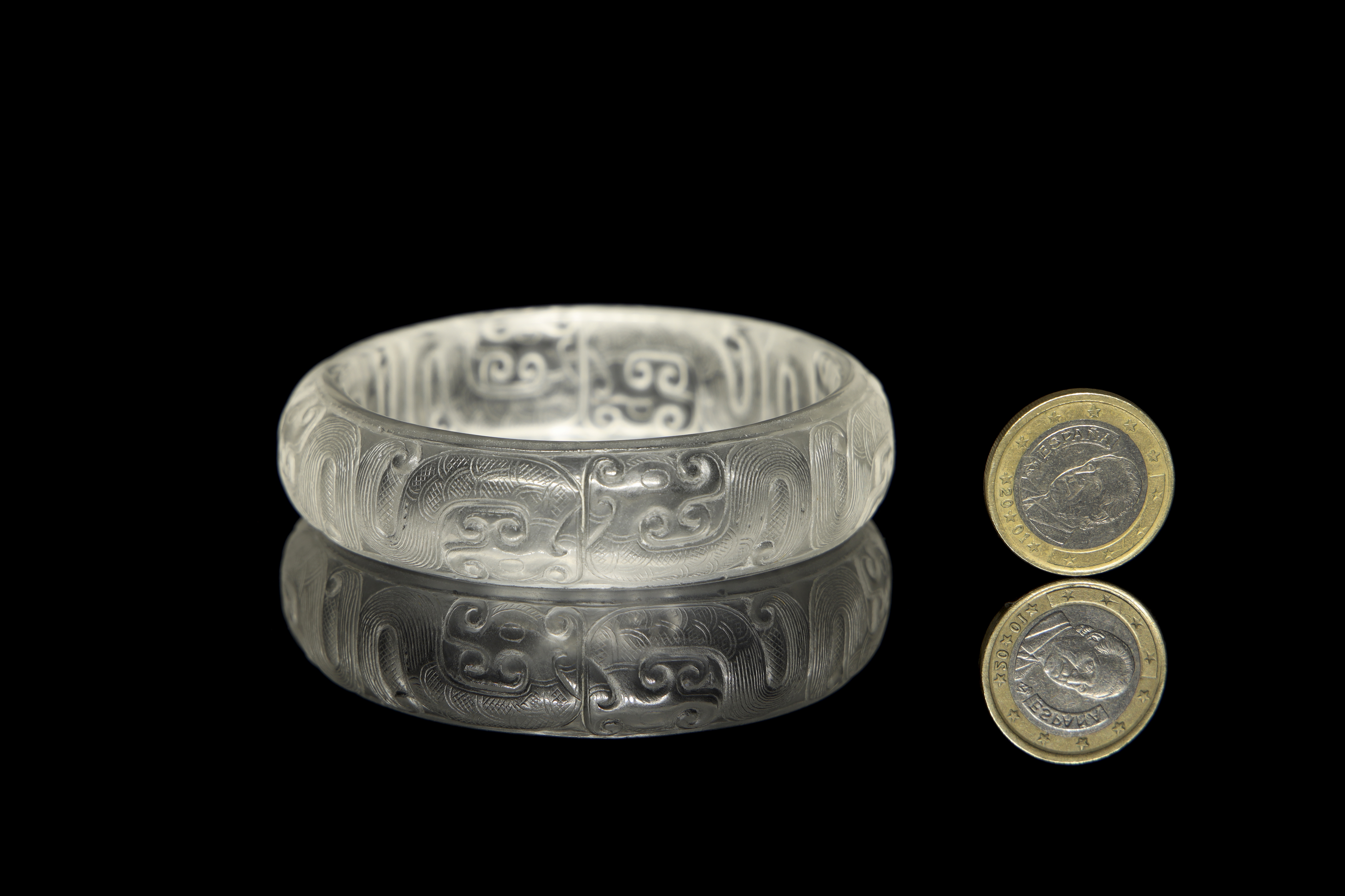 Brazalete rígido tallado en un solo bloque de cuarzo natural de gran pureza y transparencia. Toda la superficie exterior está magistralmente decorada con una fina y densa talla incisa (yinsidiao) que representa una sucesión de dragones arcaicos, de cuerpo estilizado, expresión feroz y torso escamados. Periodo Reinos combatientes (403 - 222 a.C) o posterior.