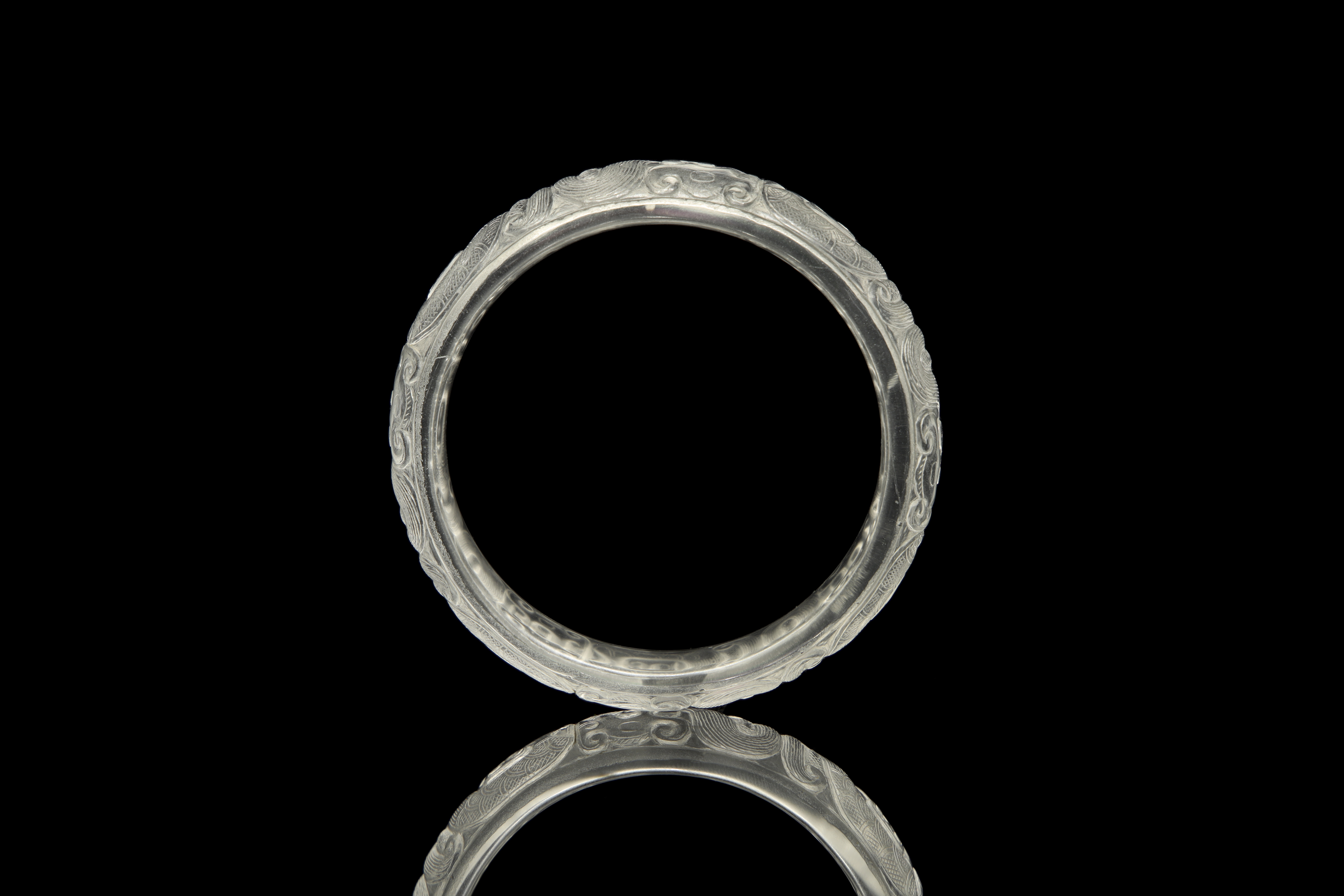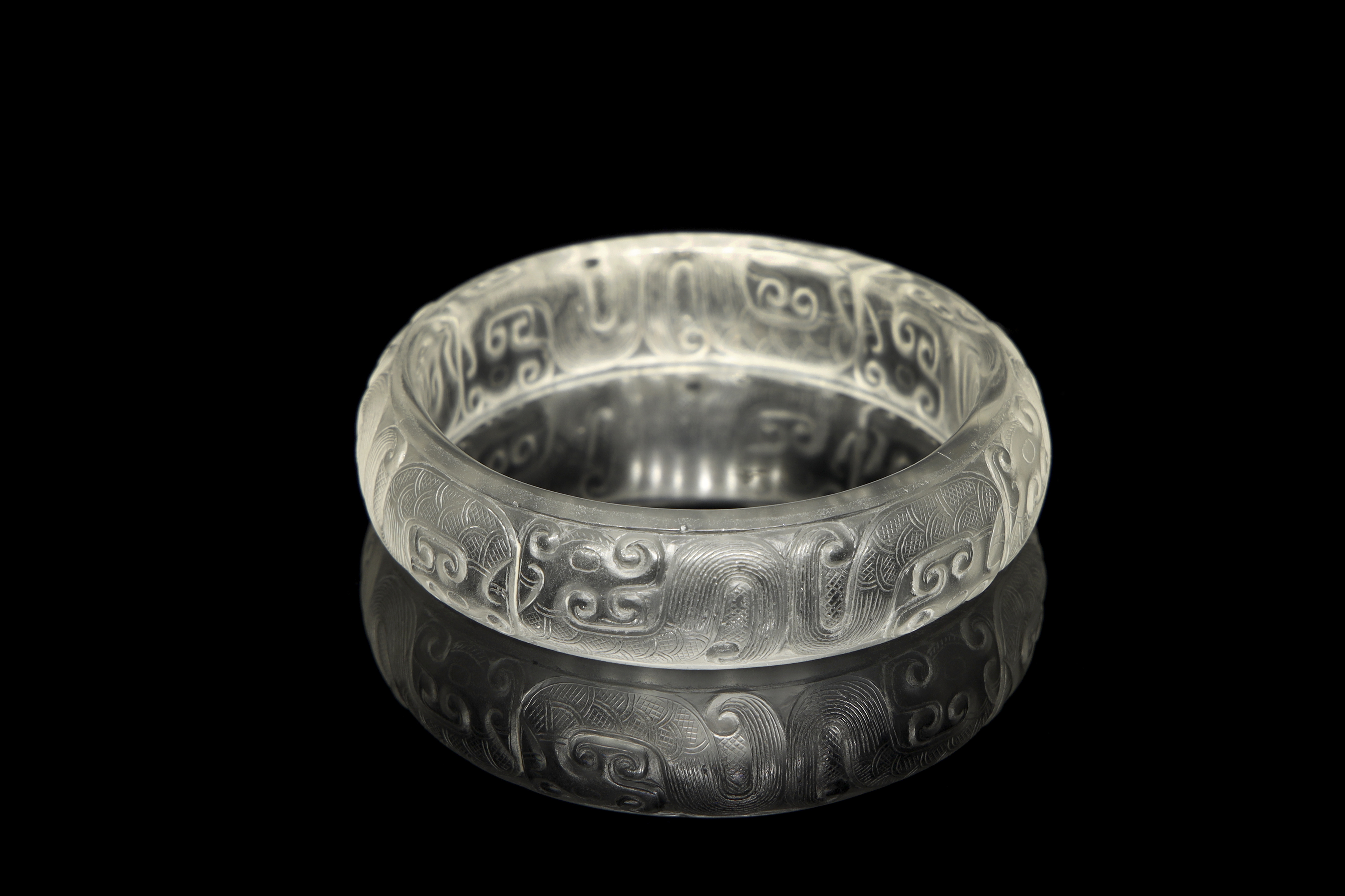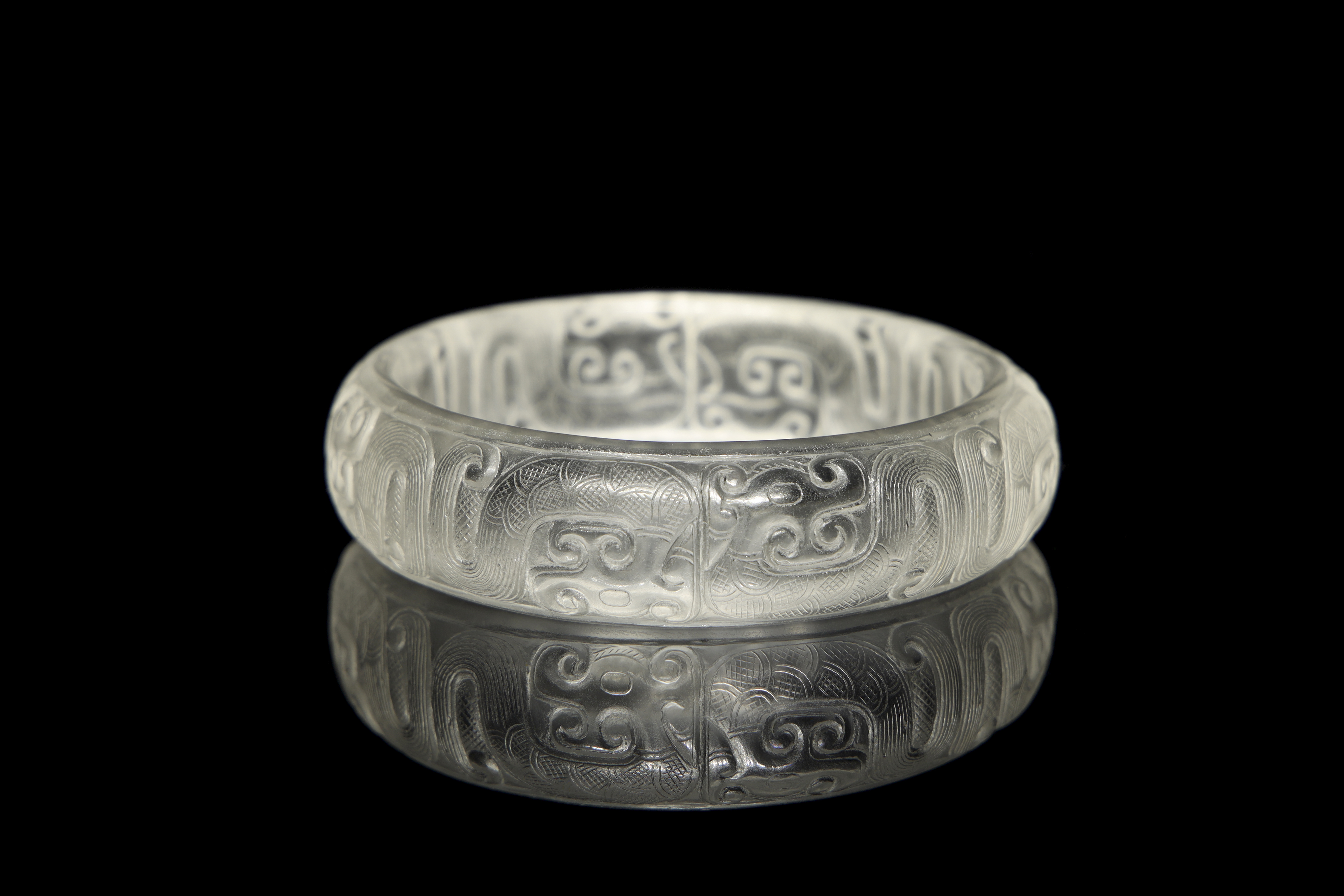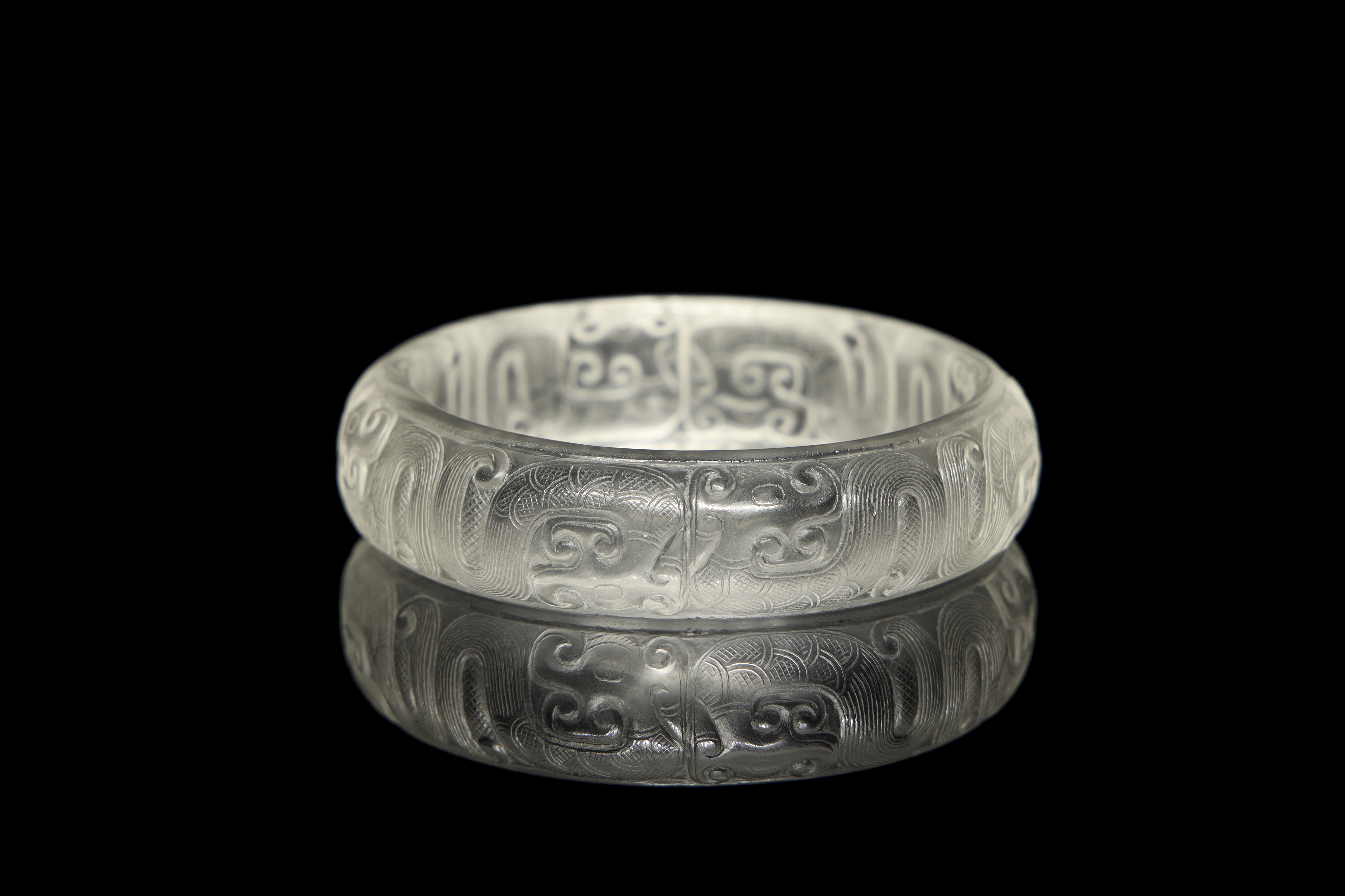 Brazalete rígido tallado en un solo bloque de cuarzo natural de gran pureza y transparencia. Toda la superficie exterior está magistralmente decorada con una fina y densa talla incisa (yinsidiao) que representa una sucesión de dragones arcaicos, de cuerpo estilizado, expresión feroz y torso escamados. Periodo Reinos combatientes (403 - 222 a.C) o posterior.