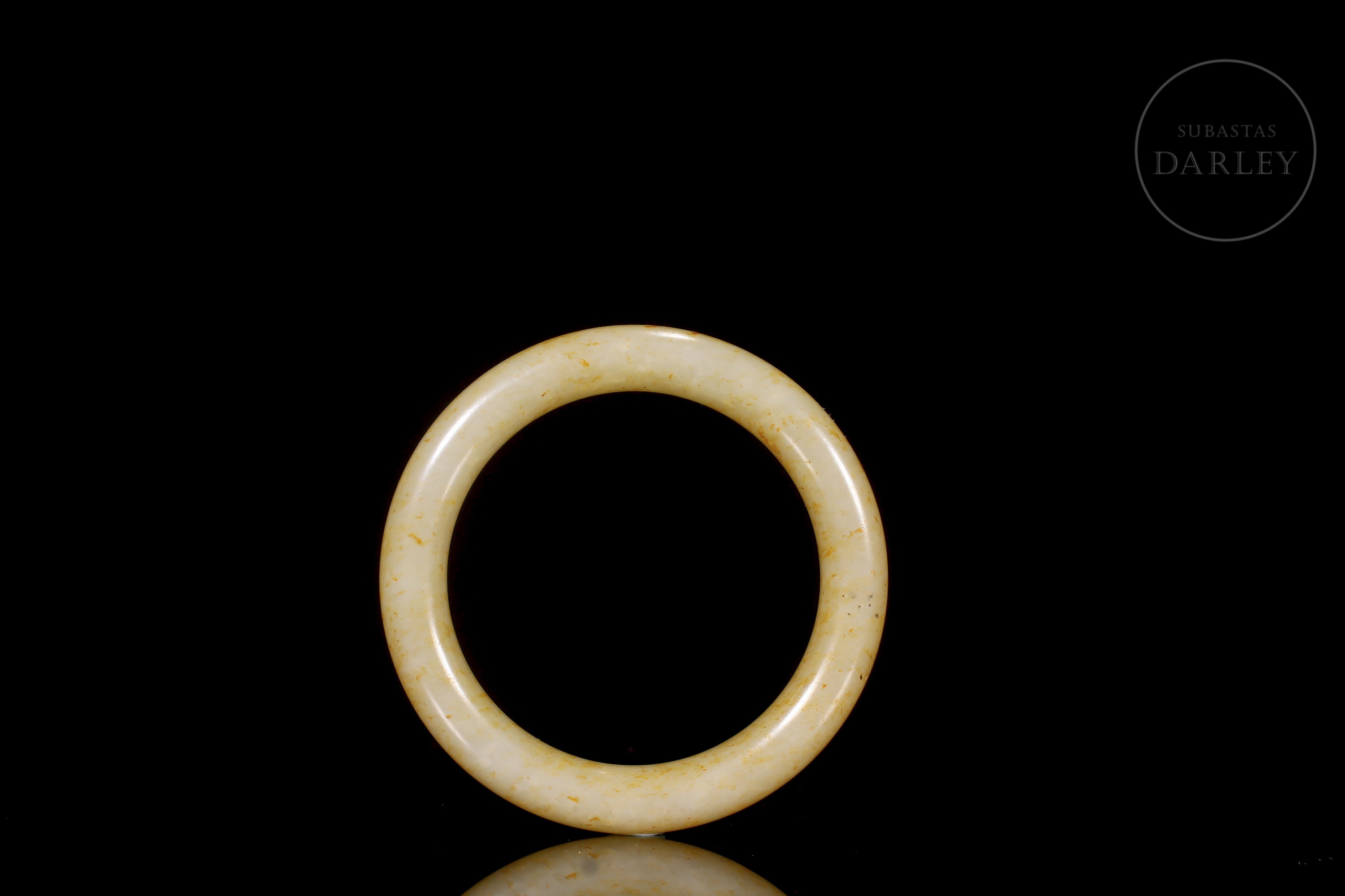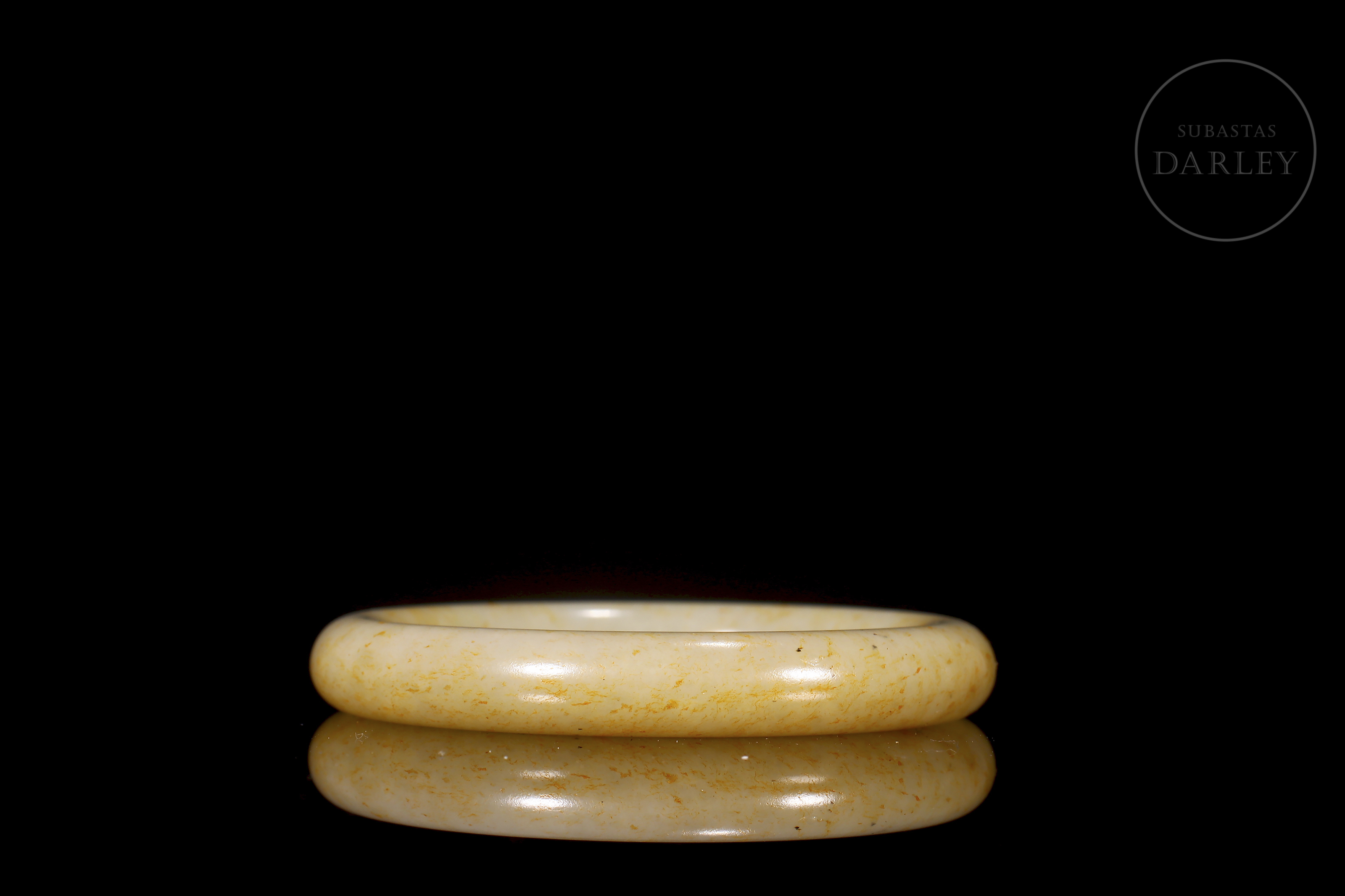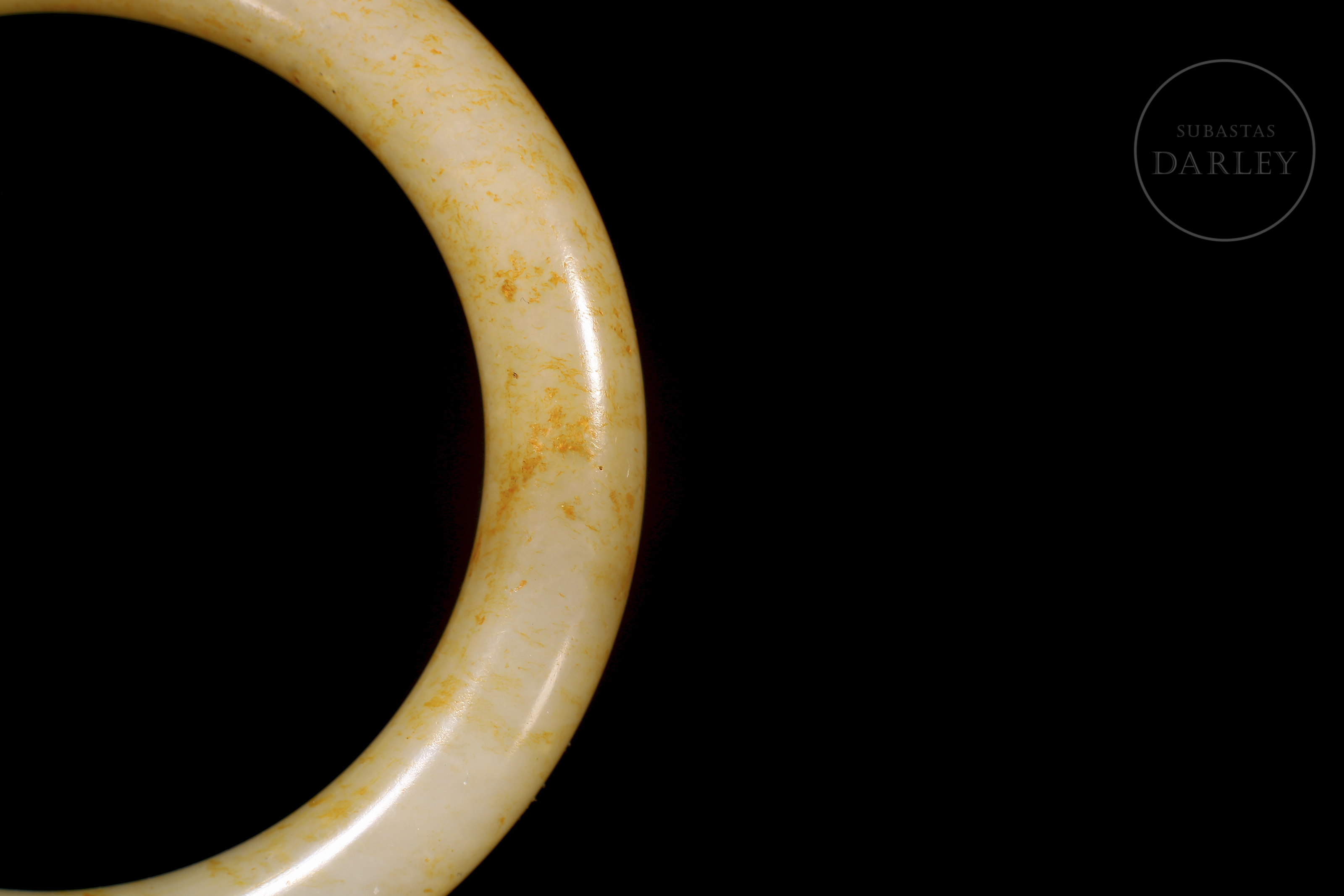 Brazalete tallado de jade blanco, de forma circular con un perfil grueso y redondeado. El jade es de color blanco cremoso, con una atractiva pátina ocre y amarilla que se distribuye por la superficie en pequeñas motas y manchas.La pieza se presenta en una caja forrada a medida.