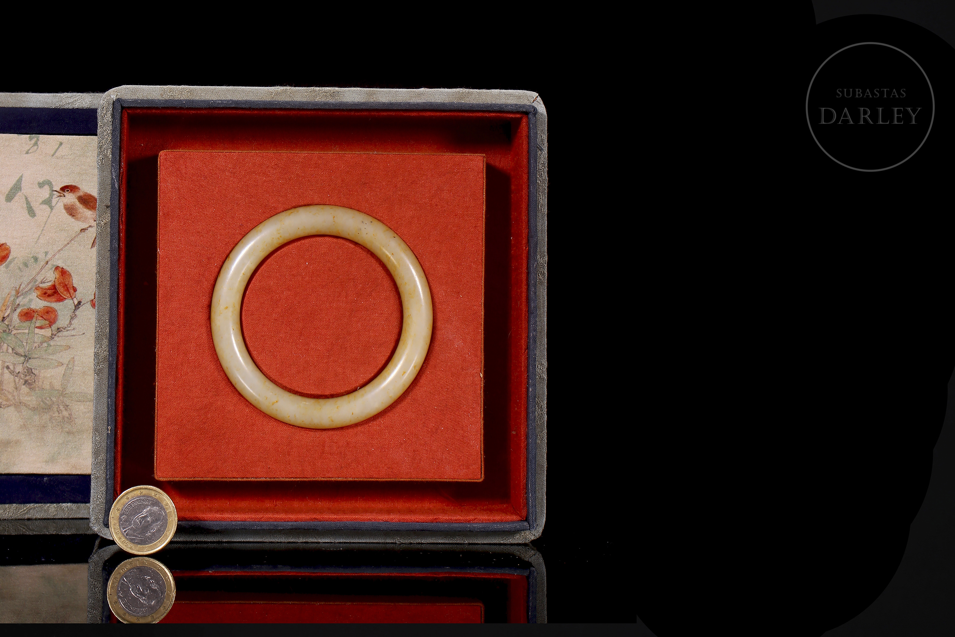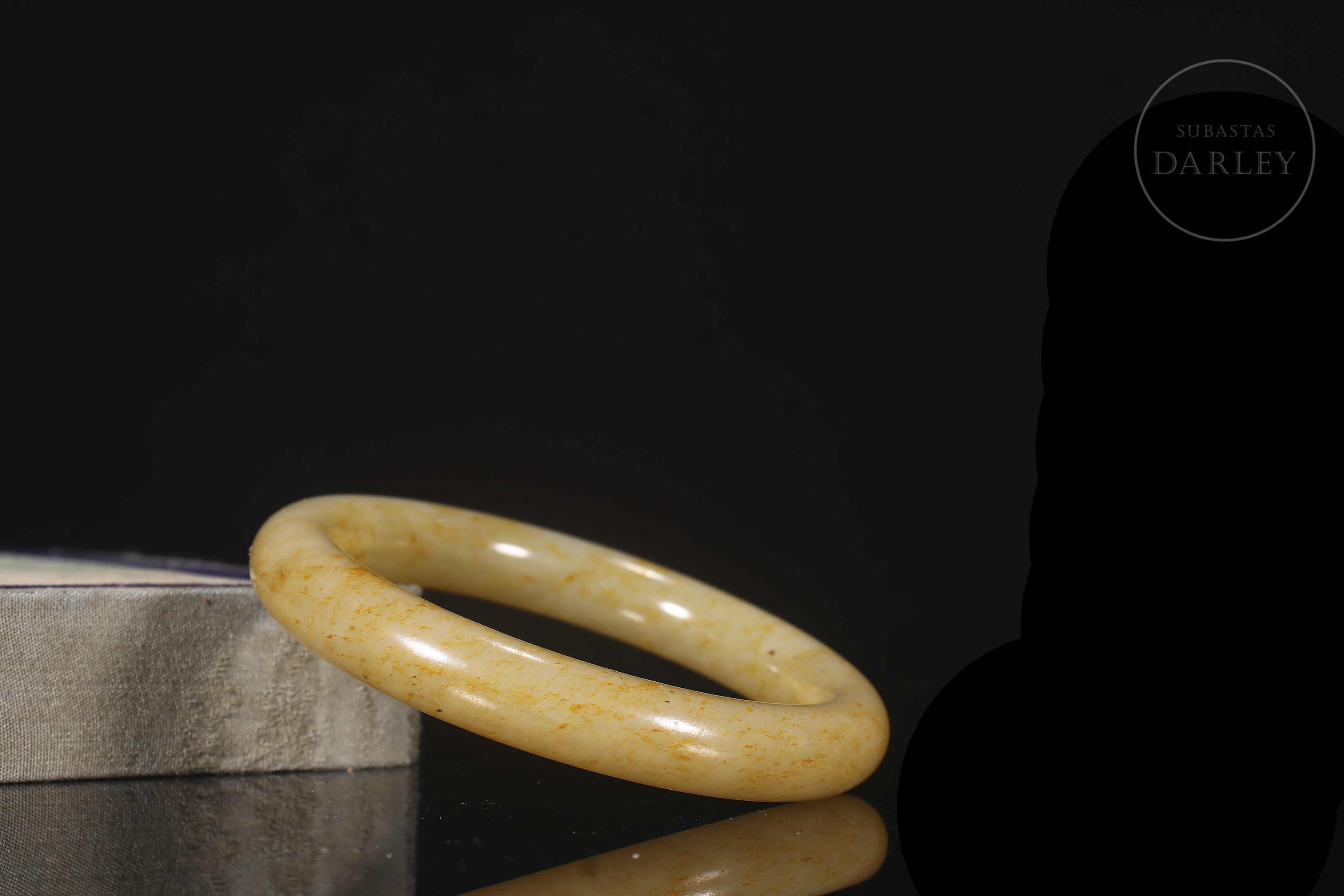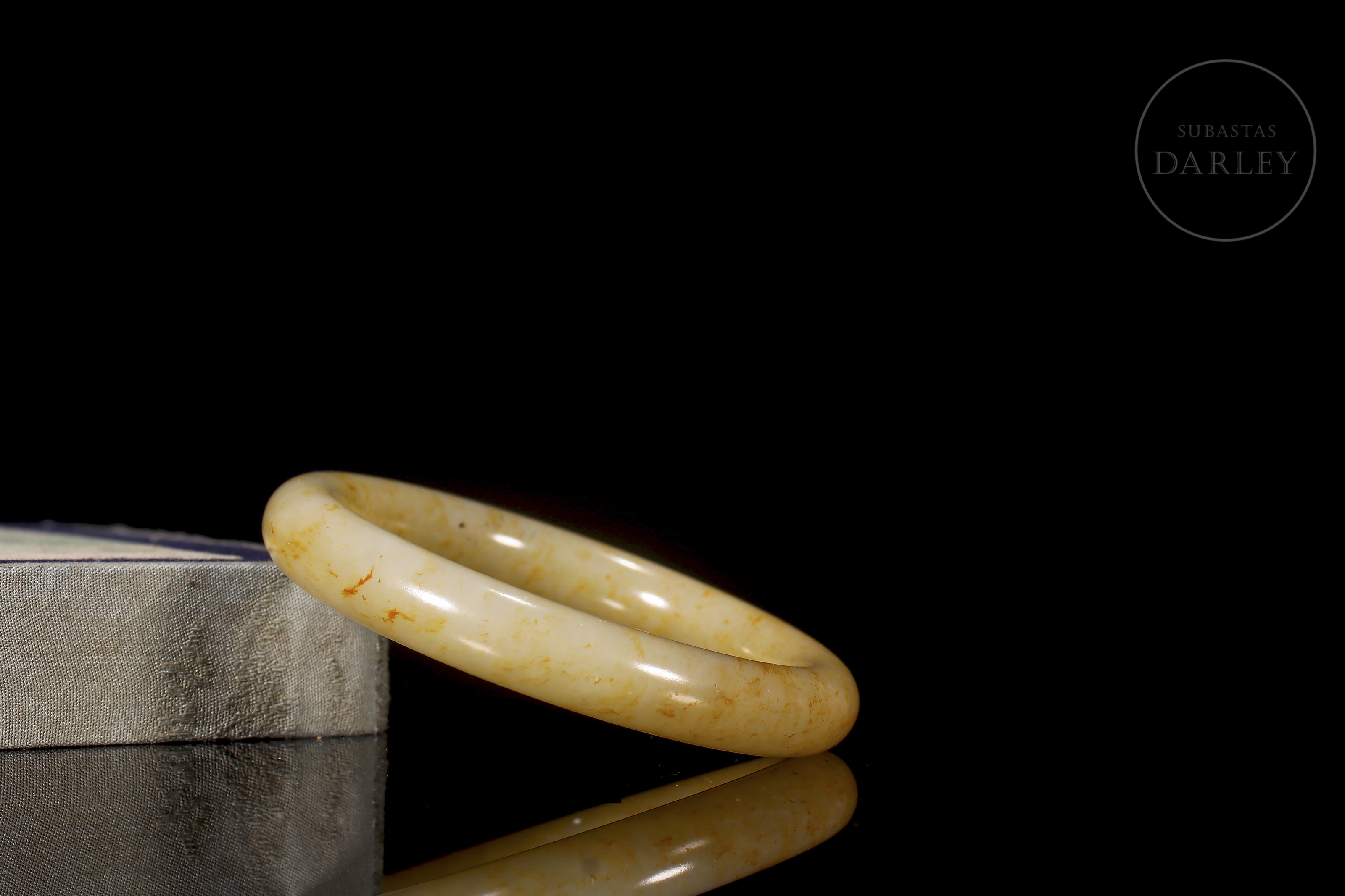 Brazalete tallado de jade blanco, de forma circular con un perfil grueso y redondeado. El jade es de color blanco cremoso, con una atractiva pátina ocre y amarilla que se distribuye por la superficie en pequeñas motas y manchas.La pieza se presenta en una caja forrada a medida.