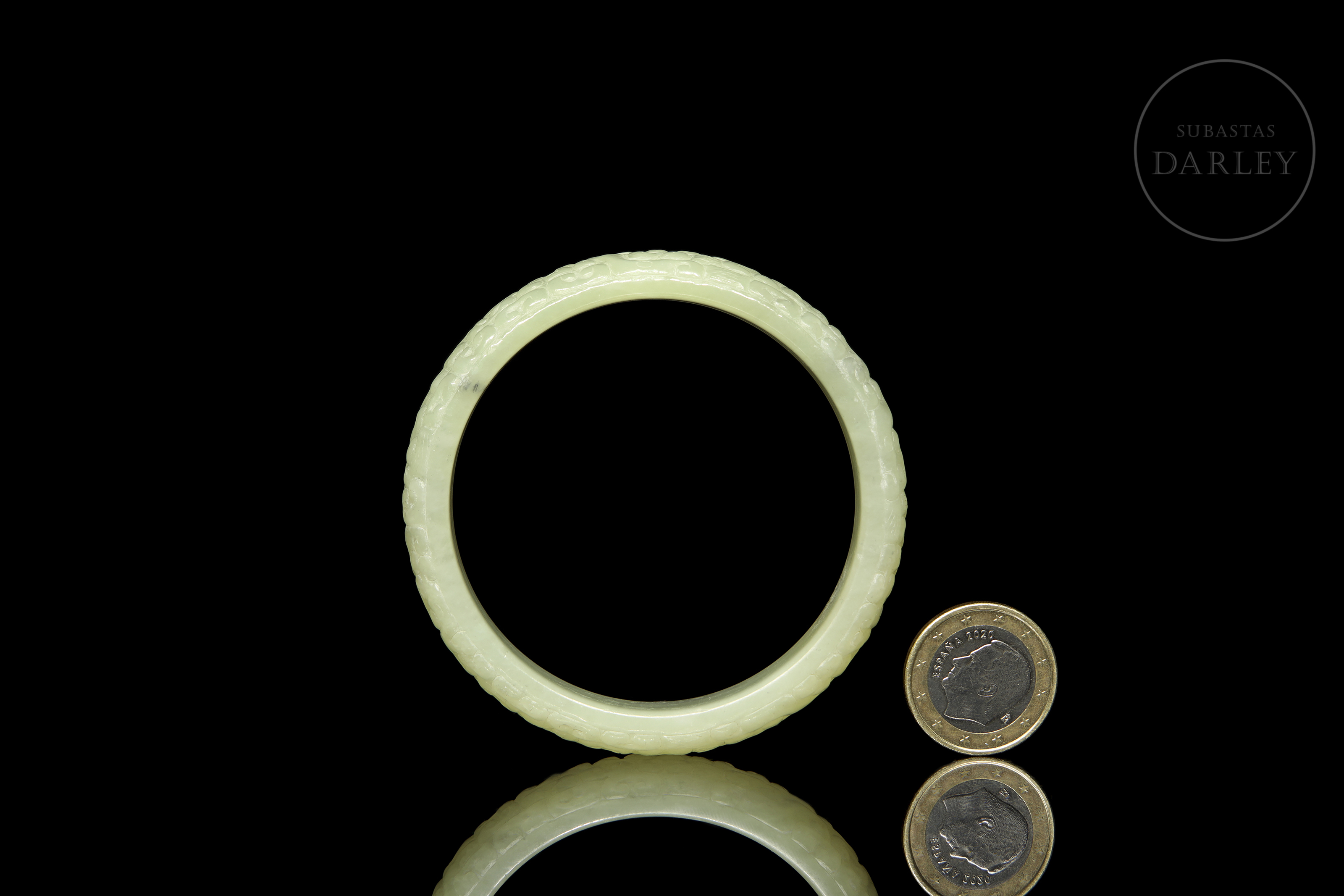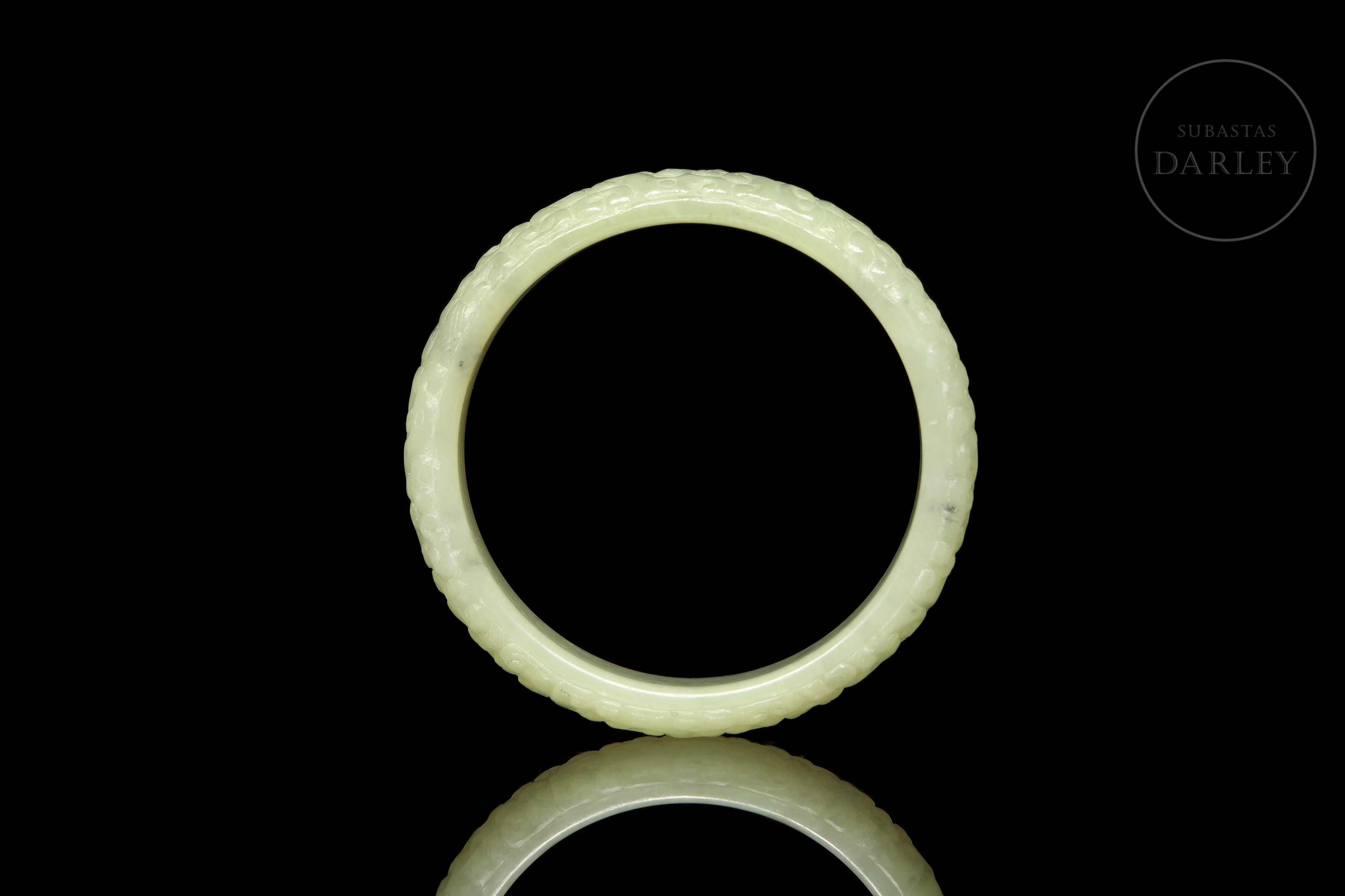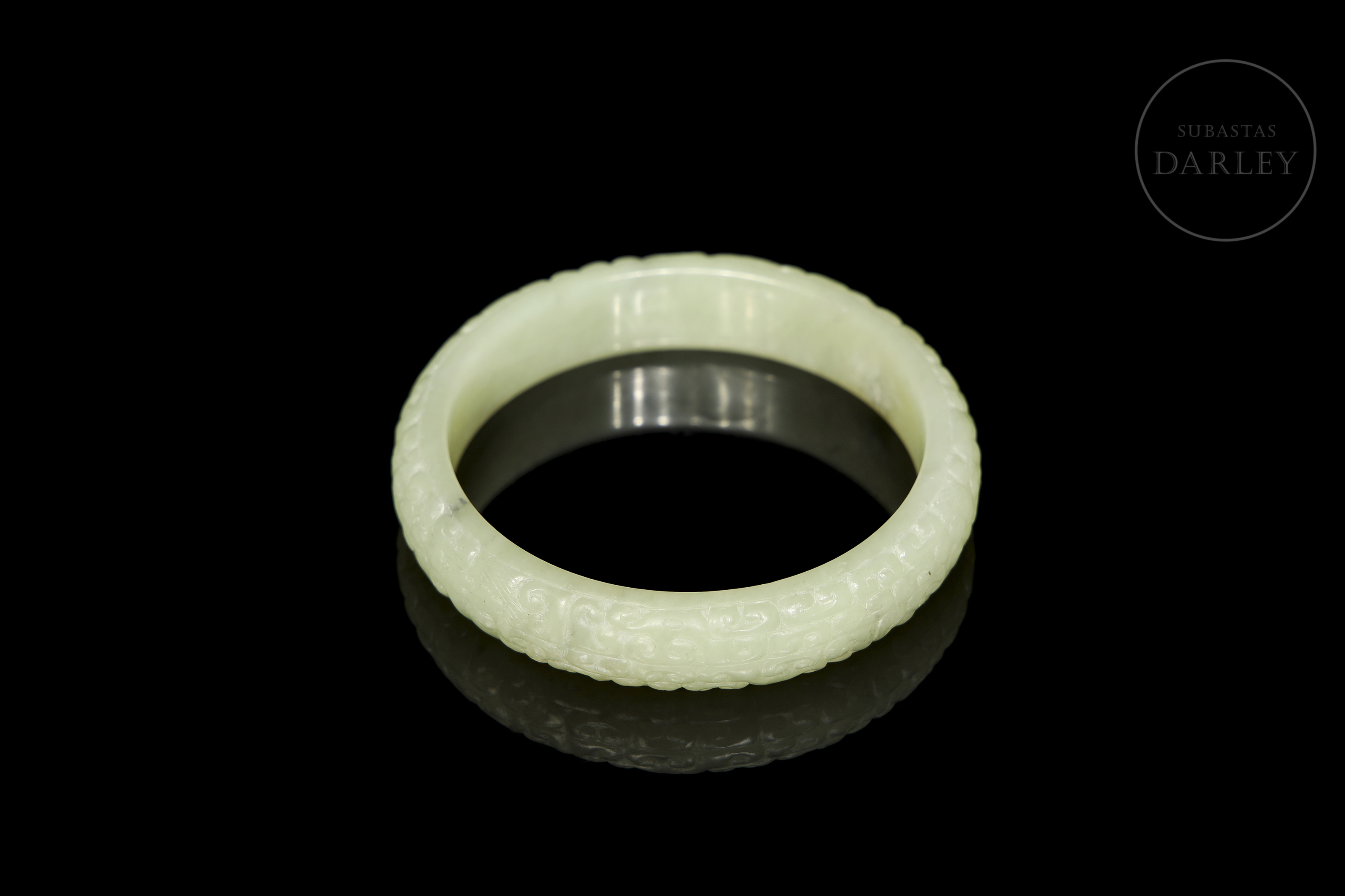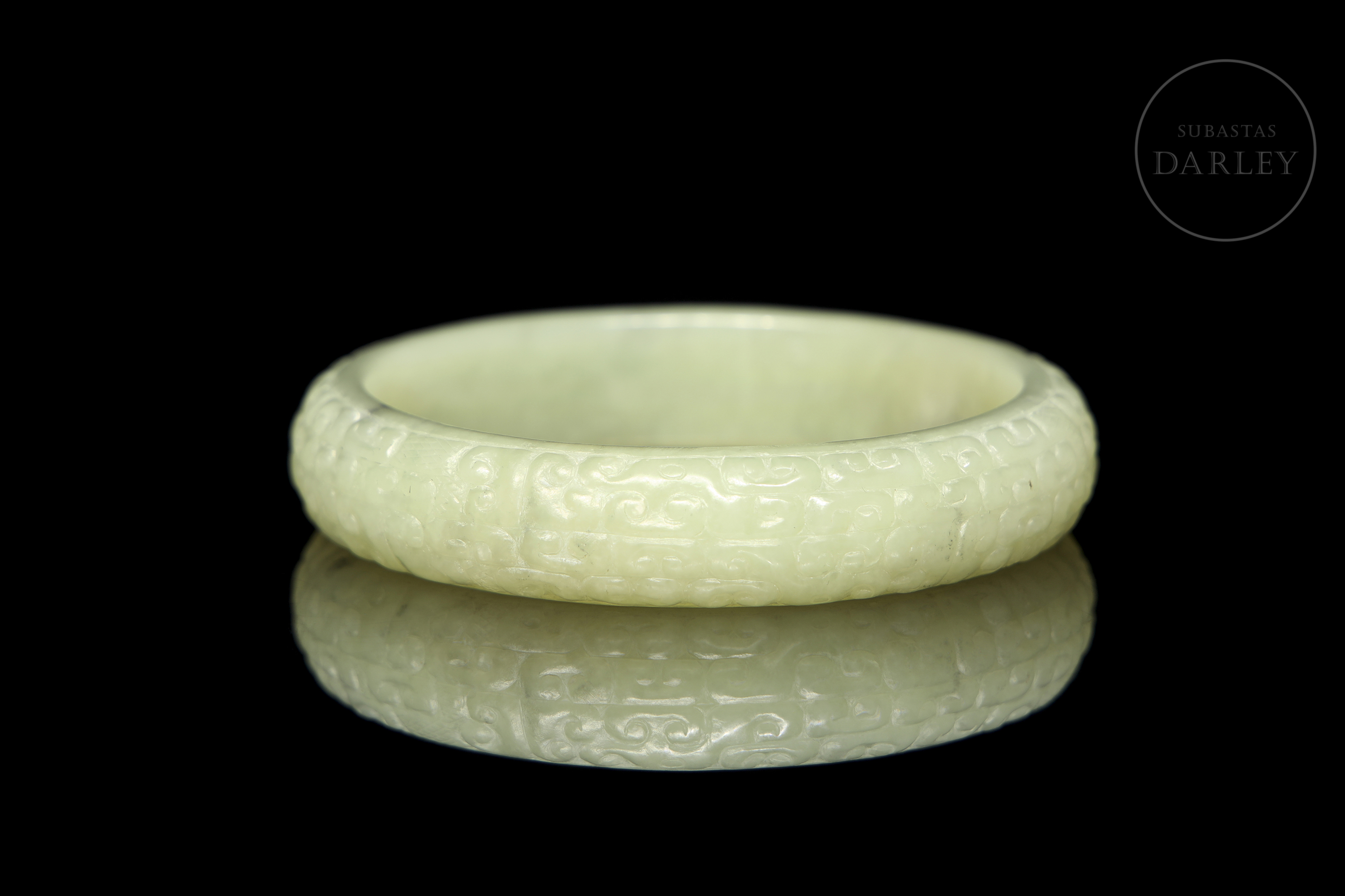 Esclava circular, tallada en jade de un delicado tono celadón con ligeras inclusiones de color oscuro. La pieza presenta una decoración continua en relieve que cubre toda su superficie exterior, compuesta por motivos de dragones arcaicos y volutas entrelazadas de estilo geométrico. Dinastía Han (206 a.C. – 220 d.C.) o posterior.
