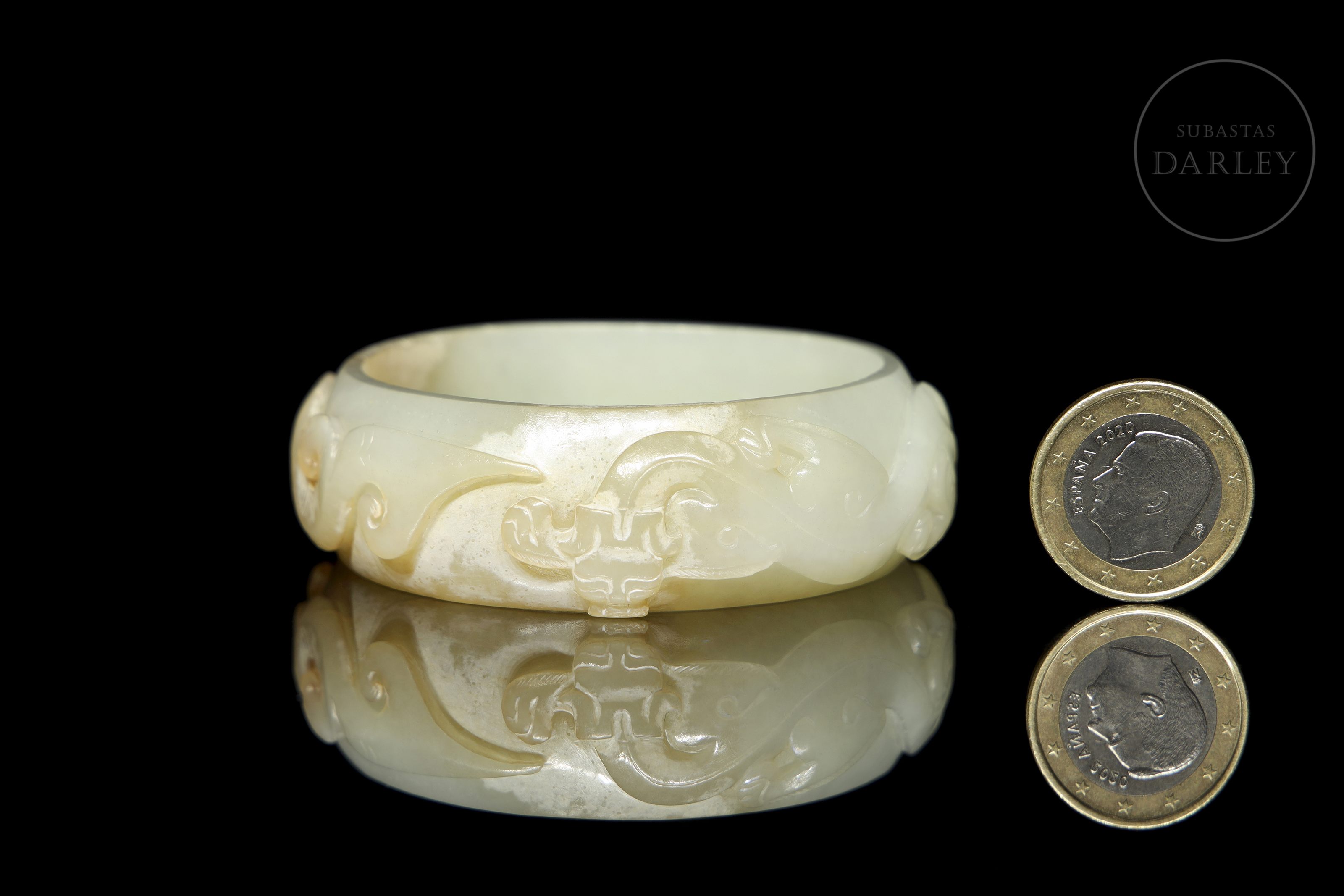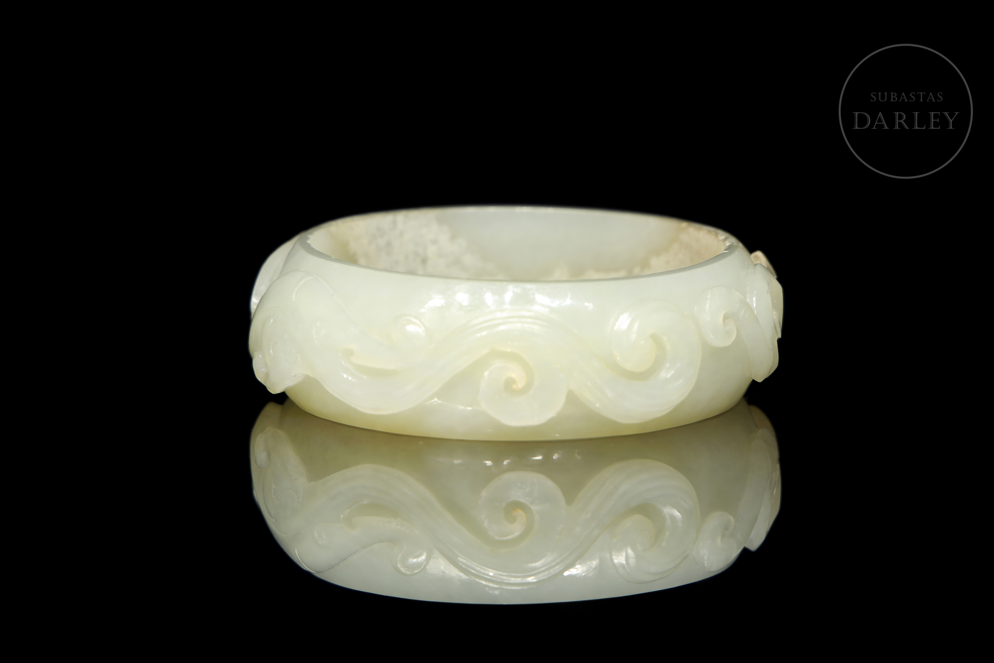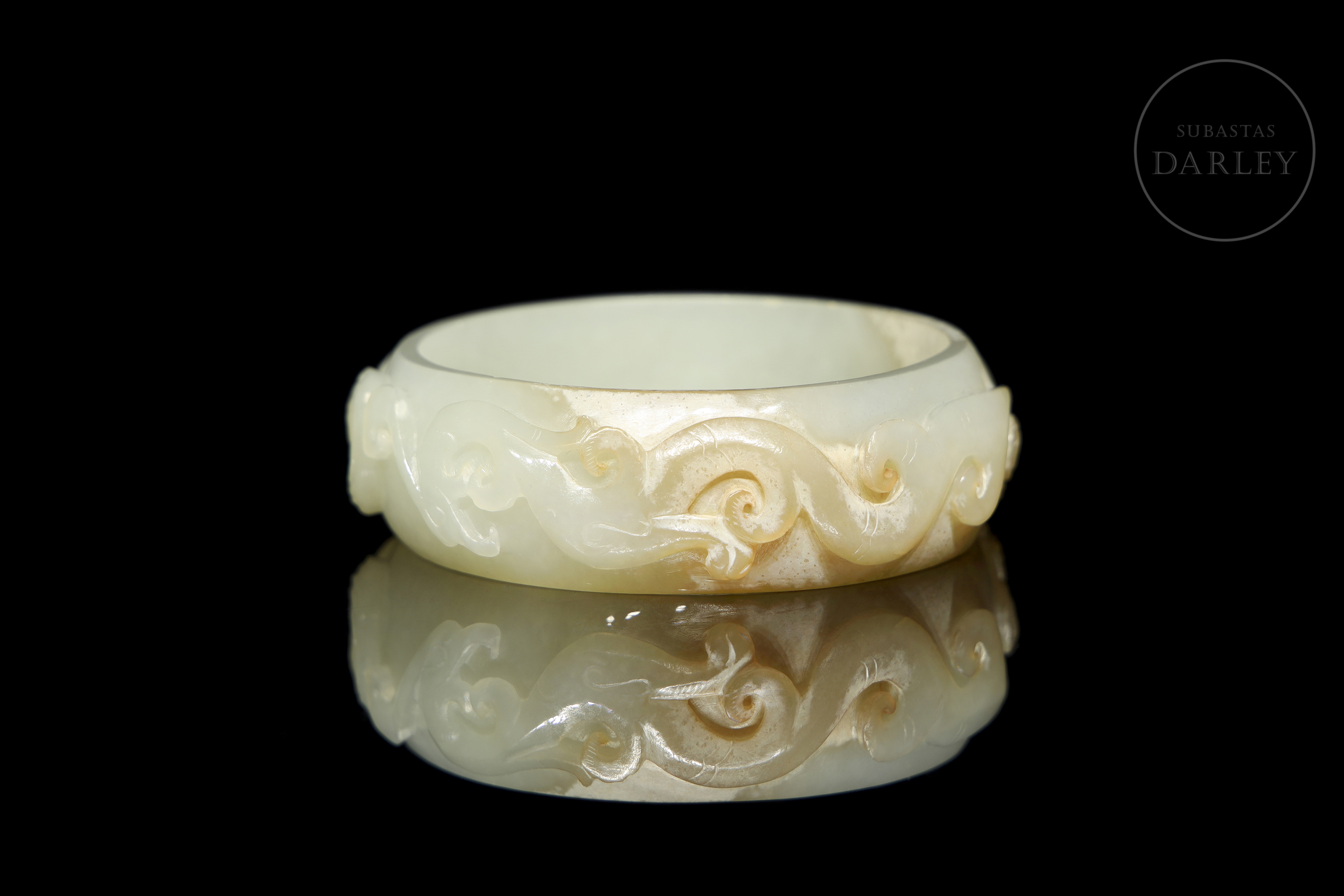Brazalete circular, tallado en jade de tono blanco-celadón. La superficie exterior está soberbiamente decorada en relieve con un patrón de "dragones arcaicos" estilizados, cuyos cuerpos sinuosos se entrelazan con volutas. Muestra áreas de pátina en tonos ocre y blancos, creando un contraste cromático con el pulido tono original del jade. Dinastía Han del Oeste (206 a.C. - 25 d.C.).