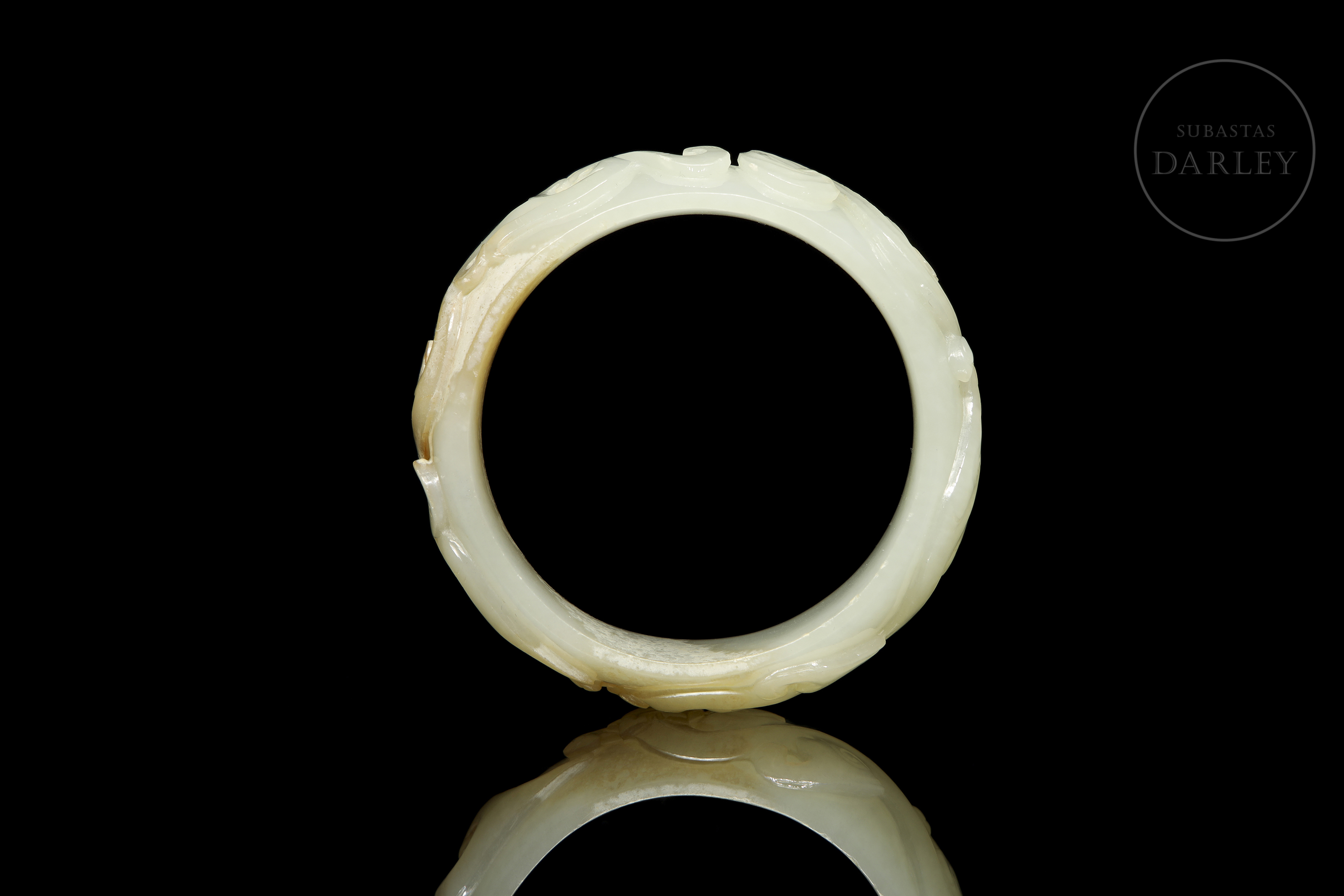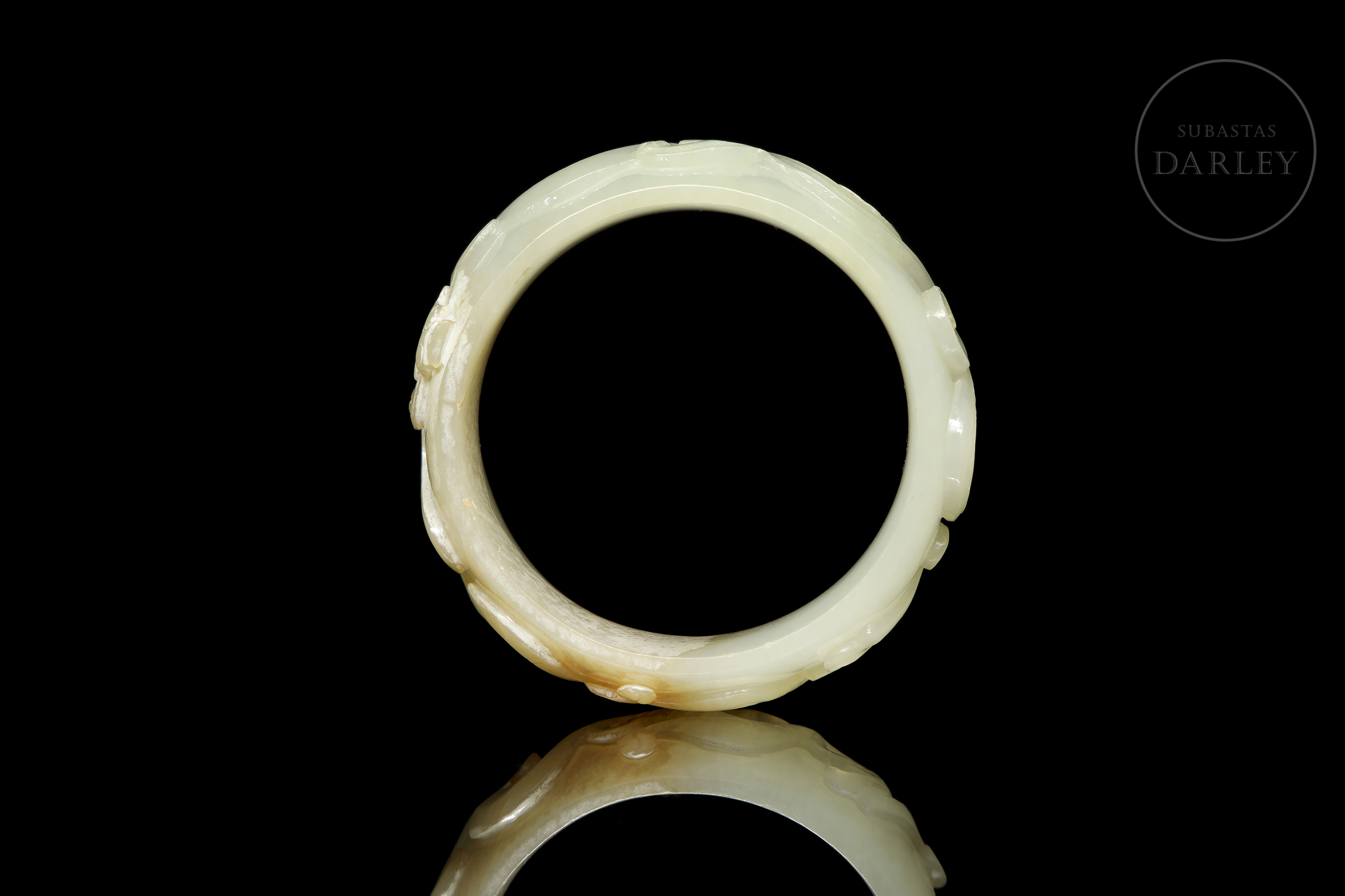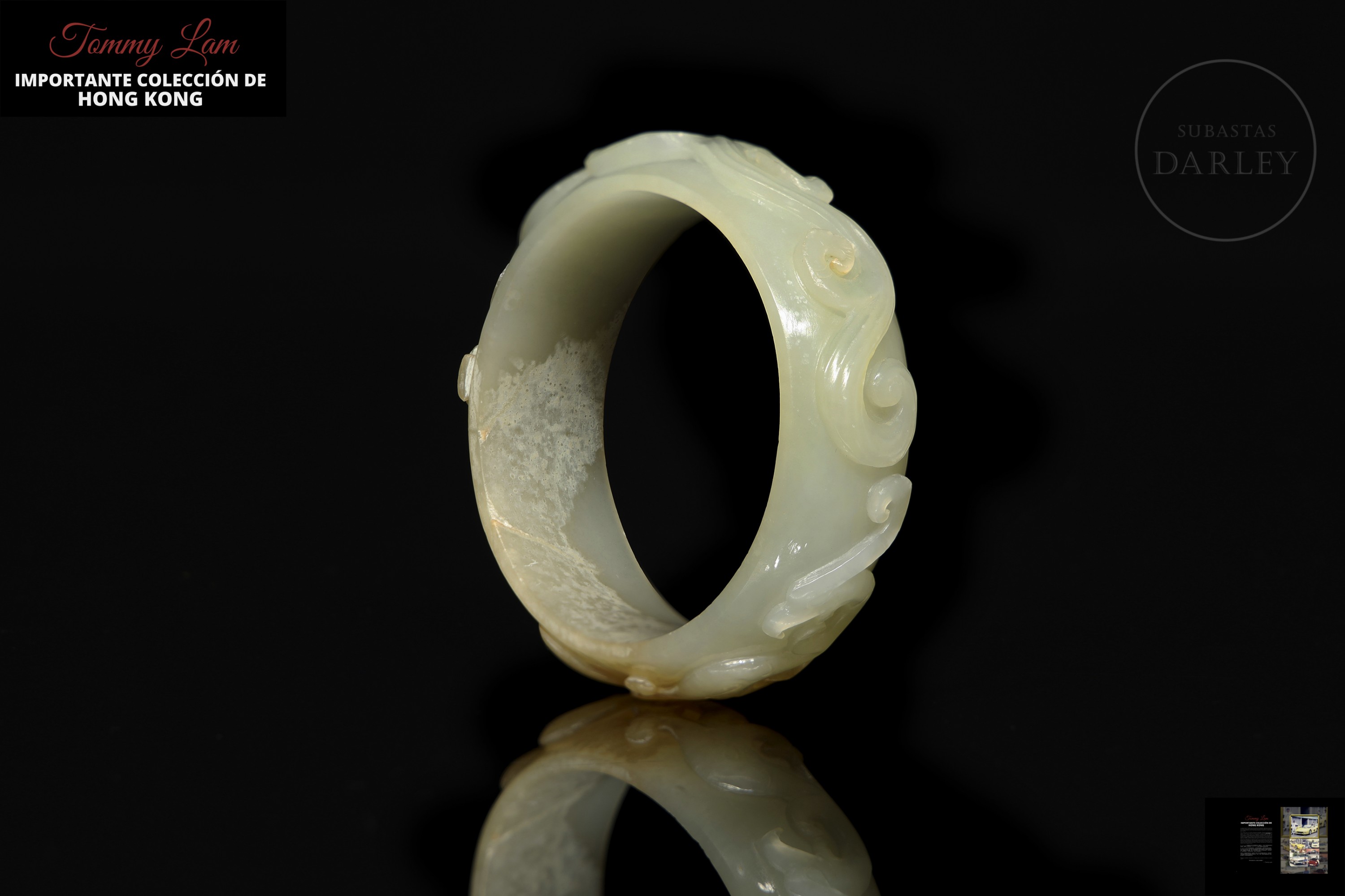 Brazalete circular, tallado en jade de tono blanco-celadón. La superficie exterior está soberbiamente decorada en relieve con un patrón de "dragones arcaicos" estilizados, cuyos cuerpos sinuosos se entrelazan con volutas. Muestra áreas de pátina en tonos ocre y blancos, creando un contraste cromático con el pulido tono original del jade. Dinastía Han del Oeste (206 a.C. - 25 d.C.).