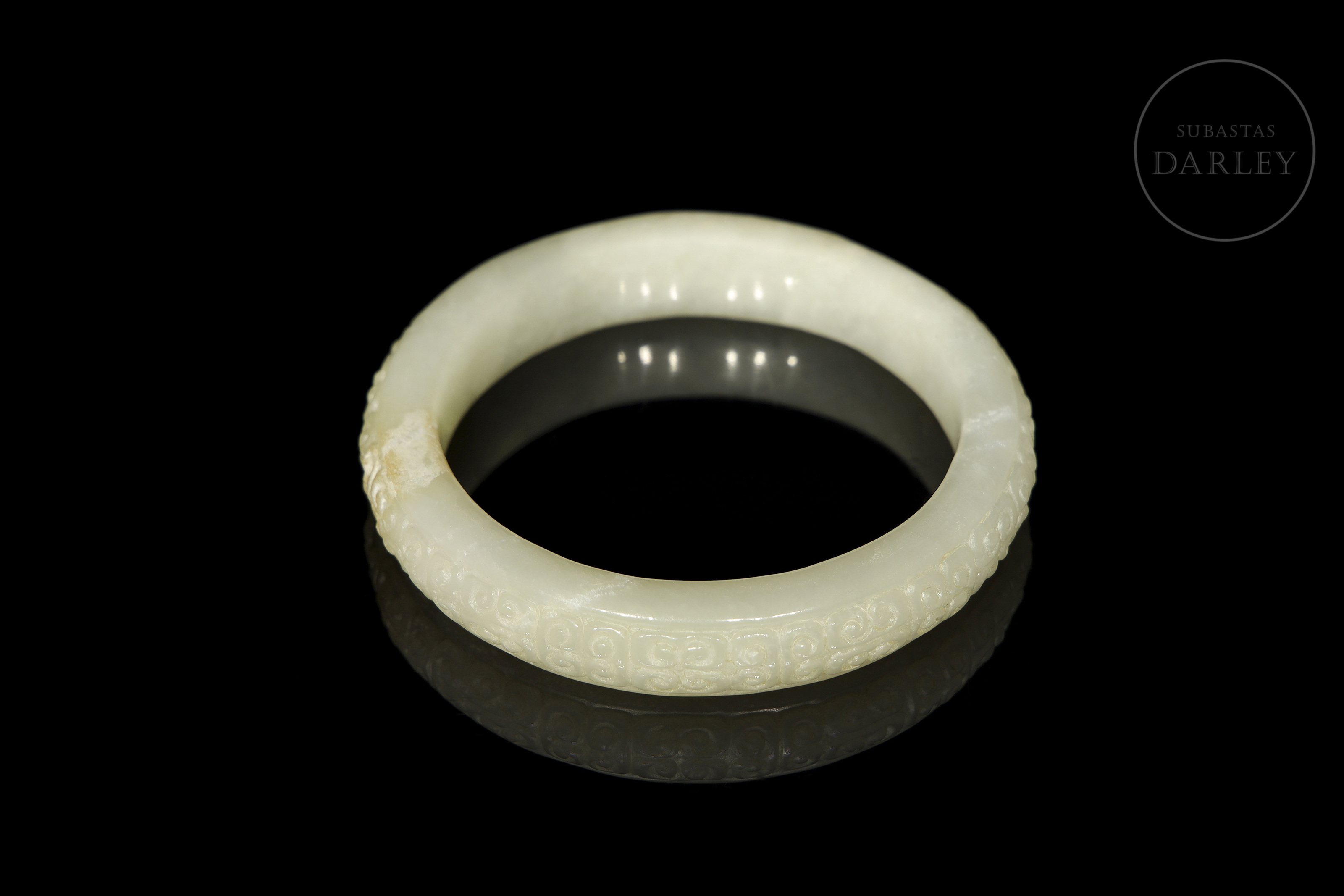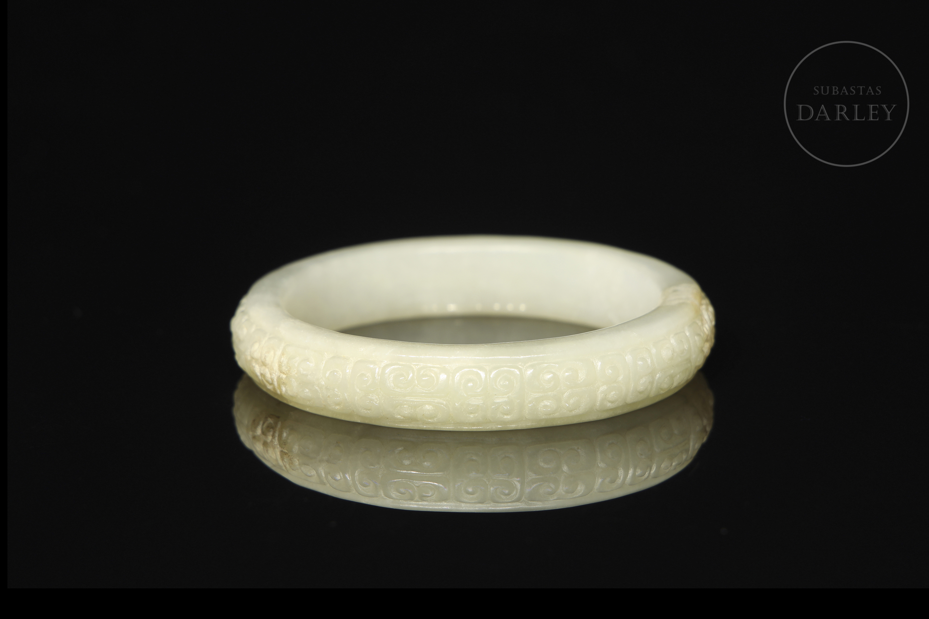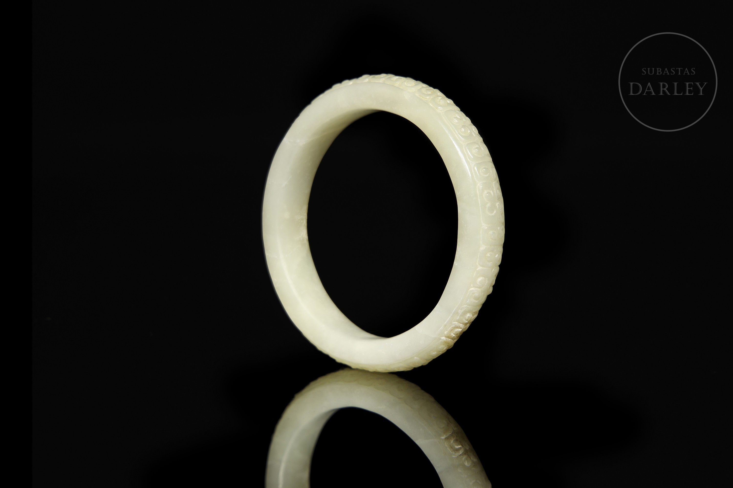 Brazalete anular, tallado en jade de tonalidad blanco-celadón. La pieza, de sección clásica redondeada, presenta la superficie exterior meticulosamente decorada en bajo relieve, con un patrón repetitivo de "Ruyis" (如意), que evoca la forma del hongo lingzhi y se asocia con la buena fortuna. Muestra pátina en tono ocre por envejecimiento natural. Dinastía Han (206 a.C. - 220 d.C.).